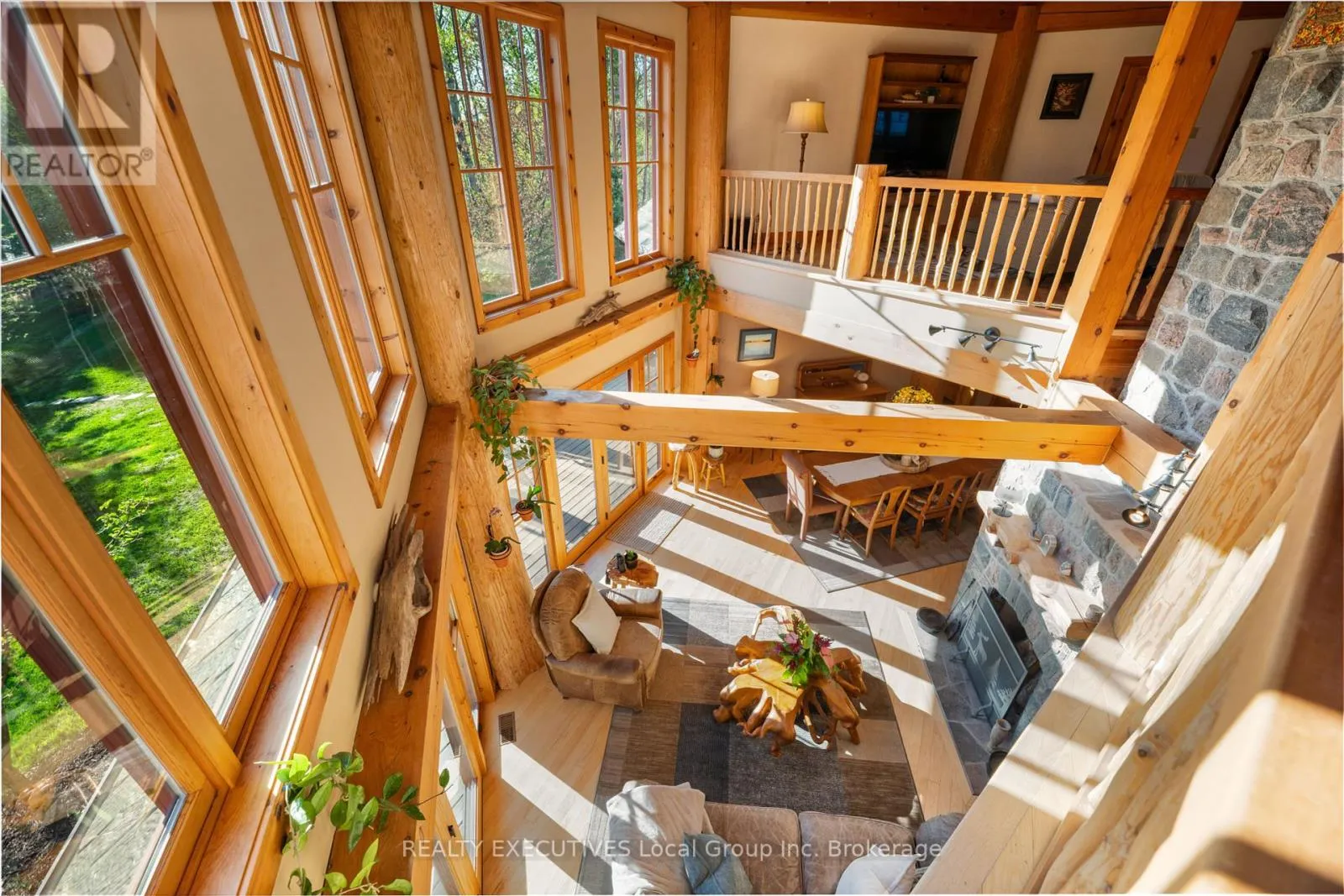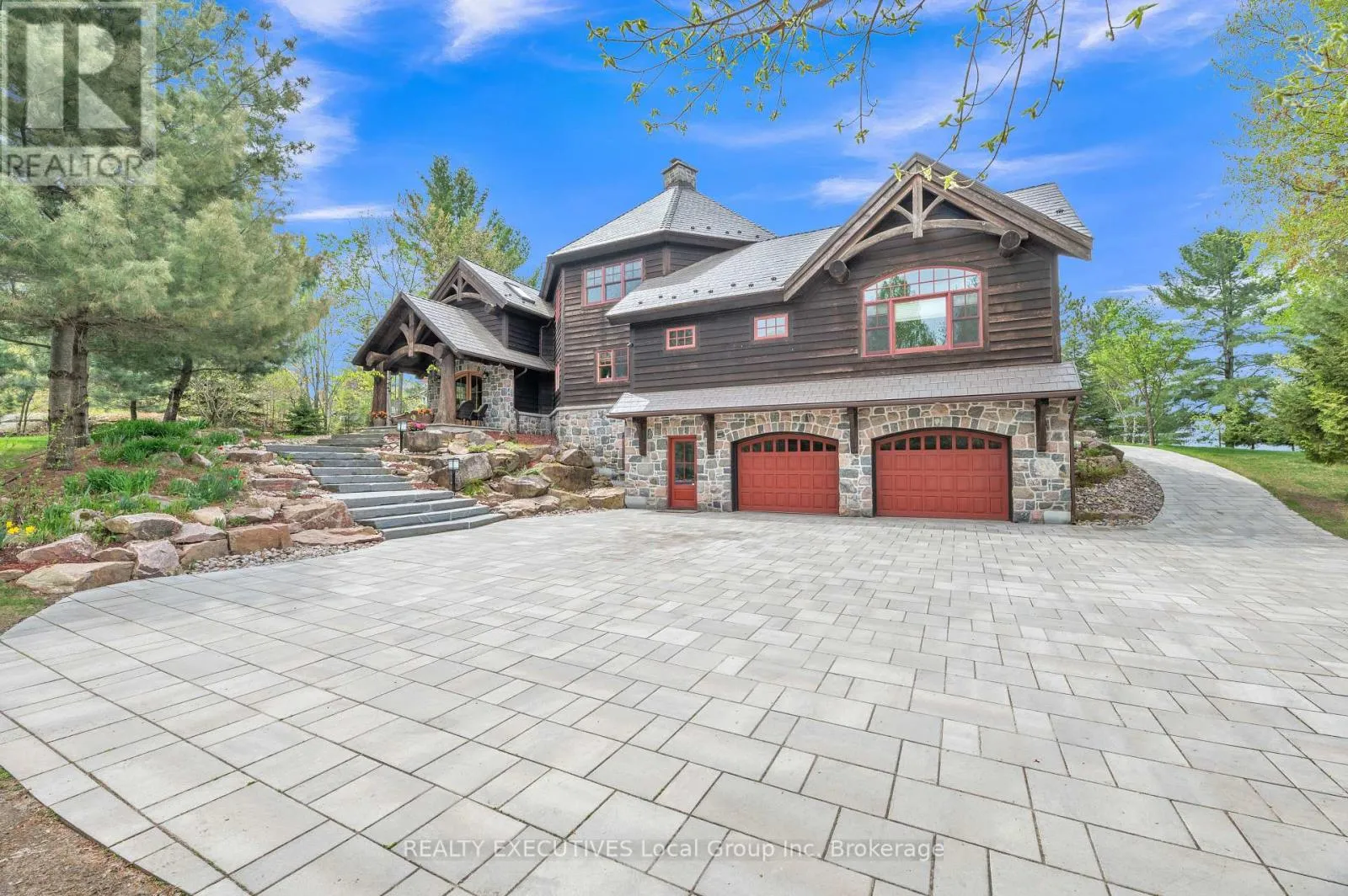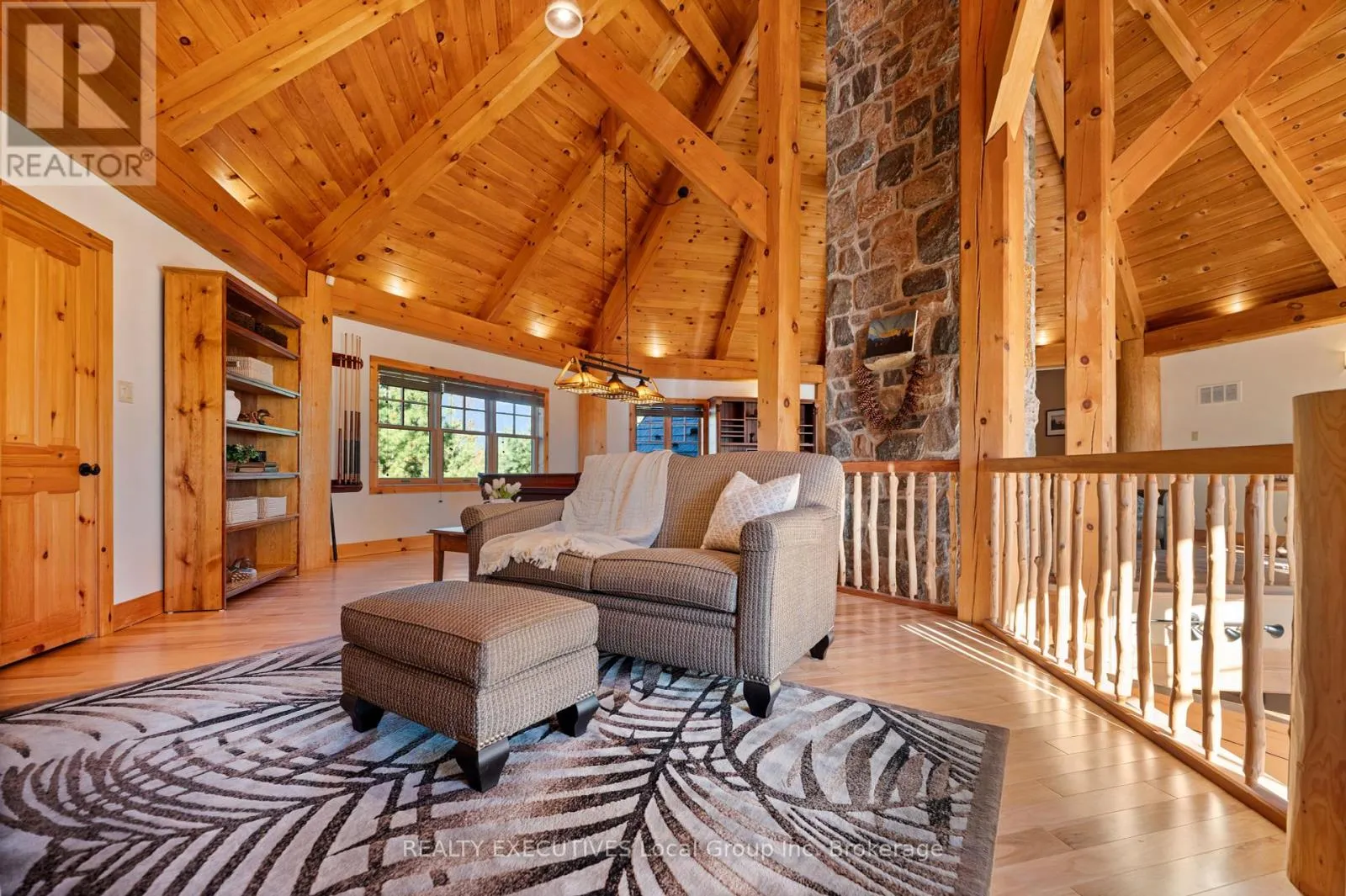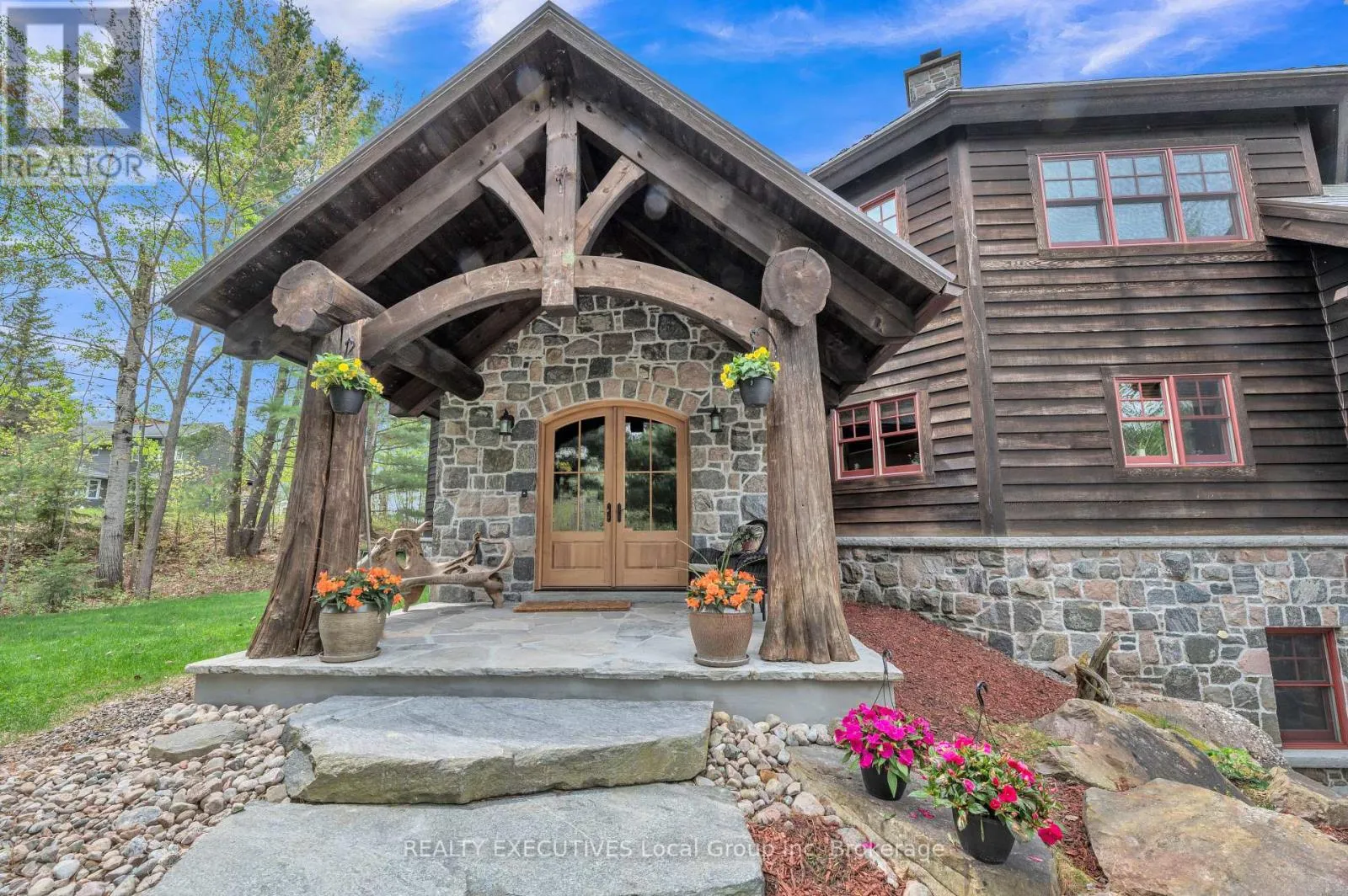 Cross Streets: Hwy 654 & Sunset Cove Rd. ** Directions: Hwy 11S to Hwy 654W. Turn right onto Hwy 11S to Hwy 654W. Turn right onto Sunset Cove Rd, left onto Bear Creek Road and left onto Hunter's Bay Rd. See signs near the end. This magnificent custom-built timber frame home offers luxury lakefront living at its finest, situated on over 300 feet of pristine Lake Nipissing shoreline in Nipissing Township. The 4,000 sq ft residence, constructed in 2008 with exquisite craftsmanship, blends rustic charm with modern comforts. Approach via the driveway to the interlock front driveway and the double-car garage, then ascend the stone stairs to the grand entrance. The main floor impresses with hardwood floors, leading to a spectacular great room where floor-to-ceiling windows flood the space with natural light and showcase views to the second-floor loft. A striking central fireplace with a pizza oven feature serves both the living area and gourmet kitchen, boasting quartz countertops, a professional propane gas range, and a butler's pantry. Three main-floor bedrooms share a three-piece bath, with a versatile sitting/entertainment room (with a two-piece bath). The second level reveals the breathtaking primary suite, complete with lake views, a spa-like ensuite featuring a jacuzzi tub and walk-in shower, dual vanities and closets, plus a spacious loft area perfect for entertaining with a pool table, multiple sitting areas and the laundry room. Outdoor living shines with multiple decks, manicured gardens, a screened three-season sunroom, and a path leading to your private waterfront, complete with a firepit area, dual docks, a boat house, and a sandy beach. The lower-level workshop offers ample space for projects or storage. Every detail reflects quality craftsmanship, from the timber frame construction to the premium finishes. Located in a coveted area of Lake Nipissing's south shore, this property delivers the ultimate waterfront lifestyle while being just 20 minutes to North Bay amenities, local marinas and easy access to premier fishing and boating. This is a rare opportunity to own one of Lake Nipissing's finest residences, where luxury meets authentic Northern Ontario lake living. (id:27476)