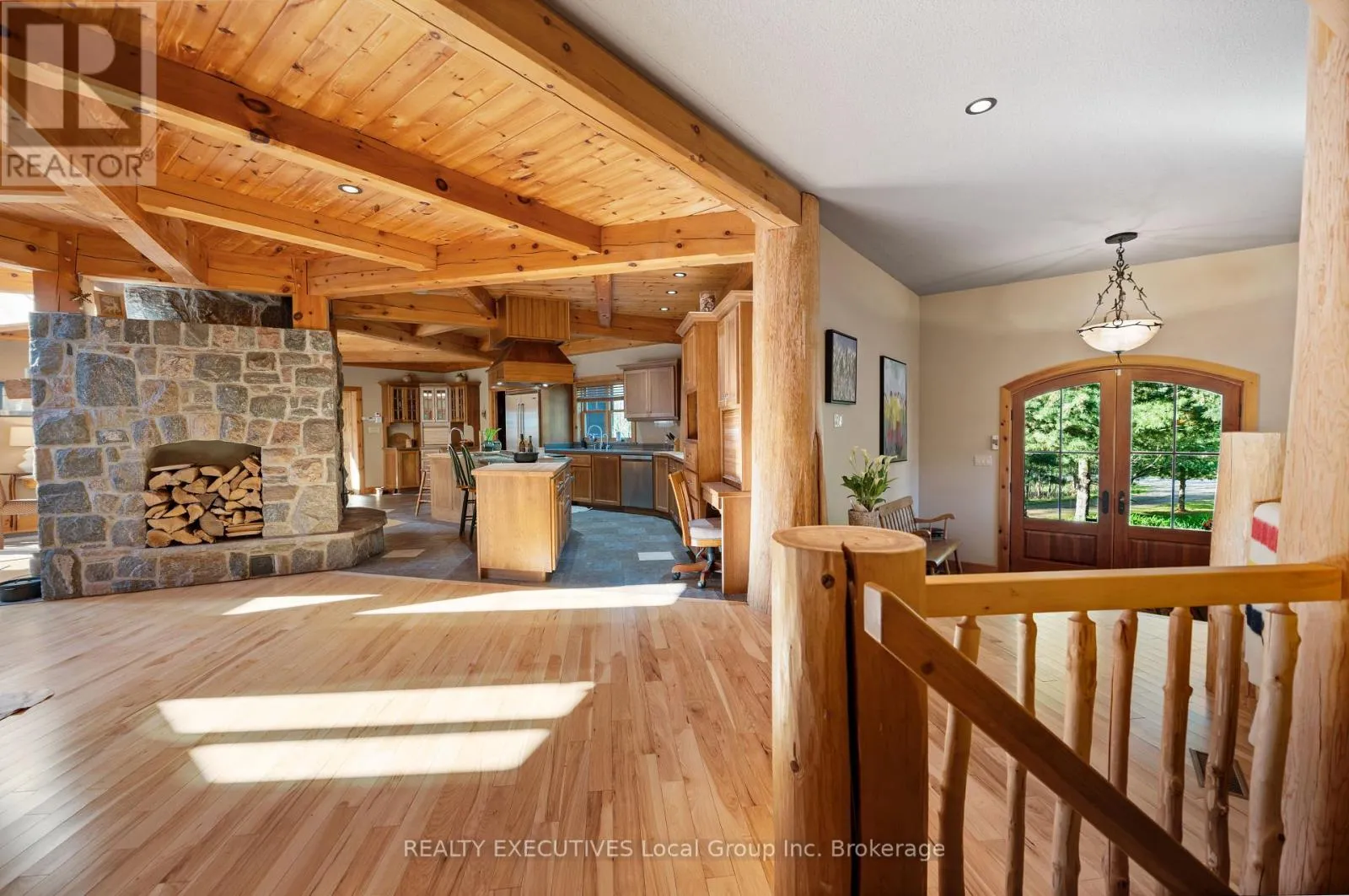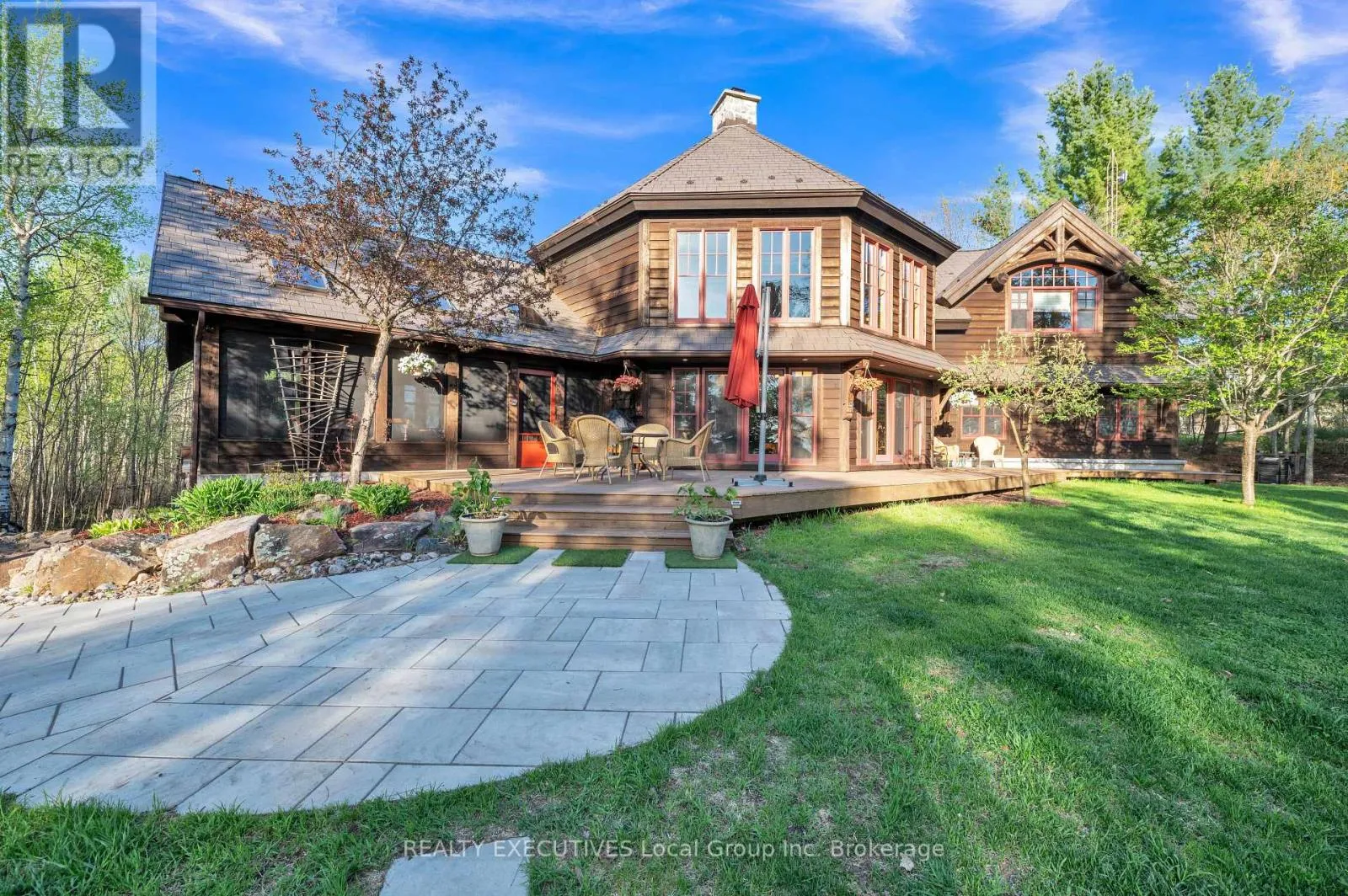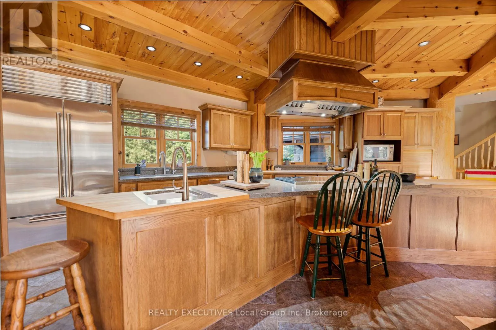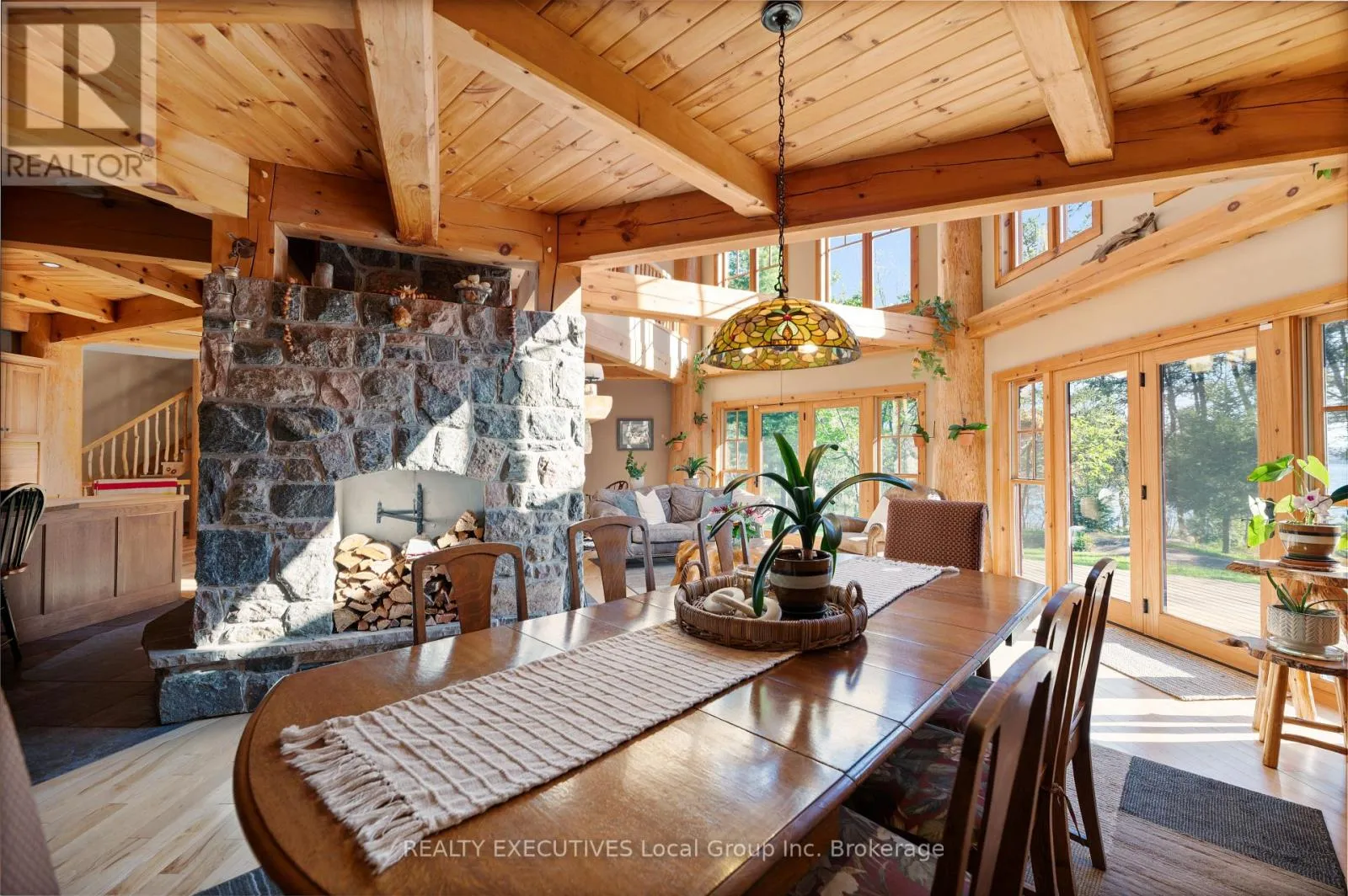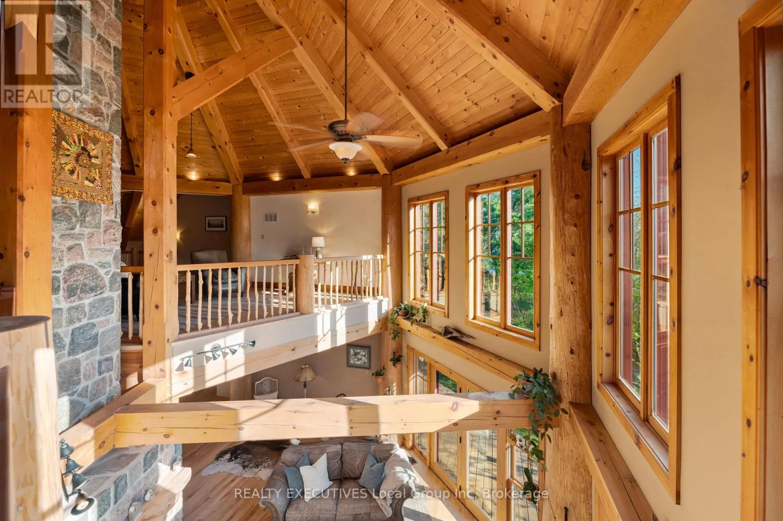 Cross Streets: Hwy 654 & Sunset Cove Rd. ** Directions: Hwy 11S to Hwy 654W. Turn right onto Hwy 11S to Hwy 654W. Turn right onto Sunset Cove Rd, left onto Bear Creek Road and left onto Hunter's Bay Rd. See signs near the end. This magnificent custom-built timber frame home offers luxury lakefront living at its finest, situated on over 300 feet of pristine Lake Nipissing shoreline in Nipissing Township. The 4,000 sq ft residence, constructed in 2008 with exquisite craftsmanship, blends rustic charm with modern comforts. Approach via the driveway to the interlock front driveway and the double-car garage, then ascend the stone stairs to the grand entrance. The main floor impresses with hardwood floors, leading to a spectacular great room where floor-to-ceiling windows flood the space with natural light and showcase views to the second-floor loft. A striking central fireplace with a pizza oven feature serves both the living area and gourmet kitchen, boasting quartz countertops, a professional propane gas range, and a butler's pantry. Three main-floor bedrooms share a three-piece bath, with a versatile sitting/entertainment room (with a two-piece bath). The second level reveals the breathtaking primary suite, complete with lake views, a spa-like ensuite featuring a jacuzzi tub and walk-in shower, dual vanities and closets, plus a spacious loft area perfect for entertaining with a pool table, multiple sitting areas and the laundry room. Outdoor living shines with multiple decks, manicured gardens, a screened three-season sunroom, and a path leading to your private waterfront, complete with a firepit area, dual docks, a boat house, and a sandy beach. The lower-level workshop offers ample space for projects or storage. Every detail reflects quality craftsmanship, from the timber frame construction to the premium finishes. Located in a coveted area of Lake Nipissing's south shore, this property delivers the ultimate waterfront lifestyle while being just 20 minutes to North Bay amenities, local marinas and easy access to premier fishing and boating. This is a rare opportunity to own one of Lake Nipissing's finest residences, where luxury meets authentic Northern Ontario lake living. (id:27476)