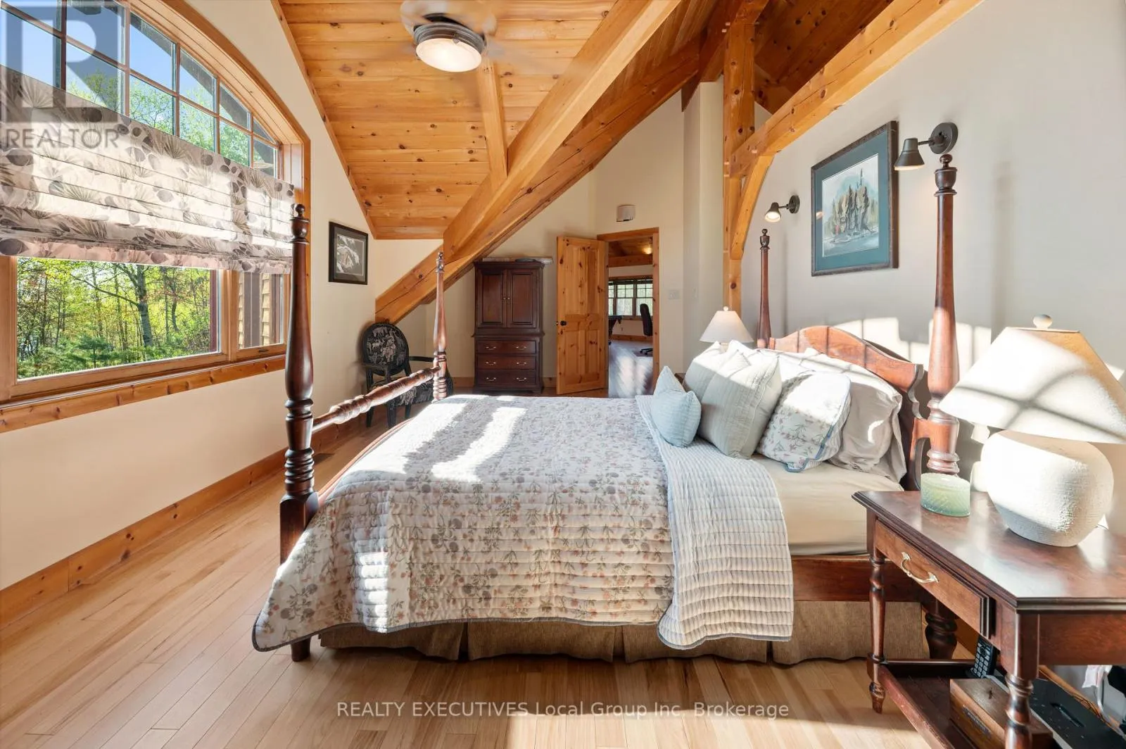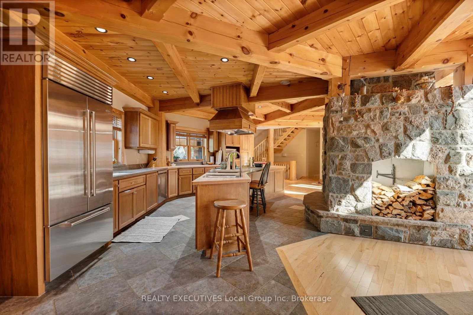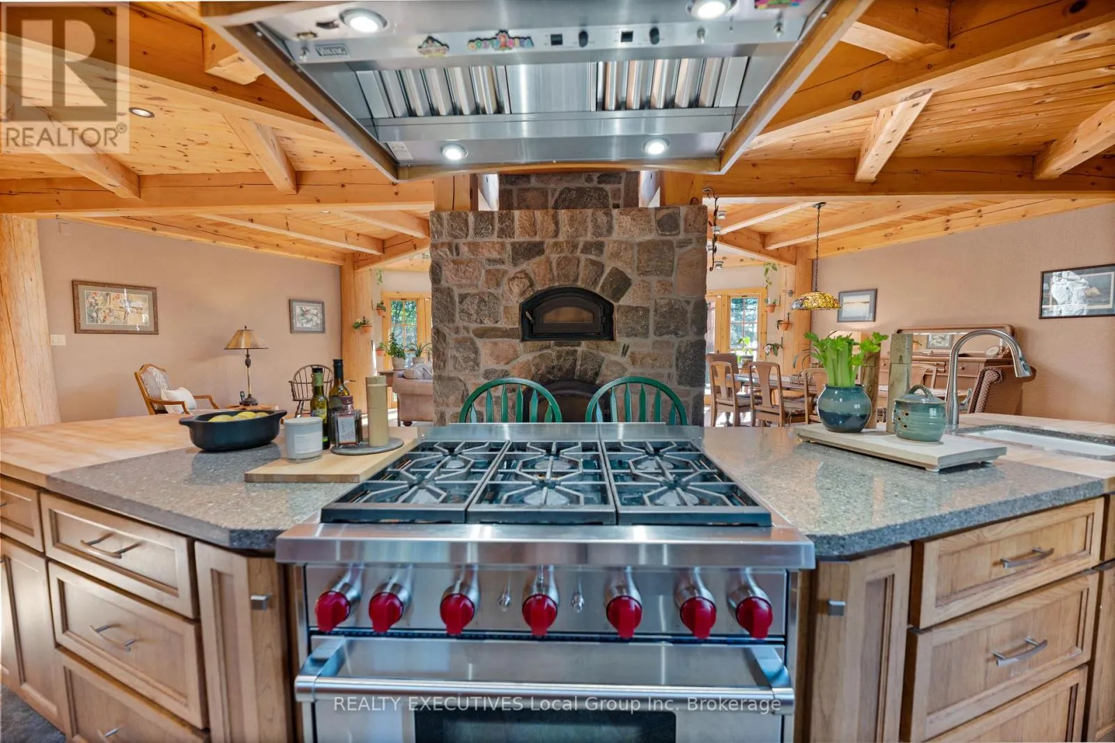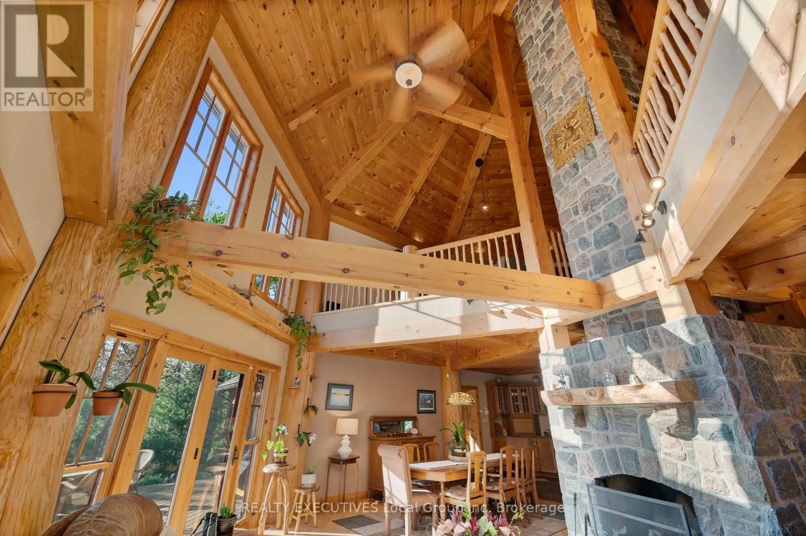 Cross Streets: Hwy 654 & Sunset Cove Rd. ** Directions: Hwy 11S to Hwy 654W. Turn right onto Hwy 11S to Hwy 654W. Turn right onto Sunset Cove Rd, left onto Bear Creek Road and left onto Hunter's Bay Rd. See signs near the end. This magnificent custom-built timber frame home offers luxury lakefront living at its finest, situated on over 300 feet of pristine Lake Nipissing shoreline in Nipissing Township. The 4,000 sq ft residence, constructed in 2008 with exquisite craftsmanship, blends rustic charm with modern comforts. Approach via the driveway to the interlock front driveway and the double-car garage, then ascend the stone stairs to the grand entrance. The main floor impresses with hardwood floors, leading to a spectacular great room where floor-to-ceiling windows flood the space with natural light and showcase views to the second-floor loft. A striking central fireplace with a pizza oven feature serves both the living area and gourmet kitchen, boasting quartz countertops, a professional propane gas range, and a butler's pantry. Three main-floor bedrooms share a three-piece bath, with a versatile sitting/entertainment room (with a two-piece bath). The second level reveals the breathtaking primary suite, complete with lake views, a spa-like ensuite featuring a jacuzzi tub and walk-in shower, dual vanities and closets, plus a spacious loft area perfect for entertaining with a pool table, multiple sitting areas and the laundry room. Outdoor living shines with multiple decks, manicured gardens, a screened three-season sunroom, and a path leading to your private waterfront, complete with a firepit area, dual docks, a boat house, and a sandy beach. The lower-level workshop offers ample space for projects or storage. Every detail reflects quality craftsmanship, from the timber frame construction to the premium finishes. Located in a coveted area of Lake Nipissing's south shore, this property delivers the ultimate waterfront lifestyle while being just 20 minutes to North Bay amenities, local marinas and easy access to premier fishing and boating. This is a rare opportunity to own one of Lake Nipissing's finest residences, where luxury meets authentic Northern Ontario lake living. (id:27476)