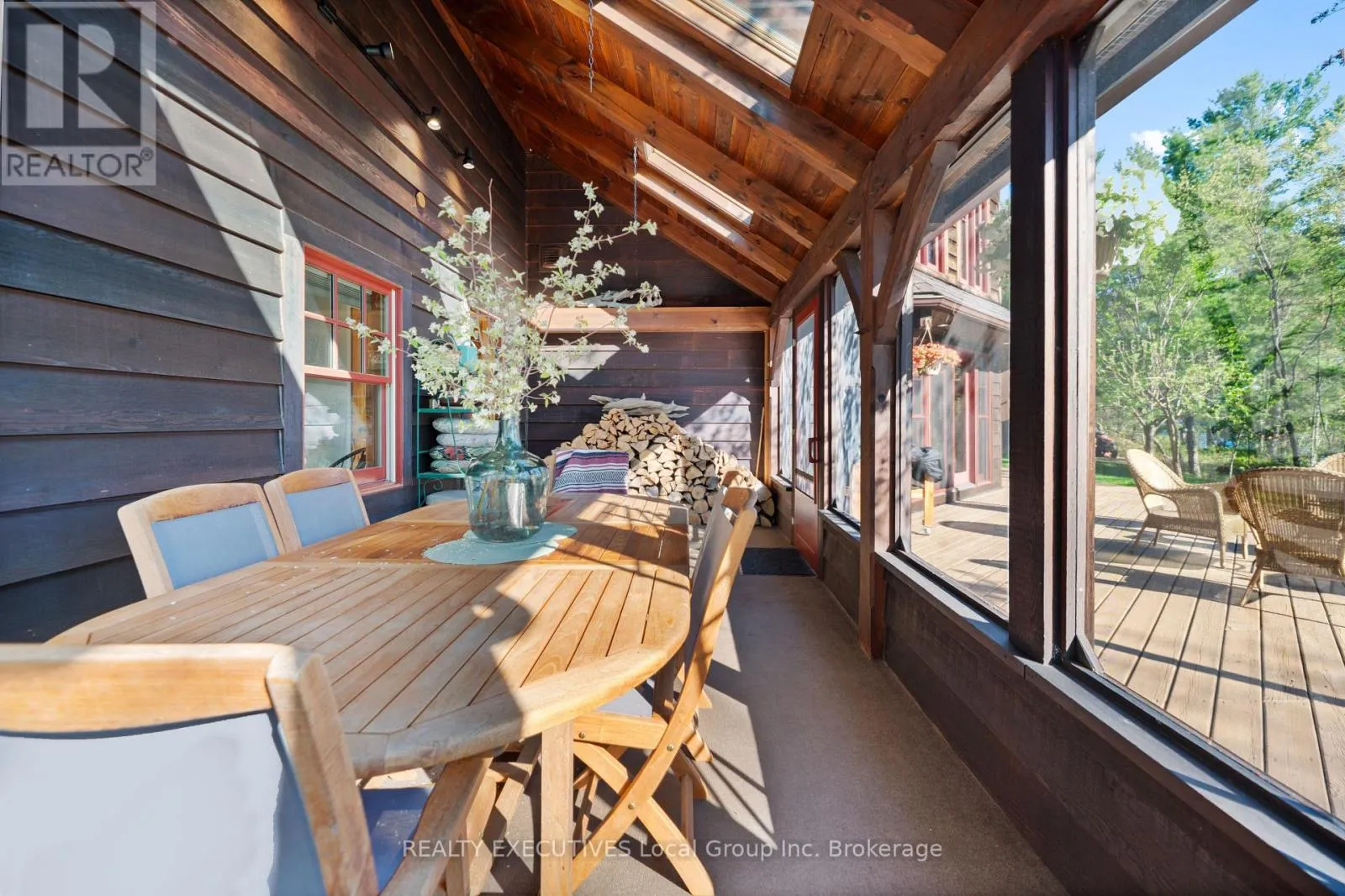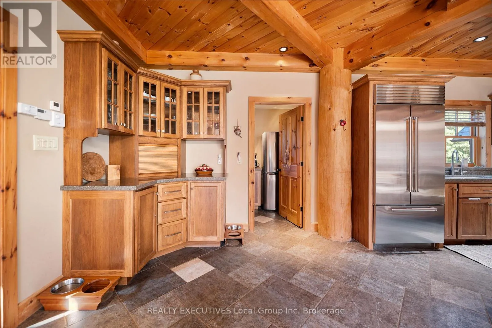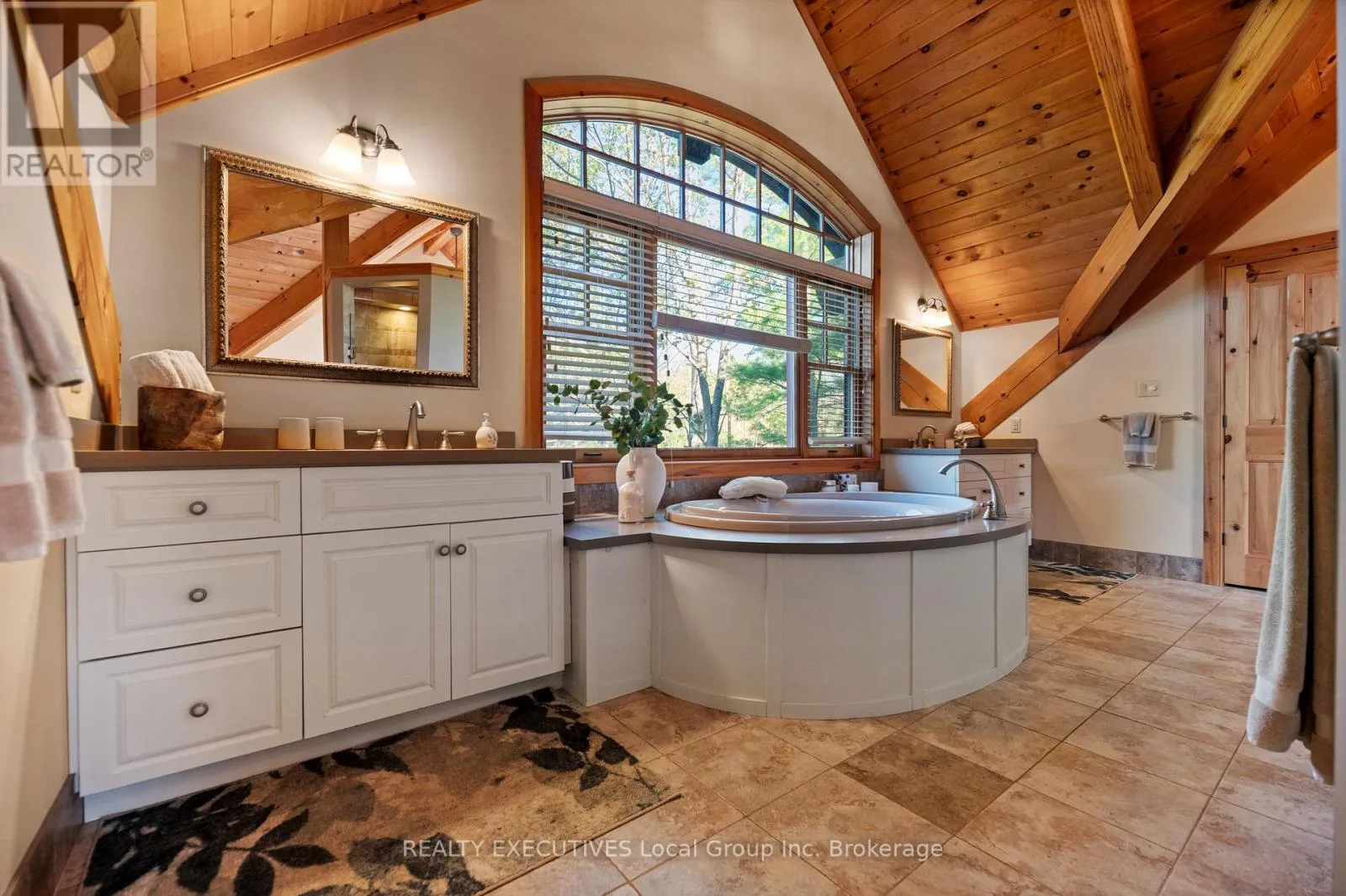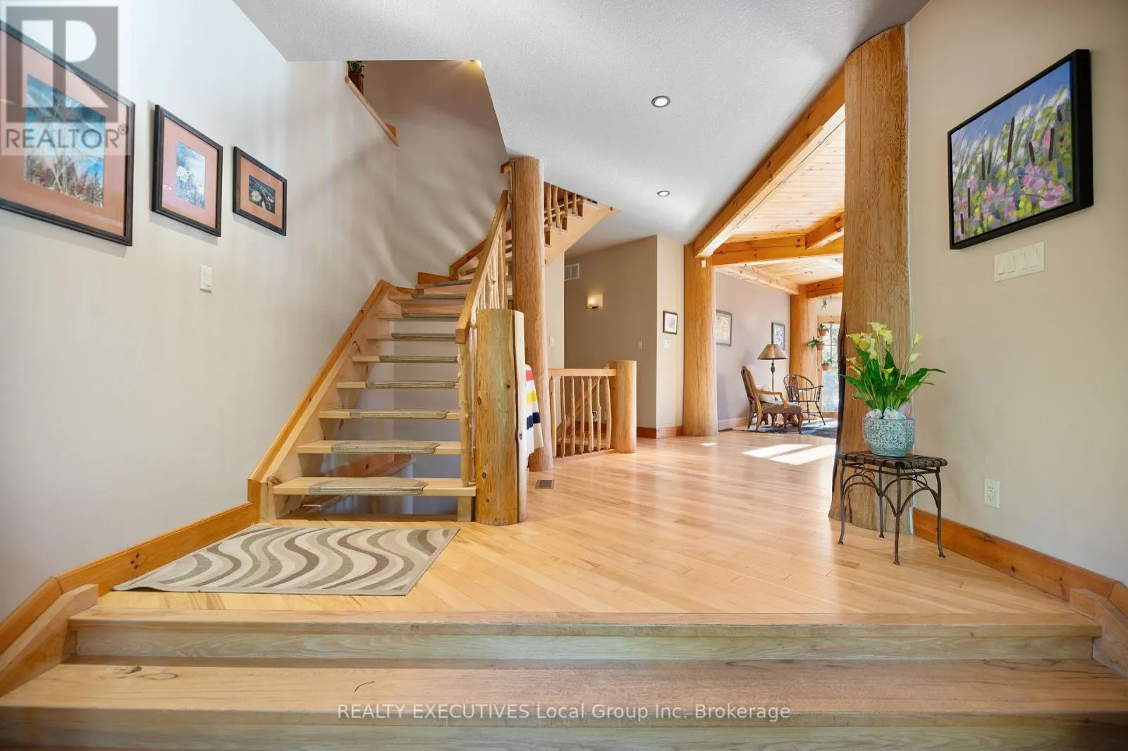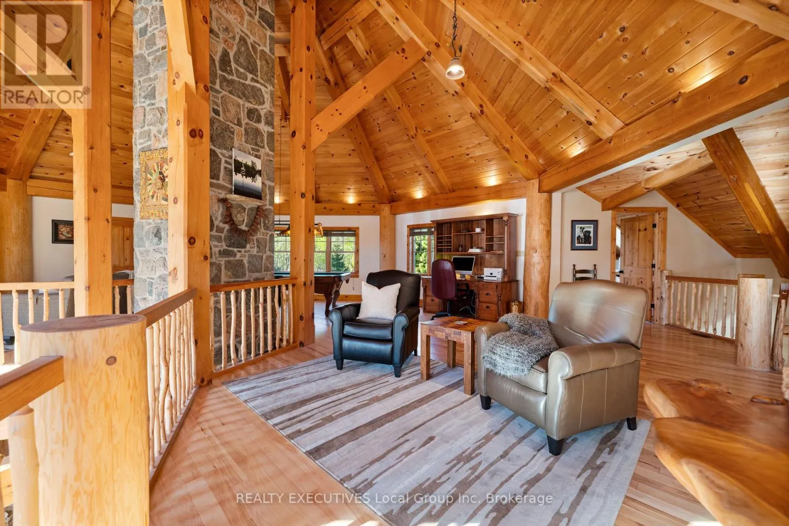 Cross Streets: Hwy 654 & Sunset Cove Rd. ** Directions: Hwy 11S to Hwy 654W. Turn right onto Hwy 11S to Hwy 654W. Turn right onto Sunset Cove Rd, left onto Bear Creek Road and left onto Hunter's Bay Rd. See signs near the end. This magnificent custom-built timber frame home offers luxury lakefront living at its finest, situated on over 300 feet of pristine Lake Nipissing shoreline in Nipissing Township. The 4,000 sq ft residence, constructed in 2008 with exquisite craftsmanship, blends rustic charm with modern comforts. Approach via the driveway to the interlock front driveway and the double-car garage, then ascend the stone stairs to the grand entrance. The main floor impresses with hardwood floors, leading to a spectacular great room where floor-to-ceiling windows flood the space with natural light and showcase views to the second-floor loft. A striking central fireplace with a pizza oven feature serves both the living area and gourmet kitchen, boasting quartz countertops, a professional propane gas range, and a butler's pantry. Three main-floor bedrooms share a three-piece bath, with a versatile sitting/entertainment room (with a two-piece bath). The second level reveals the breathtaking primary suite, complete with lake views, a spa-like ensuite featuring a jacuzzi tub and walk-in shower, dual vanities and closets, plus a spacious loft area perfect for entertaining with a pool table, multiple sitting areas and the laundry room. Outdoor living shines with multiple decks, manicured gardens, a screened three-season sunroom, and a path leading to your private waterfront, complete with a firepit area, dual docks, a boat house, and a sandy beach. The lower-level workshop offers ample space for projects or storage. Every detail reflects quality craftsmanship, from the timber frame construction to the premium finishes. Located in a coveted area of Lake Nipissing's south shore, this property delivers the ultimate waterfront lifestyle while being just 20 minutes to North Bay amenities, local marinas and easy access to premier fishing and boating. This is a rare opportunity to own one of Lake Nipissing's finest residences, where luxury meets authentic Northern Ontario lake living. (id:27476)