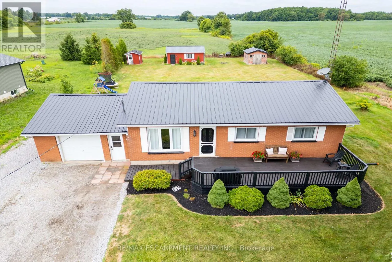 Cockshutt Road Beautifully presented, affordable country property located 10 minutes east of Simcoe's desired amenities that include Hospital, pools/parks, modern shopping centers, fast food eateries & eclectic downtown shops - in route to the popular destination towns that dot Lake Erie's Golden South Coast. Includes tastefully renovated brick bungalow positioned handsomely on 0.57 acre manicured lot, naturally hidden by mature cedar hedge row, boasting 200ft x-deep lot abutting acres of lush, fertile farm fields. Recently painted 340sf street facing, tiered entertainment deck provides access to 1045sf open concept main level highlighted with bright living room - segueing to large eat-in kitchen sporting ample cabinetry, new maple butcher block countertops, brush nickel hardware, tile back-splash, appliances & patio door walk-out to impressive 3-seasons sunroom enjoys walk-out to private 240sf rear deck overlooking panoramic rural vistas. Design continues with 3 sizeable East-wing bedrooms, updated 4pc bath & roomy corridor leading to attached 375sf drywalled/painted garage boasting roll-up garage door & walk-down basement staircase. New low maintenance laminate style flooring through-out main level compliments the freshly redecorated country themed décor with distinct flair. Large unspoiled 1045sf lower level is ready for personal finish - houses laundry station & dwelling's mechanicals include n/gas furnace equipped with AC-2023, n/gas water heater, 100 amp hydro service, water softener/UV water purification system & water pump/pressure tank. 3 versatile sheds (8 x 10 + 14 x12 + 16 x 24 - includes hydro, concrete floor & roll-up door) are strategically situated in the rear yard providing desired storage options. Notable extras - metal roof-2022, baseboard/trim-2022, LED pot lights, crown moulded ceilings, vinyl clad windows, all appliances, excellent drilled water well, independent septic system, oversized aggregate driveway. This "Simcoe Sweetie" will not Disappoint! (id:27476)