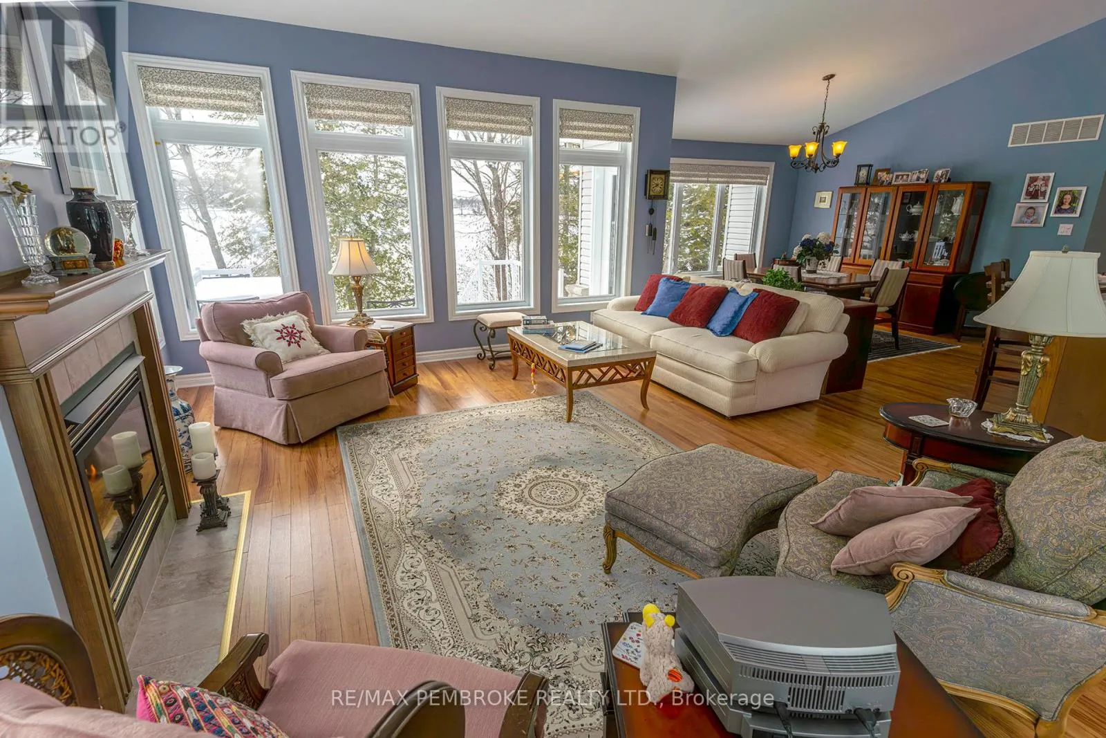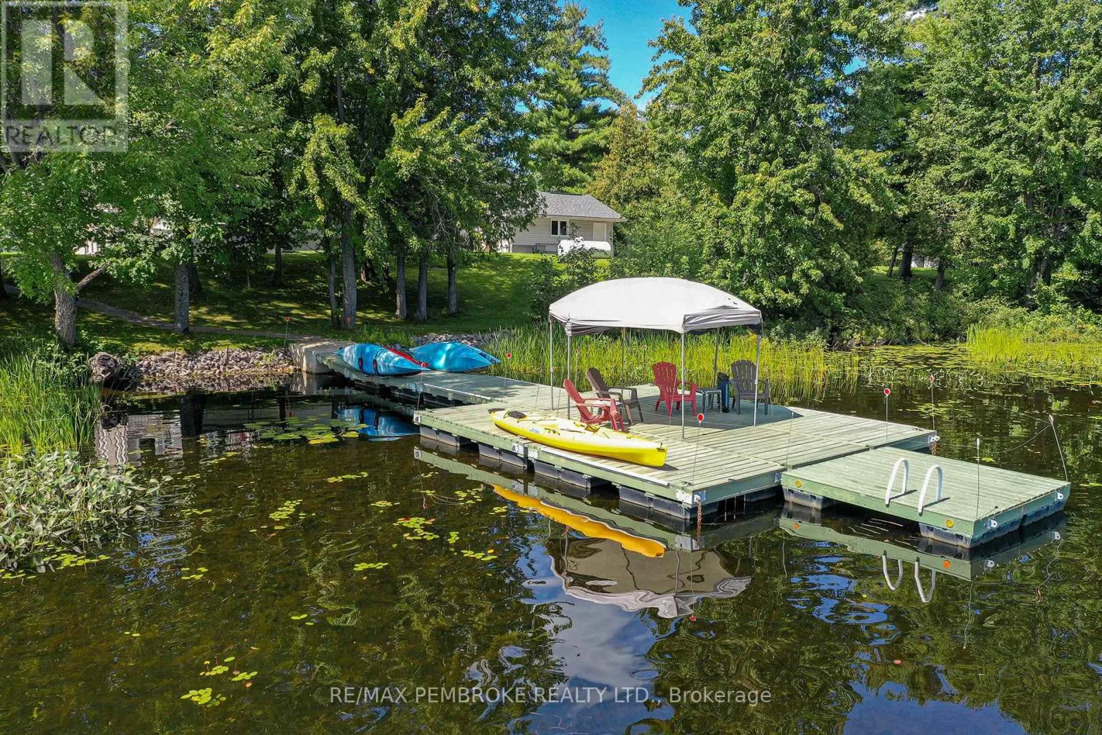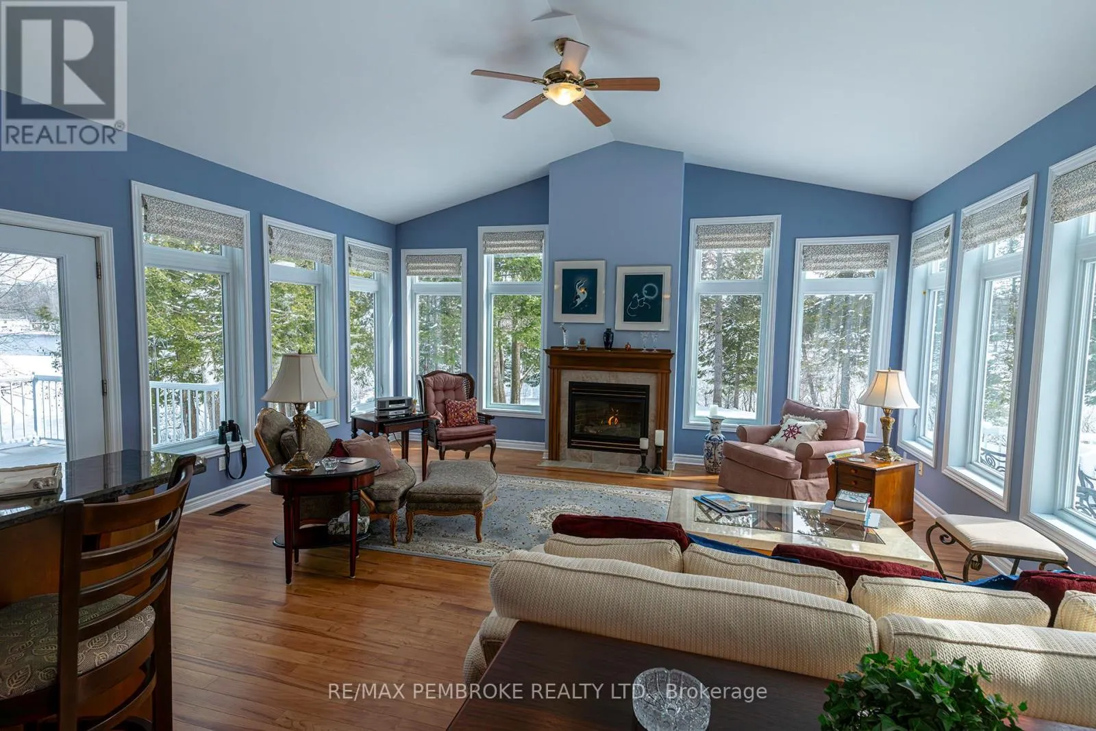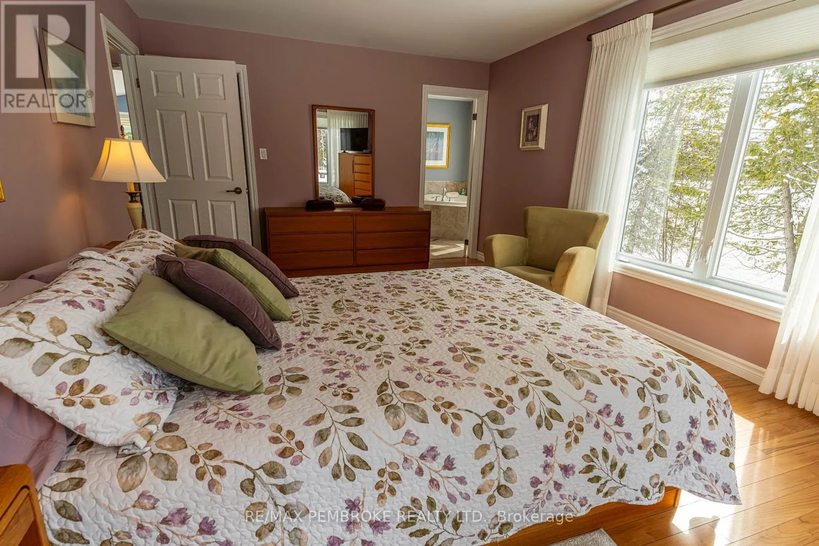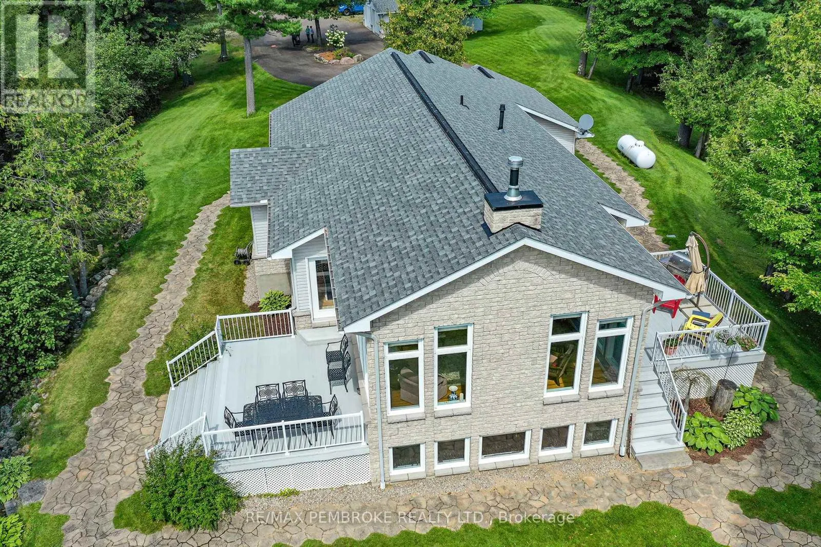 Cross Streets: Hwy 60 and Island View. ** Directions: Hwy 60 and Island View, :Hwy 60 W, Left on Island View Dr in Golden Lake. STUNNING LAKEFRONT home situated on private, estate like 5 acre lot with over 1100 feet of shoreline on desirable GOLDEN LAKE. Built on a breathtaking peninsula surrounded by WATERFRONT (east/west/south) with MATURE PINES & glorious all day sunshine. This high quality ZOMERS custom built 3 bed, 3 bath OPEN CONCEPT bungalow is bursting with high end features throughout. CAPITVATING PANORAMIC Lakes views surround you from all rooms on the main level thanks to the oversized windows, TALL 9ft ceilings, custom hardwood kitchen with granite counter tops & large Island, formal dining area with access to outdoor deck for outdoor summer dinners. LARGE living room area with vaulted ceiling and gas fireplace. Oversized primary bedroom with spa like ensuite bathroom & walk in closet, OVERSIZED mudroom with main floor laundry. TALL & bright finished lower level features; bar, LARGE rec room with gas fireplace, 3rd bedroom, gym area (could easily be space for 4th/5th bedroom), 3rd full bathroom and walk out direct access to the attached garage. this home has a ICF (insulated concrete form) foundation & radiant heated floors (lower level , kitchen, bathrooms). PRIVACY & TRANQUILITY awaits you outside with: extensive landscaping, two separate decks on opposite sides of the house, lush flat yard, 90ft of floating dock to moor your boats, plus your own private sandy beach and fire pit. Attached OVERSIZED 1 car garage and a second detached garage (28ft x36ft). The home is hardwired with a full sized Generator in case of power outages, Irrigation, Gated entry, FULL Paved Driveway, NEW shingles 2023 on house and detached garage. START making YOUR Lakefront memories a reality by, boating, fishing, swimming paddle boarding, kayaking, water skiing, tubing, ice fishing or snowmobiling! Just 600m off ON-60. 10mins to Eganville, 25mins to Pembroke, 85 mins to Ottawa. (id:27476)