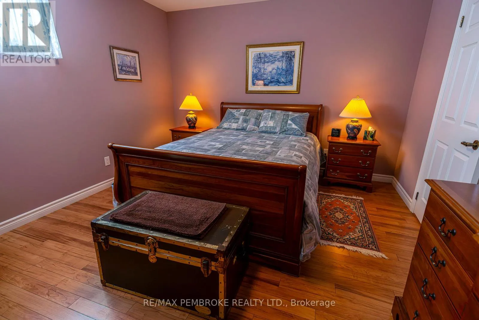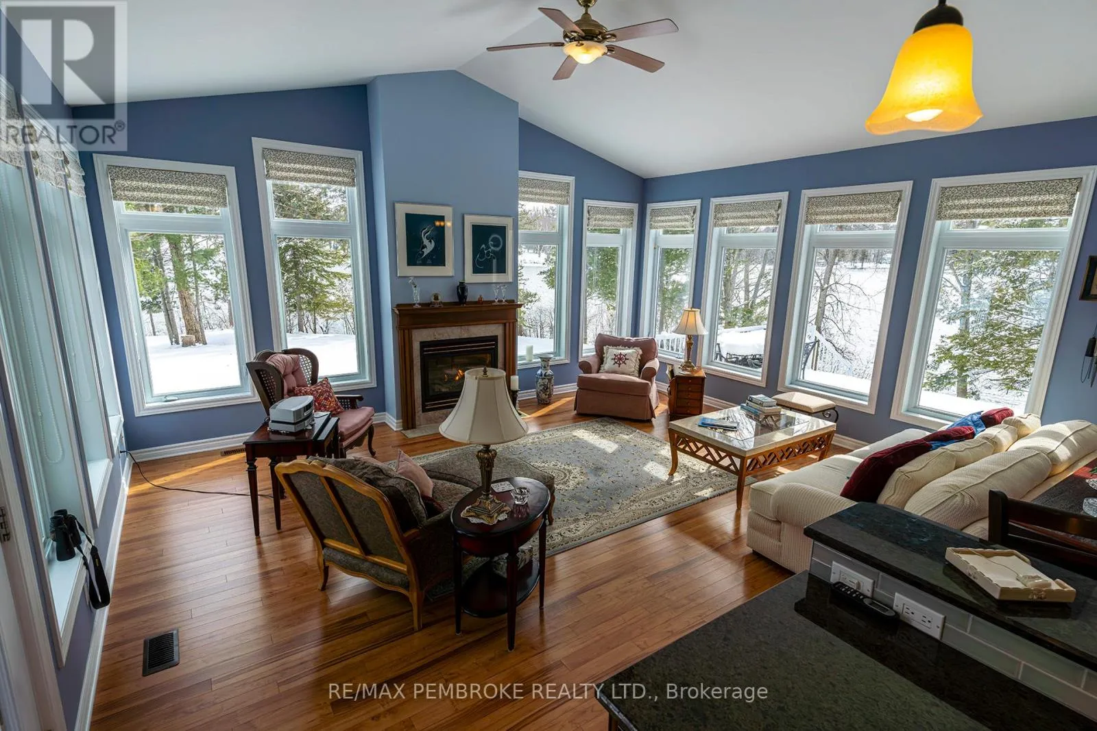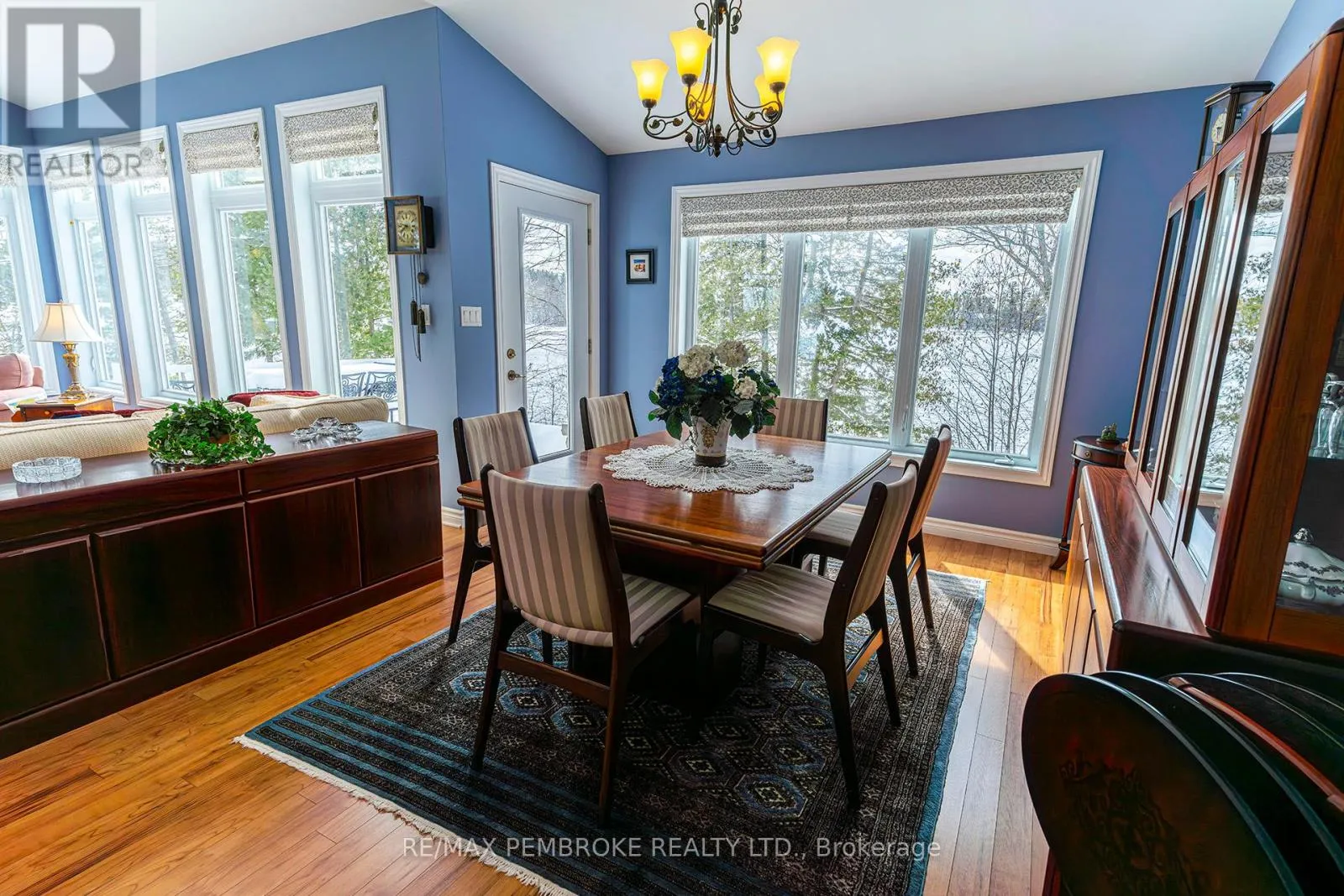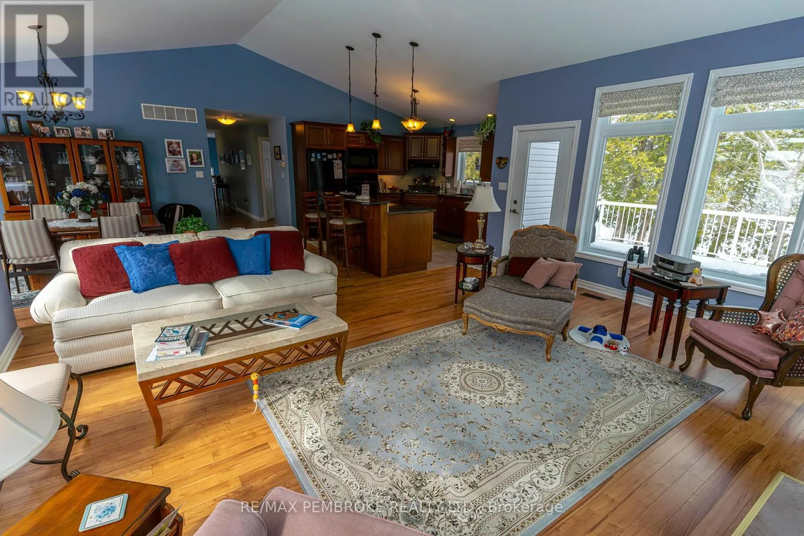 Cross Streets: Hwy 60 and Island View. ** Directions: Hwy 60 and Island View, :Hwy 60 W, Left on Island View Dr in Golden Lake. STUNNING LAKEFRONT home situated on private, estate like 5 acre lot with over 1100 feet of shoreline on desirable GOLDEN LAKE. Built on a breathtaking peninsula surrounded by WATERFRONT (east/west/south) with MATURE PINES & glorious all day sunshine. This high quality ZOMERS custom built 3 bed, 3 bath OPEN CONCEPT bungalow is bursting with high end features throughout. CAPITVATING PANORAMIC Lakes views surround you from all rooms on the main level thanks to the oversized windows, TALL 9ft ceilings, custom hardwood kitchen with granite counter tops & large Island, formal dining area with access to outdoor deck for outdoor summer dinners. LARGE living room area with vaulted ceiling and gas fireplace. Oversized primary bedroom with spa like ensuite bathroom & walk in closet, OVERSIZED mudroom with main floor laundry. TALL & bright finished lower level features; bar, LARGE rec room with gas fireplace, 3rd bedroom, gym area (could easily be space for 4th/5th bedroom), 3rd full bathroom and walk out direct access to the attached garage. this home has a ICF (insulated concrete form) foundation & radiant heated floors (lower level , kitchen, bathrooms). PRIVACY & TRANQUILITY awaits you outside with: extensive landscaping, two separate decks on opposite sides of the house, lush flat yard, 90ft of floating dock to moor your boats, plus your own private sandy beach and fire pit. Attached OVERSIZED 1 car garage and a second detached garage (28ft x36ft). The home is hardwired with a full sized Generator in case of power outages, Irrigation, Gated entry, FULL Paved Driveway, NEW shingles 2023 on house and detached garage. START making YOUR Lakefront memories a reality by, boating, fishing, swimming paddle boarding, kayaking, water skiing, tubing, ice fishing or snowmobiling! Just 600m off ON-60. 10mins to Eganville, 25mins to Pembroke, 85 mins to Ottawa. (id:27476)