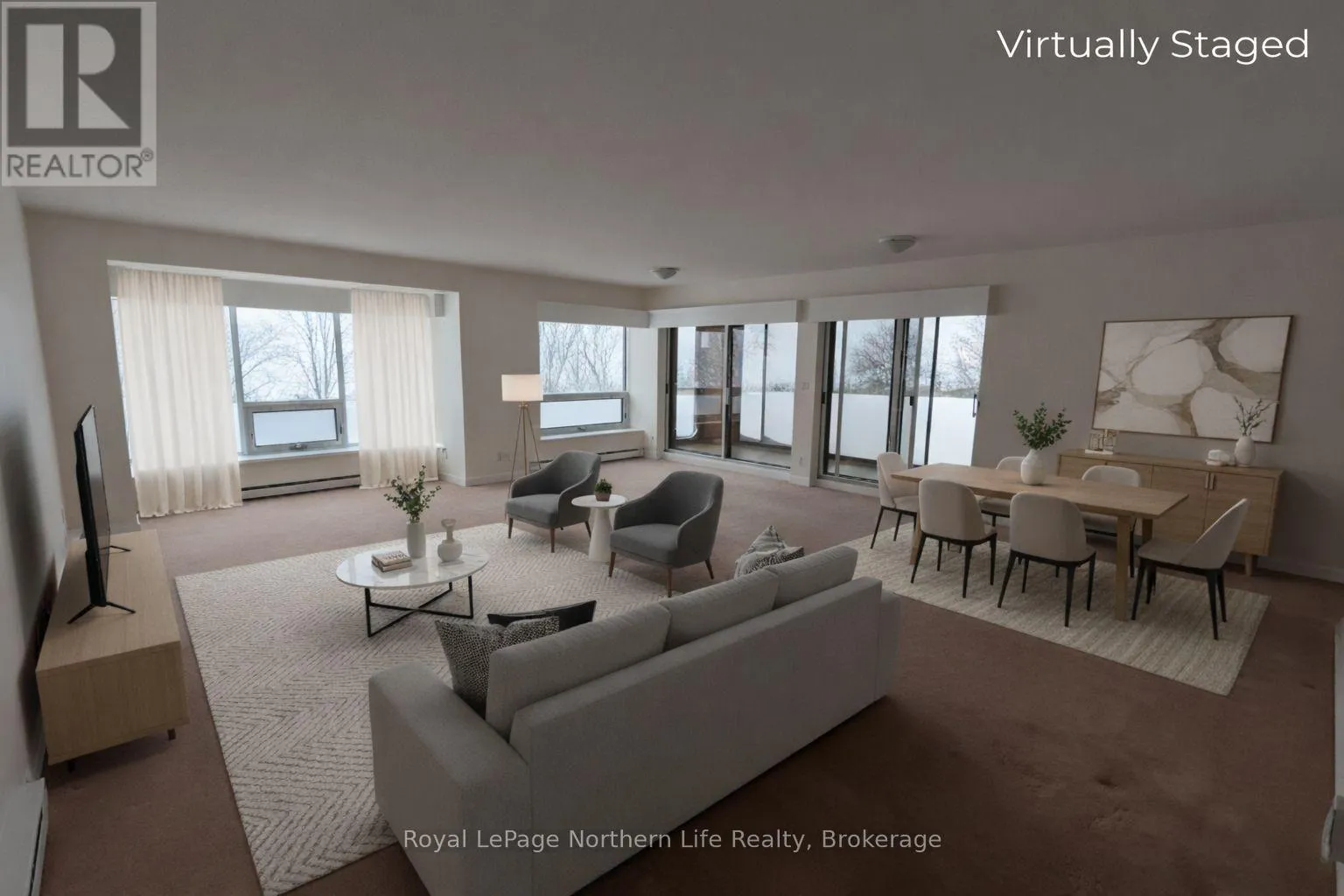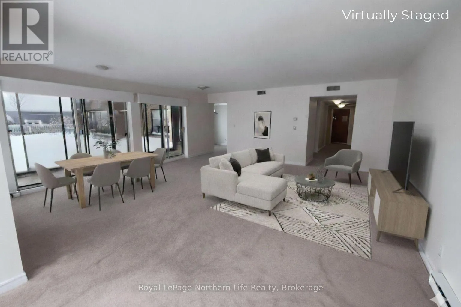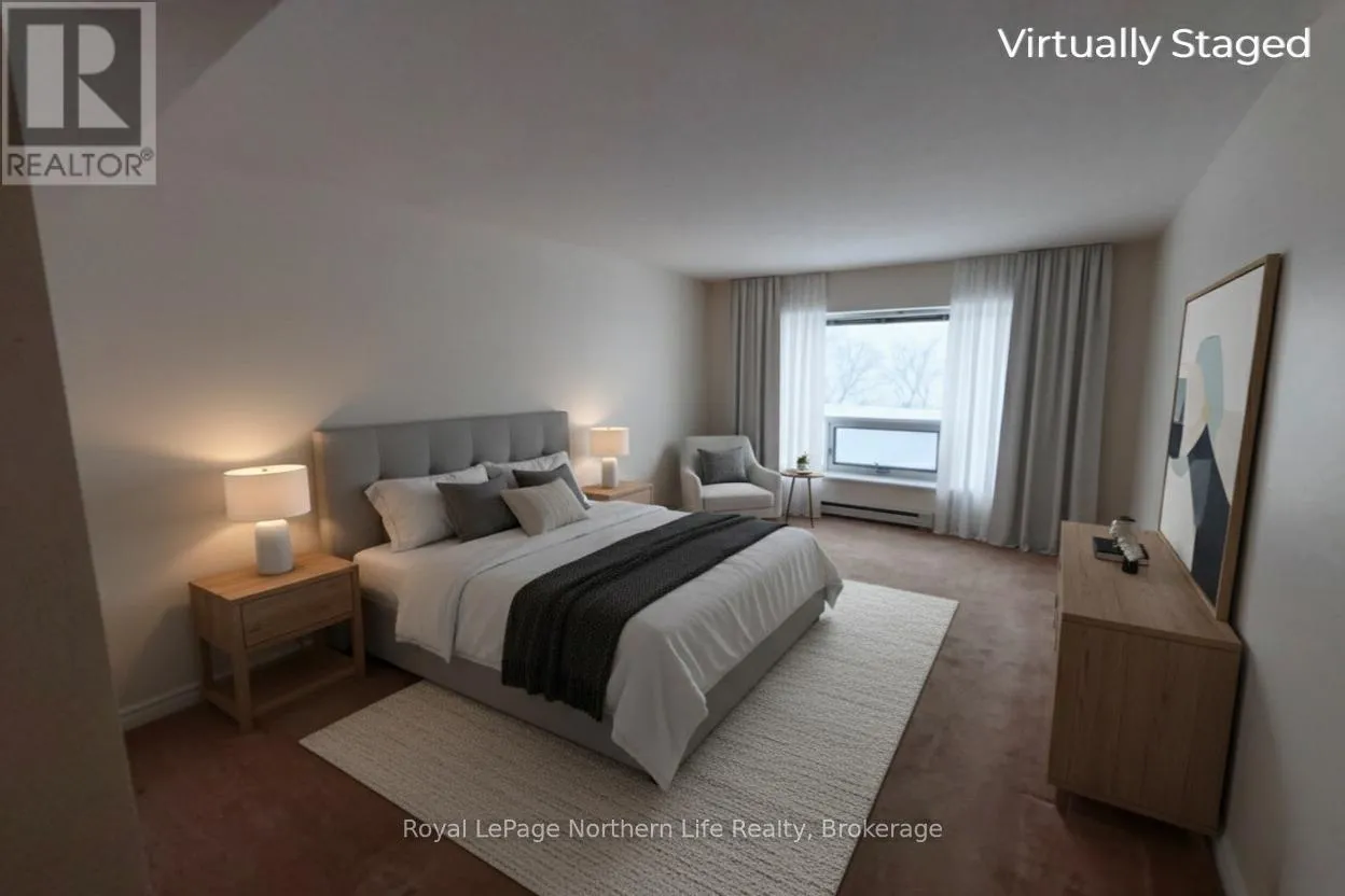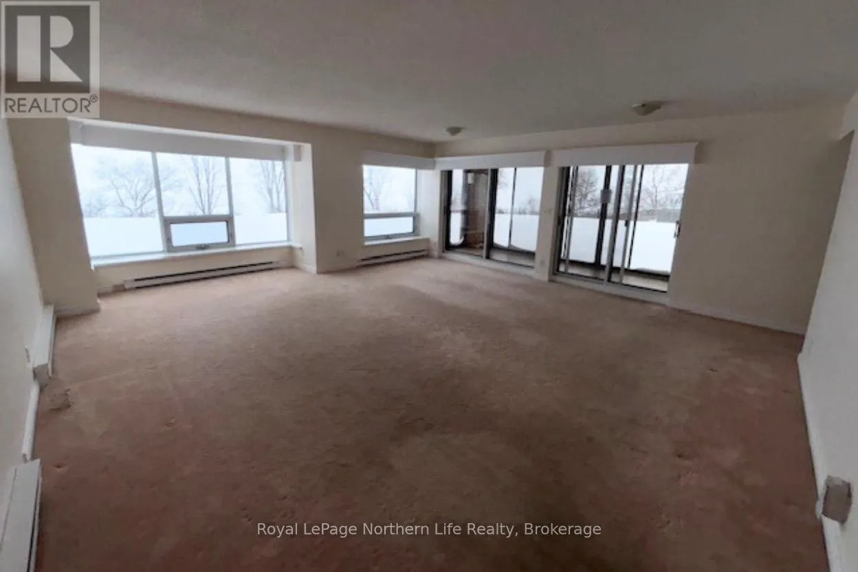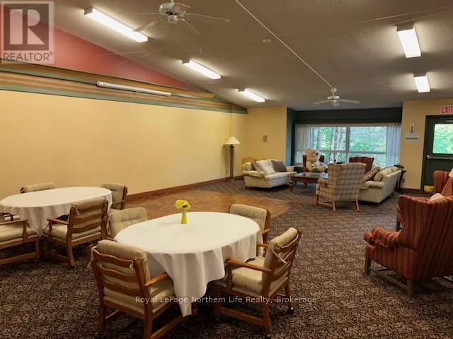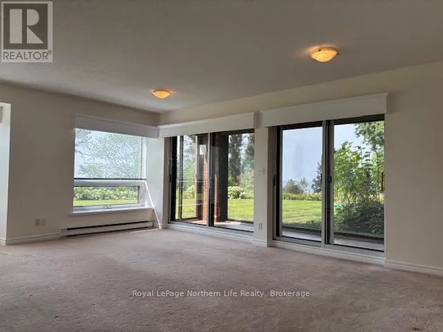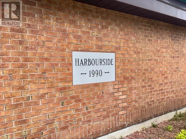 Cross Streets: Timmins Street & Main St W. ** Directions: Main Street W to Timmins St to 155 Timmins St \"Harbourside\". Harbourside condo - 114-155 Timmins Street. Beautiful 1740 sqft 2 bedroom main floor condo overlooking beautiful Lake Nipissing. This fine condo features large wide open living room, dining area with large new windows overlooking a Lake and access to a 3 season patio enclosed to view those beautiful sunsets. Galley style kitchen with eat-in area that overlooks enclosed patio area and appliance package. Primary bedroom has windows to lakeside, walk-in closet and second closet area. 1-5 bath with marble floor, double sinks, separate shower and soaker tub. On the other side of the suite you have a second bedroom and a 1-4 pc bath with tile floor. Good size laundry area with washer and dryer and room for freezer. Air conditioned throughout. 2 parking spaces, one covered close access outside and one by tennis court. Updated pool area . Party room and 2 guest suites in building. Secure access to condo. Don't miss out on this gem. (id:27476)