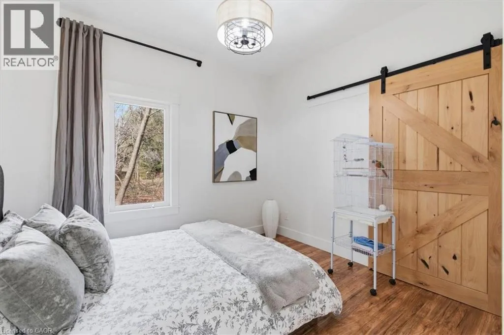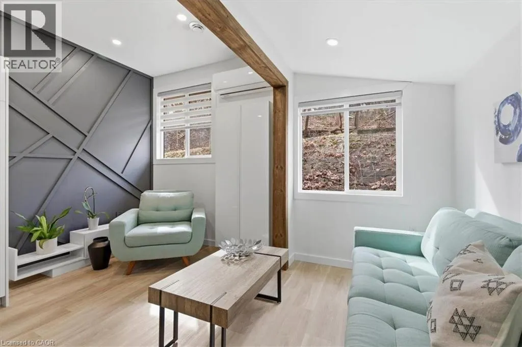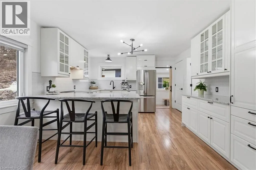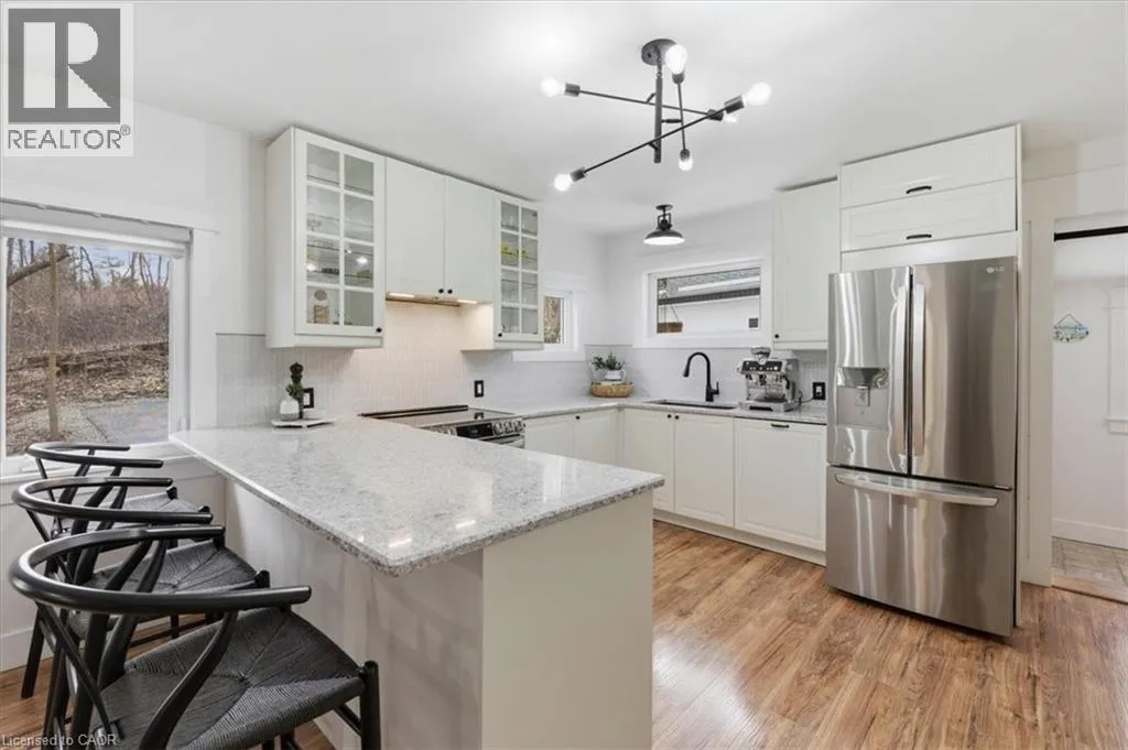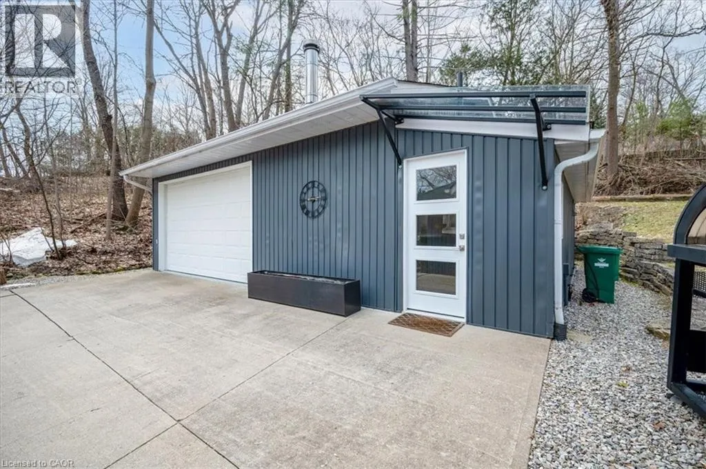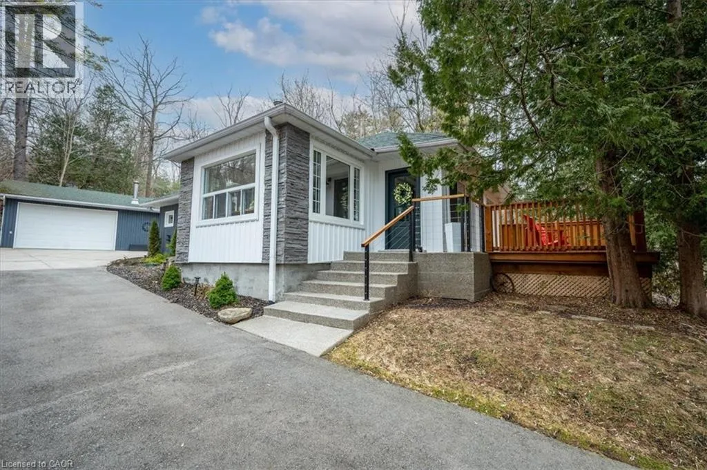 Hwy 24 South to Footbridge Road to West River. Sitting on one acre of land, nestled along the wooded banks of the grand river, this recently updated home is ready to be yours, in the quaint neighborhood of Sheps Subdivision, North Dumfries. At a quick glance, you get the feeling that youâve left the city hours behind, but itâs actually a scenic 8 minute drive to downtown Galt. The home and detached garage take advantage of the deep lot as they sit back from the road, the mature trees create a natural buffer making the property more private. The bungalow is approximately 1466 square feet of pure charm. A three-panel floor to ceiling window and sliding door separate the foyer from the front facing deck which overlooks the pond and creates the spot for you to enjoy your morning coffee. The living room is the perfect example of how immersed the home is into its natural surroundings, windows on all three sides and a skylight; you wonât suffer from the lack of natural light here. The formal dining room separates the living room from the eat in kitchen, rightfully occupying a major part of the main floor space. Wrap around quartz countertops form a peninsula that can seat three. Storage and display cabinetry fully utilize the wall space adding function and elegance with stainless steel appliances. The home hosts two bedrooms and two bathrooms, one is a 3 piece and one is a luxury 5 piece, complete with free standing soaker tub and the shiplap wall finishing of the mudroom laundry continues to bring the cottage feel. The second structure on the property is dual purposed. Itâs a detached garage or shop space, and right beside it with a separate entrance and its own heating and cooling system, an additional bachelor dwelling unit complete with kitchen, bathroom, and laundry. Furnace (2023), Septic system rebuild (2023) You will be hard pressed to find a property so close to the city that offers the privacy and versatility like this one! (id:27476)