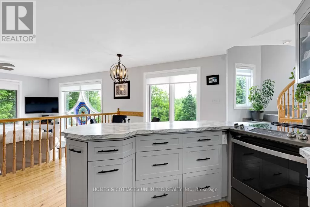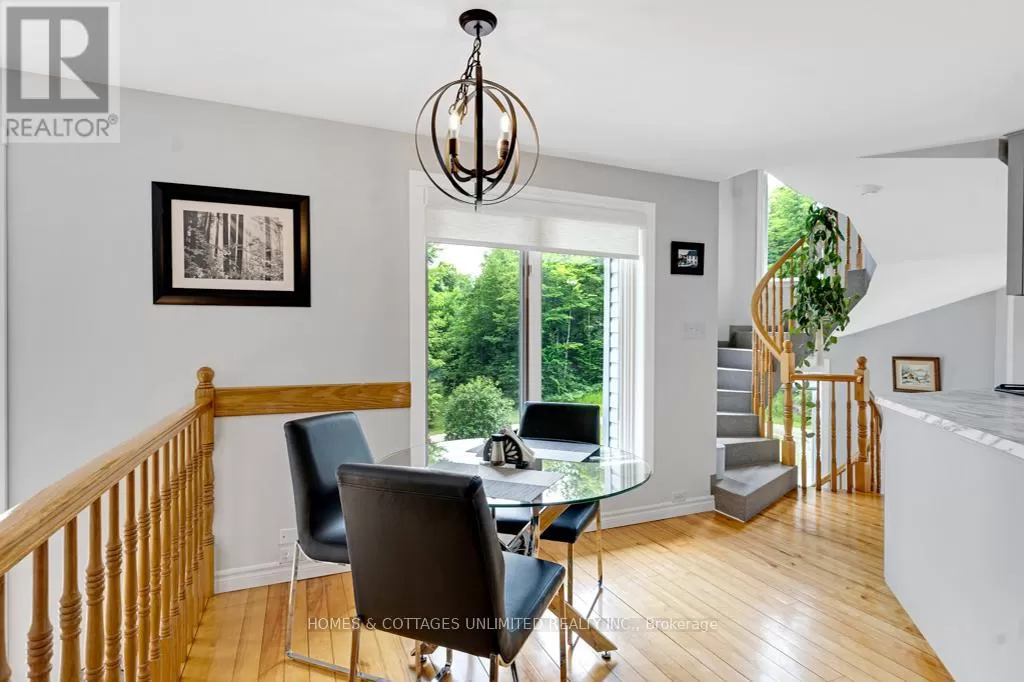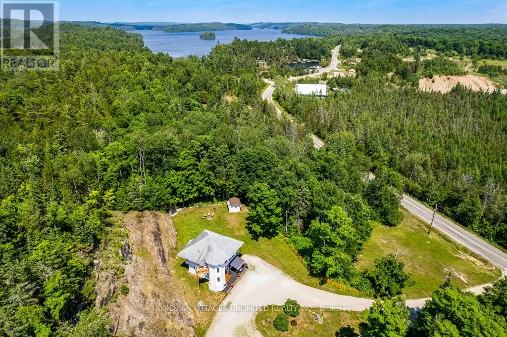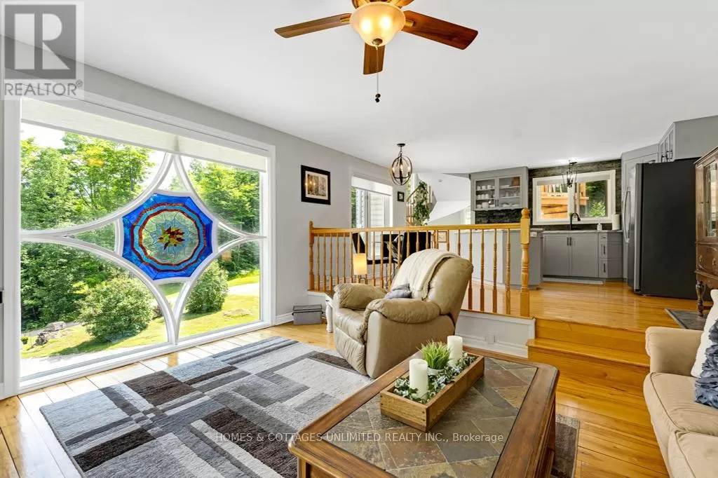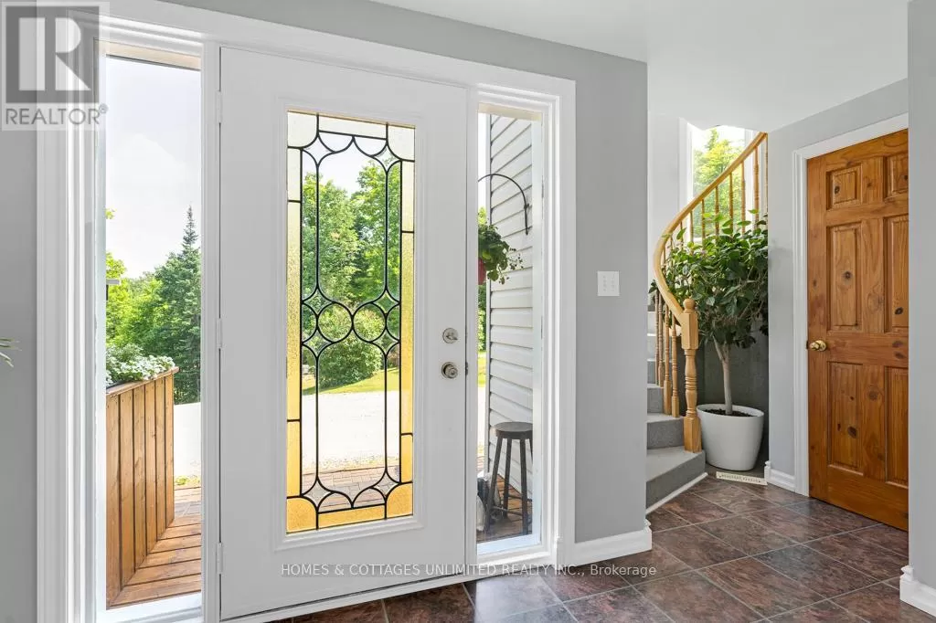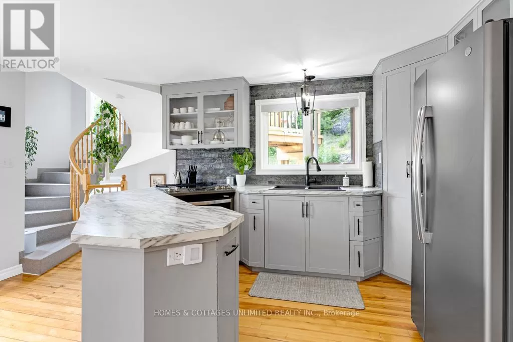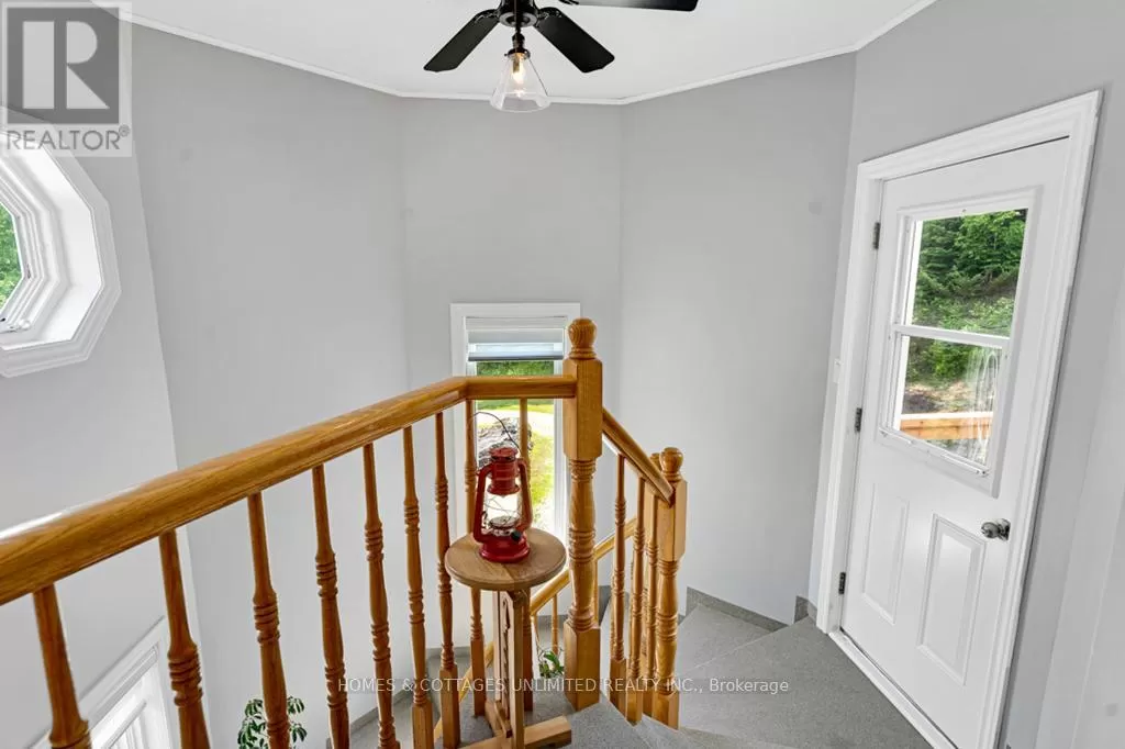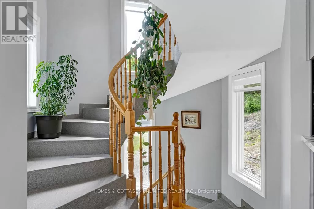 Cross Streets: Road 506. ** Directions: Located btw Ompah and Plevna on Hwy 509. Step into a home where every step is met with positive energy and charm. Inspired by castles and impeccably maintained, this light-filled haven offers a rare blend of whimsical design and contemporary comfort.The open-concept kitchen overlooks a cozy sunken living room, while a graceful circular staircase with granite-textured steps leads to a finished loft, ideal as a creative space or quiet retreat. Hardwood and laminate floors provide timeless appeal throughout.The walk-out lower level features a welcoming bar and generous storage, while the main floor bath conveniently doubles as a laundry space. A private backyard with a shed offers room to garden or unwind, and the raised balcony is perfect for evening sunsets and stargazing with a glass of wine in hand.Just a short stroll to the sandy shores of Palmerston Lake, and mere minutes to local conveniences including a hardware store, LCBO, market, and restaurant with the vibrant town of Perth only an hour away.A rare offering for those drawn to something magical, memorable, and entirely their own. (id:27476)