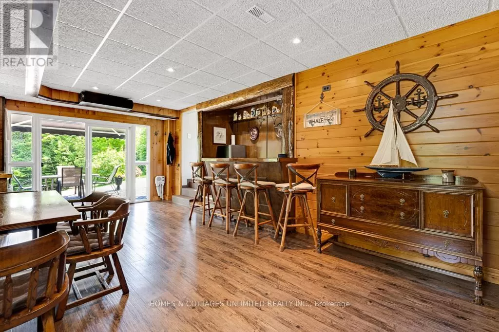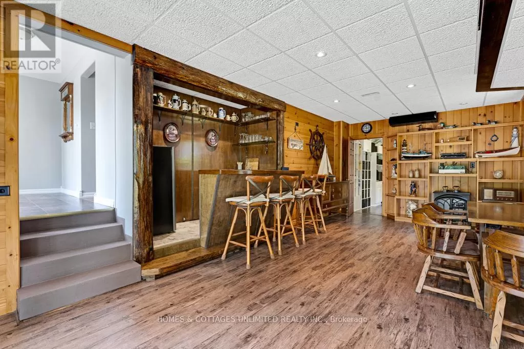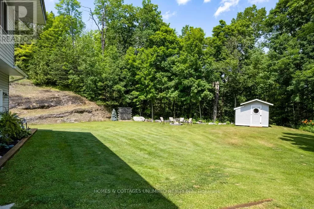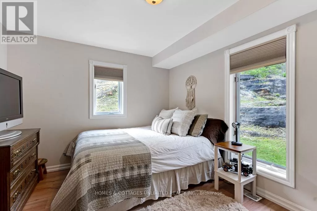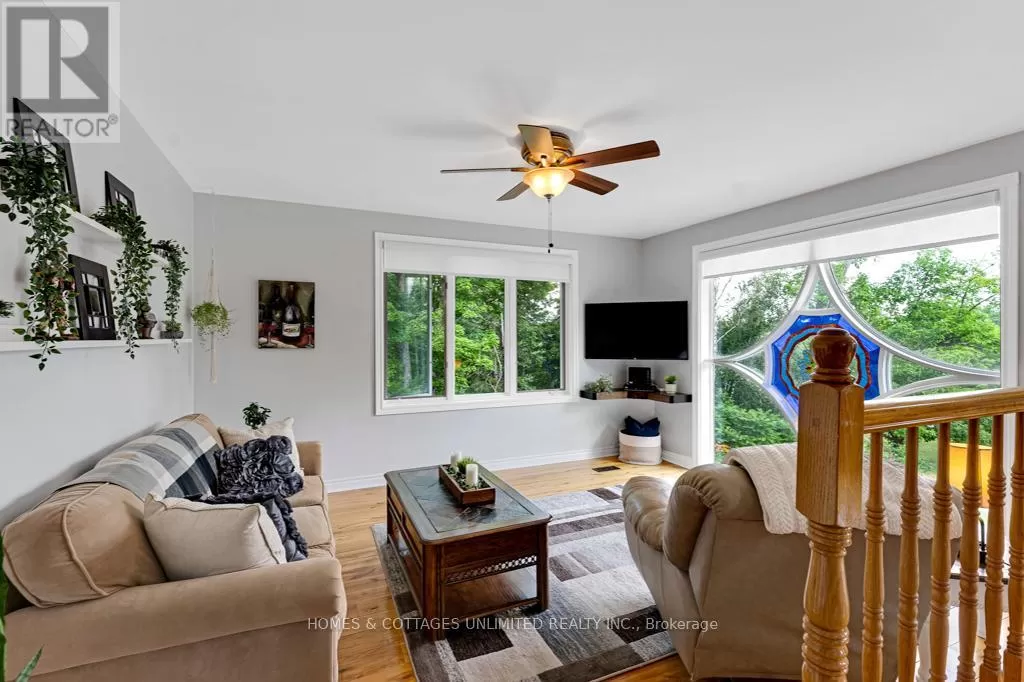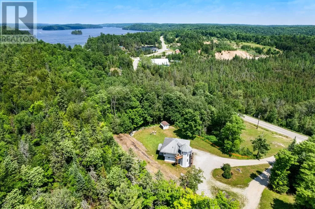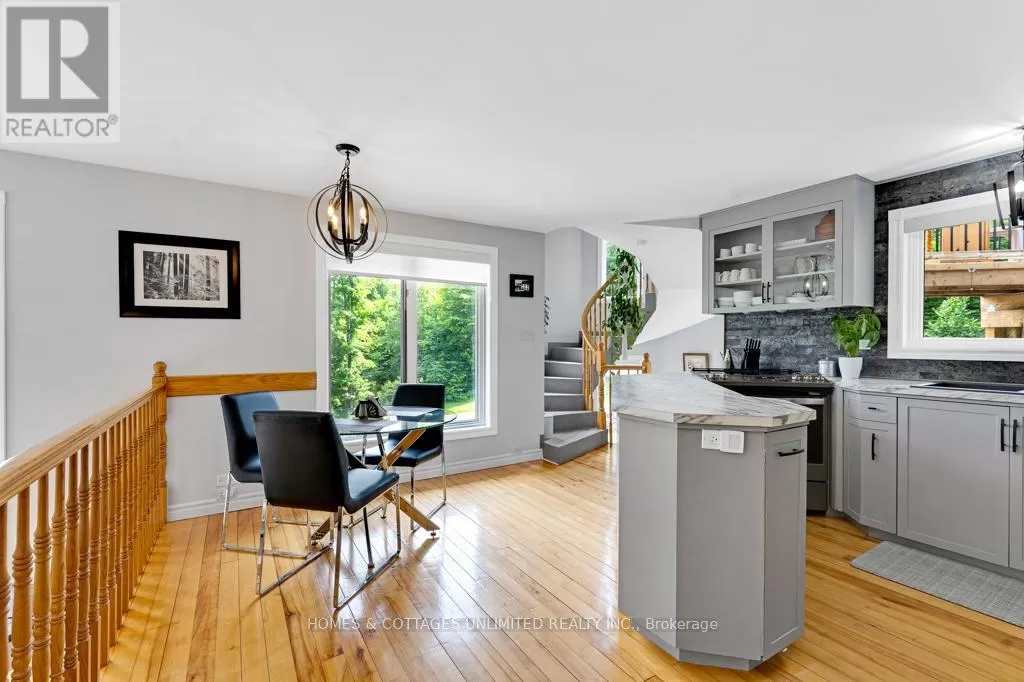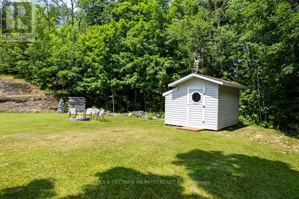 Cross Streets: Road 506. ** Directions: Located btw Ompah and Plevna on Hwy 509. Step into a home where every step is met with positive energy and charm. Inspired by castles and impeccably maintained, this light-filled haven offers a rare blend of whimsical design and contemporary comfort.The open-concept kitchen overlooks a cozy sunken living room, while a graceful circular staircase with granite-textured steps leads to a finished loft, ideal as a creative space or quiet retreat. Hardwood and laminate floors provide timeless appeal throughout.The walk-out lower level features a welcoming bar and generous storage, while the main floor bath conveniently doubles as a laundry space. A private backyard with a shed offers room to garden or unwind, and the raised balcony is perfect for evening sunsets and stargazing with a glass of wine in hand.Just a short stroll to the sandy shores of Palmerston Lake, and mere minutes to local conveniences including a hardware store, LCBO, market, and restaurant with the vibrant town of Perth only an hour away.A rare offering for those drawn to something magical, memorable, and entirely their own. (id:27476)