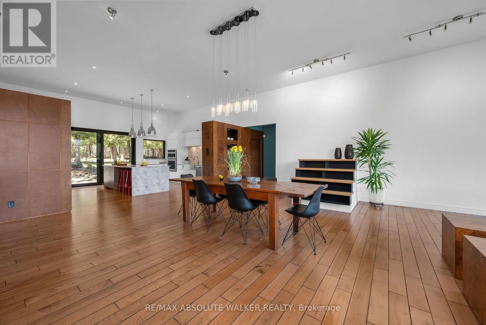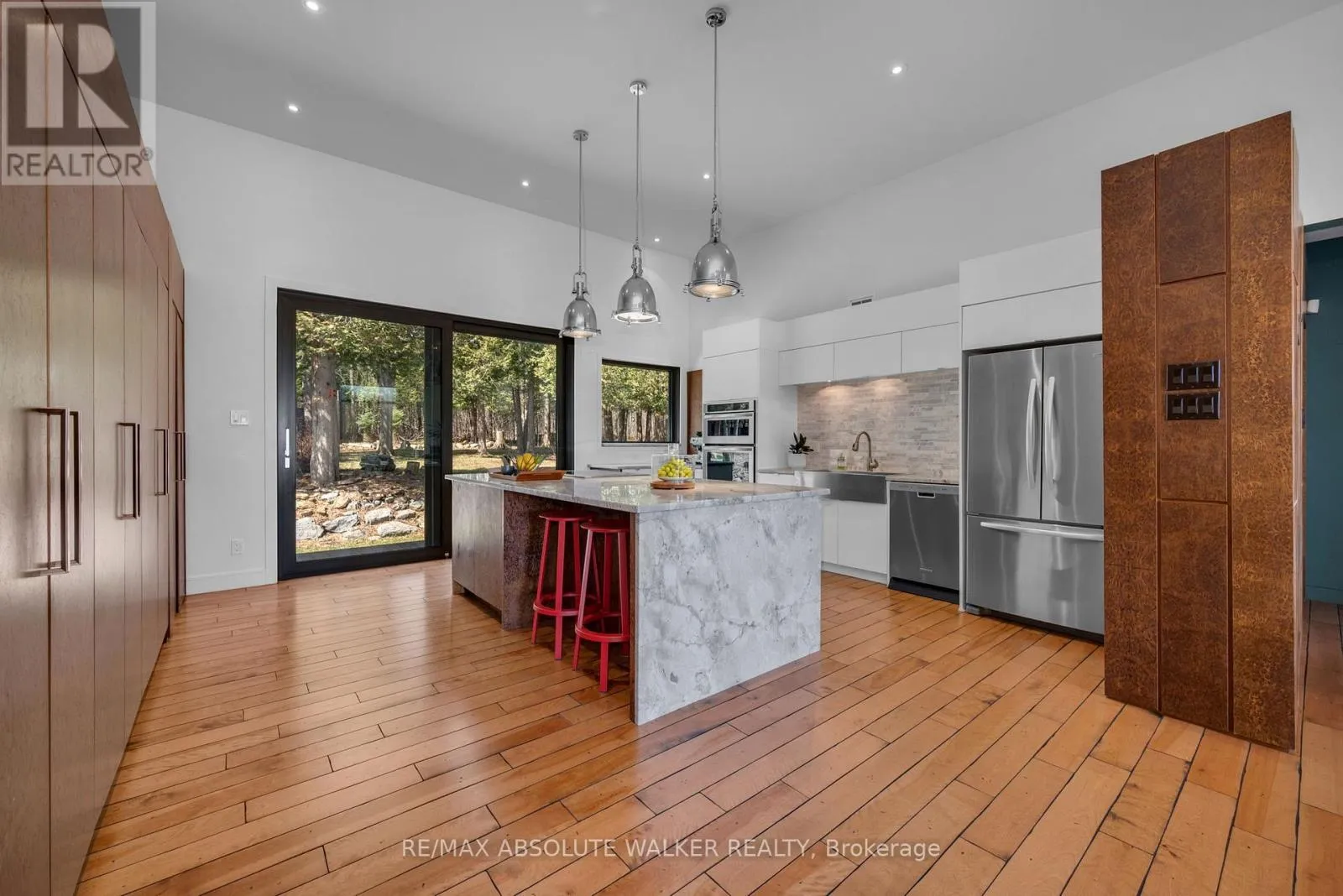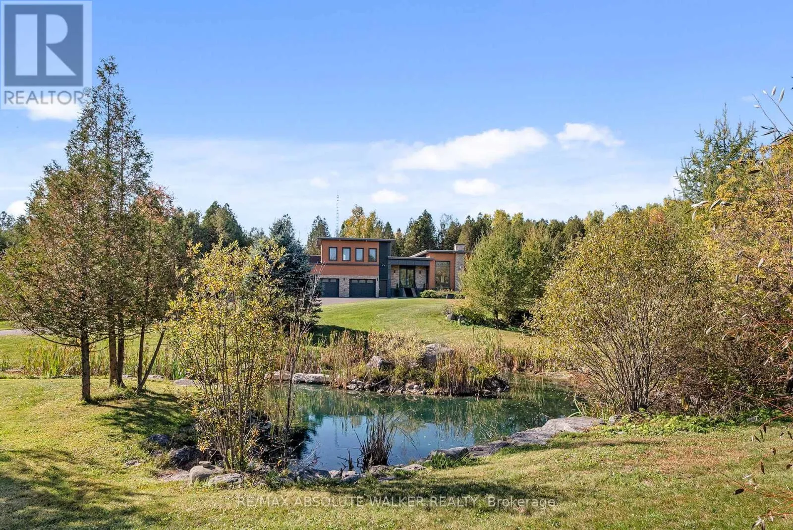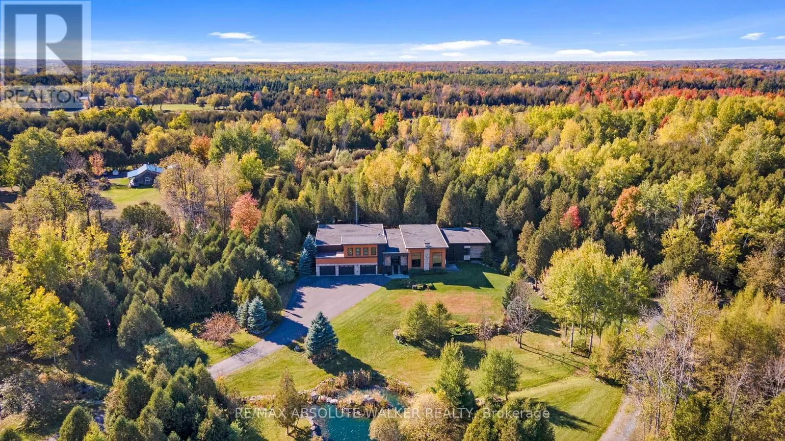 Highway 34 west on Kenyon Concession Road approx 4.5 miles Welcome to 19421 Kenyon Concession 1, an architecturally distinctive home built in 2013 that seamlessly blends modern craftsmanship with natural beauty. Set on 75 breathtaking acres of forests, ponds, and private trails, this property offers unparalleled privacy and tranquility perfect as a primary residence, second home, or commercial retreat. The custom-built home features four spacious bedrooms and four bathrooms. Highlights include a huge walk-in pantry with an extra refrigerator, and an office overlooking the impressive rec room, ideal for productivity. The primary bedroom suite features two luxurious ensuite bathrooms, one with a soaker tub and the other with a walk-in shower, and two walk-in closets. A second bedroom, perfect for guests or teens, includes a walk-out deck with lovely views. The versatile lower level includes an in-law suite, an additional bedroom, hobby room, laundry room, and TV space. A screened-in porch lets you enjoy nature while keeping out bugs, and a hot tub hookup is already installed. Built with exotic woods and commercial-grade finishes, this home includes energy-efficient features such as geothermal heating, a backup generator, and solar potential for year-round comfort. Open-concept living areas are filled with natural light, creating an inviting atmosphere for relaxation and entertaining. Starlink is installed and the property is high-speed internet ready, making it ideal for modern remote work. A large outbuilding provides space for storage or creative projects, and the climate is ideal for hobby farming. Extensive trails lead to Loch Garry, a 900-acre recreational lake, with diverse habitats supporting rich wildlife, making this property a true haven for nature lovers. With a meticulously designed interior and stunning natural surroundings, this is a rare opportunity to experience luxury, privacy, and ecological harmony in one of Ontarios most picturesque regions. Don't miss your chance to own this exceptional home! (id:27476)