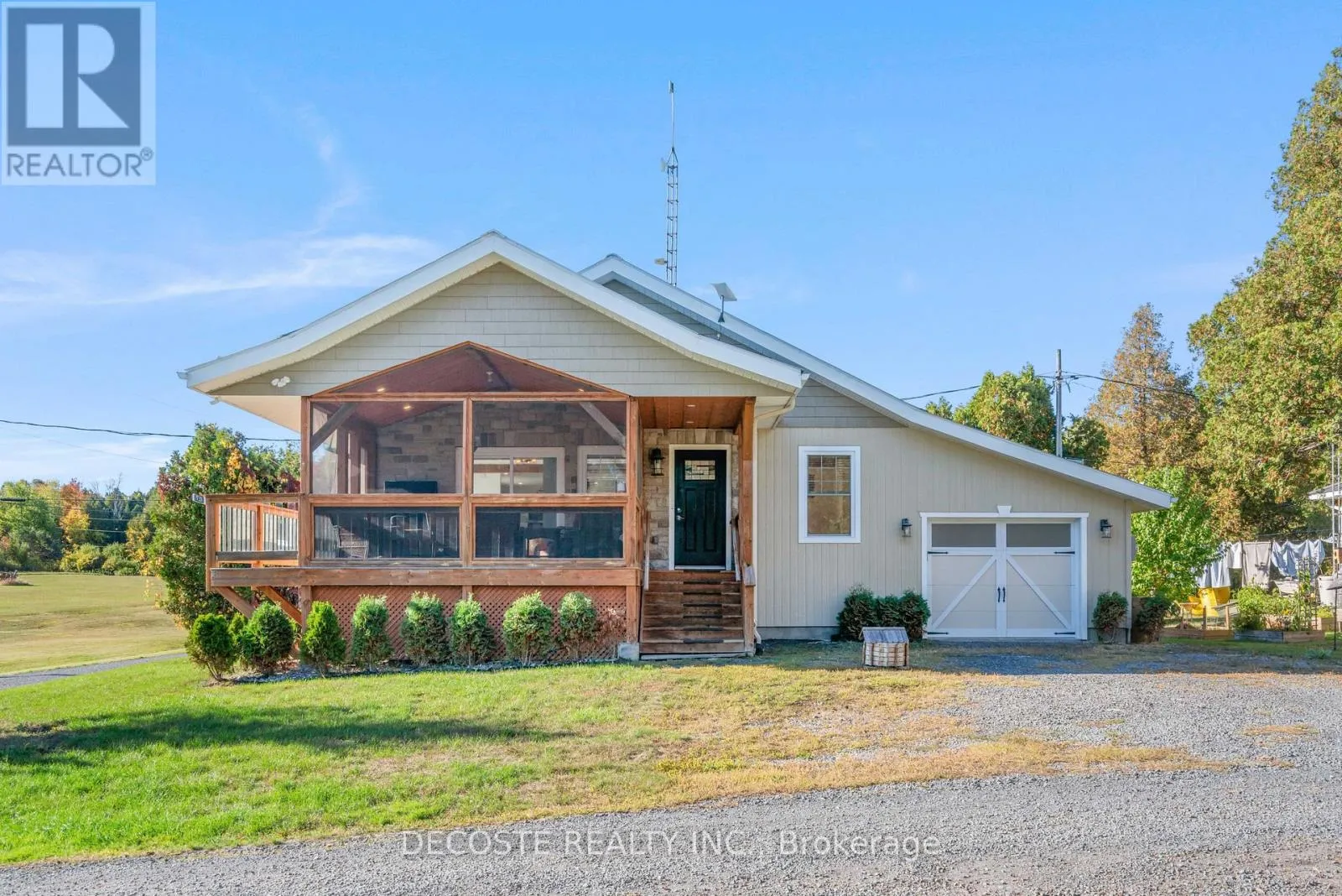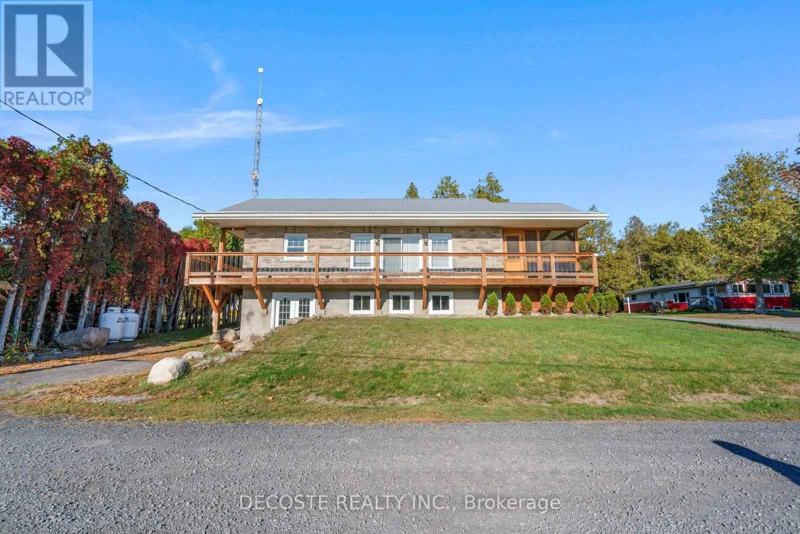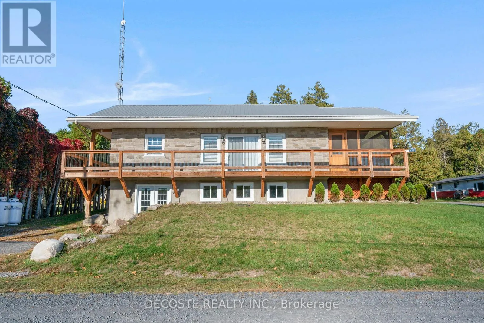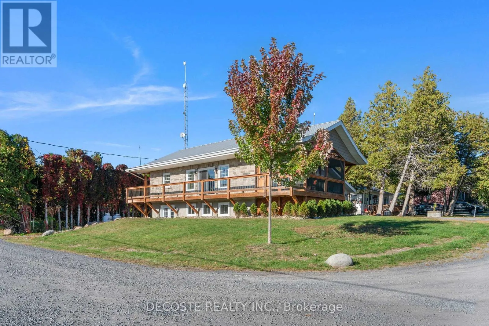 Cross Streets: Masterson Rd & Second St. ** Directions: Take County Rd 43 from County Rd 34, turn left on Loch Garry Rd and left on Masterson Rd to property at the corner of Masterson Rd and Second St. Spectacular Home with a Magnificent View of Loch Garry Lake! Built in 2017 with quality craftsmanship, this raised bungalow offers stunning lake views and modern comfort. The stone exterior and two-sided wraparound deck set the tone for relaxed lakeside living. Enjoy the enclosed 3-season porch featuring a built-in propane fireplace and TV area - the perfect spot to unwind year-round. Additional highlights include an attached single-car garage, a walk-out basement with potential for an in-law suite, and radiant floor heating throughout for cozy winters, complemented by a heat pump for efficient air conditioning in summer. The main floor showcases exposed barn beams, a bright modern kitchen with a farmhouse sink, quartz countertops, built-in oven and stove, and stainless steel appliances. Ceramic flooring, ceiling fans, and two sets of patio doors leading to the deck and covered porch add to the homes charm and functionality. With direct access to Loch Garry and a beautiful sandy beach, this property offers more than just a home its a retreat where you can truly relax and enjoy life by the water. (id:27476)