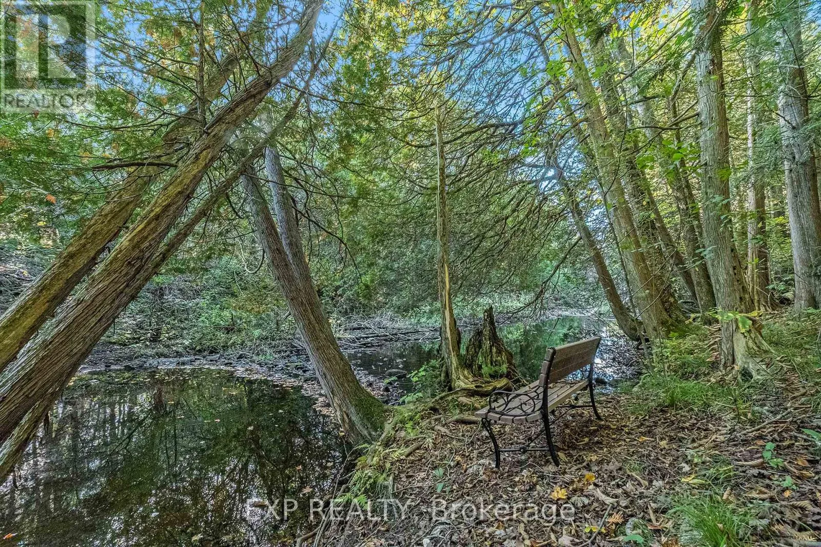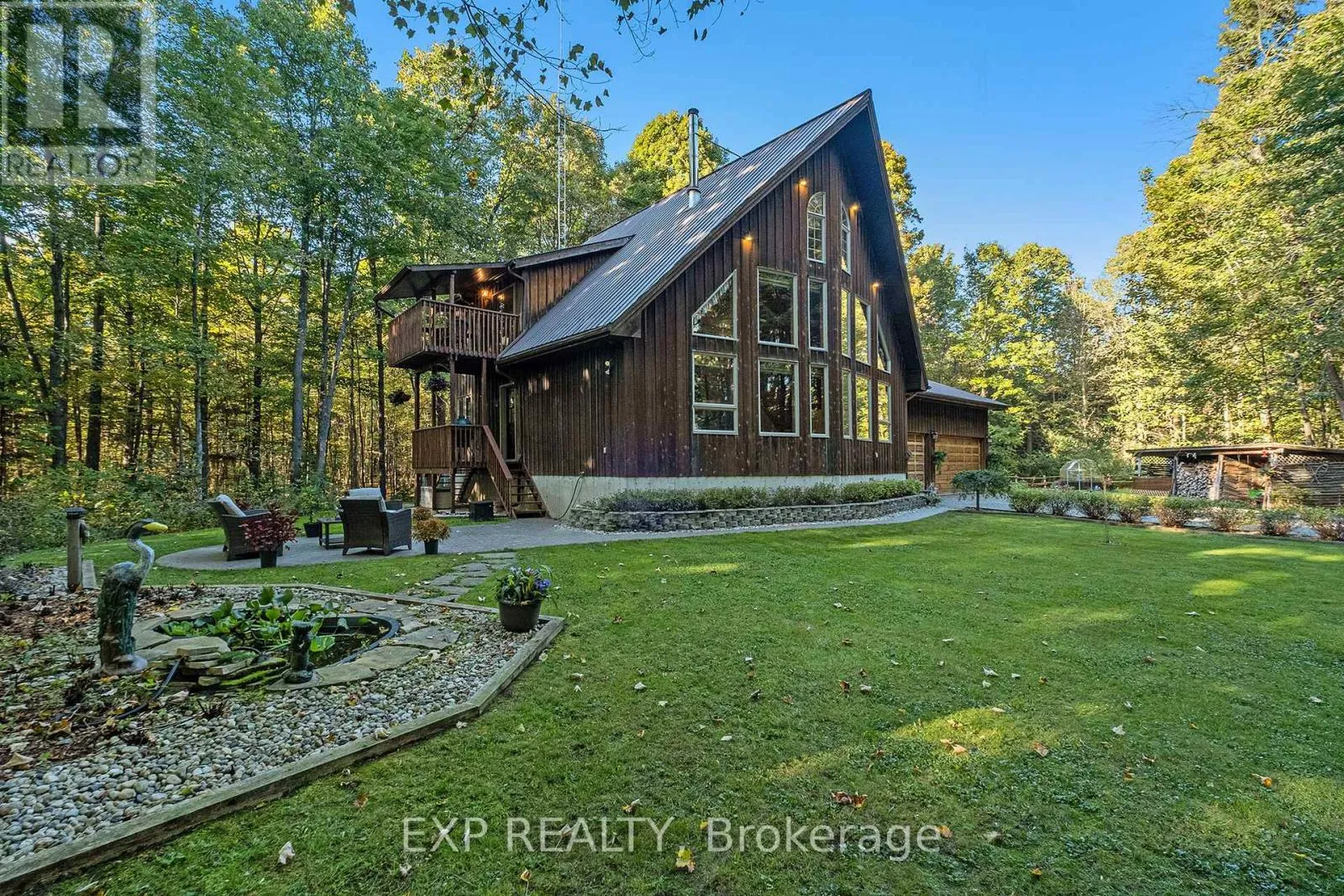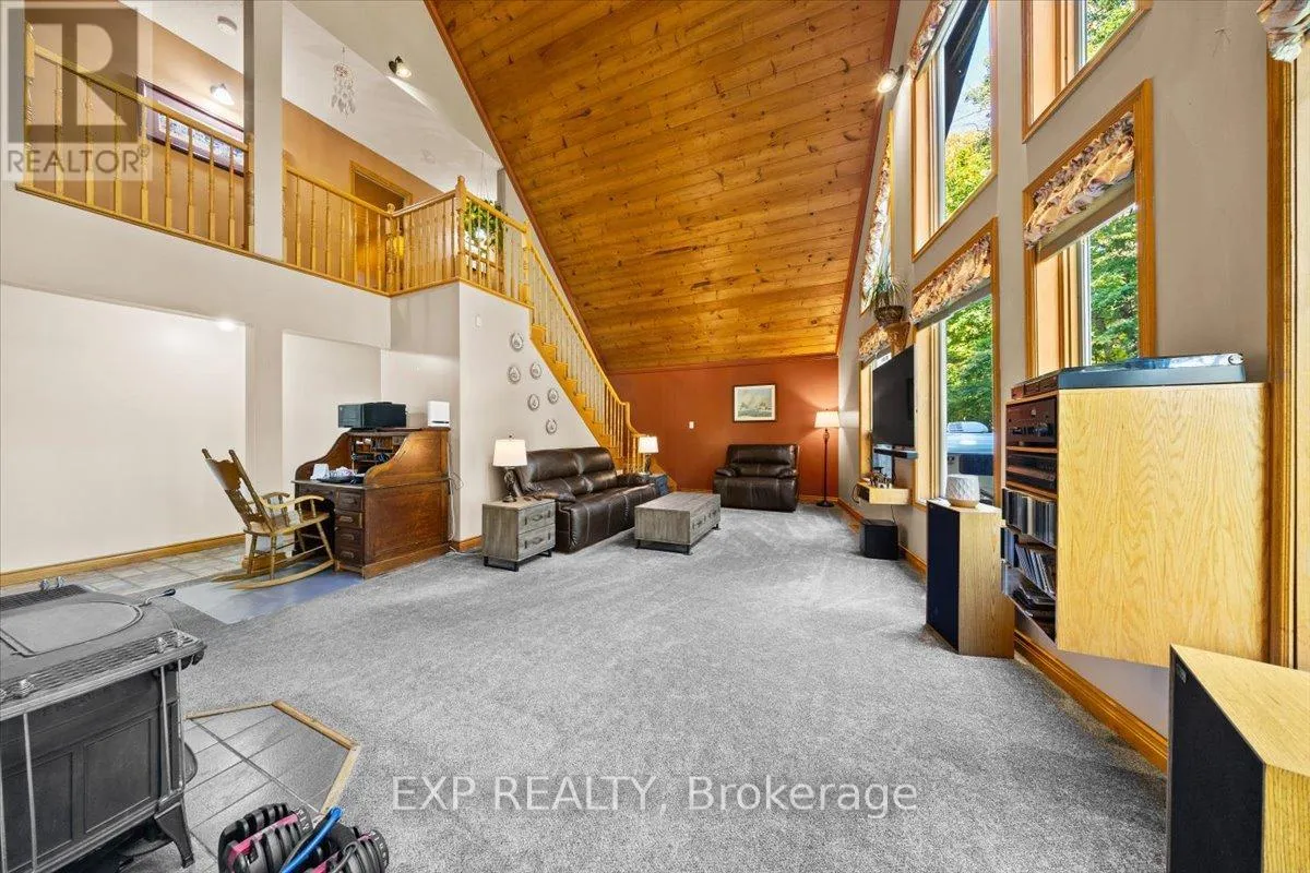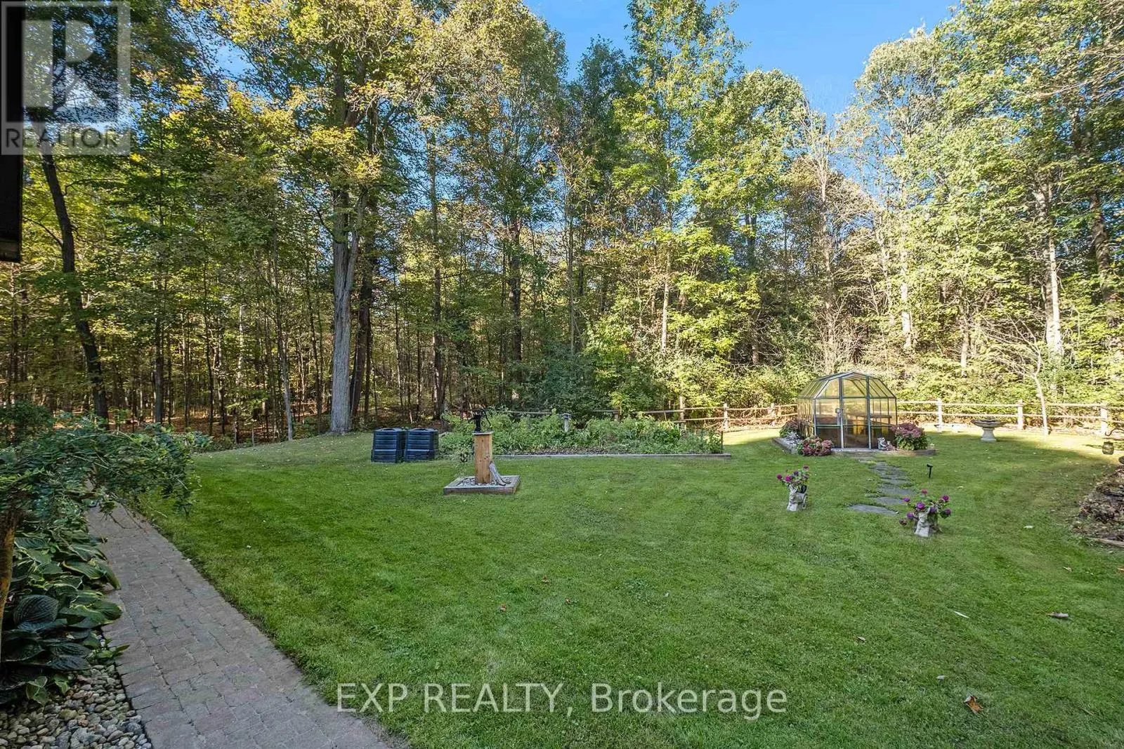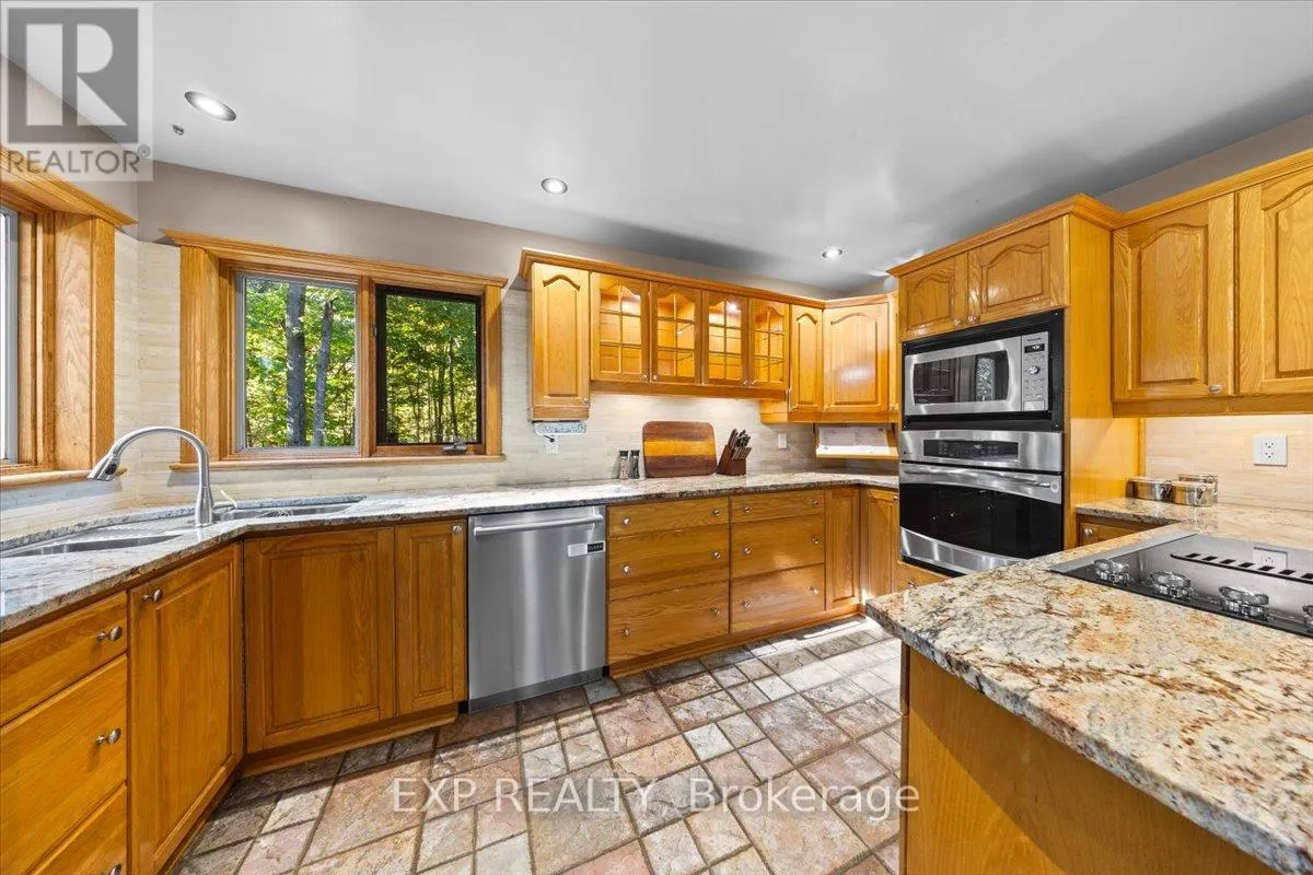 Take Highway 43 east from Merrickville, Turn onto Burritt's Rapids Road, Turn left onto Haskins Road. Welcome to your dream home! This stunning custom-built residence, clad in Western Red Cedar board & batten, is set on 6.27 acres of beautifully maintained, wooded land with a private driveway offering serene seclusion and natural beauty. The home features an energy-efficient geothermal heating and cooling system, a Vermont Castings wood stove, and top-tier insulation throughout both the house and garage for year-round comfort. Step inside to find a freshly painted main level with brand new carpeting and a thoughtfully designed layout featuring a full 3-piece bathroom, laundry room, bedroom, and a dramatic 26' vaulted ceiling with wall-to-wall windows that flood the space with natural light. The remodeled kitchen includes stainless steel appliances, granite countertops, and a convenient breakfast bar perfect for entertaining or everyday living. Upstairs, you'll find a cozy guest bedroom, a 4-piece bathroom with a luxurious therapeutic tub, and a spacious primary bedroom with a private balcony overlooking the peaceful, tree-lined surroundings. Both bathrooms have been updated with stylish new vanities, blending modern finishes with timeless charm. The finished basement offers a large recreation/exercise room, cold storage, and a utility/storage area. A pristine 5-car garage features an impeccably finished, climate-controlled workshop ideal for hobbyists or serious DIYers. Outside, enjoy a calming patio with a custom pond, a vegetable garden, a greenhouse, and ample storage buildings. Explore the scenic trails or relax beside the charming creek that runs through the property. This one-of-a-kind retreat blends comfort, functionality, and natural beauty an exceptional opportunity for those seeking privacy and connection to the outdoors. (id:27476)