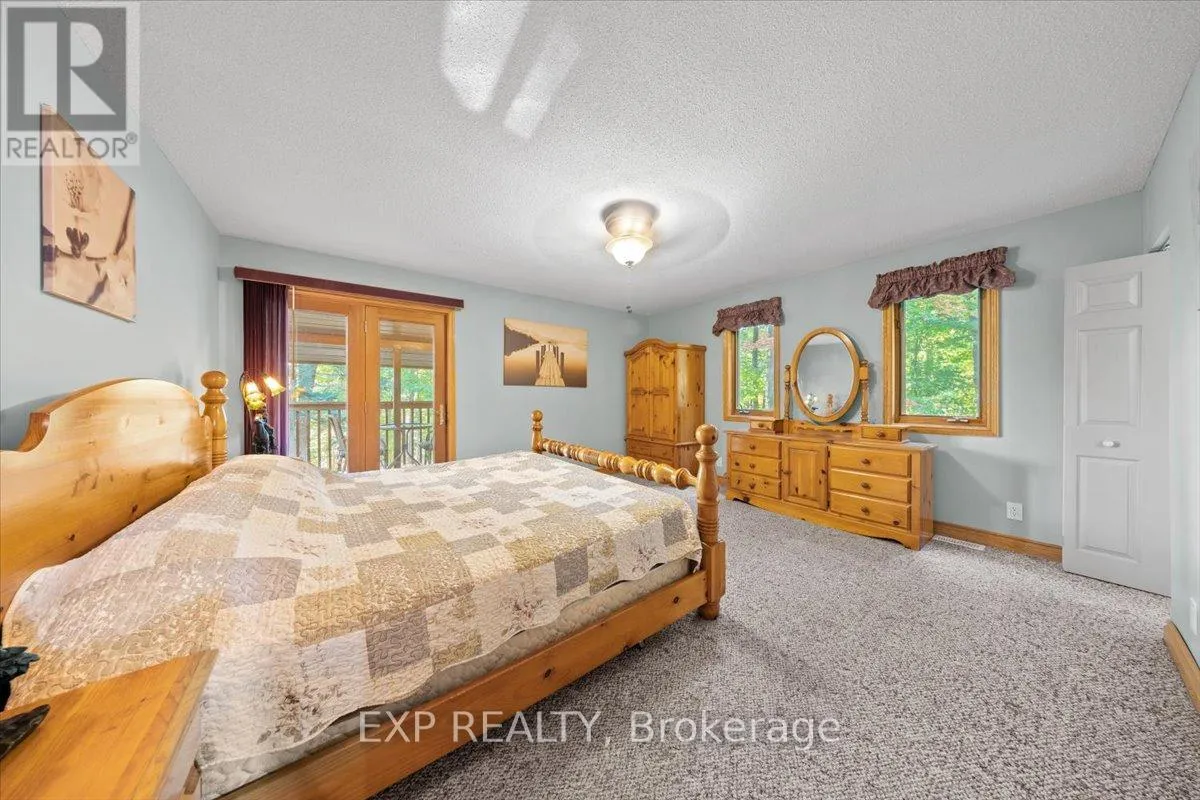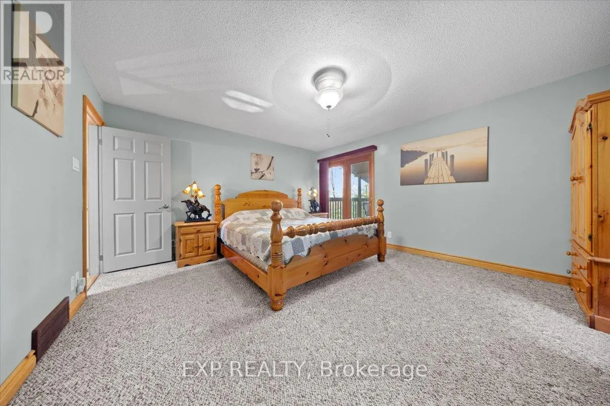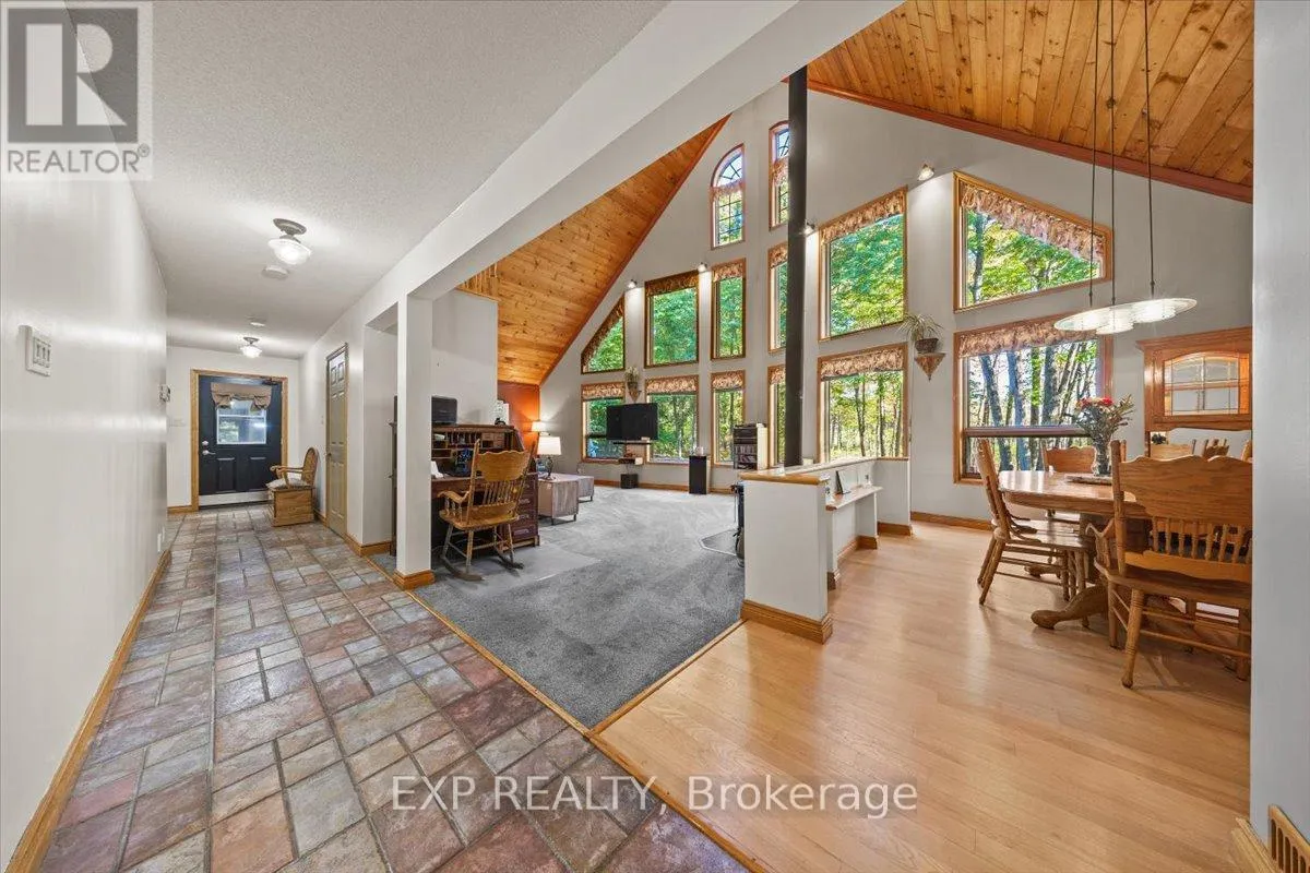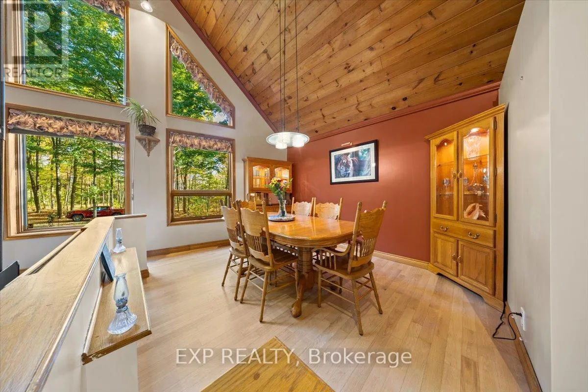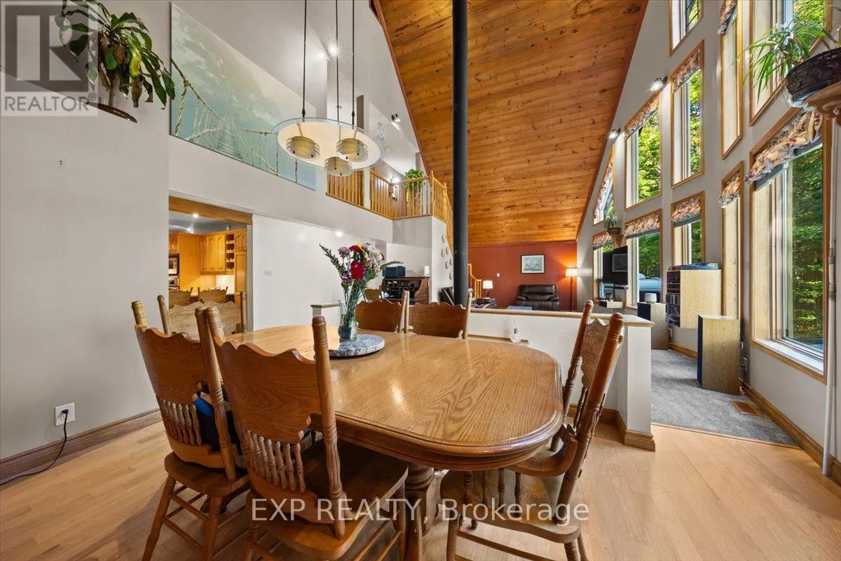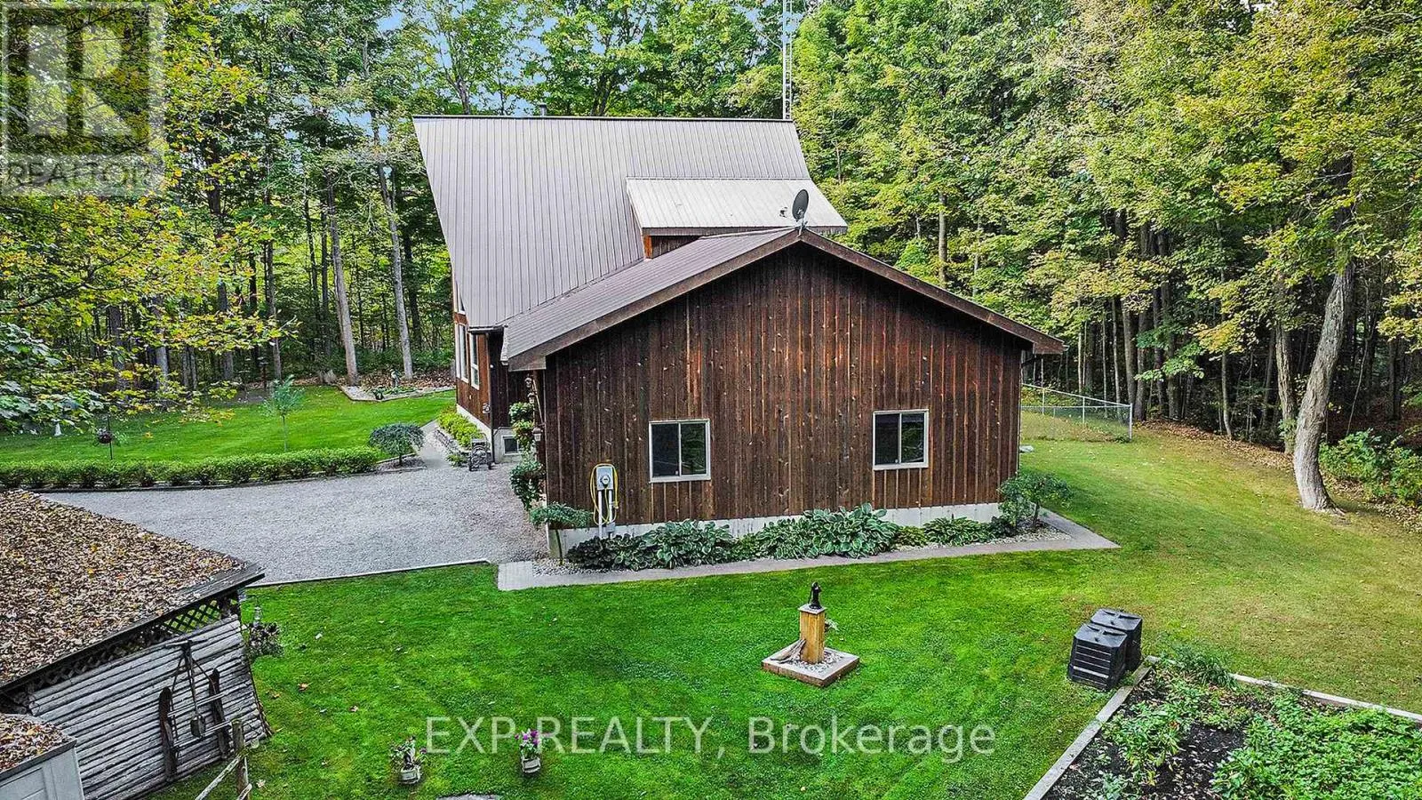 Take Highway 43 east from Merrickville, Turn onto Burritt's Rapids Road, Turn left onto Haskins Road. Welcome to your dream home! This stunning custom-built residence, clad in Western Red Cedar board & batten, is set on 6.27 acres of beautifully maintained, wooded land with a private driveway offering serene seclusion and natural beauty. The home features an energy-efficient geothermal heating and cooling system, a Vermont Castings wood stove, and top-tier insulation throughout both the house and garage for year-round comfort. Step inside to find a freshly painted main level with brand new carpeting and a thoughtfully designed layout featuring a full 3-piece bathroom, laundry room, bedroom, and a dramatic 26' vaulted ceiling with wall-to-wall windows that flood the space with natural light. The remodeled kitchen includes stainless steel appliances, granite countertops, and a convenient breakfast bar perfect for entertaining or everyday living. Upstairs, you'll find a cozy guest bedroom, a 4-piece bathroom with a luxurious therapeutic tub, and a spacious primary bedroom with a private balcony overlooking the peaceful, tree-lined surroundings. Both bathrooms have been updated with stylish new vanities, blending modern finishes with timeless charm. The finished basement offers a large recreation/exercise room, cold storage, and a utility/storage area. A pristine 5-car garage features an impeccably finished, climate-controlled workshop ideal for hobbyists or serious DIYers. Outside, enjoy a calming patio with a custom pond, a vegetable garden, a greenhouse, and ample storage buildings. Explore the scenic trails or relax beside the charming creek that runs through the property. This one-of-a-kind retreat blends comfort, functionality, and natural beauty an exceptional opportunity for those seeking privacy and connection to the outdoors. (id:27476)