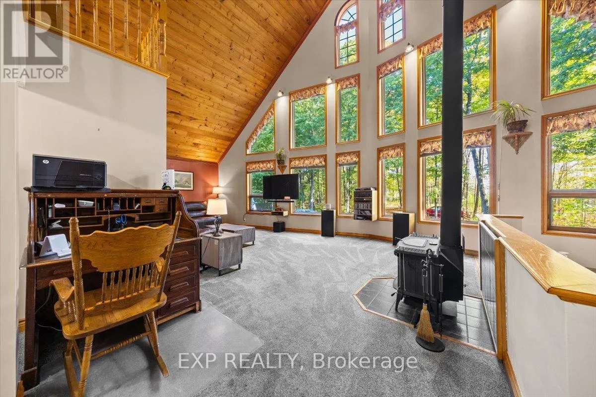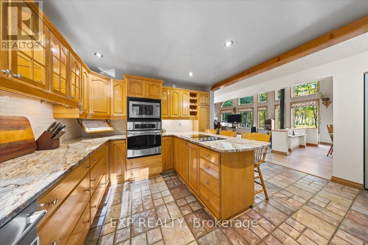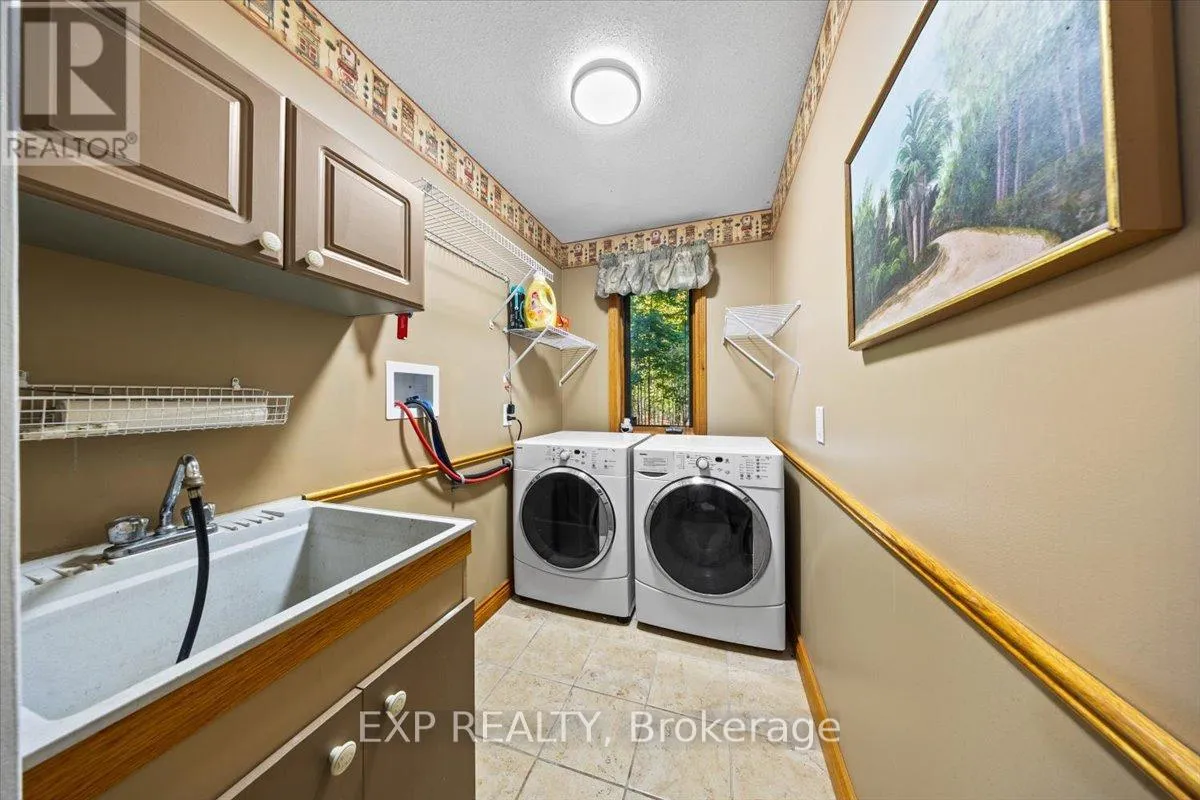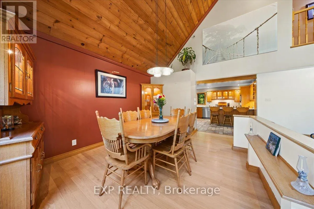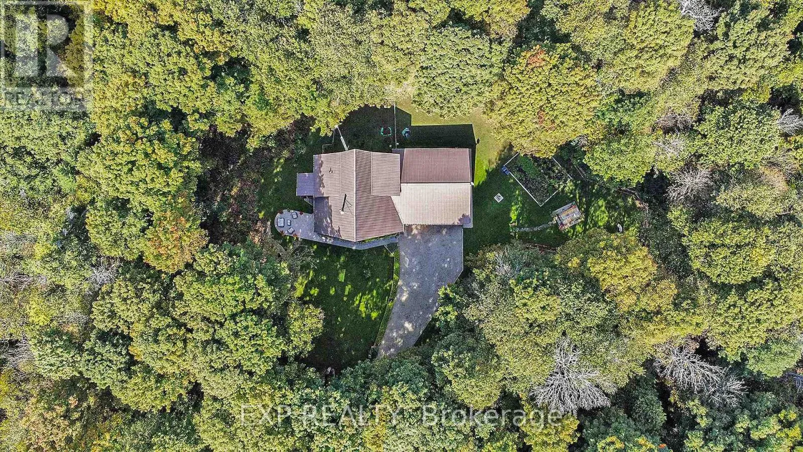 Take Highway 43 east from Merrickville, Turn onto Burritt's Rapids Road, Turn left onto Haskins Road. Welcome to your dream home! This stunning custom-built residence, clad in Western Red Cedar board & batten, is set on 6.27 acres of beautifully maintained, wooded land with a private driveway offering serene seclusion and natural beauty. The home features an energy-efficient geothermal heating and cooling system, a Vermont Castings wood stove, and top-tier insulation throughout both the house and garage for year-round comfort. Step inside to find a freshly painted main level with brand new carpeting and a thoughtfully designed layout featuring a full 3-piece bathroom, laundry room, bedroom, and a dramatic 26' vaulted ceiling with wall-to-wall windows that flood the space with natural light. The remodeled kitchen includes stainless steel appliances, granite countertops, and a convenient breakfast bar perfect for entertaining or everyday living. Upstairs, you'll find a cozy guest bedroom, a 4-piece bathroom with a luxurious therapeutic tub, and a spacious primary bedroom with a private balcony overlooking the peaceful, tree-lined surroundings. Both bathrooms have been updated with stylish new vanities, blending modern finishes with timeless charm. The finished basement offers a large recreation/exercise room, cold storage, and a utility/storage area. A pristine 5-car garage features an impeccably finished, climate-controlled workshop ideal for hobbyists or serious DIYers. Outside, enjoy a calming patio with a custom pond, a vegetable garden, a greenhouse, and ample storage buildings. Explore the scenic trails or relax beside the charming creek that runs through the property. This one-of-a-kind retreat blends comfort, functionality, and natural beauty an exceptional opportunity for those seeking privacy and connection to the outdoors. (id:27476)