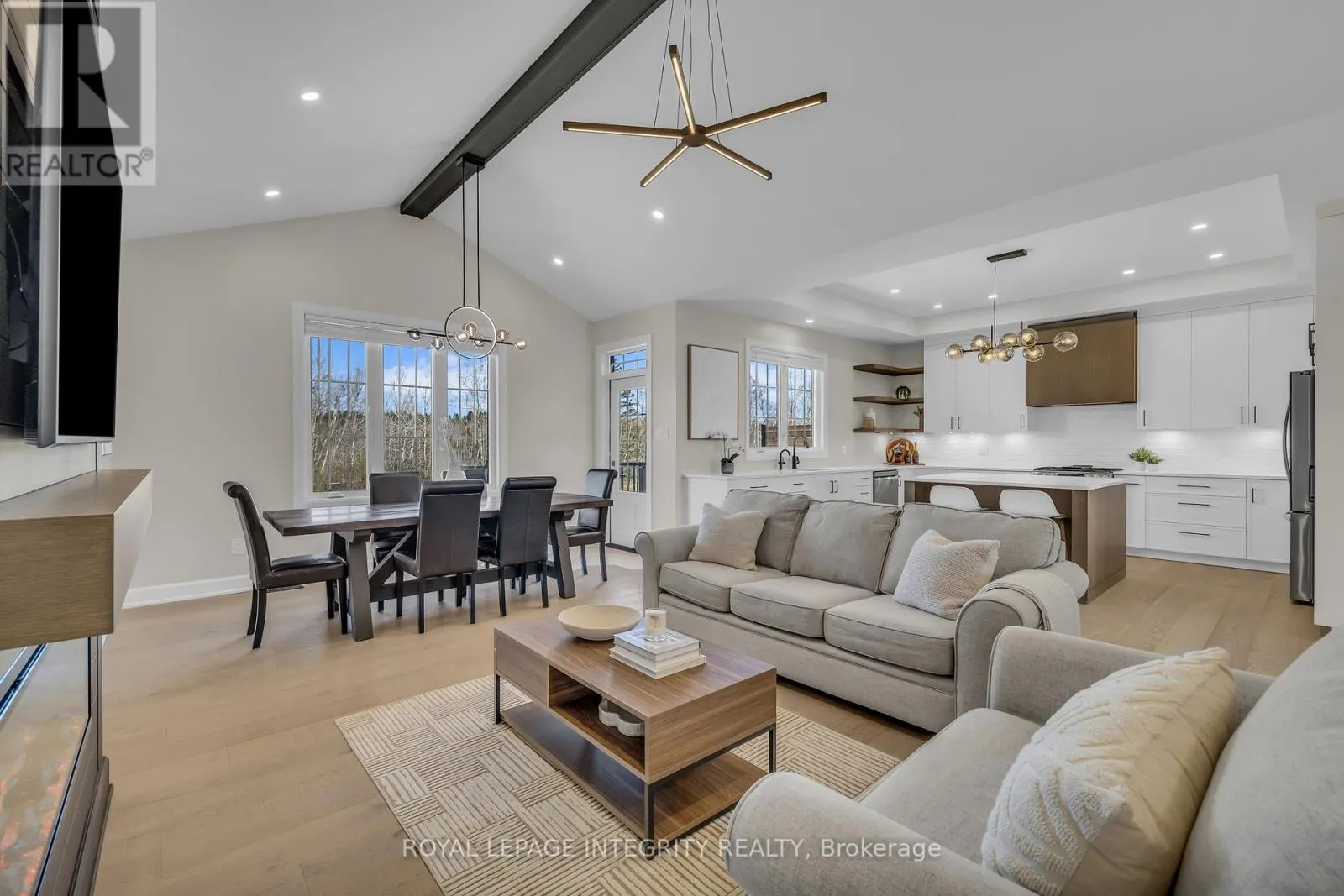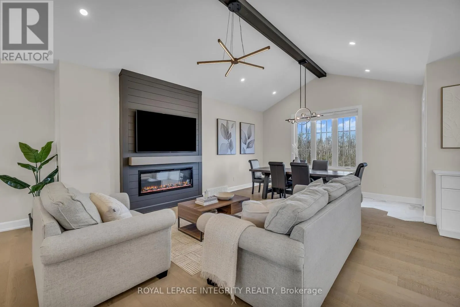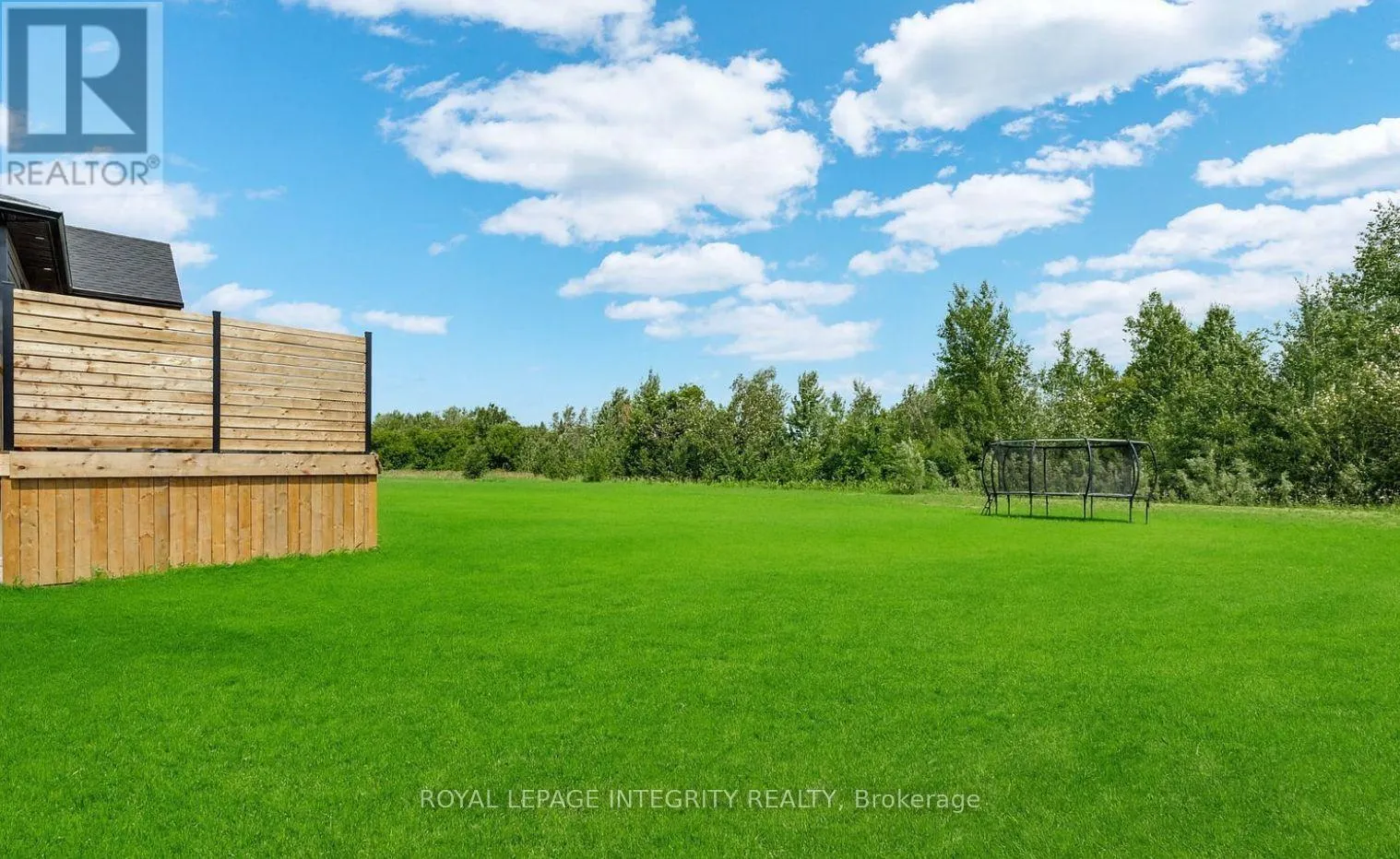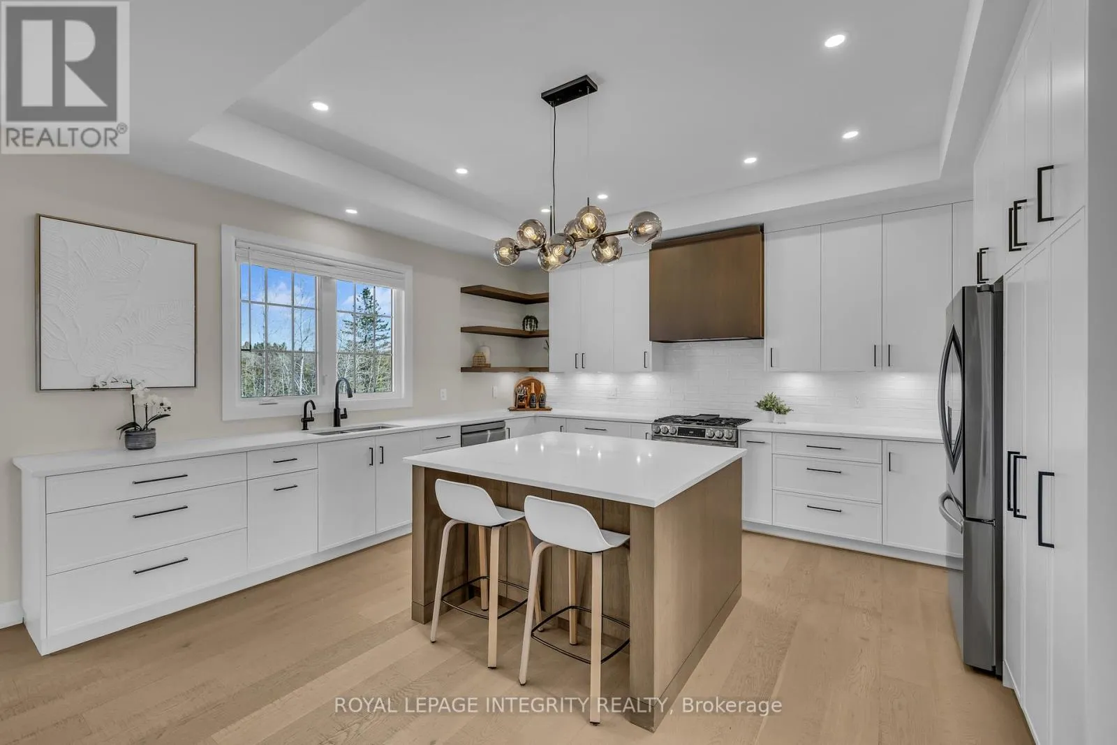 Cross Streets: Hwy 43 and Maplestone Drive. ** Directions: Exit Hwy 416 for Kemptville. Proceed east on Hwy 43 for approximately 4km. Turn right on Maplestone Drive. Welcome to 106 Maplestone Drive a beautifully crafted, newly built bungalow offering 5 bedrooms (3A/G +2) and 3 bathrooms, set on just over an acre of land & only 30 minutes to Ottawa. From the moment you arrive, the inviting covered seating area sets the tone for the exceptional craftsmanship found throughout. Step inside to a spacious, light-filled foyer with striking black accent walls and elegant marble tile. White oak hardwood flooring flows seamlessly throughout the open-concept main level, leading into a stunning chefs kitchen designed for both function and style.This thoughtfully curated space features quartz countertops, a gas range with a custom wood hood, stainless steel appliances, open shelving, an oversized island with seating, and ample cabinetry AND the window above the sink frames the private backyard, adding a perfect finishing touch! The kitchen flows into a bright dining area & airy living room with vaulted ceilings and a show stopping fireplace set into a custom accent wall. Down the hall, you'll find three generously sized bedrooms, including a primary suite with walk-in closet and a spa-inspired ensuite boasting dual vanities and beautiful tile work. A full main bathroom and convenient main floor laundry complete this level. The fully finished lower level offers exceptional bonus space with large windows that make it feel bright and above grade. It features a sprawling rec room, two additional bedrooms, a third full bath with double sinks, and plenty of storage. Both the basement and attached garage include insulated, radiant-ready slabs. The garage is fully spray-foamed, drywalled, and versatile enough to serve as a home gym, workshop, or studio. Additional features include full spray foam insulation throughout and a water treatment system with reverse osmosis to the kitchen and fridge. Hot water on demand is roughed in and can be changed before close. (id:27476)