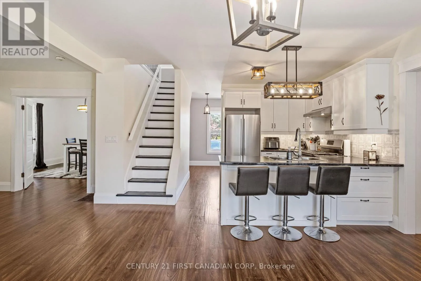 Cross Streets: Mount Carmel Drive & Lieury Rd. ** Directions: West on Mount Carmel Drive. Discover incredible value in this thoughtfully updated home, where timeless style meets the character and warmth of a century home - perfectly situated in a central location! Step inside this beautifully refreshed home and you'll instantly notice the perfect blend of character and style. From the white shaker kitchen cabinets with stainless steel appliances, gas range, and breakfast bar, to the large living area filled with natural light, every corner feels warm and inviting.Throughout the home, you'll find thoughtful updates like luxury vinyl plank flooring, newer windows, stylish light fixtures, and wrought iron spindles, all while preserving original details like the oversized baseboards, grates, exposed brick, and gorgeous woodwork throughout. Need flexibility? The main floor offers a versatile space that can be a formal dining room or a spacious main floor bedroom - your choice! Plus, with newer siding, all updated appliances (including washer and dryer), and a deceivingly spacious lot surrounded by mature trees, this home is truly move-in ready. Enjoy summer BBQs on the side deck, morning coffee on the covered front porch or second level, private balcony and the peace of mind that comes with a lovingly maintained property. Located just steps from Our Lady of Mount Carmel Catholic Elementary School, complete with a full playground, baseball diamond, and plenty of green space. You're also perfectly situated only 15 minutes to the beautiful beaches of Grand Bend and 15 minutes to the charming community of Exeter.This is small-town living with style, space, and soul. Don't miss it! Home Tour Here:https://youtu.be/obOdC_asdhc (id:27476)