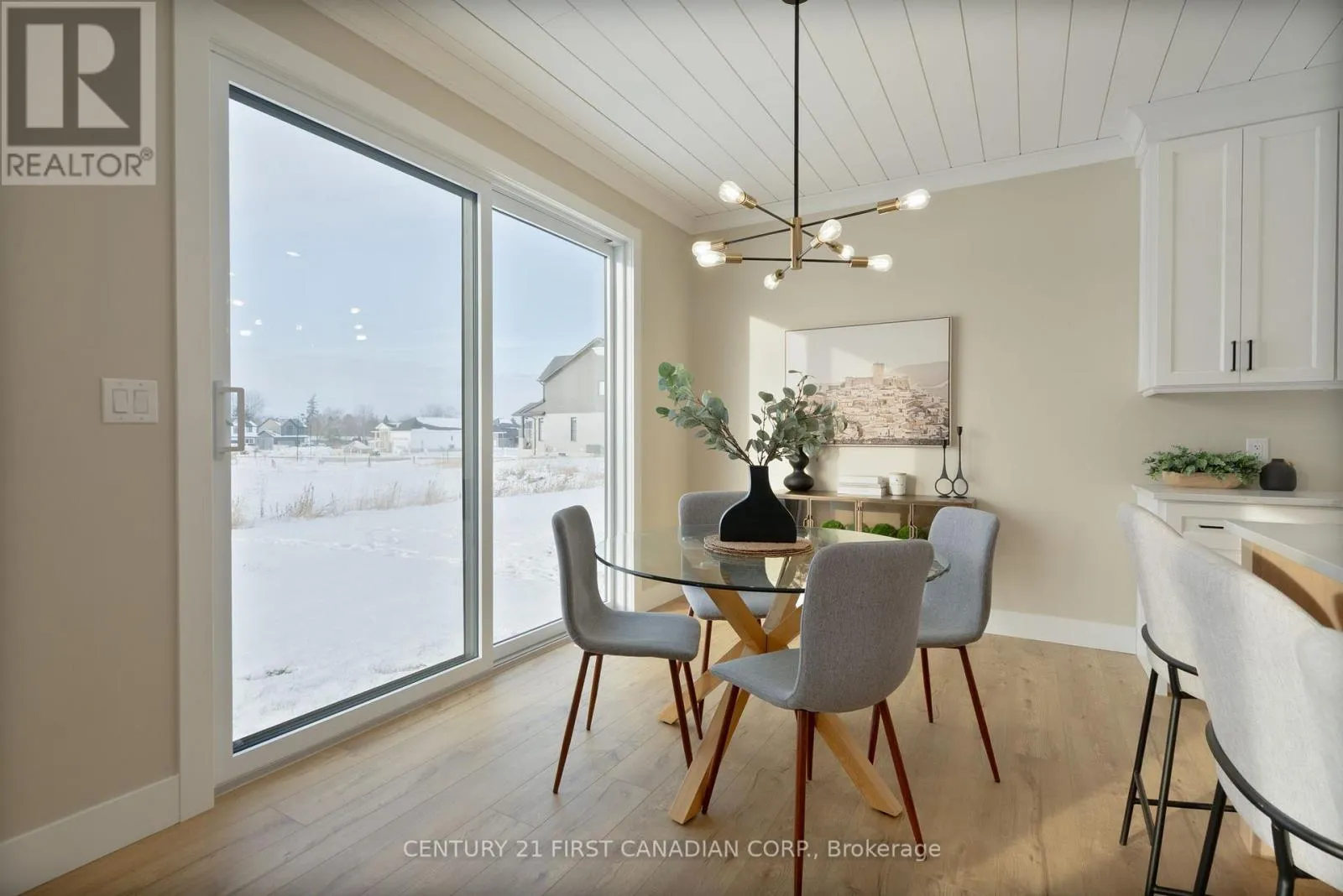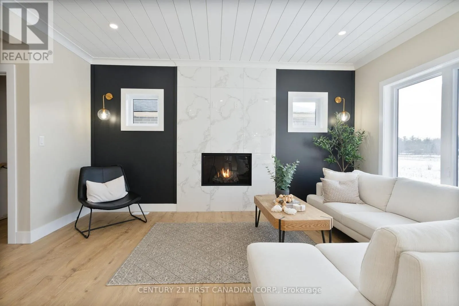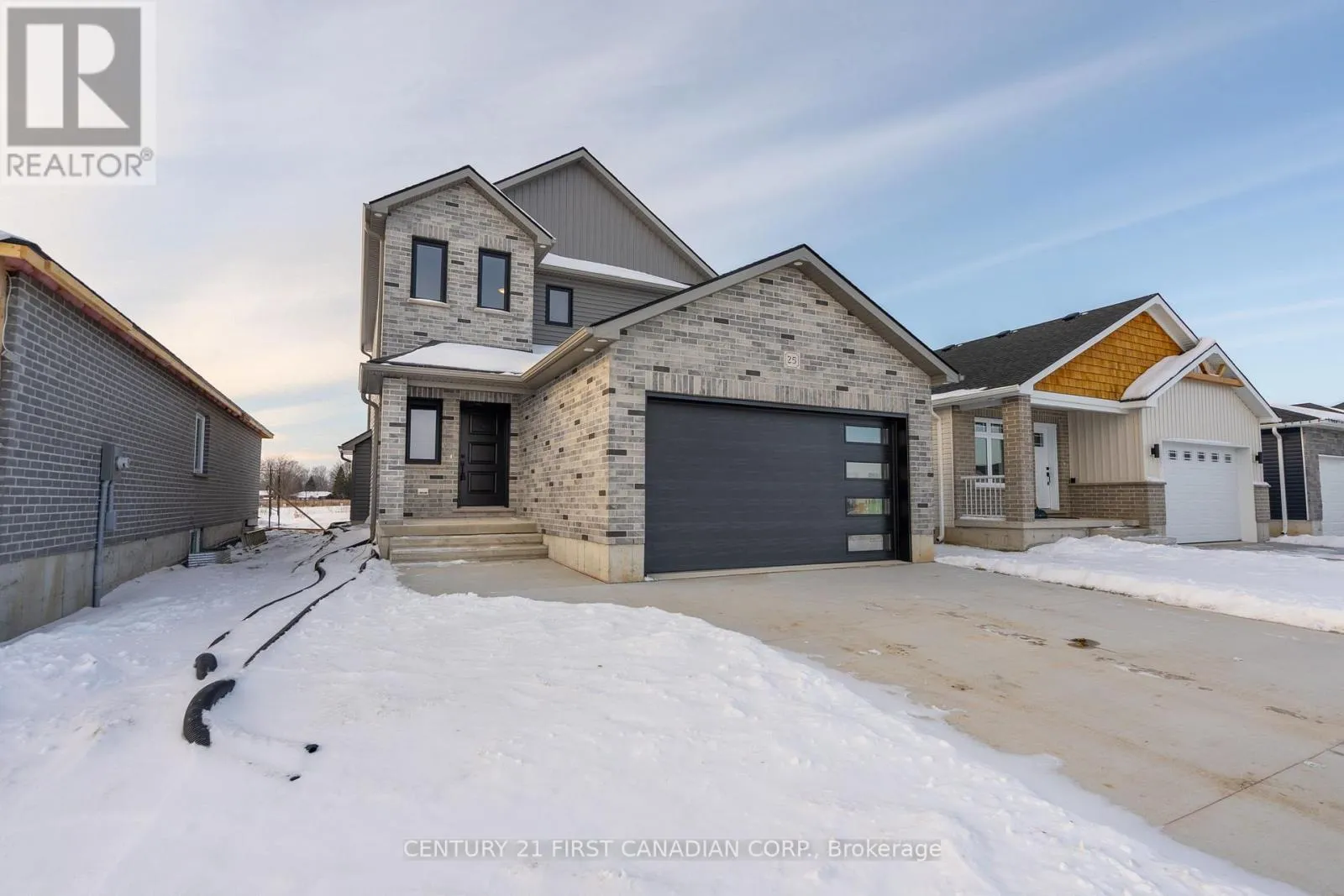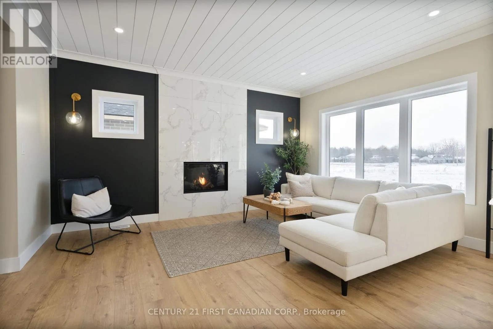 Cross Streets: Atkinson St. ** Directions: Heading north on Queen St, turn right onto Atkinson St, turn right onto Sheldabren St, the property is on the right. MOVE IN READY. This striking 1944 sqft new-build two-storey home in Ailsa Craig offers a perfect blend of modern design and small-town charm. The home features a sleek exterior accented with a mix of stone and modern siding, large black-framed windows, and a welcoming front porch. Inside, the main floor is open-concept and flooded with natural light, anchored by a cozy living area complete with a modern gas fireplace set into a floor-to-ceiling stone surround perfect for relaxing evenings. The kitchen boasts quartz countertops, minimalist cabinetry, a central island, and stainless-steel appliances, flowing seamlessly into the dining area with views of the backyard. Upstairs, you will find three well-sized bedrooms, including a spacious primary bedroom with a walk-in closet and an ensuite bathroom featuring a glass walk-in shower and dual vanities. The two additional bedrooms are ideal for family, guests, or a home office setup, and they share a bright, well-appointed full bathroom. The unfinished basement offers a blank canvas for future expansion whether you are envisioning a home gym, recreation room, or extra bedrooms, the space is ready to be transformed. Located in the peaceful community of Ailsa Craig, this home combines modern comfort with a quiet, family-friendly atmosphere. Some rooms are virtually staged, as noted on the photo comments. Taxes and Assessed value yet to be determined. (id:27476)