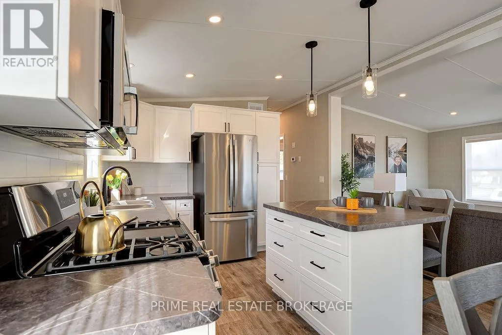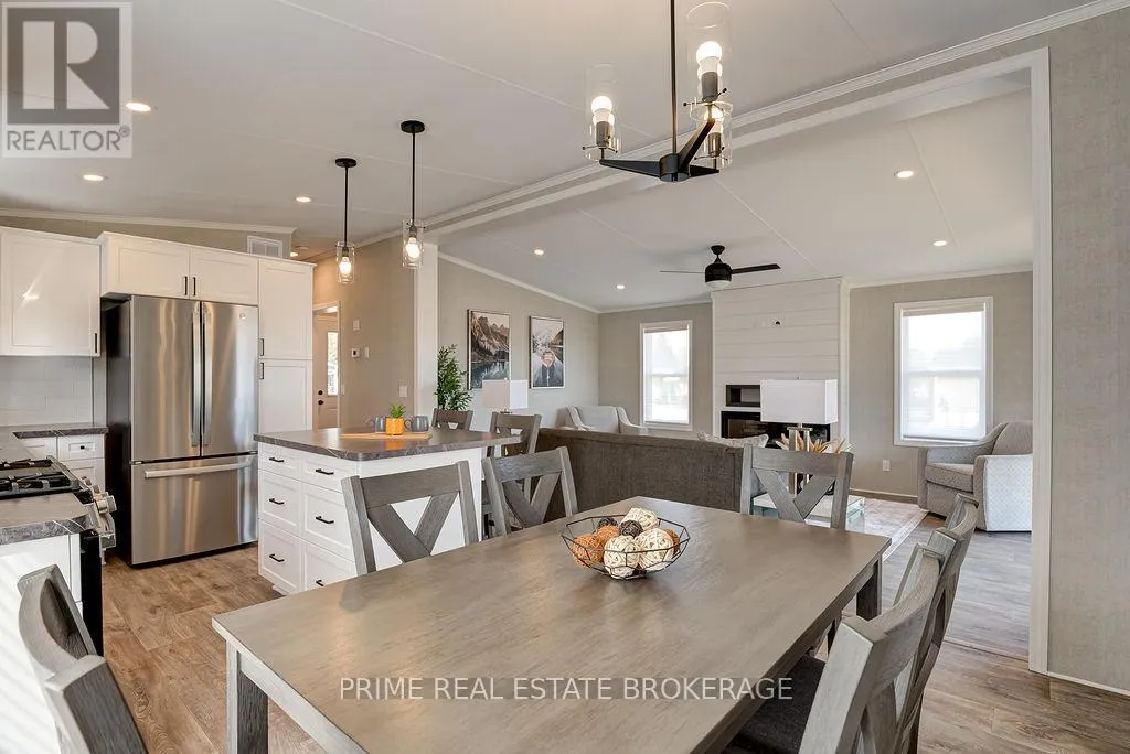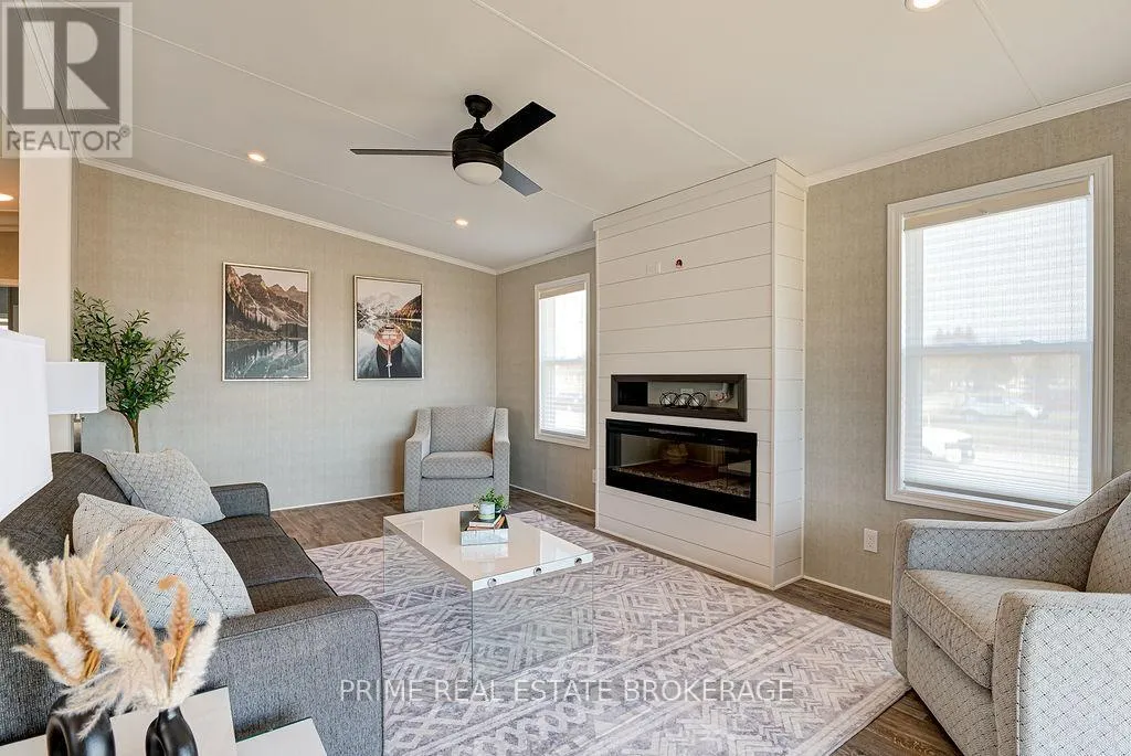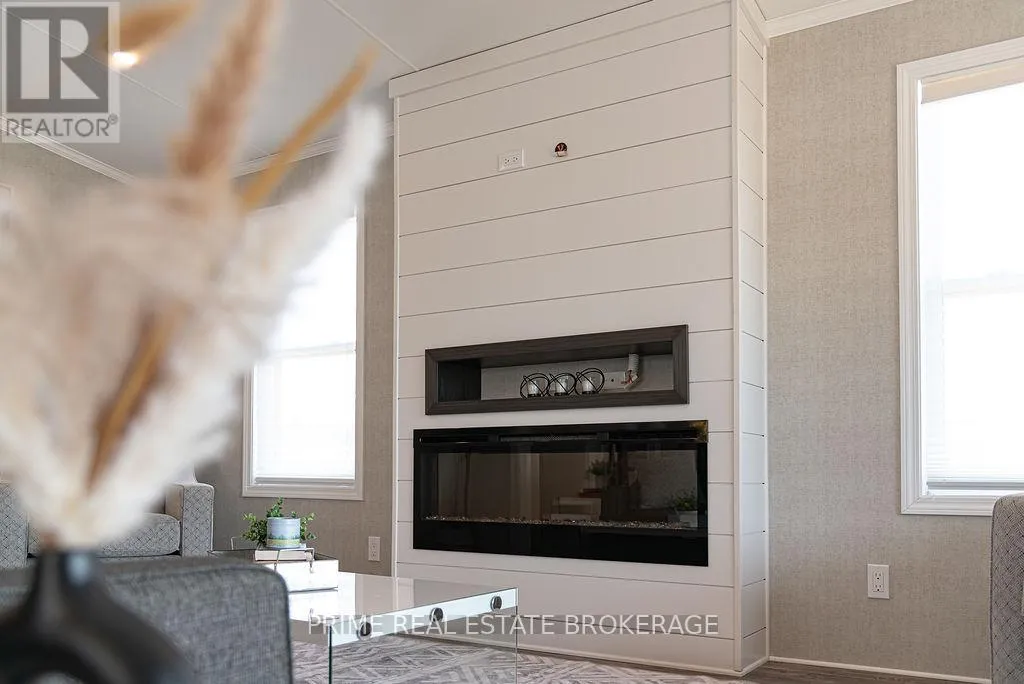 Head east out of Listowel on Hwy/Line 86. The Village is on the right. Turn into the Village, left at\r\nFairview Cres and follow until you can turn left on Meadowview Drive. Property is on the left. An exceptional Canadian custom-built Northlander manufactured home combines functionality and style on a newly developed lot in this well-maintained community,The Village, just east of Listowel. A 12' x 12' front porch provides opportunities to relax and enjoy the view in this 2 bedroom, 1 bathroom home, with a separate laundry room with a closet for additional storage. An open concept dining, kitchen and living area is illuminated with patio doors, windows and contemporary lighting.The kitchen boasts stunning cabinetry, stainless GE steel appliances, ceramic tile backsplash and an island for extra seating. A spacious living area with a beautiful built in cabinet showcases a fireplace, perfect for cozy winter evenings. Outdoors, there are trails for walking and paved streets throughout the park. The Village lifestyle includes a clubhouse on the premises which provides many social activities, while North Perth/ Listowel areas offers great shopping, golf, curling, a new community arena, delicious dining and cultural experiences. This is carefree, fine living at its best! (NOTE: Land is leased, modular home is owned. Utilize the owner's recommended mortgage specialist if financing is needed.) Live a life of leisure in this friendly, well-maintained community in North Perth's premier park,The Village. Ask about rent on the land lease promotion between now and November 15, 2025. (id:27476)