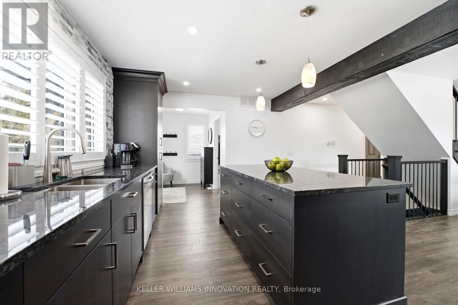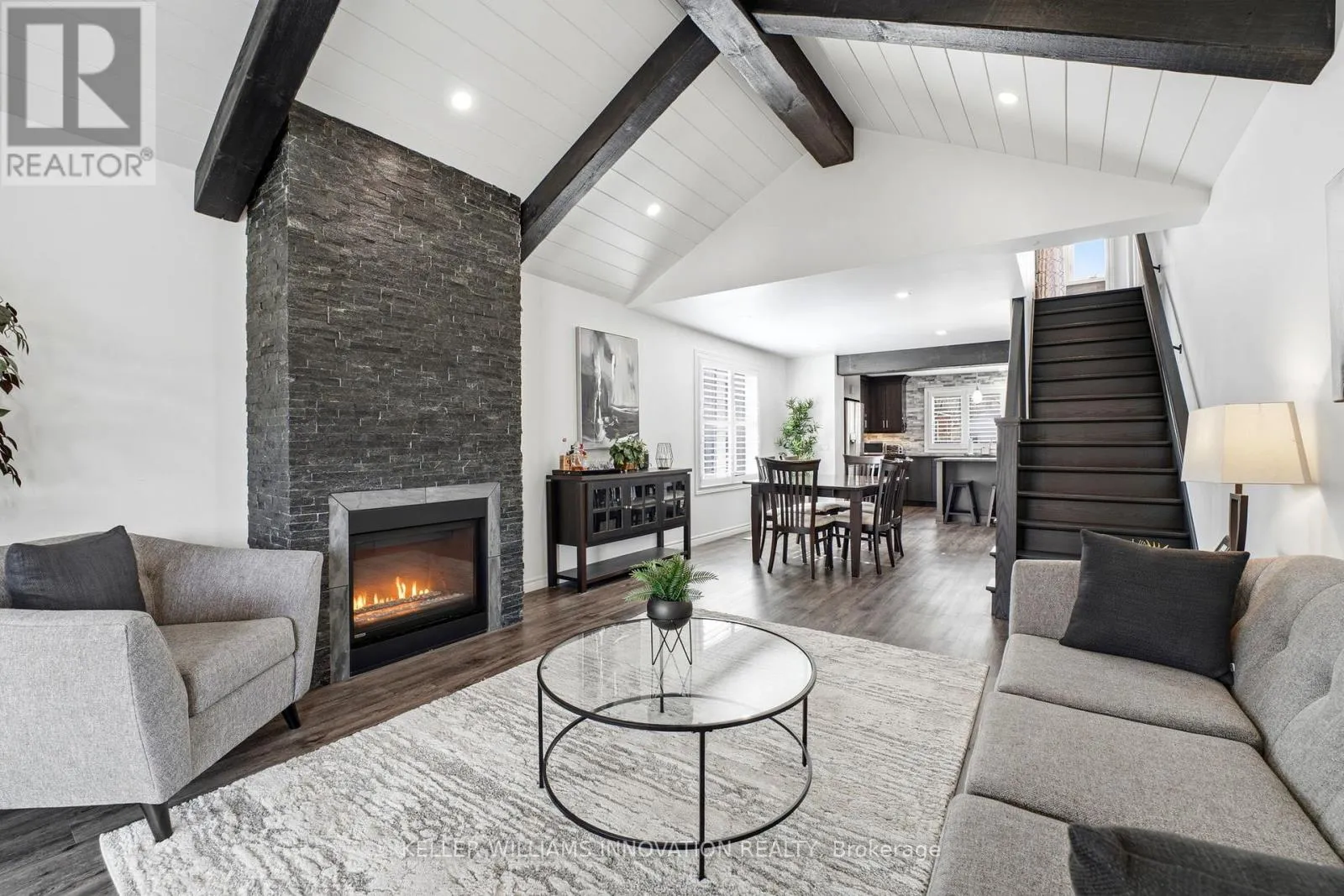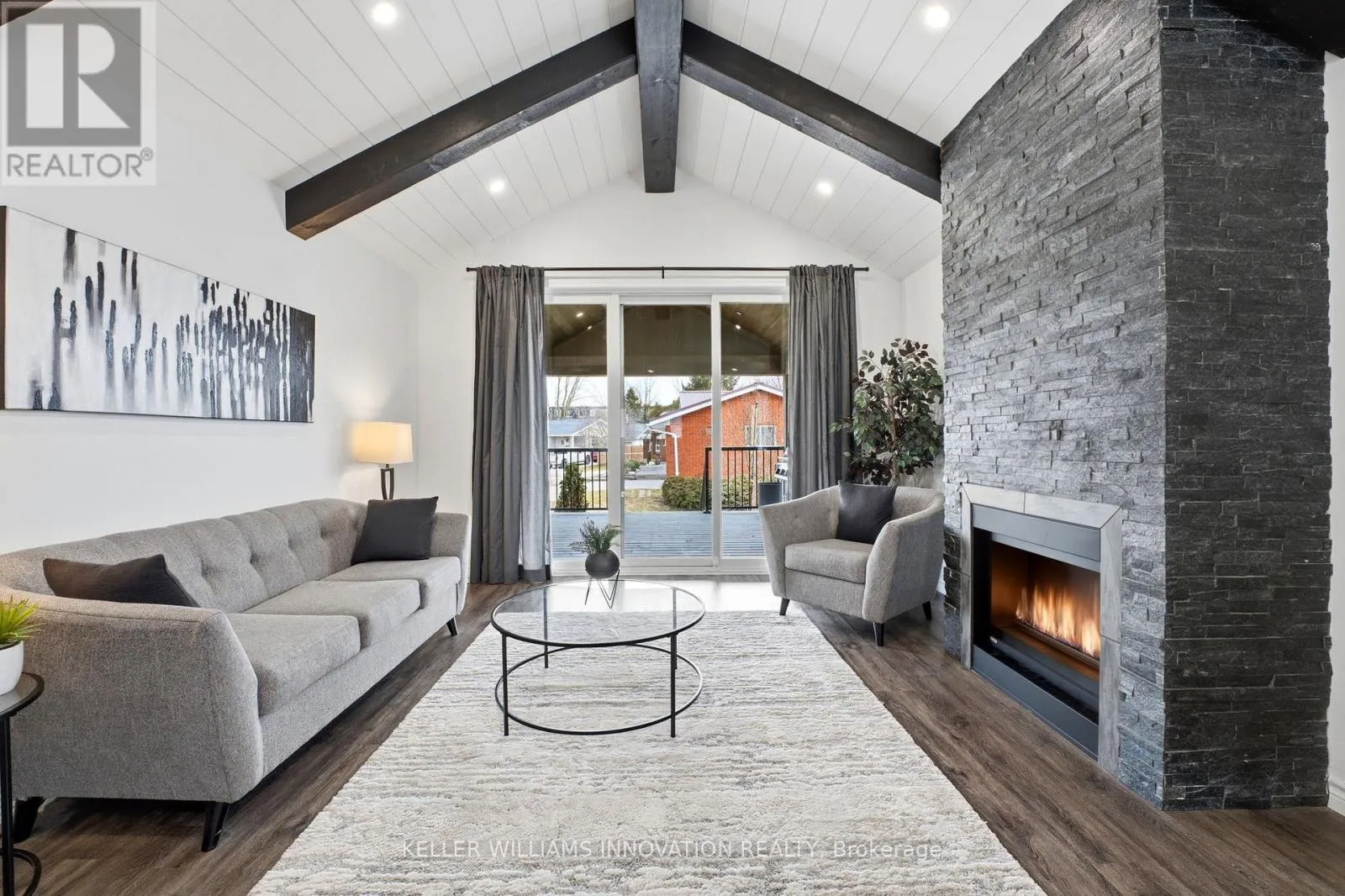 Tanner Ct/Campbell St W VAULTED CEILING, OVERSIZED KITCHEN, AMPLE BEDROOMS. Set on a quiet corner lot, this inviting home at 475 Campbell St W offers comfort, charm, and plenty of space for everyday living. A welcoming front porch sets the tone, while major updates-including the roof, windows, appliances, bathrooms, kitchen, and A/C-have all been completed within the past 5-6 years. Inside, the warm and cozy vaulted living room features exposed beams and a striking stone fireplace. Massive sliding doors open onto a covered back deck, creating a seamless blend of indoor and outdoor living. Large windows throughout the home fill the space with an abundance of natural light. The oversized kitchen is both functional and inviting, complete with ample cabinetry, an eat-in island, and newer appliances. Windows overlooking the front of the home add even more brightness to this central gathering space. A main floor bedroom and laundry add everyday convenience and flexibility. The second level offers two bedrooms and a full bathroom, and in total, the home features five bedrooms and three full bathrooms-ideal for a growing family or hosting guests. The finished basement includes two additional bedrooms, a spacious rec room, and a cozy electric fireplace, perfect for movie nights or relaxed weekends. Outside, the corner lot provides extra room and privacy on a peaceful street, along with a concrete driveway for added convenience. Located in Listowel, you're close to schools, trails, and local shops and restaurants-everything you need for comfortable small-town living. (id:27476)