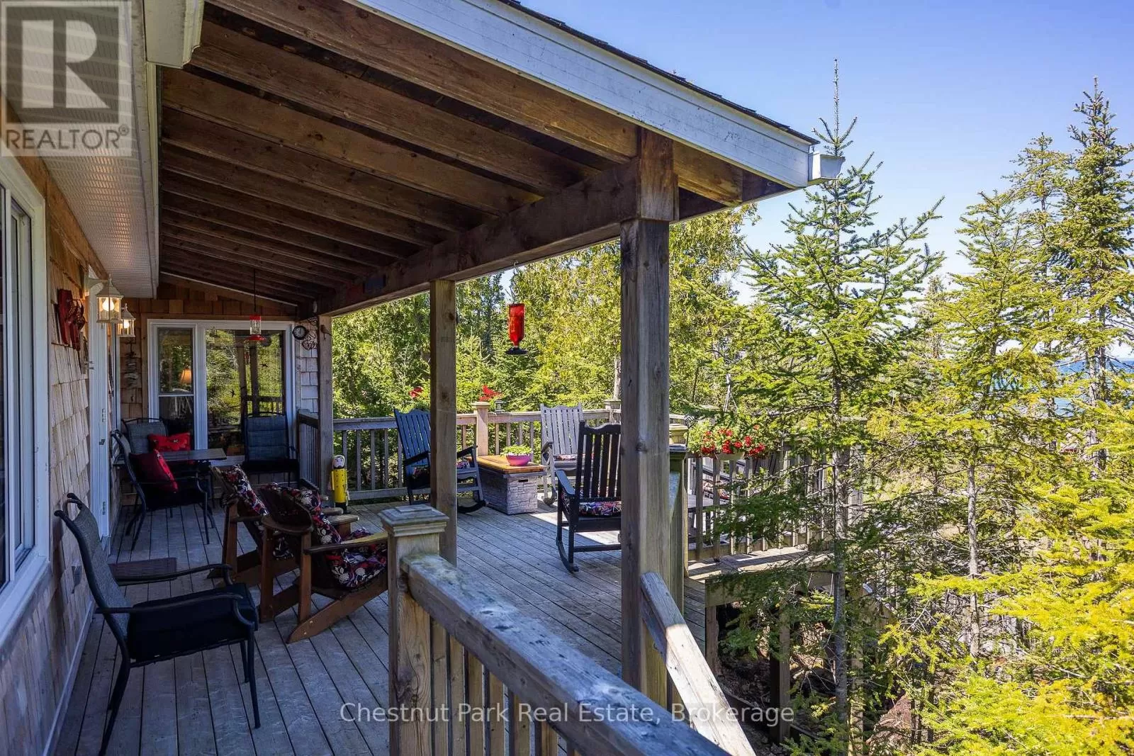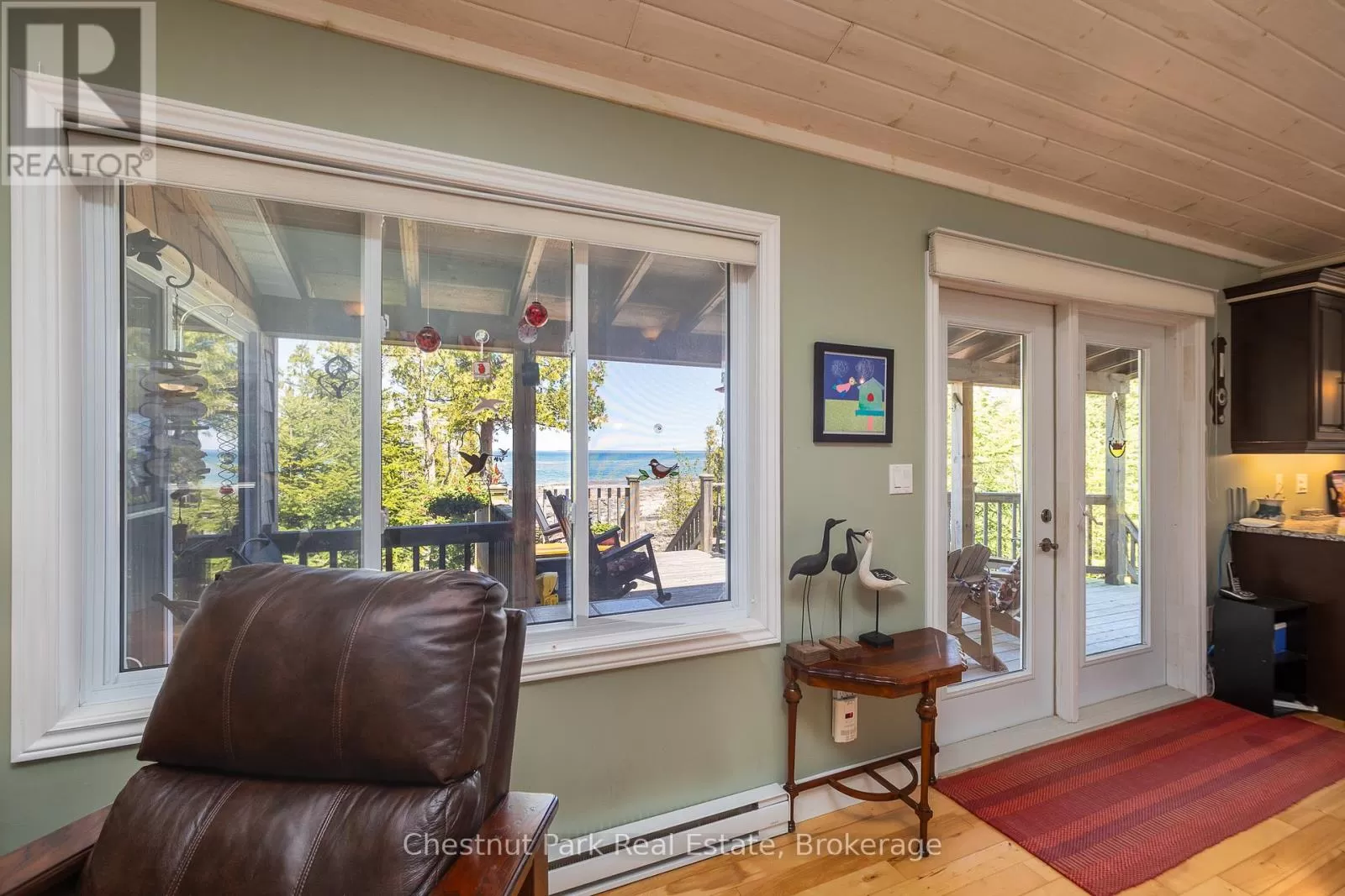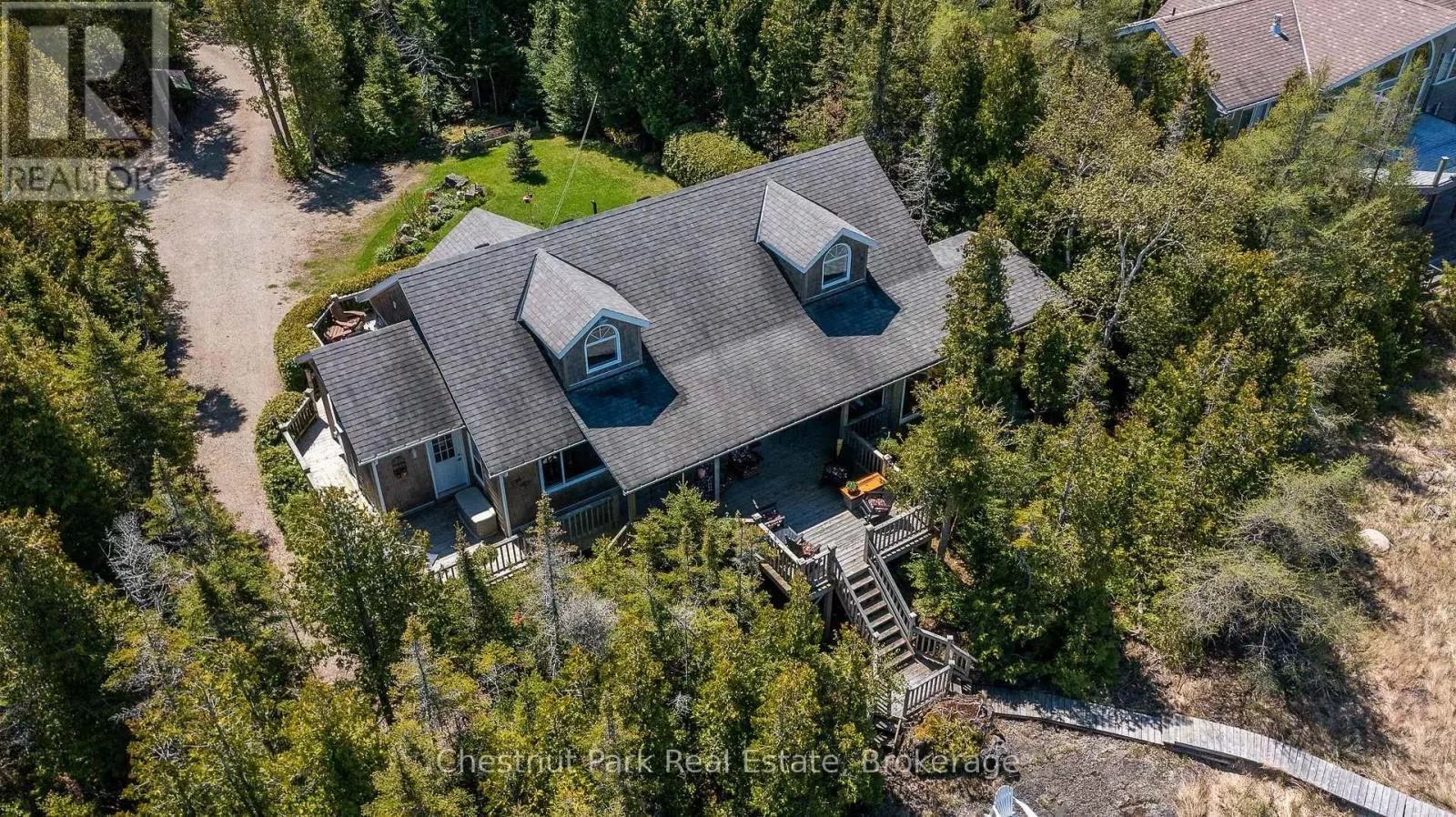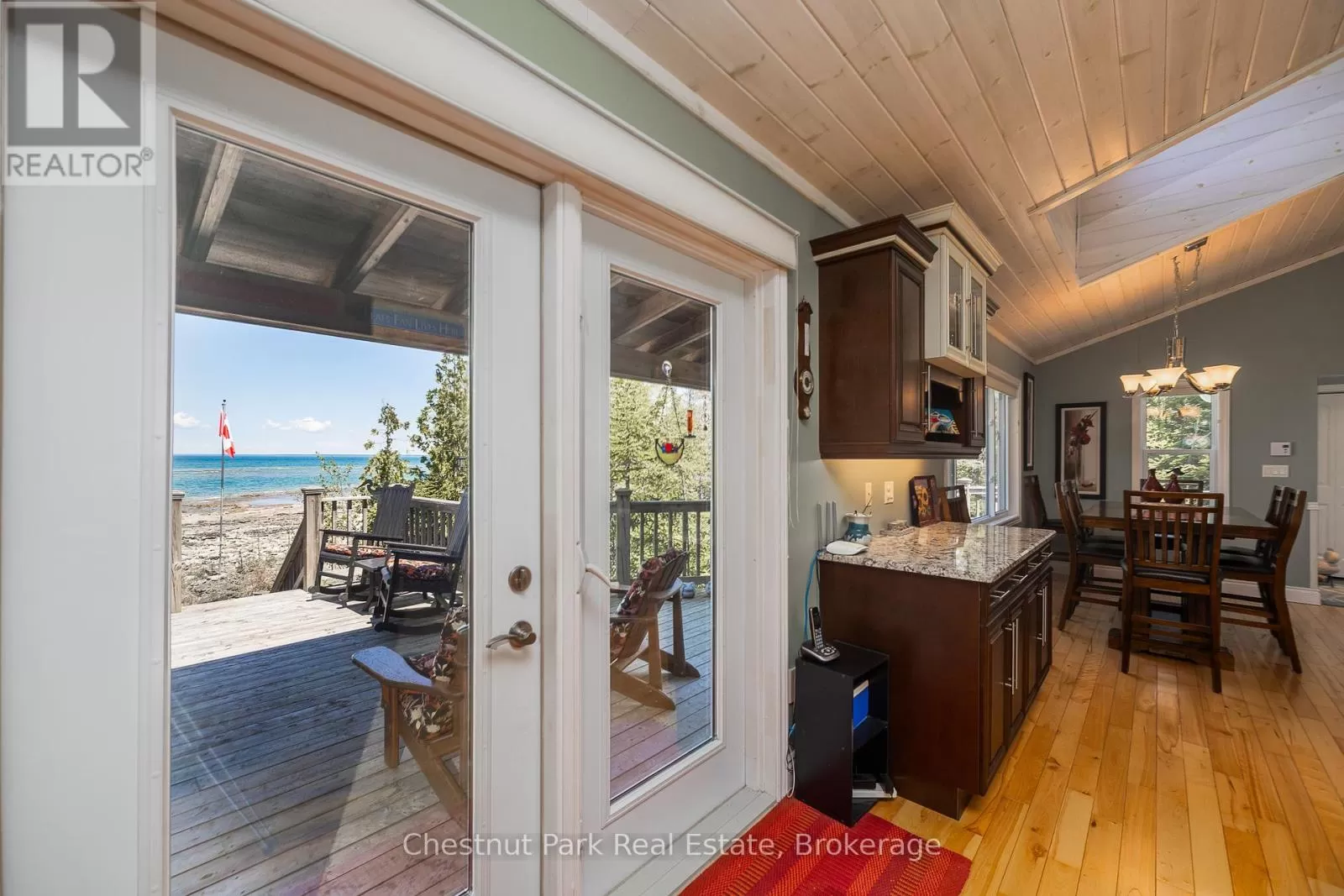 Cross Streets: Zorra & Cape Hurd. ** Directions: Head north on Highway 6 (ON-6N), turn Left onto Cape Hurd Rd, turn Left onto Zorra Drive, Follow to #94 on right side. Tranquil Waterfront Retreat Near Tobermory. Escape to serenity with this private year-round 3-bedroom, 2-bathroom waterfront home, designed for both comfort and style. Situated on a stunning shoreline, you'll enjoy breathtaking lake views from nearly every room and the expansive wraparound deck is perfect for sunsets, morning coffee, bird watching & stargazing. Inside, the modern open-concept layout is enhanced by vaulted wood ceilings with bright dormer windows, gleaming maple hardwood floors, and a dramatic gas fireplace anchoring the spacious living area. The kitchen features rich cabinetry, granite countertops, and stainless steel appliances, making it a dream for any home chef. A 4-season sunroom offers the ideal space for a home office or cozy reading nook, set apart from the main living areas. The primary suite includes a generous walk-in closet, marble-tiled ensuite, and direct access to the deck. Additional features include central vacuum, main floor laundry, full back up generator power and a detached 1.5-car garage with water hookup. Beautiful perennial gardens surround the property, offering natural beauty and privacy while just a short drive from the charming village of Tobermory. (id:27476)