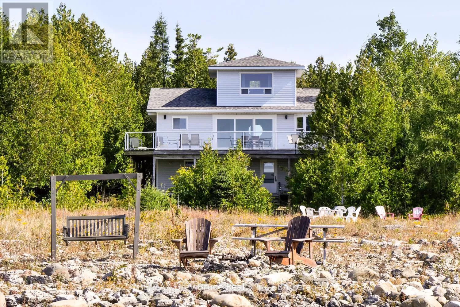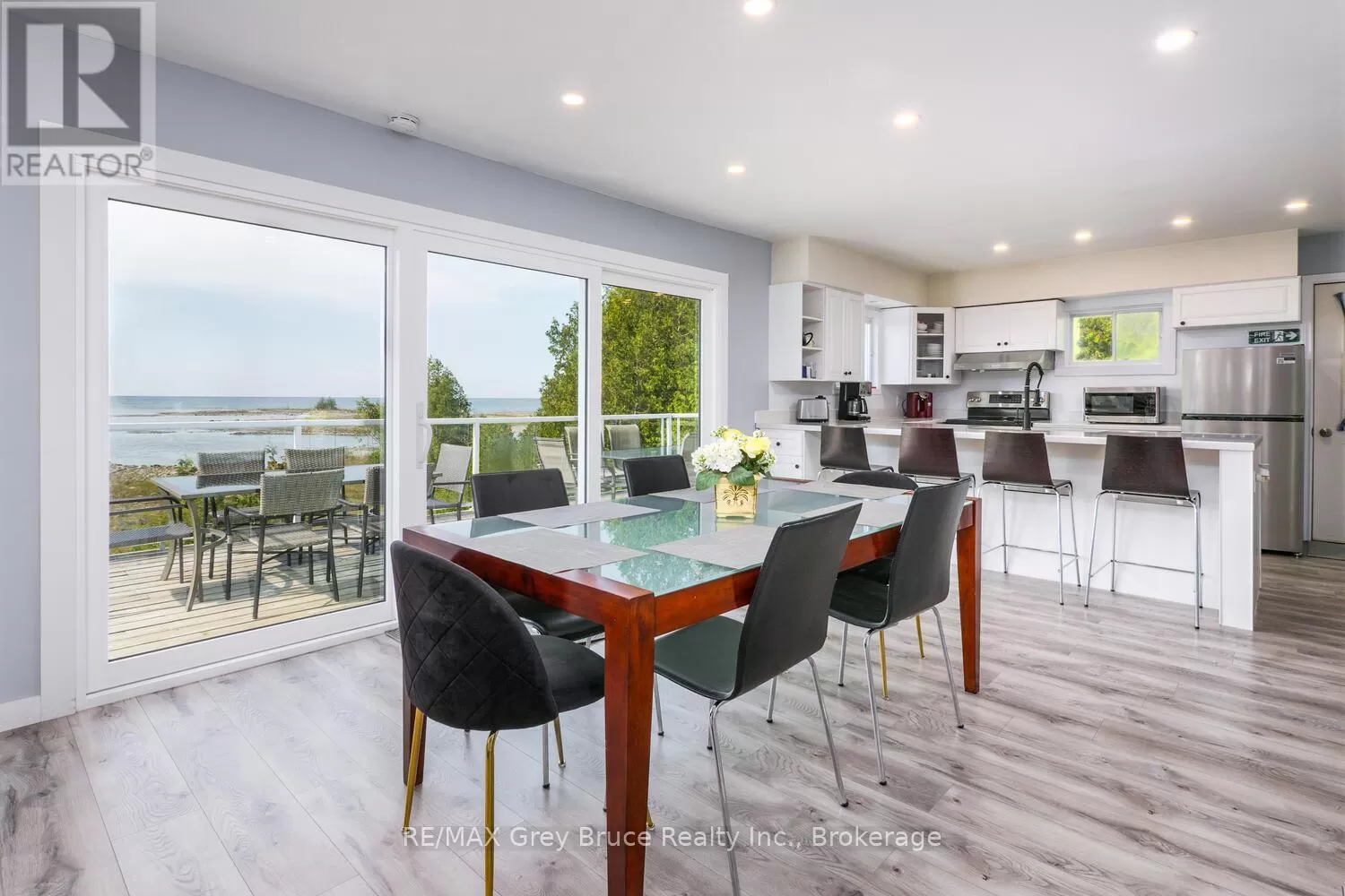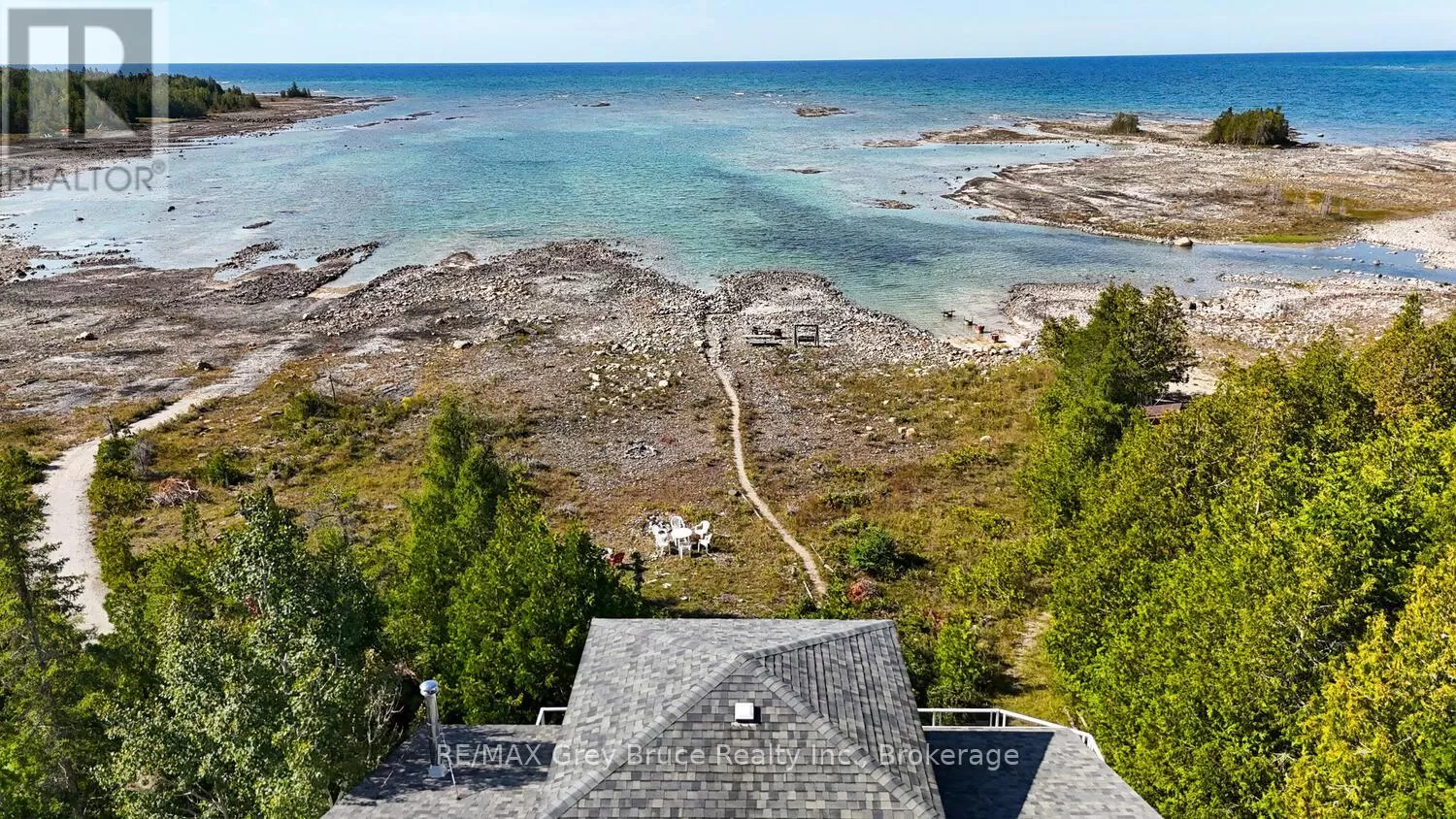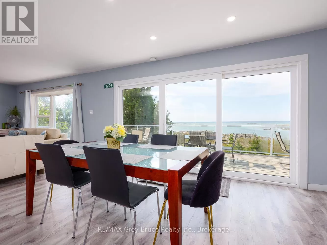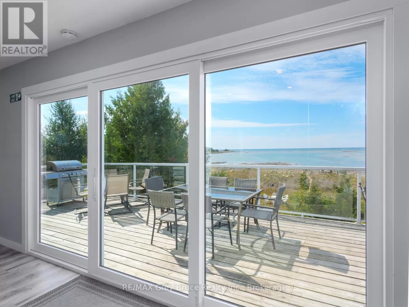 Cross Streets: Johnson Harbour Rd & Dorcas Bay Rd. ** Directions: Head North on Hwy 6 (ON-6). Turn Left onto Johnsons Harbour Road. Turn Right onto Dorcas Bay Road. Destination will be on your Left, look for signs. Oh my, the ocean-like views steal the show in this waterfront home on Dorcas Bay. As you step inside you'll be greeted by the open concept kitchen, dining, and living area creating the perfect place for entertaining family and friends. Expansive windows provide an abundance of natural light that floods the living space. A 14-foot patio door, added recently, leads to a generously sized deck, featuring glass panels and rails which were added in the last few years. You'll never tire from the ever changing, uninterrupted ocean-like views of Lake Huron from both inside and outside of this home. With 4 generously sized bedrooms and 2 bathrooms there is ample space for everyone. The primary bedroom boasts a renovated ensuite bathroom and the main bathroom has also been upgraded. On the upper floor you'll find the 4th bedroom space with a recently installed window providing more stunning water views. The home has seen a number of additional upgrades in the last few years including: new flooring throughout, LED lighting inside and out, new pex plumbing, new hot water tank and UV, and a freshened kitchen. The walk-out lower level currently features a utility area, laundry area and a roughed in bathroom, and provides an open canvas to design and add more living space if desired, while the built-in garage provides oodles of storage. The shoreline with its gradual water entry is ideal for families with smaller children to enjoy water activities. This home comes turnkey with furniture, appliances, pots/pans/cutlery/dishes and more. Conveniently located near Tobermory, Singing Sands Beach, and the Grotto, you and your guests have access to an array of recreational activities, shops and restaurants. This property is currently licensed for STA stays with a proven rental income. (id:27476)