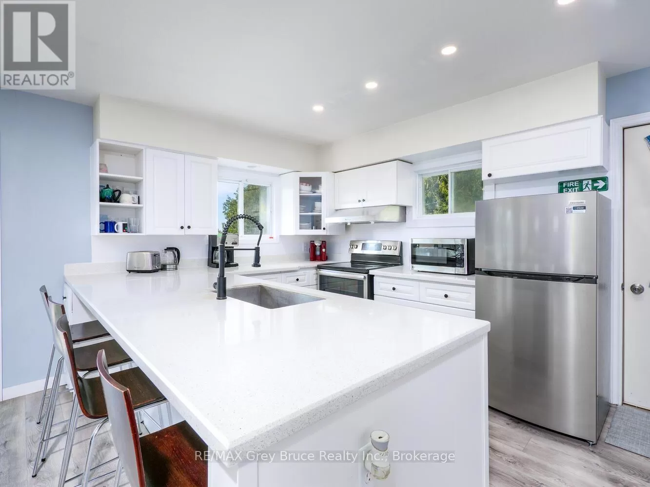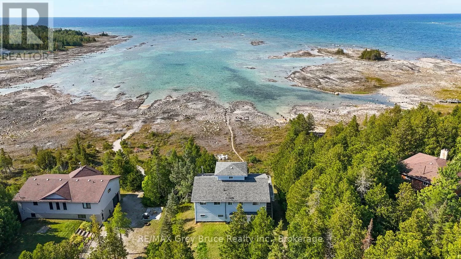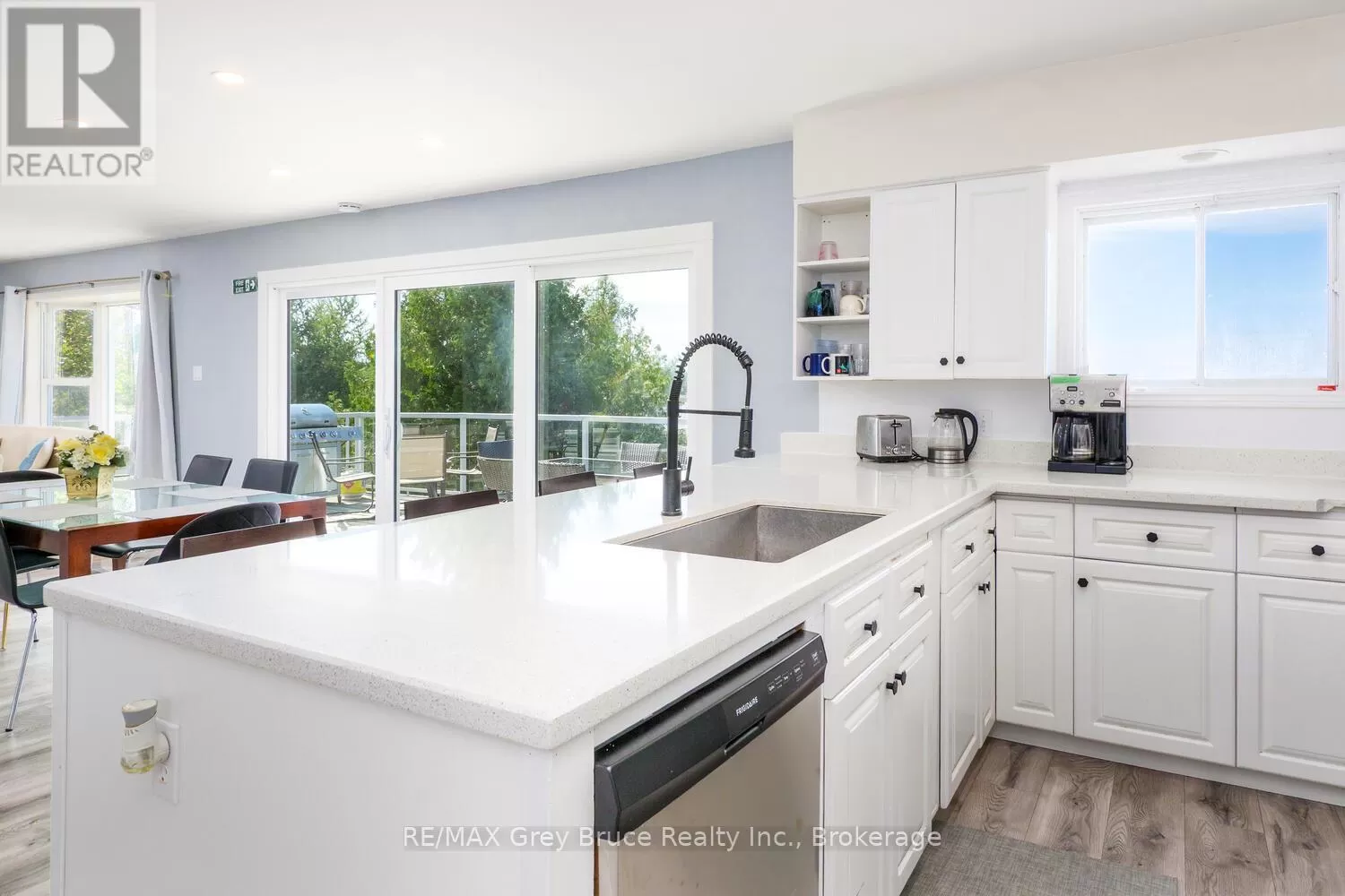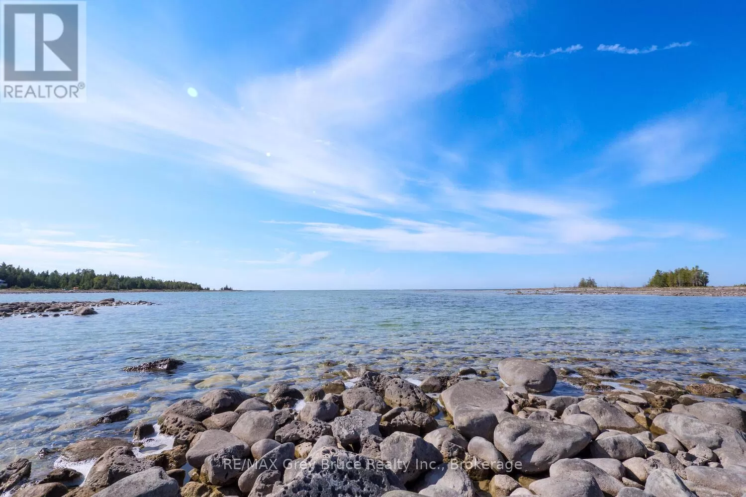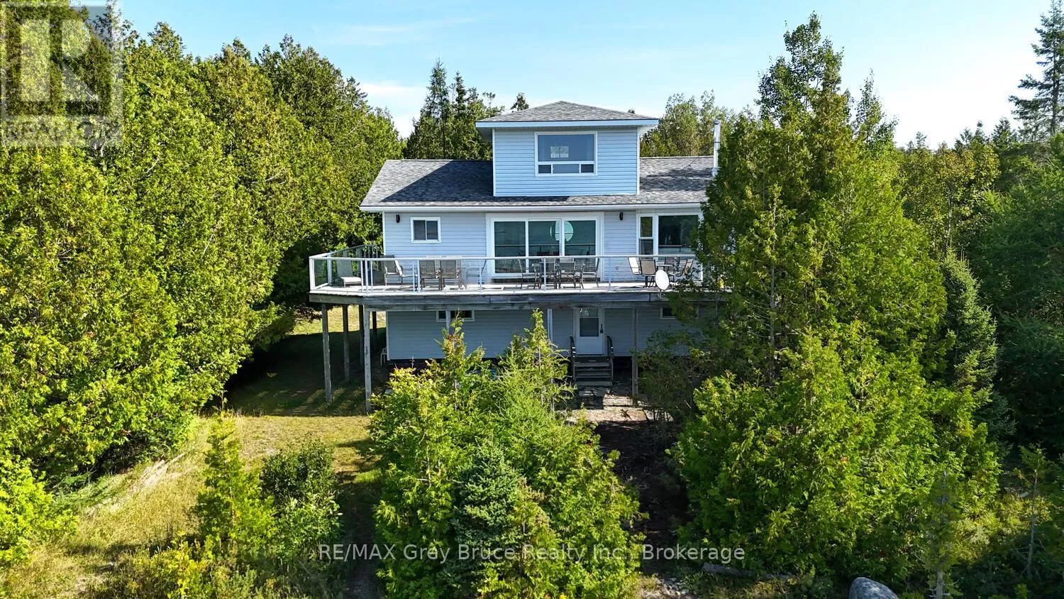 Cross Streets: Johnson Harbour Rd & Dorcas Bay Rd. ** Directions: Head North on Hwy 6 (ON-6). Turn Left onto Johnsons Harbour Road. Turn Right onto Dorcas Bay Road. Destination will be on your Left, look for signs. Oh my, the ocean-like views steal the show in this waterfront home on Dorcas Bay. As you step inside you'll be greeted by the open concept kitchen, dining, and living area creating the perfect place for entertaining family and friends. Expansive windows provide an abundance of natural light that floods the living space. A 14-foot patio door, added recently, leads to a generously sized deck, featuring glass panels and rails which were added in the last few years. You'll never tire from the ever changing, uninterrupted ocean-like views of Lake Huron from both inside and outside of this home. With 4 generously sized bedrooms and 2 bathrooms there is ample space for everyone. The primary bedroom boasts a renovated ensuite bathroom and the main bathroom has also been upgraded. On the upper floor you'll find the 4th bedroom space with a recently installed window providing more stunning water views. The home has seen a number of additional upgrades in the last few years including: new flooring throughout, LED lighting inside and out, new pex plumbing, new hot water tank and UV, and a freshened kitchen. The walk-out lower level currently features a utility area, laundry area and a roughed in bathroom, and provides an open canvas to design and add more living space if desired, while the built-in garage provides oodles of storage. The shoreline with its gradual water entry is ideal for families with smaller children to enjoy water activities. This home comes turnkey with furniture, appliances, pots/pans/cutlery/dishes and more. Conveniently located near Tobermory, Singing Sands Beach, and the Grotto, you and your guests have access to an array of recreational activities, shops and restaurants. This property is currently licensed for STA stays with a proven rental income. (id:27476)