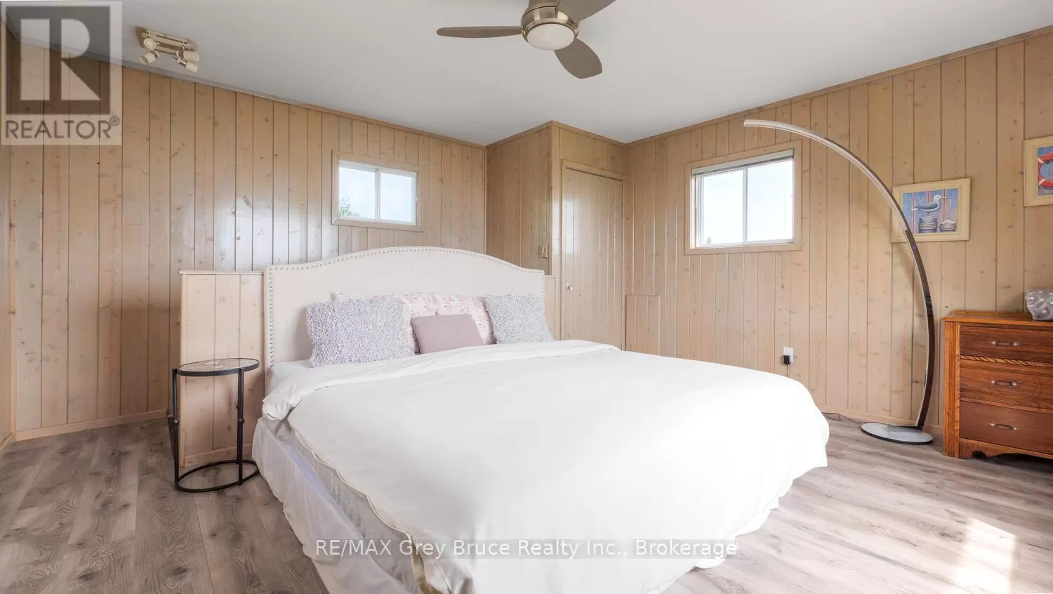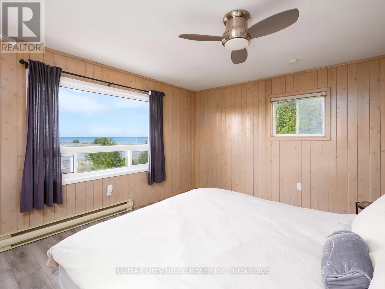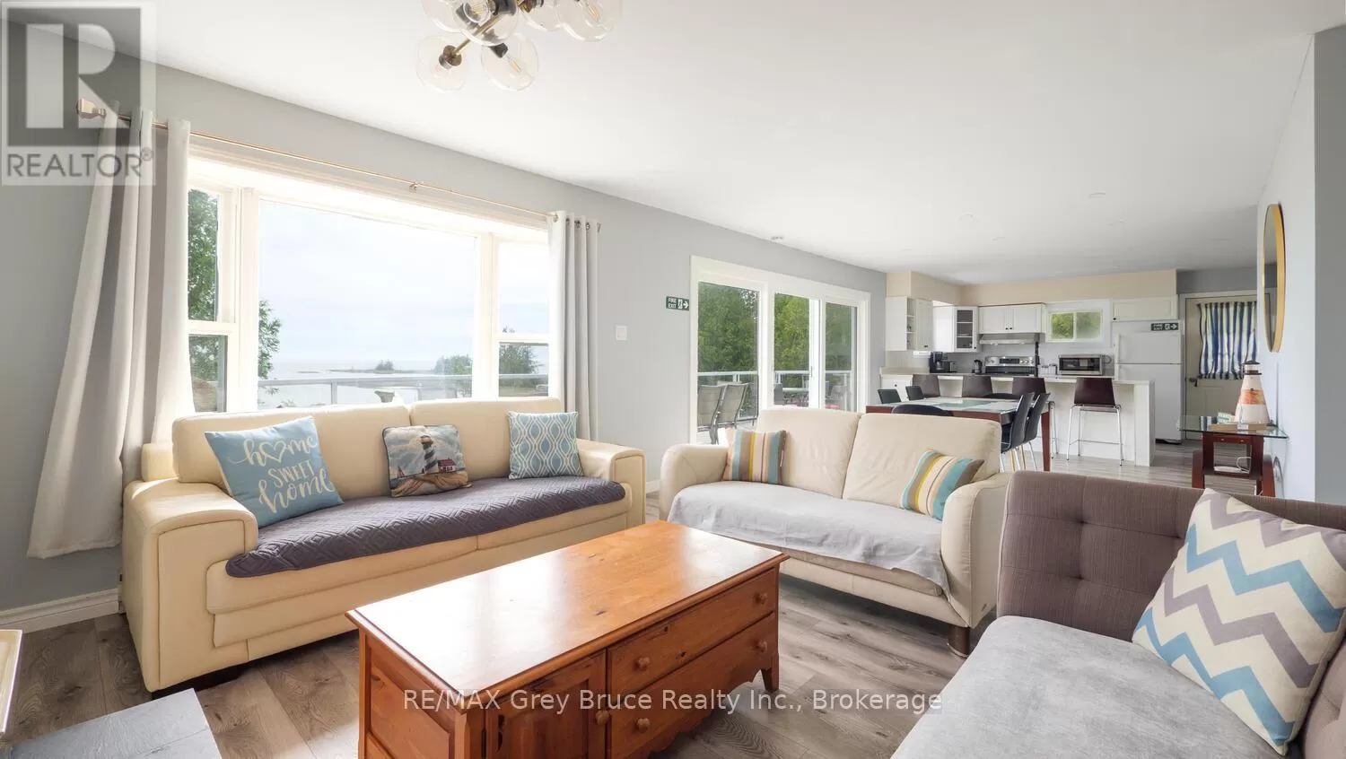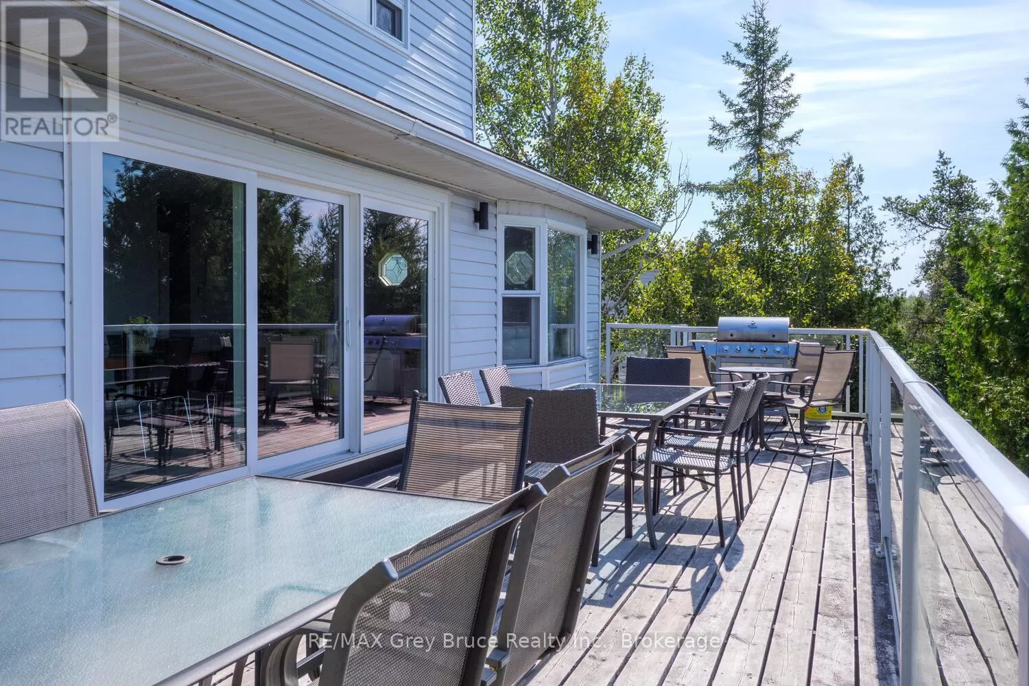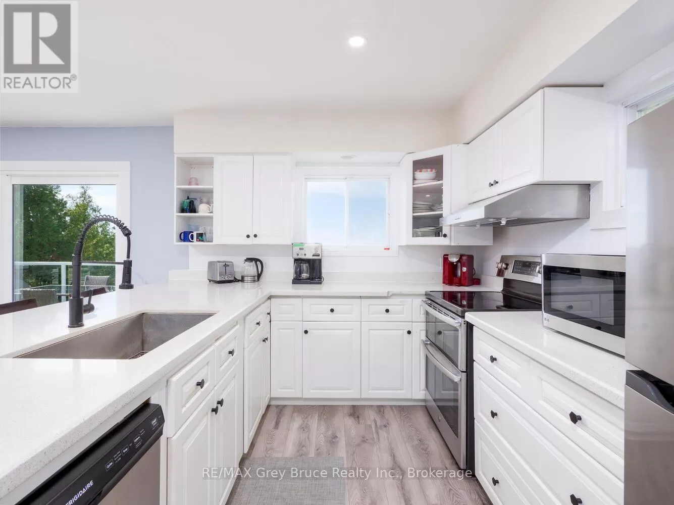 Cross Streets: Johnson Harbour Rd & Dorcas Bay Rd. ** Directions: Head North on Hwy 6 (ON-6). Turn Left onto Johnsons Harbour Road. Turn Right onto Dorcas Bay Road. Destination will be on your Left, look for signs. Oh my, the ocean-like views steal the show in this waterfront home on Dorcas Bay. As you step inside you'll be greeted by the open concept kitchen, dining, and living area creating the perfect place for entertaining family and friends. Expansive windows provide an abundance of natural light that floods the living space. A 14-foot patio door, added recently, leads to a generously sized deck, featuring glass panels and rails which were added in the last few years. You'll never tire from the ever changing, uninterrupted ocean-like views of Lake Huron from both inside and outside of this home. With 4 generously sized bedrooms and 2 bathrooms there is ample space for everyone. The primary bedroom boasts a renovated ensuite bathroom and the main bathroom has also been upgraded. On the upper floor you'll find the 4th bedroom space with a recently installed window providing more stunning water views. The home has seen a number of additional upgrades in the last few years including: new flooring throughout, LED lighting inside and out, new pex plumbing, new hot water tank and UV, and a freshened kitchen. The walk-out lower level currently features a utility area, laundry area and a roughed in bathroom, and provides an open canvas to design and add more living space if desired, while the built-in garage provides oodles of storage. The shoreline with its gradual water entry is ideal for families with smaller children to enjoy water activities. This home comes turnkey with furniture, appliances, pots/pans/cutlery/dishes and more. Conveniently located near Tobermory, Singing Sands Beach, and the Grotto, you and your guests have access to an array of recreational activities, shops and restaurants. This property is currently licensed for STA stays with a proven rental income. (id:27476)