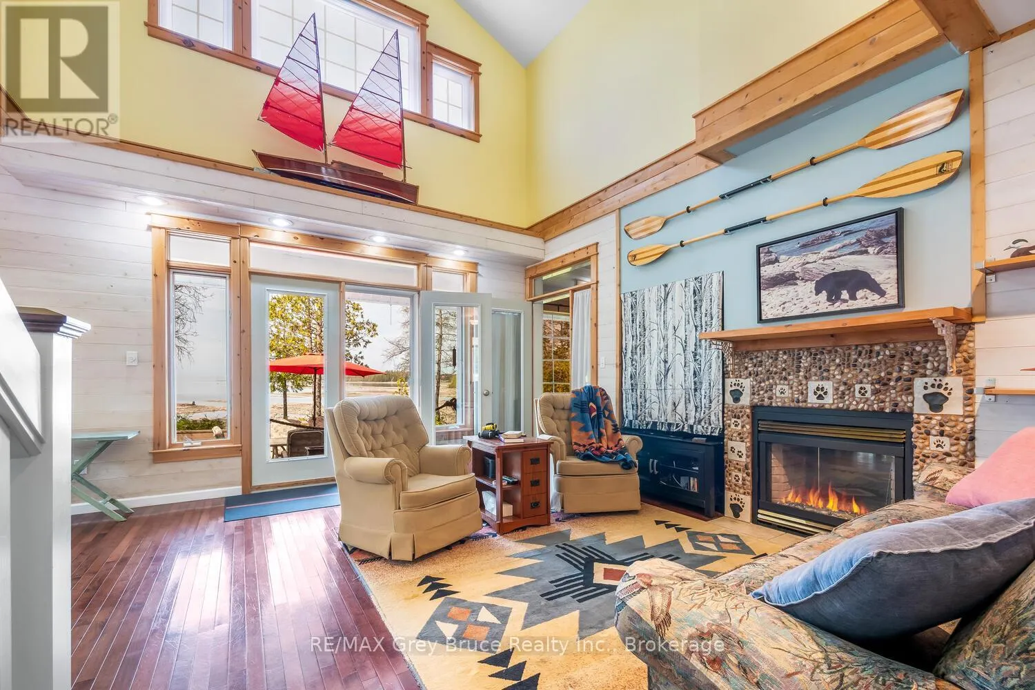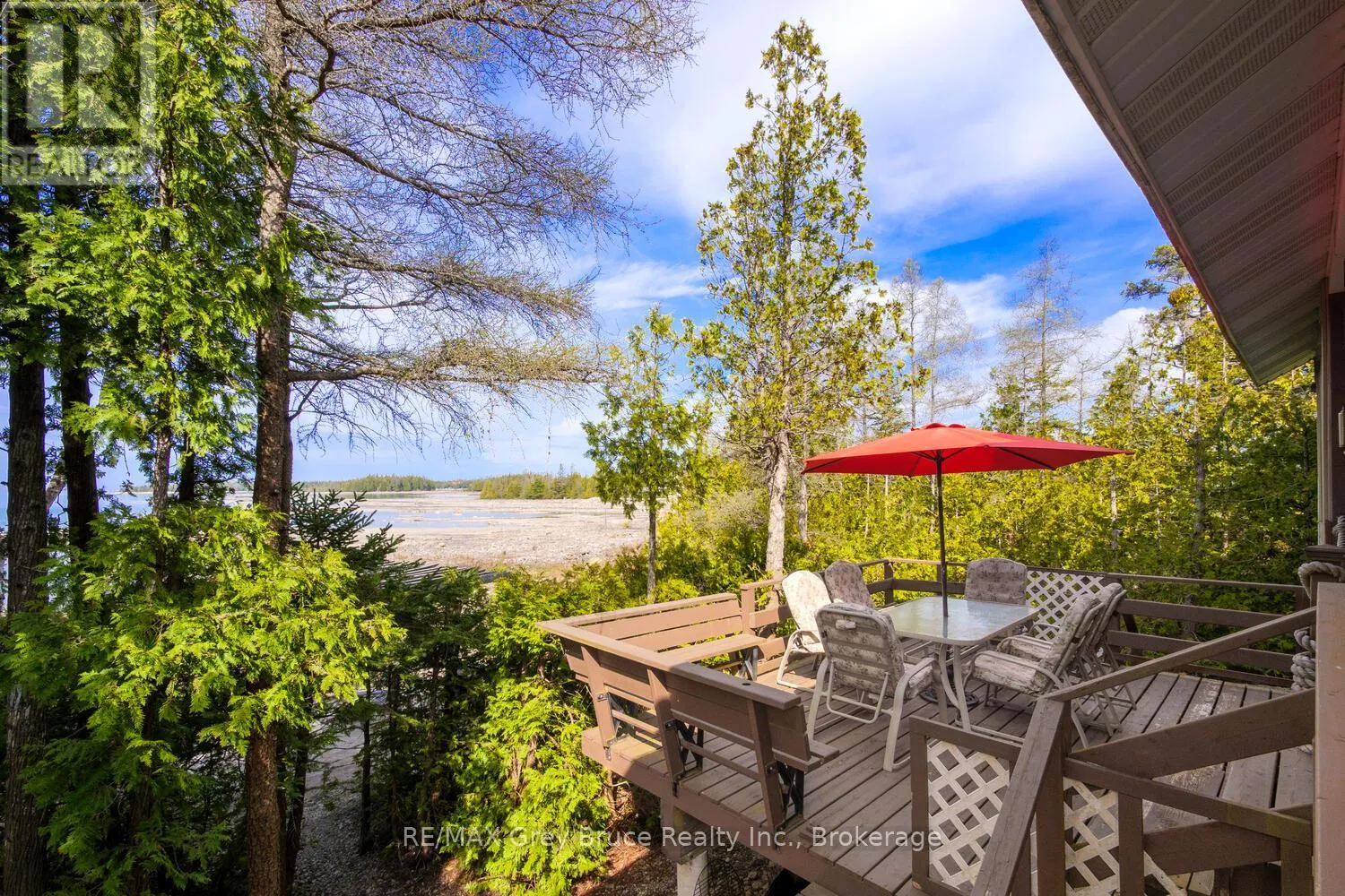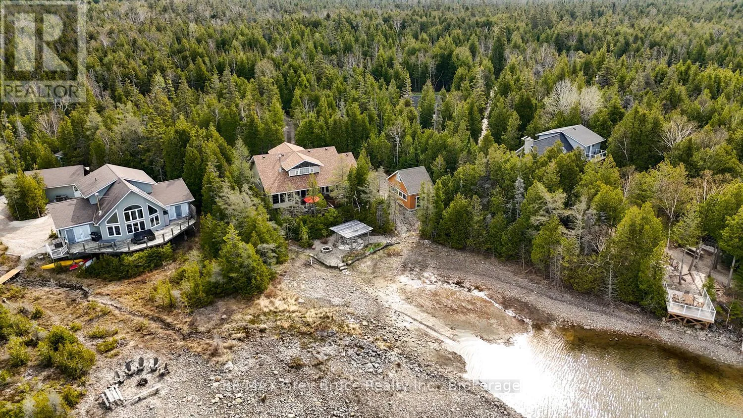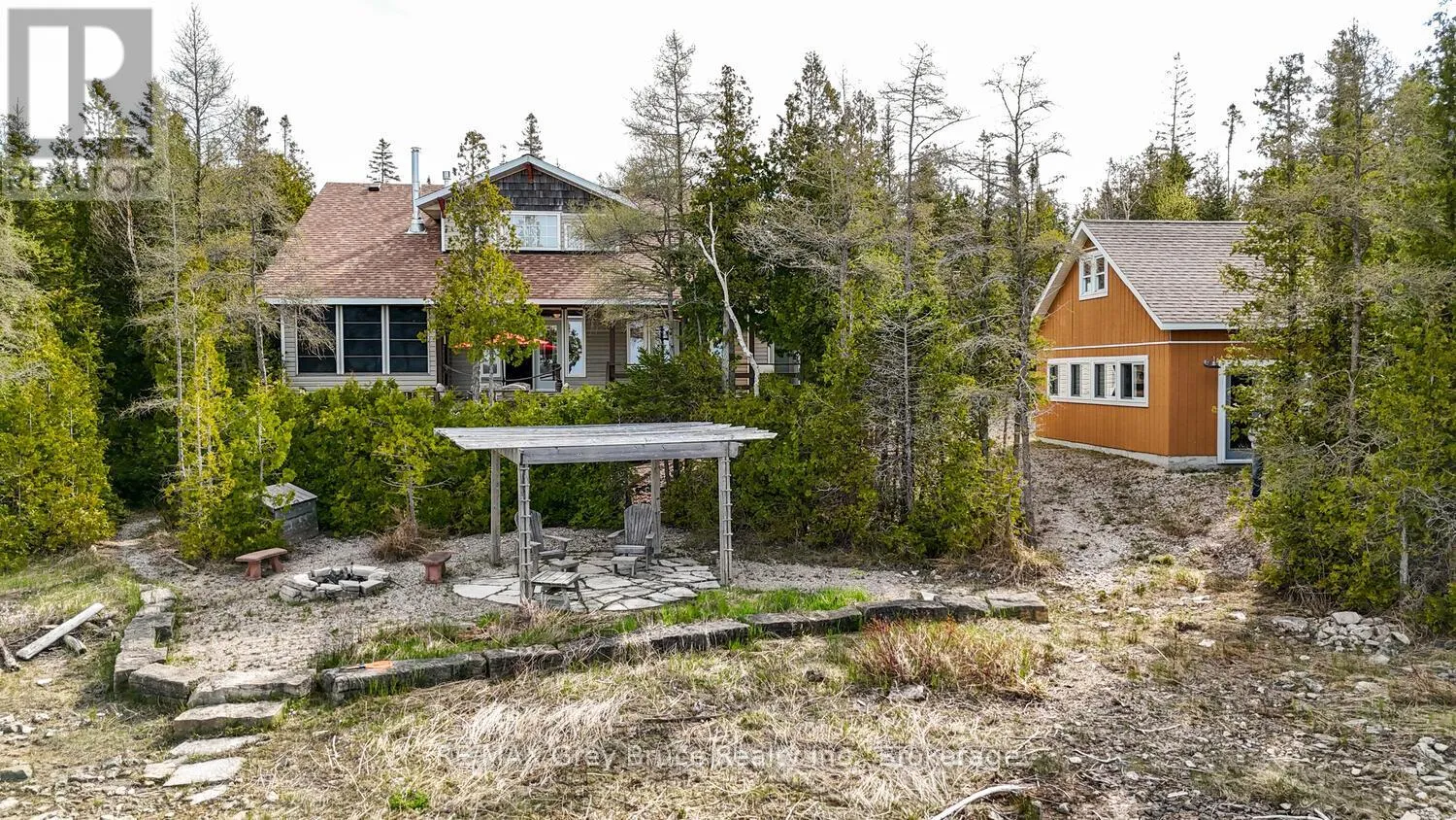 Cross Streets: Warner Bay Rd & Eagle Rd. ** Directions: Travel North on Highway 6, Turn Left on Warner Bay Rd, Follow to the T. Turn Left onto Eagle Rd. Property will be on the Right. #205. Turn-key Lakefront Home/Cottage with Sandy Shoreline! Your Bruce Peninsula retreat near Tobermory awaits. Offering a rare sandy beach shoreline in a protected cove, this property is perfect for family getaways, weekend retreats or retirement living. Sited a short drive to Tobermory and directly across from the Bruce Peninsula National Park, this property delivers the ultimate four-season recreational lifestyle. Arrive via a winding, tree-lined driveway and step into a serene setting with panoramic lake views and spectacular sunsets. Enjoy outdoor living with expansive decks, a stone waterfront patio, and covered porches - ideal for relaxing, entertaining, or soaking in the natural surroundings. The clean, sandy-bottom waterfront offers easy entry for all ages-perfect for swimming, kayaking, paddleboarding, and endless summer fun. Evenings are made for campfires by the shore, with the gentle sound of waves completing the experience. Inside, this thoughtfully designed 3 bedroom, 2-bathroom home/cottage features a bright kitchen, dining, and living area with vaulted ceilings. A double-sided fireplace adds warmth and ambiance to both the living room and primary bedroom retreat. The main floor includes a spacious secondary bedroom, a full bath, plus a private primary suite with ensuite and walkout to a screened three-season sunroom. A perfect getaway for morning coffee or quiet evenings by the woodstove. The loft-style bedroom is a dream for kids, with space for bunk beds and play, or consider use as a home office, taking in the elevated lake views. Additional features include a detached garage with loft space for storage. Offered fully furnished (turnkey), this is a ready-to-enjoy waterfront property in one of Ontario's premier cottage country destinations. Close to hiking the Bruce Trail, the Grotto, Georgian Bay, and Lake Huron - this is your gateway to adventure and relaxation. (id:27476)
