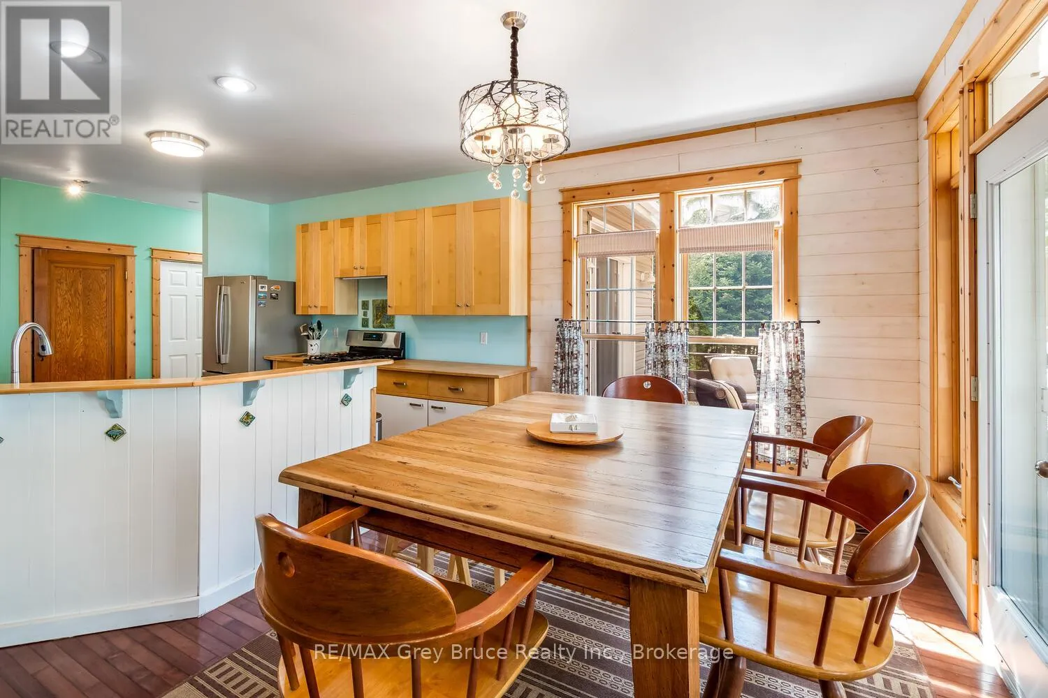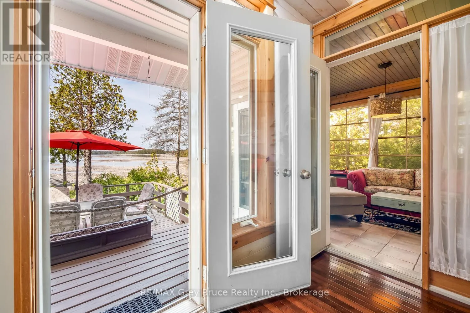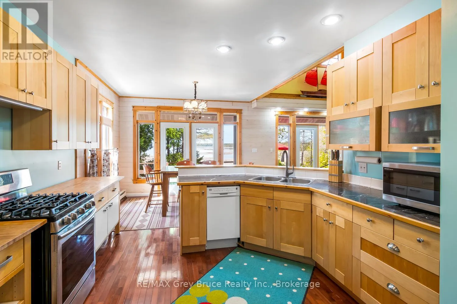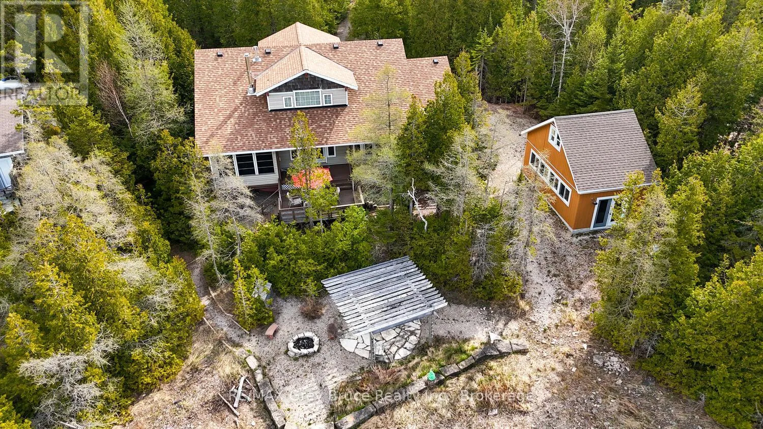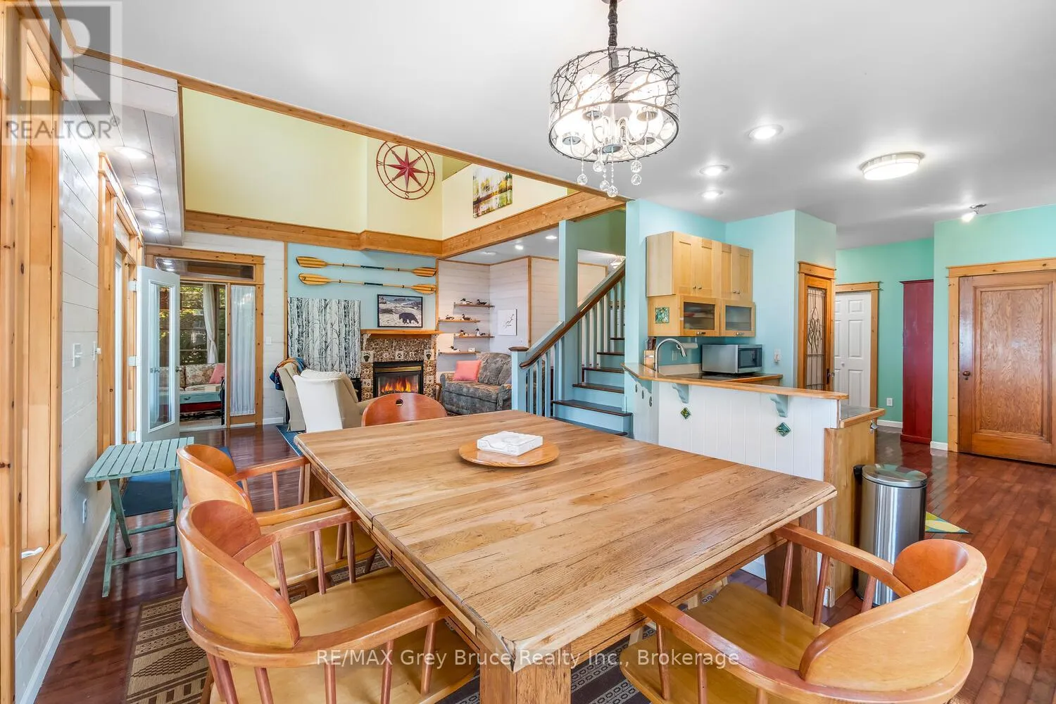 Cross Streets: Warner Bay Rd & Eagle Rd. ** Directions: Travel North on Highway 6, Turn Left on Warner Bay Rd, Follow to the T. Turn Left onto Eagle Rd. Property will be on the Right. #205. Turn-key Lakefront Home/Cottage with Sandy Shoreline! Your Bruce Peninsula retreat near Tobermory awaits. Offering a rare sandy beach shoreline in a protected cove, this property is perfect for family getaways, weekend retreats or retirement living. Sited a short drive to Tobermory and directly across from the Bruce Peninsula National Park, this property delivers the ultimate four-season recreational lifestyle. Arrive via a winding, tree-lined driveway and step into a serene setting with panoramic lake views and spectacular sunsets. Enjoy outdoor living with expansive decks, a stone waterfront patio, and covered porches - ideal for relaxing, entertaining, or soaking in the natural surroundings. The clean, sandy-bottom waterfront offers easy entry for all ages-perfect for swimming, kayaking, paddleboarding, and endless summer fun. Evenings are made for campfires by the shore, with the gentle sound of waves completing the experience. Inside, this thoughtfully designed 3 bedroom, 2-bathroom home/cottage features a bright kitchen, dining, and living area with vaulted ceilings. A double-sided fireplace adds warmth and ambiance to both the living room and primary bedroom retreat. The main floor includes a spacious secondary bedroom, a full bath, plus a private primary suite with ensuite and walkout to a screened three-season sunroom. A perfect getaway for morning coffee or quiet evenings by the woodstove. The loft-style bedroom is a dream for kids, with space for bunk beds and play, or consider use as a home office, taking in the elevated lake views. Additional features include a detached garage with loft space for storage. Offered fully furnished (turnkey), this is a ready-to-enjoy waterfront property in one of Ontario's premier cottage country destinations. Close to hiking the Bruce Trail, the Grotto, Georgian Bay, and Lake Huron - this is your gateway to adventure and relaxation. (id:27476)