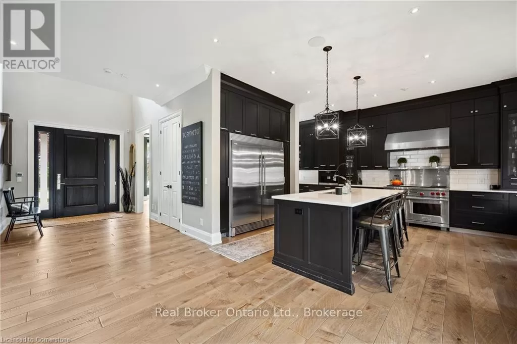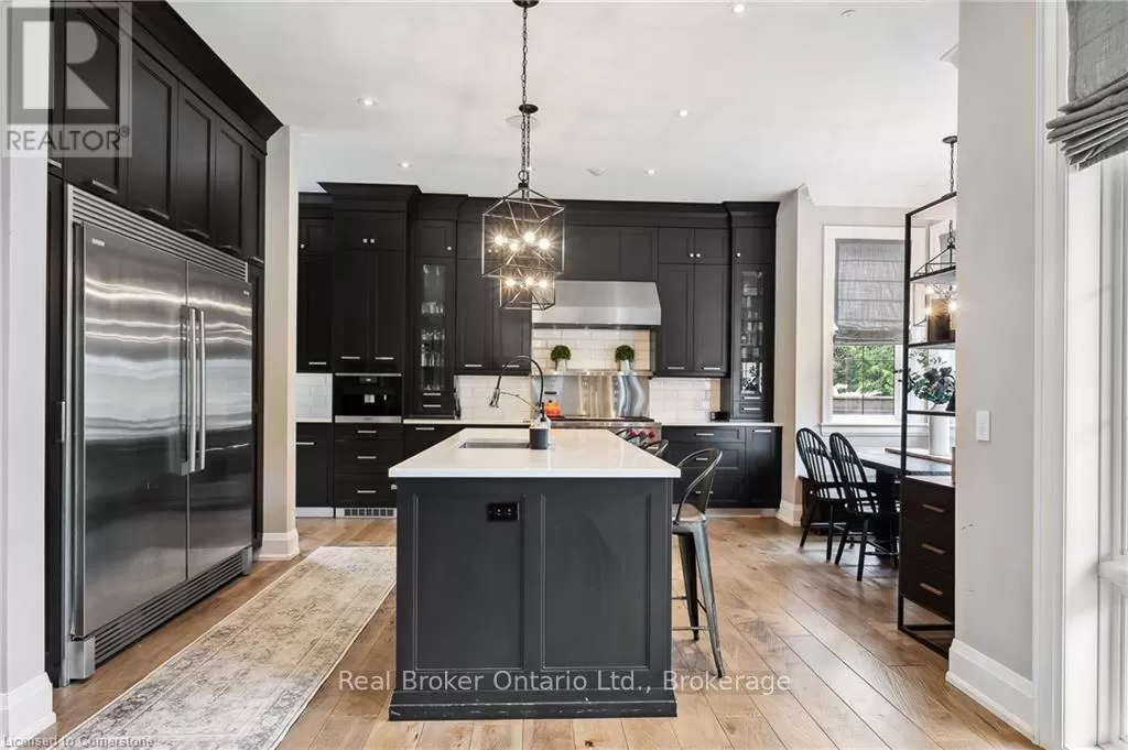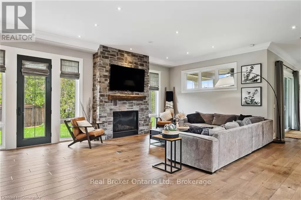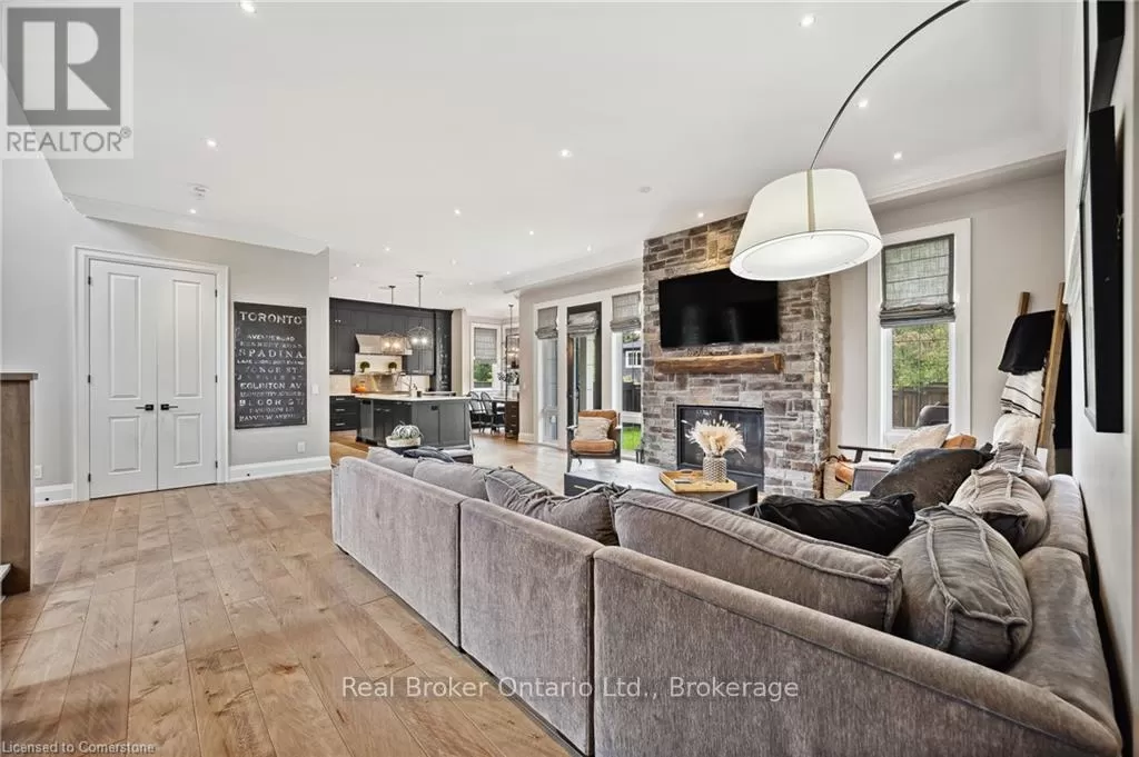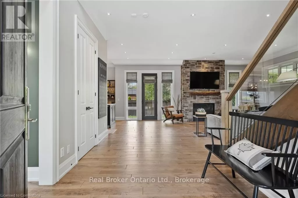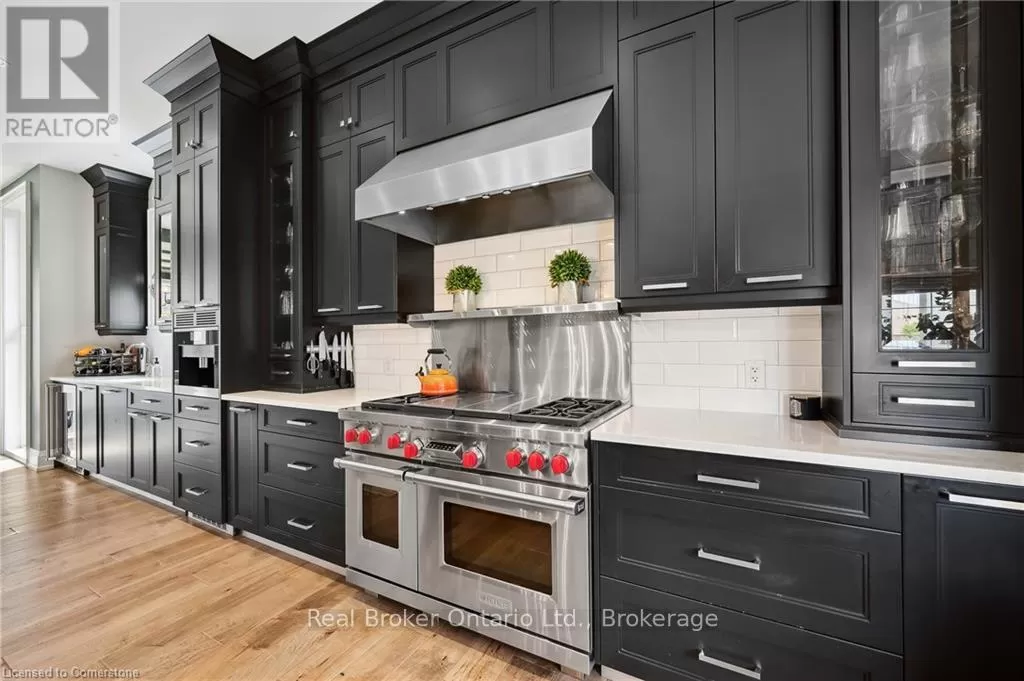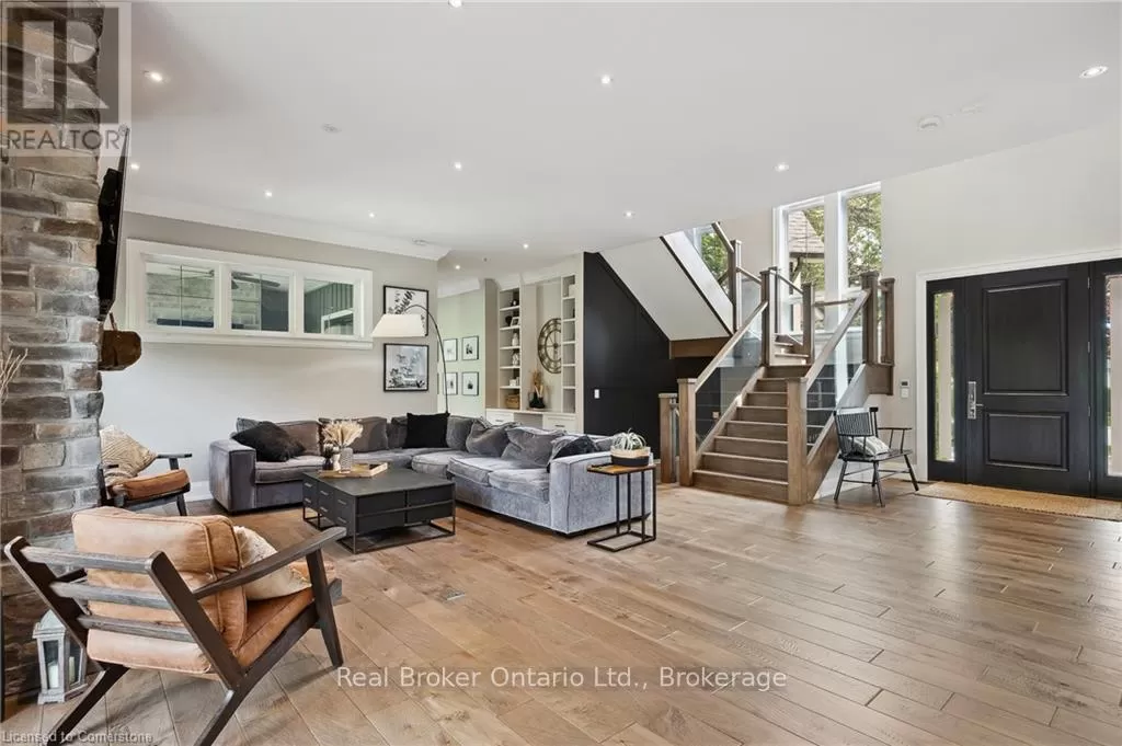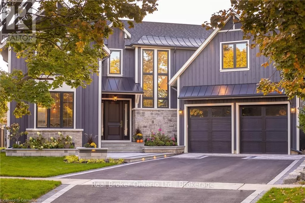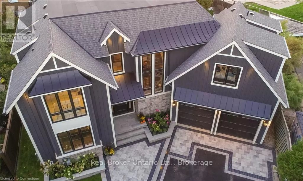 Rebecca to Lees Lane to Wood Place Welcome to 1247 Wood Place a stunning custom home. Architects Willmott & Strickland designed this incredible home. Nestled on a premium pie-shaped lot, this luxurious 2-storey detached home offers approx. 3,879 sq. ft. above grade, plus a full (partially finished) basement with 2 additional bedrooms and a rec room. The main level impresses with a grand 2-storey foyer, hardwood floors, a gourmet kitchen with quartz counters, high-end appliances (Wolf, Miele, Electrolux, KitchenAid), butlers pantry, and built-in wine fridge. The living room features floor-to-ceiling windows, gas fireplace, and walkout to a professionally landscaped backyard with covered lounge, gas fireplace, hot tub, and concrete deck. Upstairs, the primary suite offers 2 walk-in closets, 5-pc ensuite with heated floors, gas fireplace, and French doors. Three additional bedrooms include a Jack-and-Jill bath and a private ensuite. A main-floor bedroom doubles as a home office with custom cabinetry. The finished basement includes a 3-pc bath, media-ready rec room with built-in sound system, and full home automation infrastructure. Additional features: double garage with 2 Tesla chargers, 200-amp service, Vantage home automation, ELK security with GSM backup, Generac generator switch, VanEE air exchange, Ubiquity Wi-Fi system (6 pods), central vac, and 175 LED pot lights. Located on a quiet street with exceptional curb appeal, this home is the perfect blend of modern design, comfort, and technology. Overall, 1247 Wood Place offers a blend of peaceful residential living with convenient access to several top schools, recreational facilities, shopping centers, and transportation, making it a highly desirable location in Oakville. (id:27476)