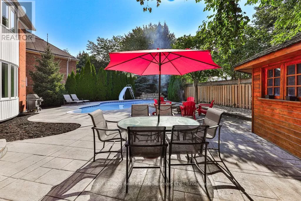 Upper Middle Road E/Grand Blvd/Valleybrook/Glenvista Nestled on one of Joshua Creek's most sought-after streets, this charming family home boasts 3,720 sq ft of elegant living space on a premium, mature pie-shaped lot adjacent to serene greenspace. The backyard is a private oasis featuring a luxurious spa-like ambiance with an inground pool, hot tub, expansive terrace and a charming cedar pool hut. Inside, you'll find a spacious great room, a main floor office and soaring vaulted ceilings. Recent updates include new stainless-steel appliances, a custom front door (2021), roof (2013), windows (2011), furnace (2017), garage doors (2022), pool pump (2025), pool heater (2025 demo model), pool liner (2018) and driveway (2021). Additional highlights include 9-foot ceilings on the main floor, hardwood flooring and two inviting fireplaces. Ideally situated near top-rated schools, parks, walking trails and transit. This is a must-see! (id:27476)