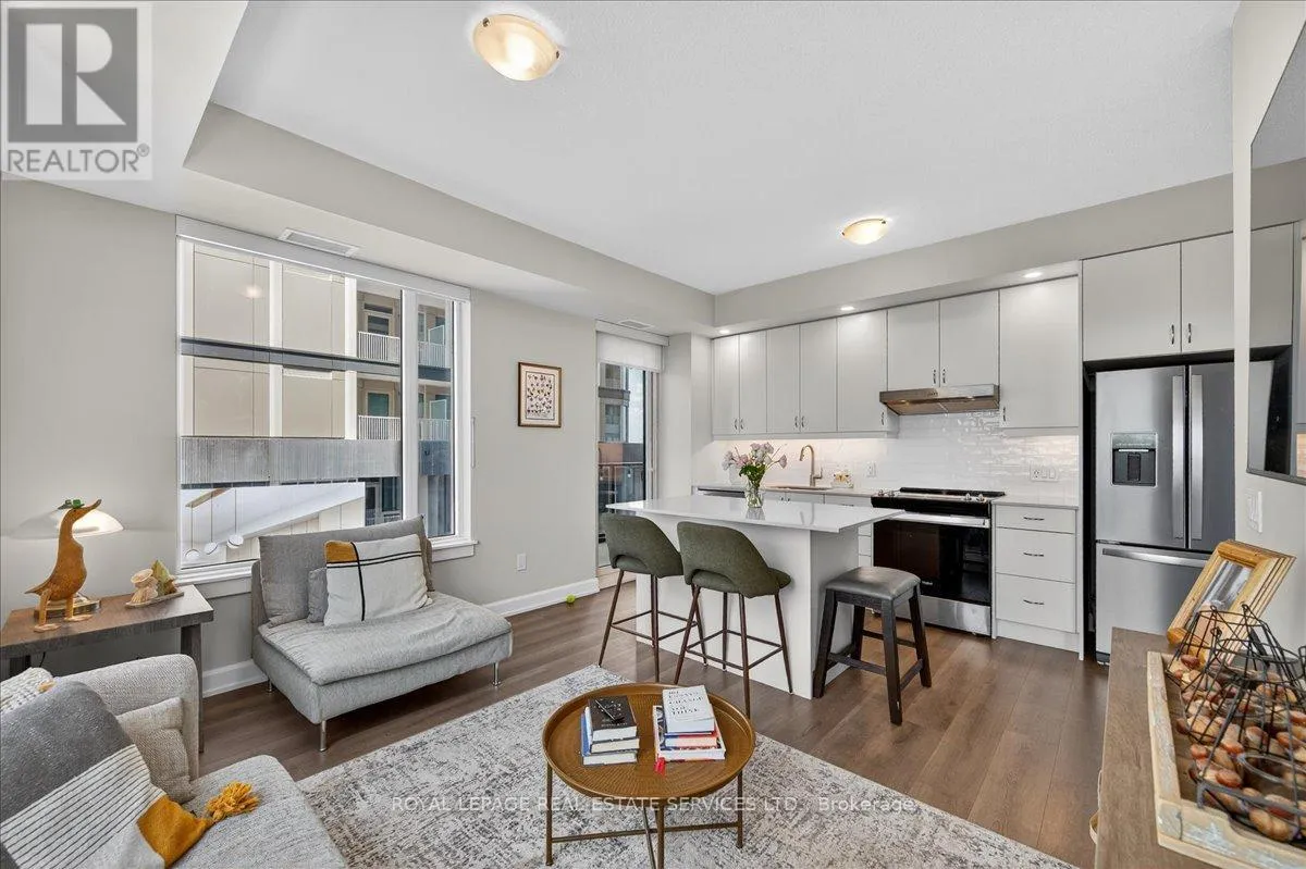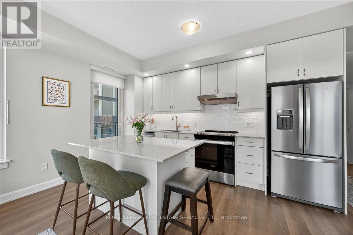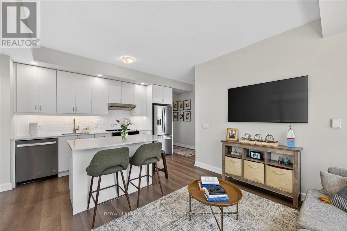 Trafalgar and Dundas Welcome to the Upper West Side Condo! This Modern Suite Features 2 Bedrooms, 2 Bathrooms, Ensuite Laundry, a Private Balcony, One Underground Parking Space and a Good Sized Locker. Over $16k in Premium Upgrades Have Been Added , Enhancing the Style and Value of the Unit. The Kitchen Showcases All Premium Stainless Steel Appliances, Including a French Door Style Fridge with Water & Ice, Quartz Countertops, Premium Cabinet Doors, Upgraded Faucets and Backsplash and a Centre Island with Seating. High End Laminate Flooring Throughout the Suite.Step Into a Lifestyle of Contemporary Luxury in this Cutting-Edge, Keyless-Entry Building Equipped with Smart Connect Home Technology. Unwind on the Rooftop Terrace, Take Advantage of the Co-working Spaces on the Main Floor, or Host Gatherings in the Upscale Party and Entertainment Lounge. Stay Active in the Fully Equipped Fitness Centre with Gym Lockers. This Condo Also Features a Pet Spa for Your Furry Companion. Ideally Located Near Oakville's Top Schools, Minutes from Sheridan College, Oakville Trafalgar Hospital, and Oakville GO Station, with Quick Connections to Highways 403 & 407. Surrounded by Local Restaurants, Shopping, Parks and More! This Residence Blends Comfort, Style, and Convenience. **Internet Included in Condo Fee** This is a Must See! (id:27476)