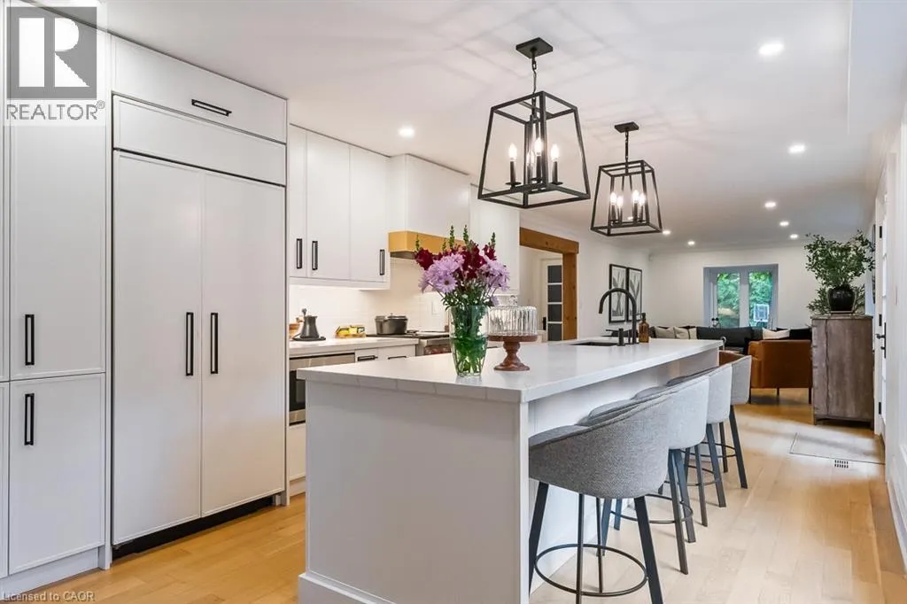 Lakeshore Rd E & Cavendish Ct Welcome to 138 Cavendish Court, nestled in Oakvilleâs coveted Morrison neighbourhood. Set on a private 0.42-acre lot at the end of a quiet cul-de-sac, this extensively updated residence combines refined style with everyday livability. Featuring 4+1 bedrooms, a 3-car garage, and nearly 4,500 sq. ft. of finished space, it represents a rare opportunity in this prestigious community. The main level showcases a bright, free-flowing layout with natural oak flooring and oversized windows that flood the home with natural light. The Living Room with gas fireplace feature wall opens to the Dining Room for formal or casual gathering. Ideal for culinary enthusiasts and entertainers alike, the designer kitchen showcases a beautiful quartz island, Wolf and Sub-Zero appliances, along with custom cabinetry. The adjacent family room, framed by nearly full-height windows and a cozy built-in bench, overlooks the landscaped backyard and pool area. A private office, stylish powder room, and functional mudroom complete this floor. Upstairs, the primary retreat features a spa-inspired 5-piece ensuite and spacious walk-in closet. Three additional bedrooms, and two updated bathrooms (one bedroom with private ensuite) provide convenience for families' busy lives. The finished lower level offers exceptional versatility, with an industrial design flare including a 5th bedroom, 3-piece bath, recreation/media room, and billiards/fitness space. Outdoors, enjoy your own backyard haven with concrete salt water pool, integrated spa, and extensive landscaping surrounded by mature trees for ultimate privacyâbringing a Muskoka feel to the city. Ideally located near the lake, parks, shopping, top-rated schools, and only minutes to downtown Oakville, the GO Train, and highways, this home delivers an unmatched blend of luxury and privacy for family living. (id:27476)