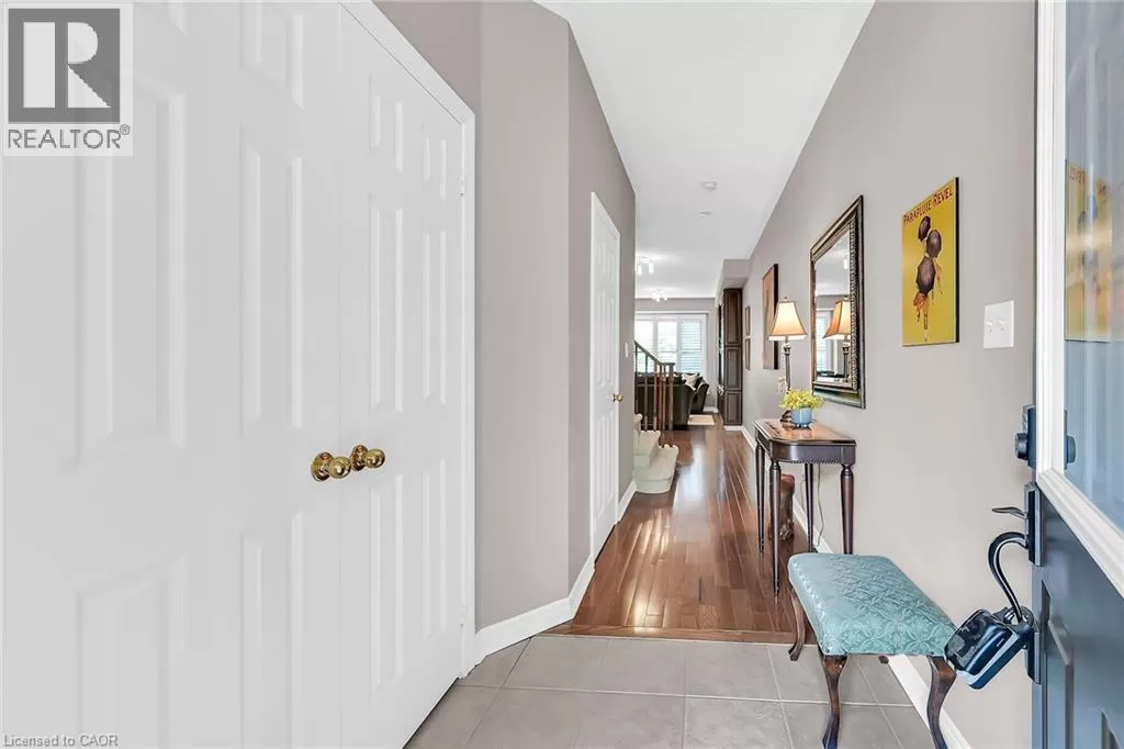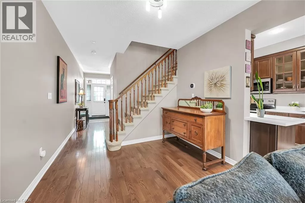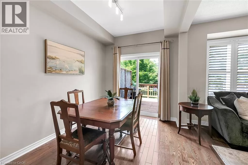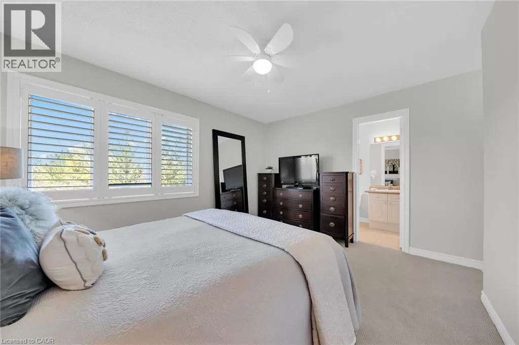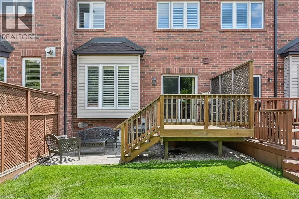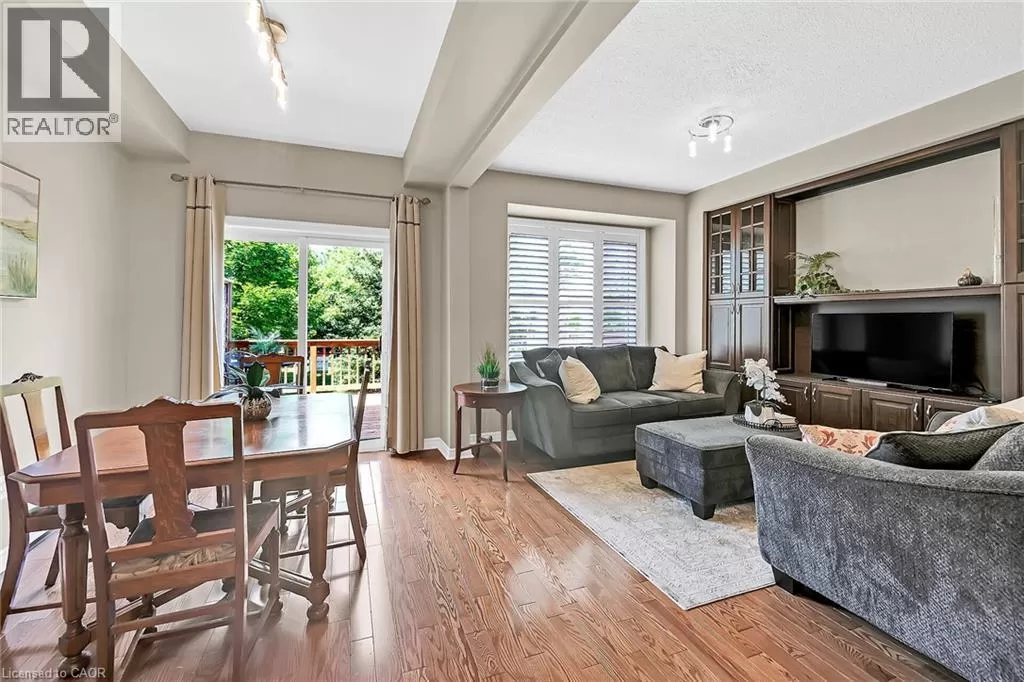 Off Eighth Line, North of Glenashton This beautifully maintained home offers an open-concept main level with hardwood floors, a modern kitchen with quartz countertops, a spacious living/dining area with custom-built entertainment unit . Sliding glass doors lead to a private deck and ground level patio overlooking green space. Upstairs, three generous bedrooms, complete with ceiling fans, and a primary suite with a walk-in closet, a double closet, and 4 piece ensuite. There is also a double linen closet for extra storage. The finished basement adds a versatile bonus room for a home gym/ teen suite/guest suite with private full bathroom. California shutters throughout add style, and inside entrance from garage adds convenience. The location in Wedgewood Creek provides trails, parks, a Community Centre, and top rated primary and high schools. Quick access to the QEW, 403, and GO station ensure easy commuting. This turnkey home is a rare gem in a vibrant, yet private, community. Make it yours! (id:27476)