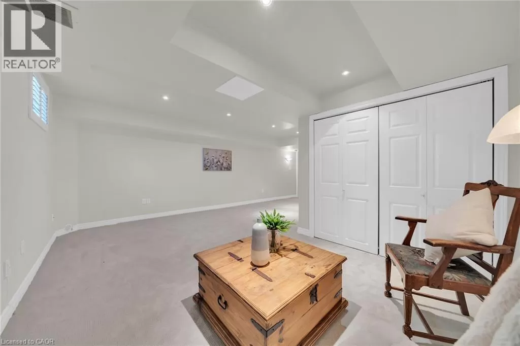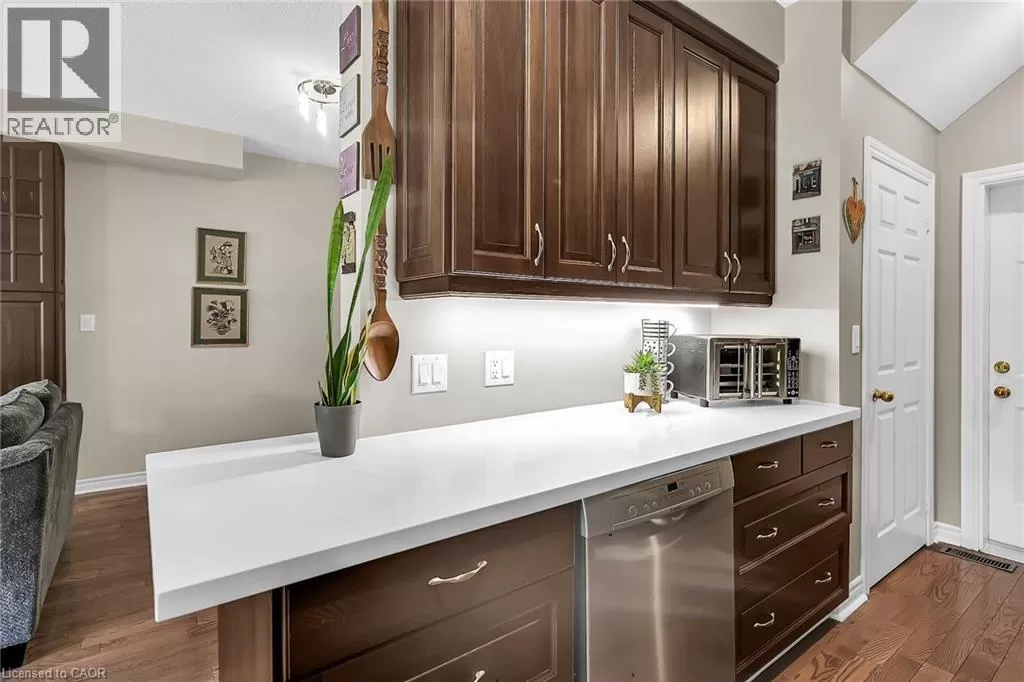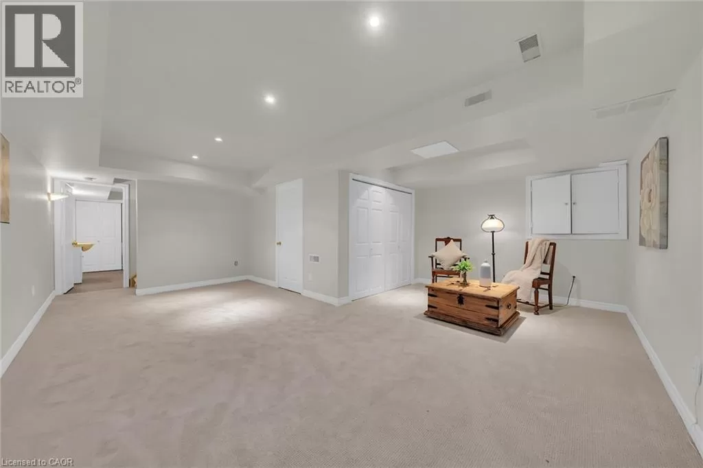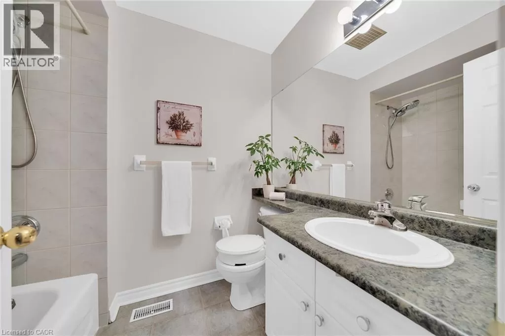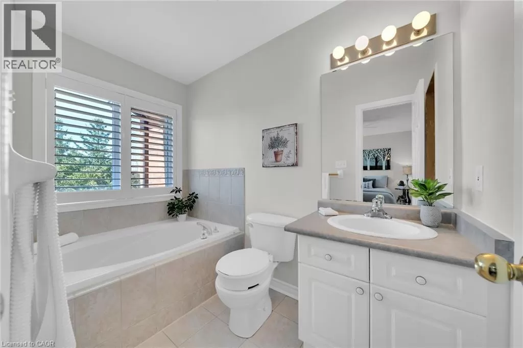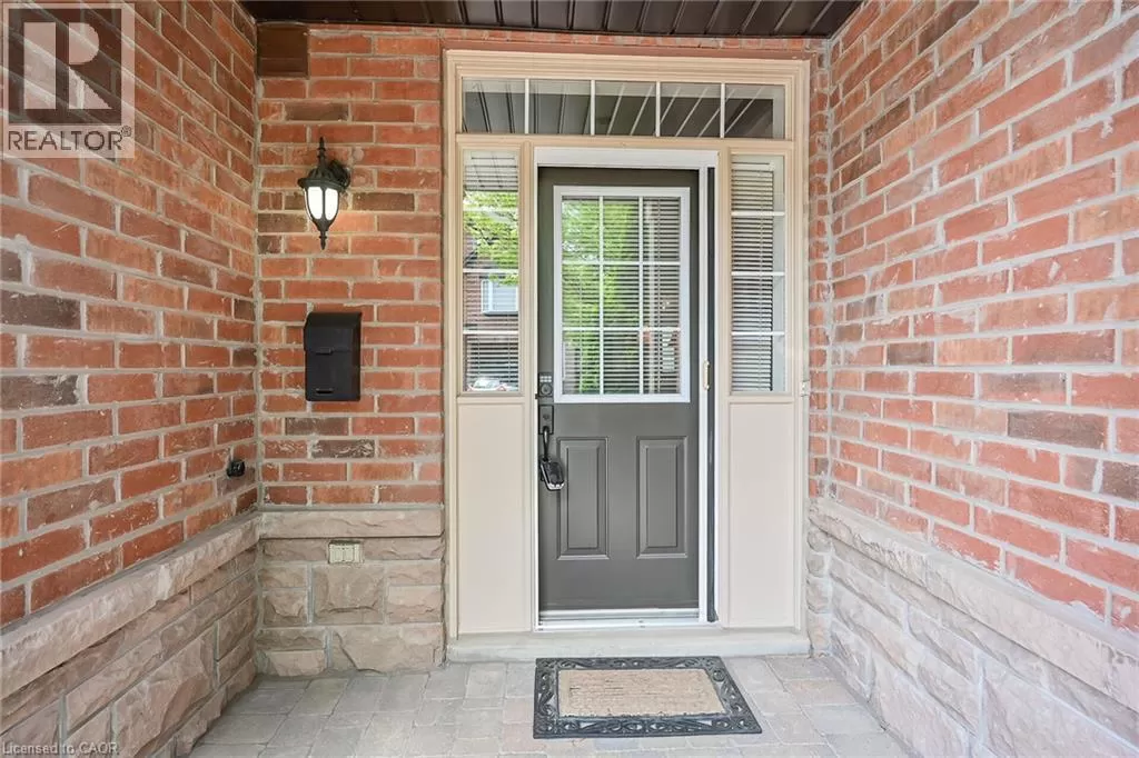 Off Eighth Line, North of Glenashton This beautifully maintained home offers an open-concept main level with hardwood floors, a modern kitchen with quartz countertops, a spacious living/dining area with custom-built entertainment unit . Sliding glass doors lead to a private deck and ground level patio overlooking green space. Upstairs, three generous bedrooms, complete with ceiling fans, and a primary suite with a walk-in closet, a double closet, and 4 piece ensuite. There is also a double linen closet for extra storage. The finished basement adds a versatile bonus room for a home gym/ teen suite/guest suite with private full bathroom. California shutters throughout add style, and inside entrance from garage adds convenience. The location in Wedgewood Creek provides trails, parks, a Community Centre, and top rated primary and high schools. Quick access to the QEW, 403, and GO station ensure easy commuting. This turnkey home is a rare gem in a vibrant, yet private, community. Make it yours! (id:27476)