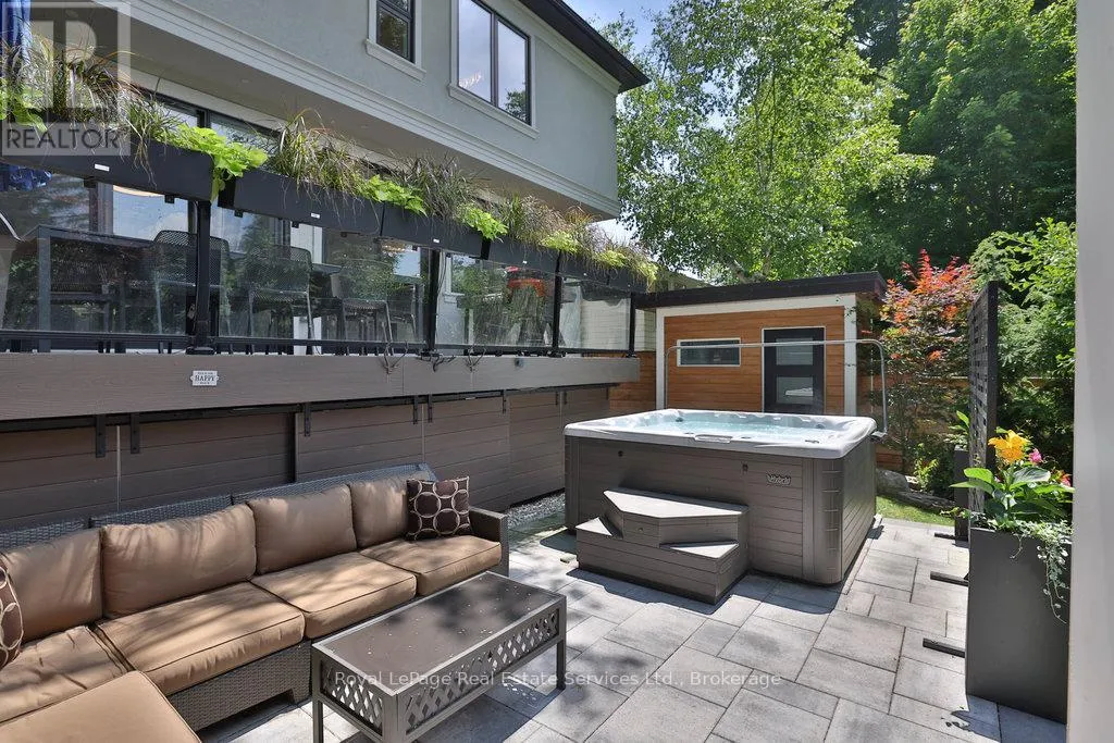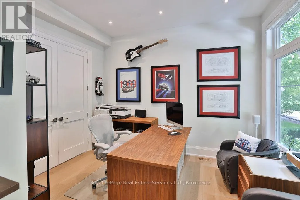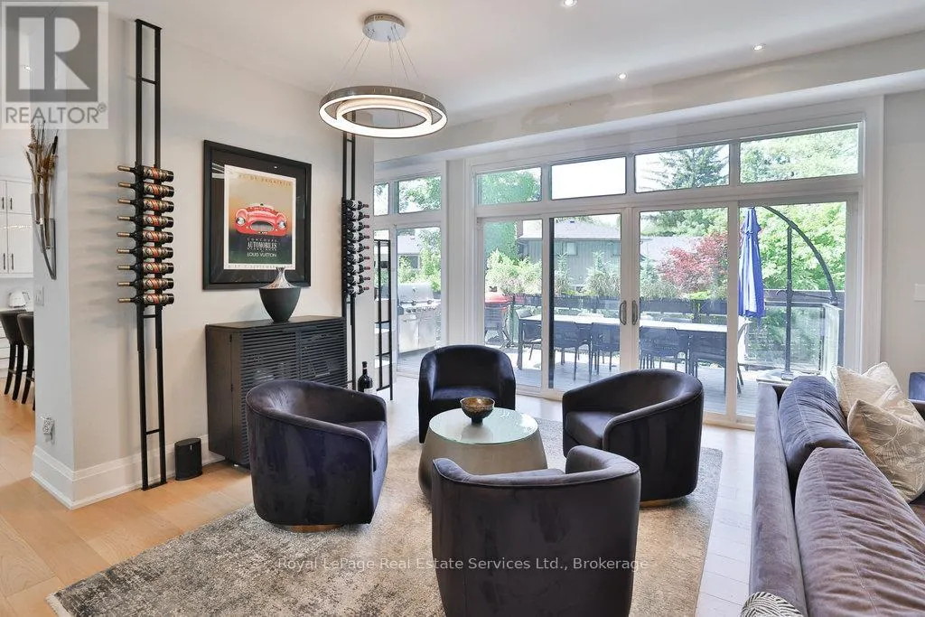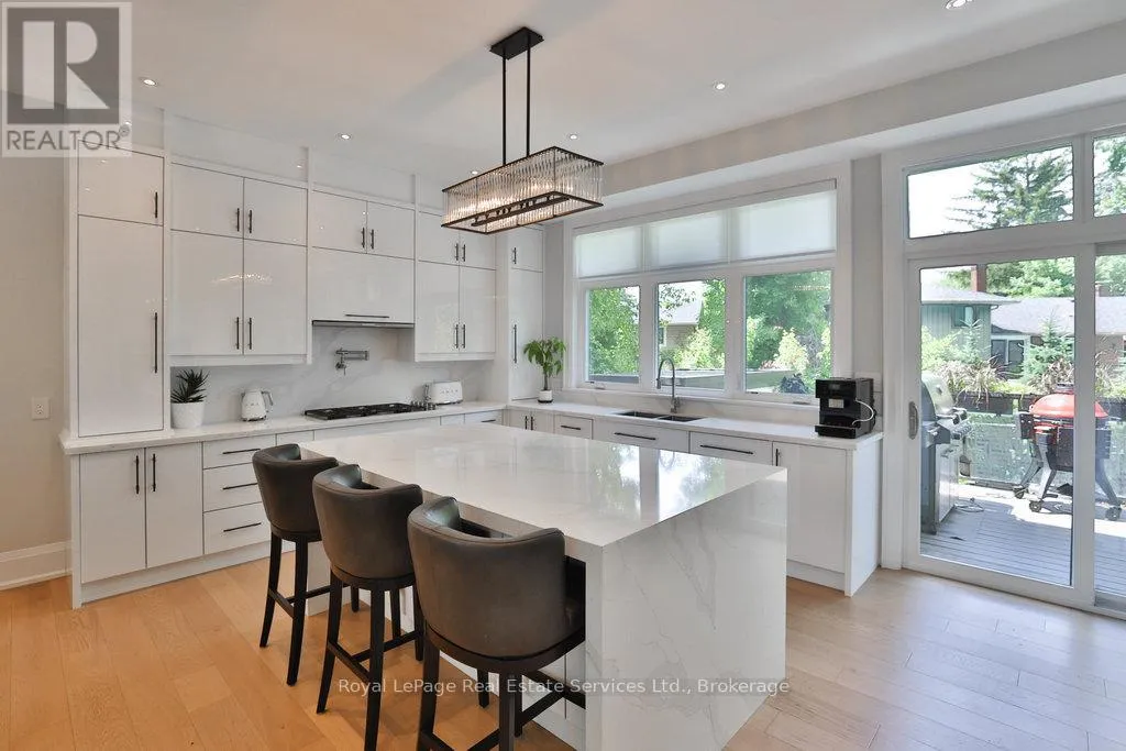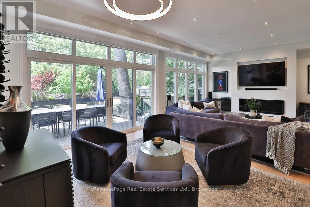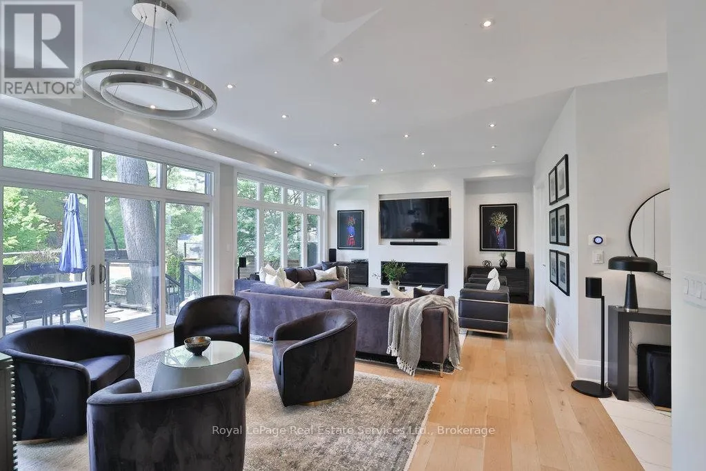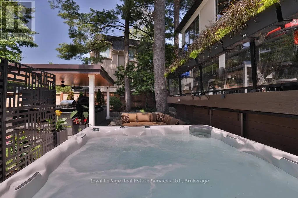Lakeshore / Charnwood Stunning contemporary designed custom 4+1 bedroom, 5 bathroom home in prestigious Southeast Oakville, directly facing Charnwood Park. With over 4,000 sq ft of luxurious living space across three levels, this home features 10ft ceilings on the main floor and 9ft on the second. The main level offers a formal living and dining room, spacious family room, private office, and powder room. Wall-to-wall windows flood the space with natural light. The modern kitchen includes a large island, quartz countertops, high-end cabinetry, and top-tier appliances and walk-out to composite deck. Premium finishes throughout include floating stairs, solid core doors, designer lighting, coffered ceilings, heated floors, a convenient upper-level laundry room, and custom motorized blinds in the main and primary bedrooms. All 4 upper-level bedrooms feature their own private ensuite. The fully finished basement includes a large recreation room, oversized windows, additional bedroom, and full bath, ideal as an in-law/teenage suite. Additionally there are multiple storage closets and inside entry to double car garage with epoxy floors. Outside, enjoy a stunning fully fenced backyard nestled among mature trees, perfect for entertaining. Features include a large deck, outdoor kitchen with gas BBQ and Fontana Forni pizza oven, 8-person Beachcomber hot tub, natural gas firebowl, beautiful gardens, a custom pergola with full electrical and pivoting TV mount, two custom sheds, and an irrigation system. Additional upgrades include an EV charger, home security cameras, and custom closets. Located in Oakville's top school district (Maple Grove PS, EJ James, St. Vincents and Oakville Trafalgar HS) and just a short walk to the lake, parks, and scenic trails. Truly one of a kind. (id:27476)
