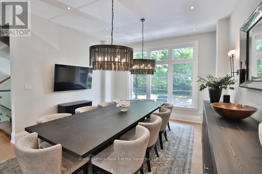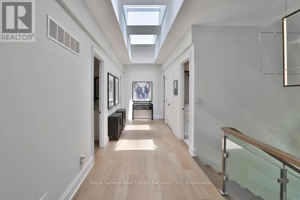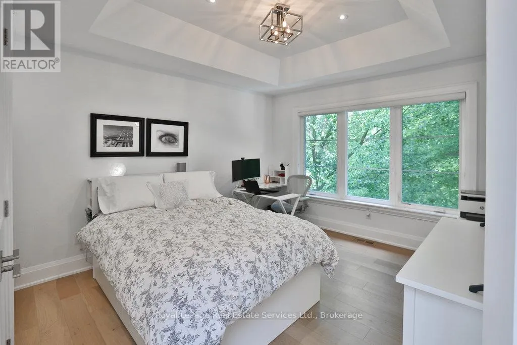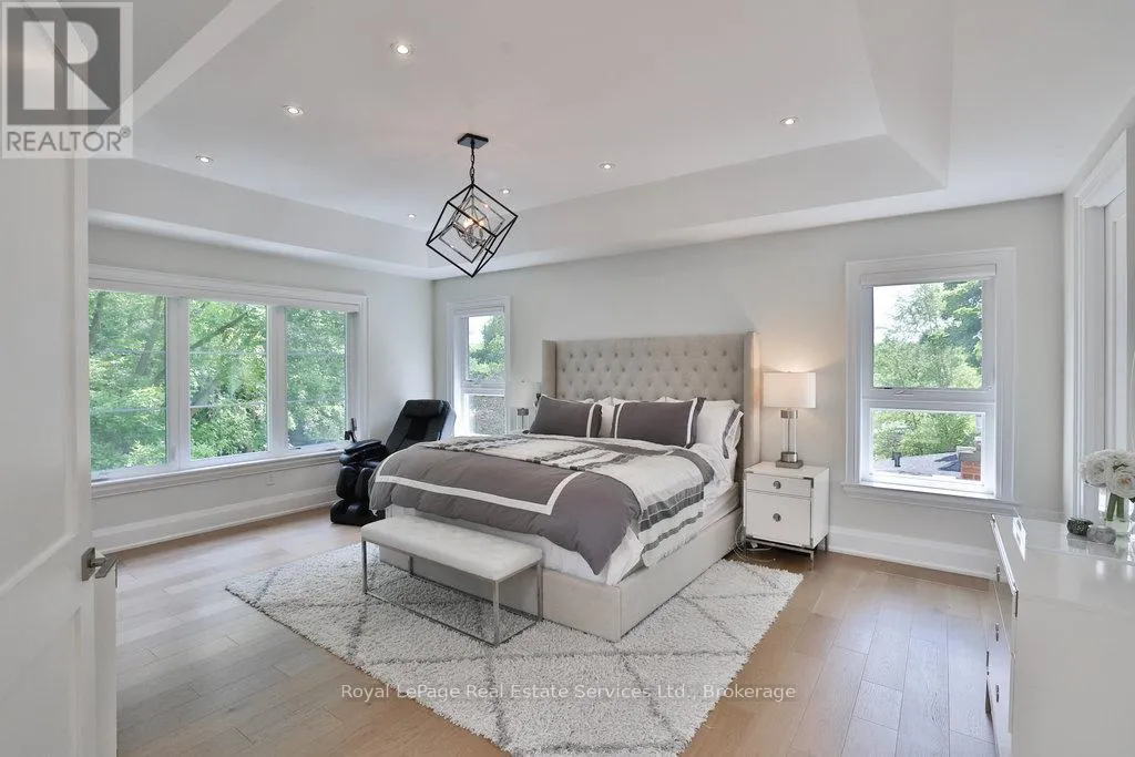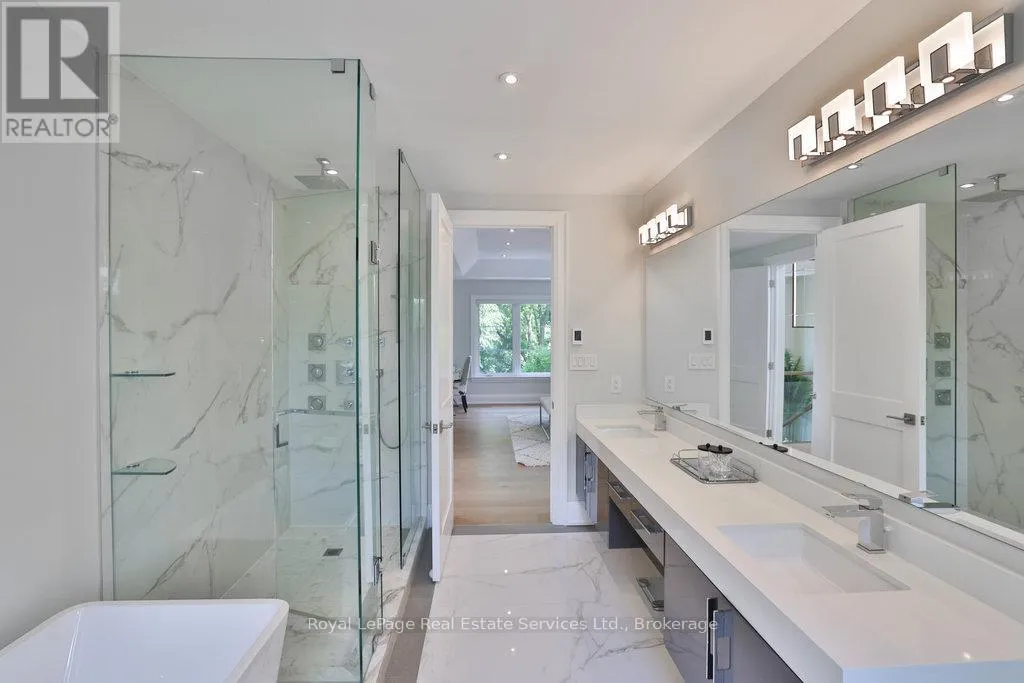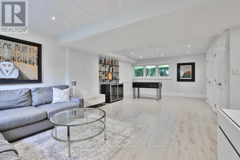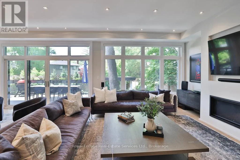 Lakeshore / Charnwood Stunning contemporary designed custom 4+1 bedroom, 5 bathroom home in prestigious Southeast Oakville, directly facing Charnwood Park. With over 4,000 sq ft of luxurious living space across three levels, this home features 10ft ceilings on the main floor and 9ft on the second. The main level offers a formal living and dining room, spacious family room, private office, and powder room. Wall-to-wall windows flood the space with natural light. The modern kitchen includes a large island, quartz countertops, high-end cabinetry, and top-tier appliances and walk-out to composite deck. Premium finishes throughout include floating stairs, solid core doors, designer lighting, coffered ceilings, heated floors, a convenient upper-level laundry room, and custom motorized blinds in the main and primary bedrooms. All 4 upper-level bedrooms feature their own private ensuite. The fully finished basement includes a large recreation room, oversized windows, additional bedroom, and full bath, ideal as an in-law/teenage suite. Additionally there are multiple storage closets and inside entry to double car garage with epoxy floors. Outside, enjoy a stunning fully fenced backyard nestled among mature trees, perfect for entertaining. Features include a large deck, outdoor kitchen with gas BBQ and Fontana Forni pizza oven, 8-person Beachcomber hot tub, natural gas firebowl, beautiful gardens, a custom pergola with full electrical and pivoting TV mount, two custom sheds, and an irrigation system. Additional upgrades include an EV charger, home security cameras, and custom closets. Located in Oakville's top school district (Maple Grove PS, EJ James, St. Vincents and Oakville Trafalgar HS) and just a short walk to the lake, parks, and scenic trails. Truly one of a kind. (id:27476)
