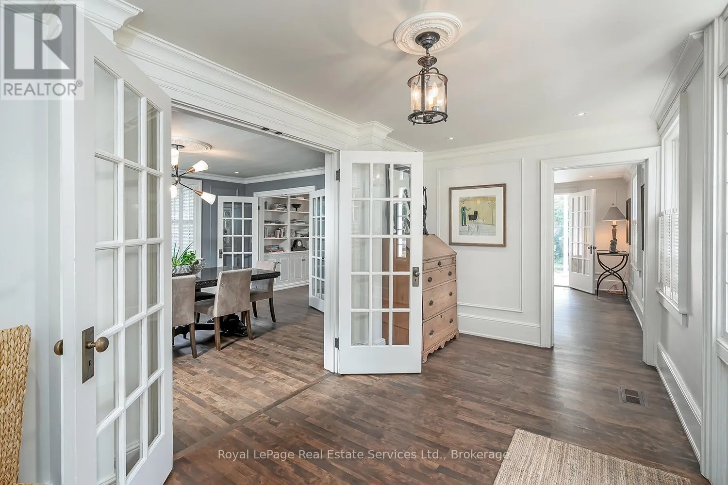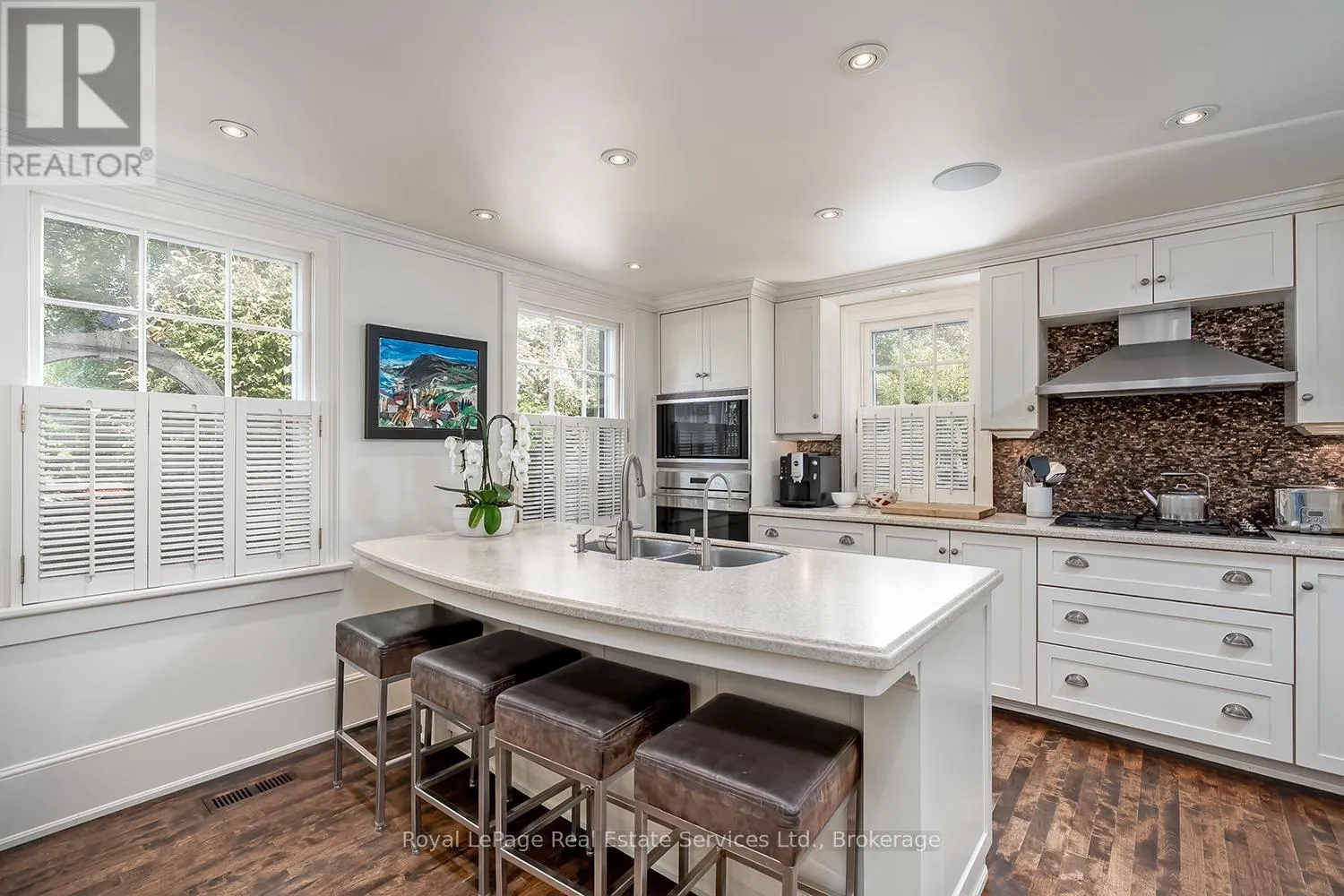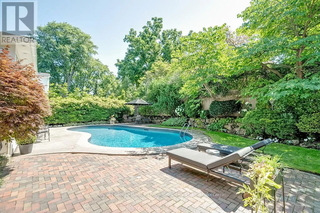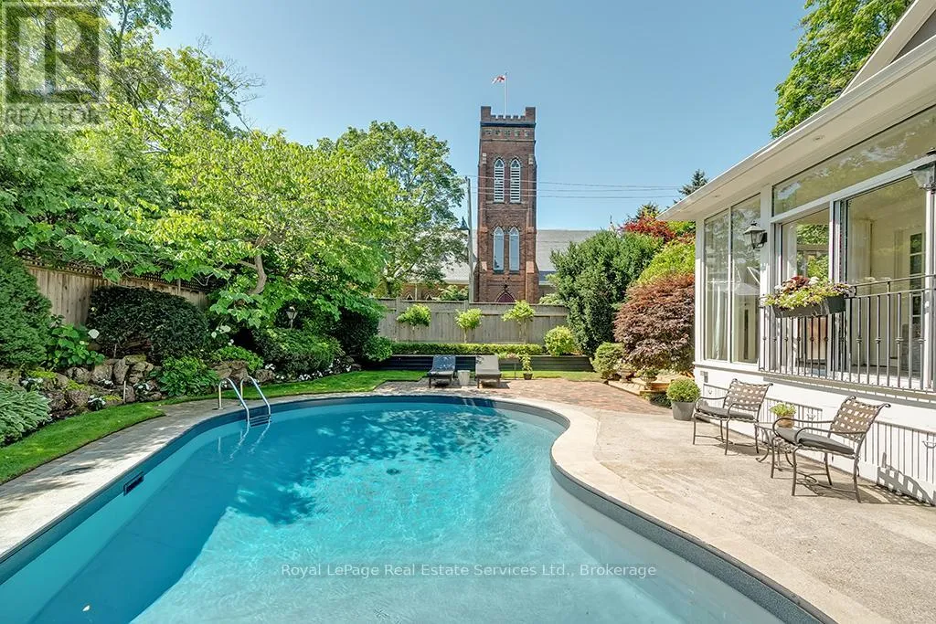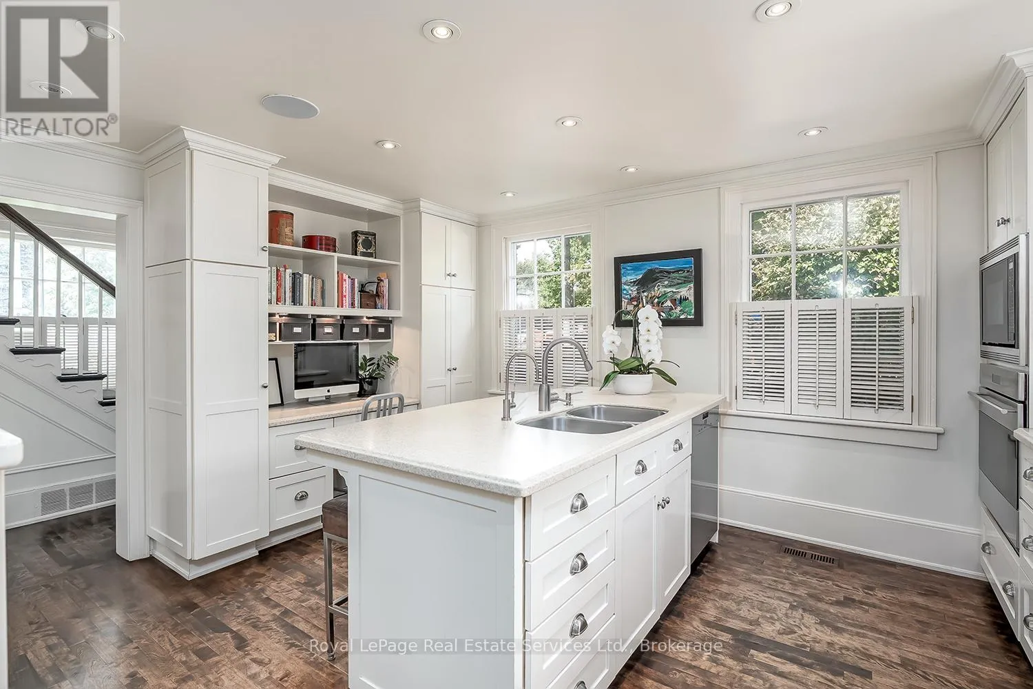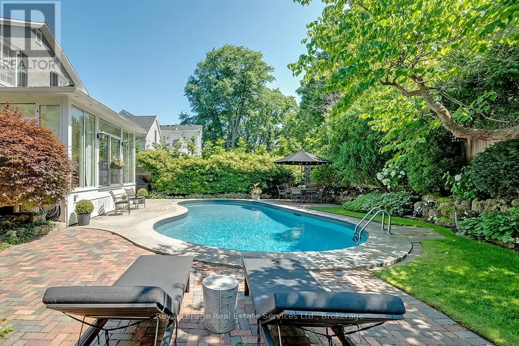 Thomas Street/William Street Nestled south of Lakeshore in the heart of Old Oakvilles historic district, this beautifully restored Georgian-style home, designed by Gren Weis, blends timeless character with modern updates. Steps from the lake, river, and vibrant Downtown, it offers an unmatched lifestyle location.The home boasts exceptional curb appeal with a flagstone path leading to a spacious foyer. Sun-filled interiors feature Farrow & Ball paint, new hardwood on the main level, preserved fir upstairs, smooth ceilings, and recessed LED lighting.The updated kitchen includes a large island, built-in appliances, and desk area. The dining room offers panelled walls, RH sconces, French doors to the garden, and plantation shutters. A charming living room features built-in bookcases, window seat, wood-burning fireplace, and walkouts to a sunroom overlooking the southwest garden and pool. A mudroom and stylish powder room complete the main floor.Upstairs are four bedrooms with ample closets and antique brass hardware. The primary suite offers custom built-ins and a renovated ensuite with heated Carrara marble floors and zero-threshold shower.The fully finished lower level (8 ceilings, slate flooring) adds living space with a media room, workout room, cedar closet, laundry, and storage. Updated mechanicals include a high-efficiency furnace, central AC, 100 AMP panel, irrigation. Cedar roof, new fencing, cobblestone driveway. Outside enjoy a private oasis with saltwater inground pool, brick patios, and landscaped gardens. Steps to the Lake, Oakville Club, Yacht Squadron, Library, Performing Arts Centre, Downtown, and top schools. (id:27476)