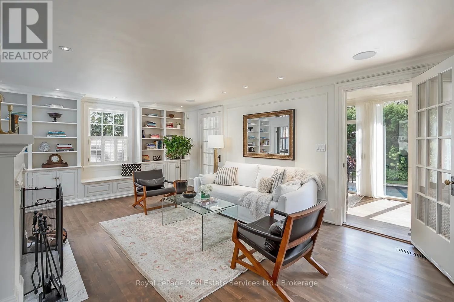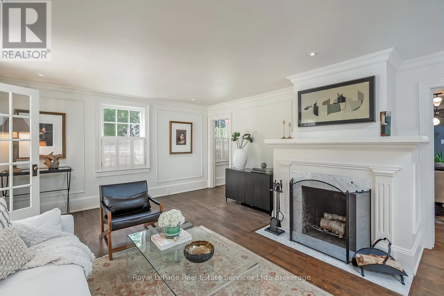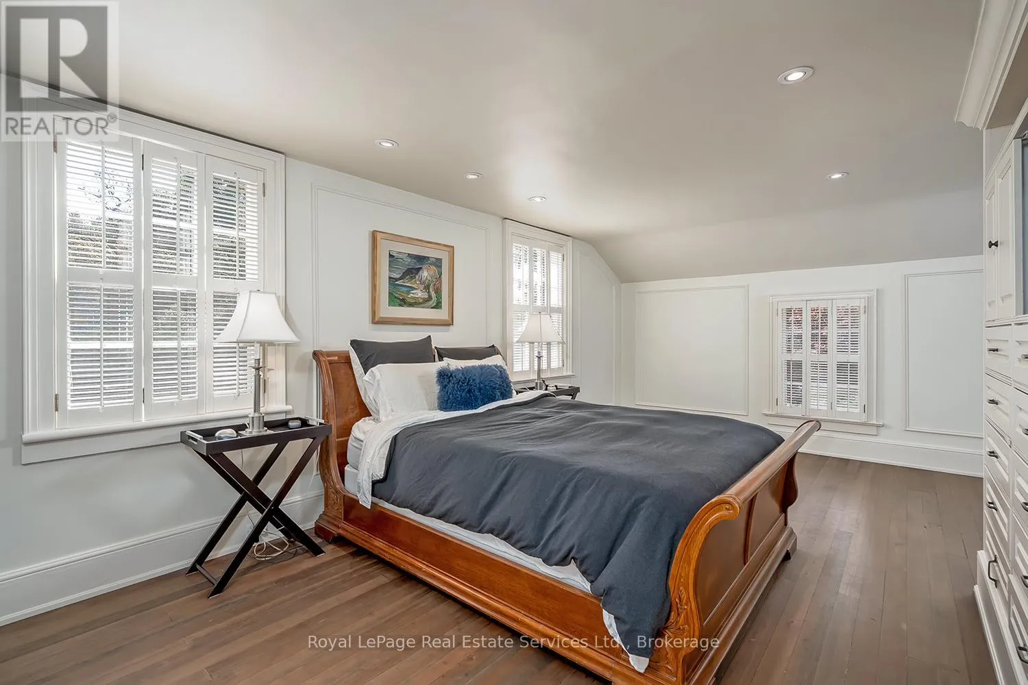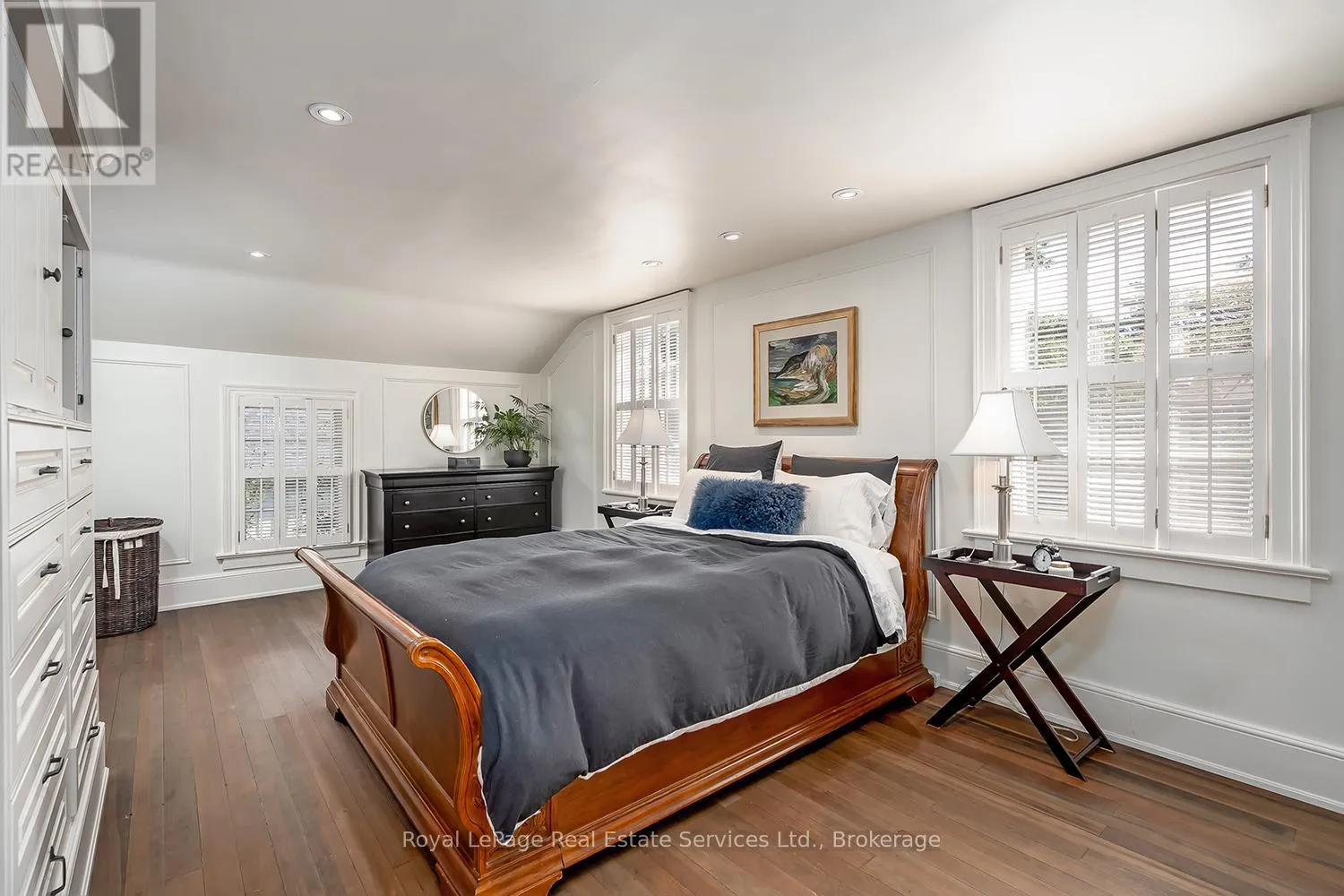 Thomas Street/William Street Nestled south of Lakeshore in the heart of Old Oakvilles historic district, this beautifully restored Georgian-style home, designed by Gren Weis, blends timeless character with modern updates. Steps from the lake, river, and vibrant Downtown, it offers an unmatched lifestyle location.The home boasts exceptional curb appeal with a flagstone path leading to a spacious foyer. Sun-filled interiors feature Farrow & Ball paint, new hardwood on the main level, preserved fir upstairs, smooth ceilings, and recessed LED lighting.The updated kitchen includes a large island, built-in appliances, and desk area. The dining room offers panelled walls, RH sconces, French doors to the garden, and plantation shutters. A charming living room features built-in bookcases, window seat, wood-burning fireplace, and walkouts to a sunroom overlooking the southwest garden and pool. A mudroom and stylish powder room complete the main floor.Upstairs are four bedrooms with ample closets and antique brass hardware. The primary suite offers custom built-ins and a renovated ensuite with heated Carrara marble floors and zero-threshold shower.The fully finished lower level (8 ceilings, slate flooring) adds living space with a media room, workout room, cedar closet, laundry, and storage. Updated mechanicals include a high-efficiency furnace, central AC, 100 AMP panel, irrigation. Cedar roof, new fencing, cobblestone driveway. Outside enjoy a private oasis with saltwater inground pool, brick patios, and landscaped gardens. Steps to the Lake, Oakville Club, Yacht Squadron, Library, Performing Arts Centre, Downtown, and top schools. (id:27476)