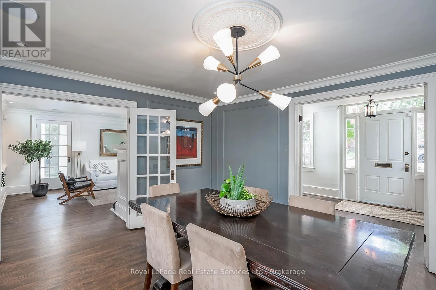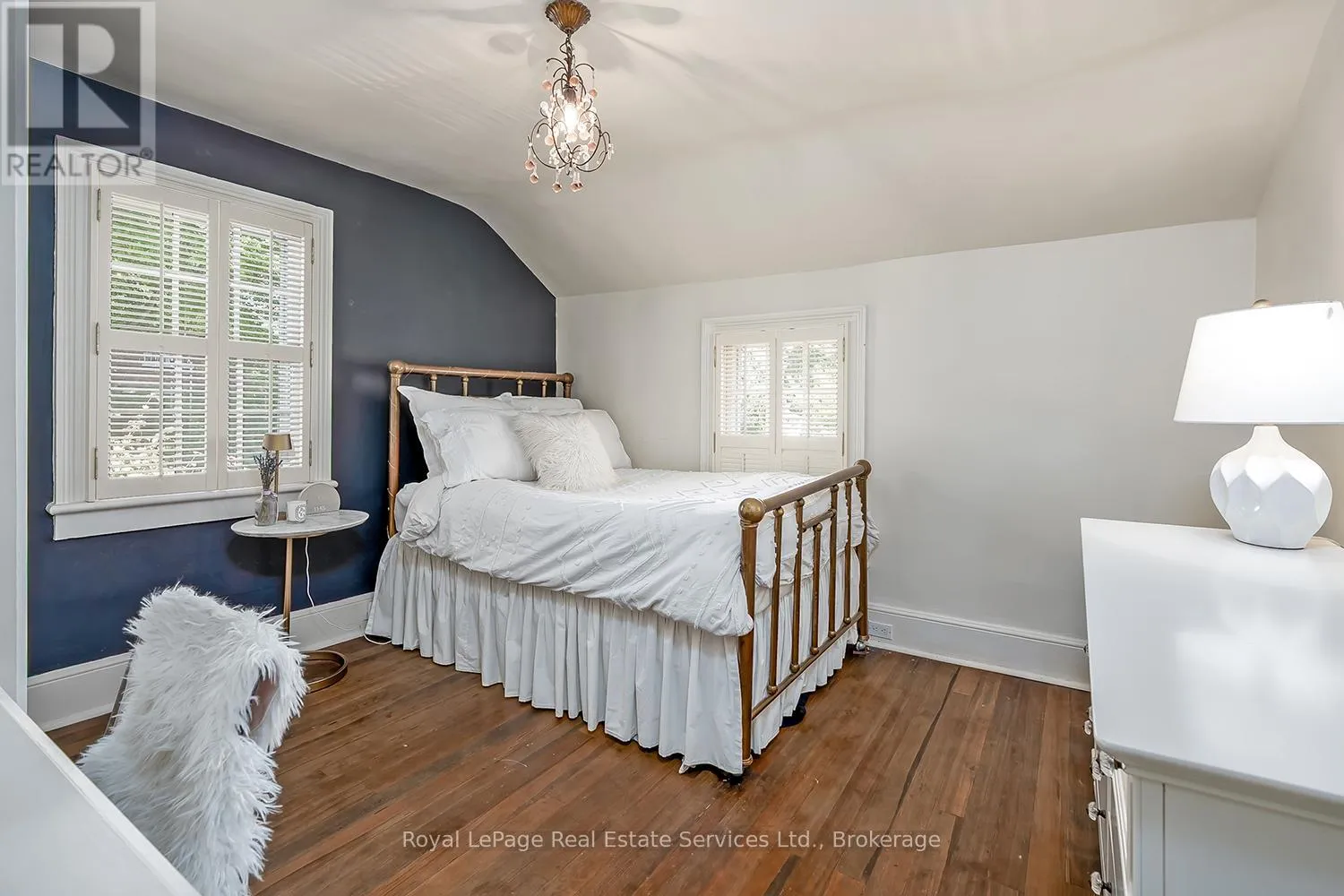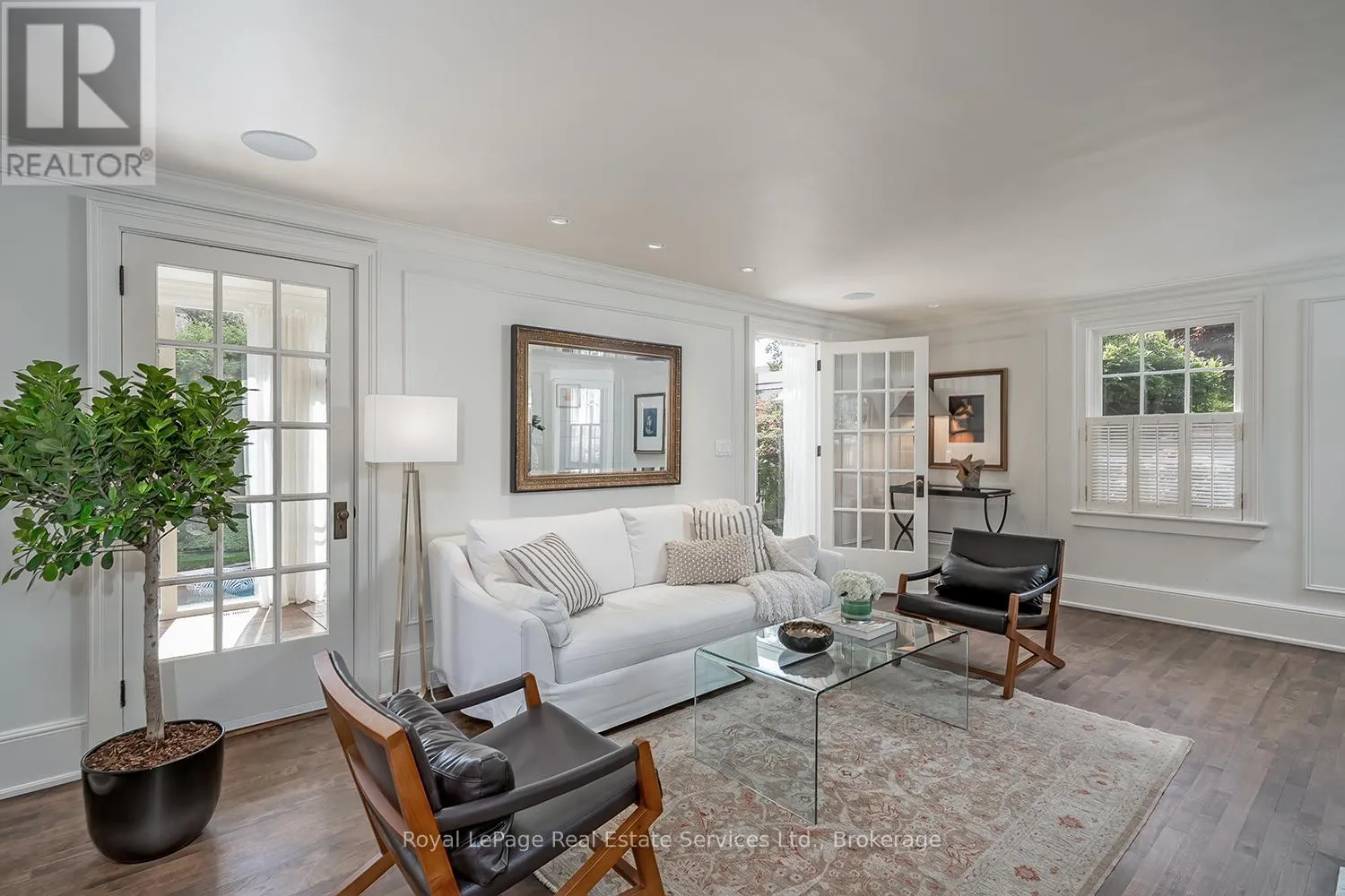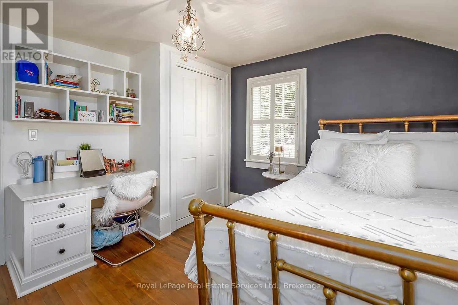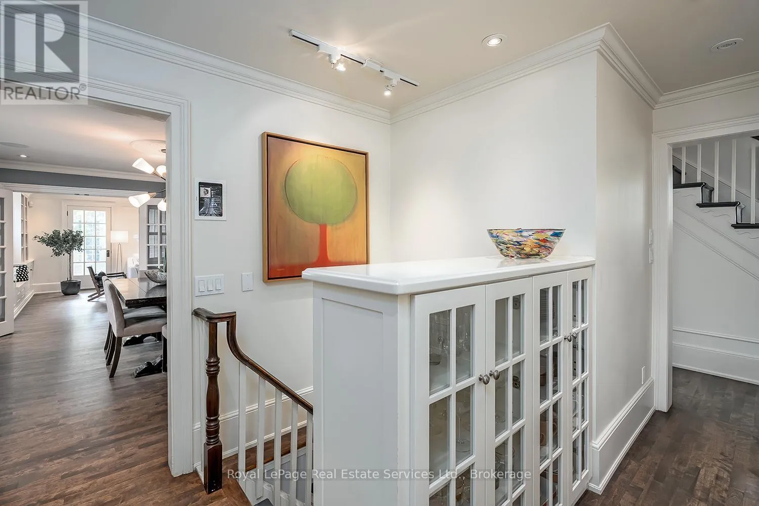 Thomas Street/William Street Nestled south of Lakeshore in the heart of Old Oakvilles historic district, this beautifully restored Georgian-style home, designed by Gren Weis, blends timeless character with modern updates. Steps from the lake, river, and vibrant Downtown, it offers an unmatched lifestyle location.The home boasts exceptional curb appeal with a flagstone path leading to a spacious foyer. Sun-filled interiors feature Farrow & Ball paint, new hardwood on the main level, preserved fir upstairs, smooth ceilings, and recessed LED lighting.The updated kitchen includes a large island, built-in appliances, and desk area. The dining room offers panelled walls, RH sconces, French doors to the garden, and plantation shutters. A charming living room features built-in bookcases, window seat, wood-burning fireplace, and walkouts to a sunroom overlooking the southwest garden and pool. A mudroom and stylish powder room complete the main floor.Upstairs are four bedrooms with ample closets and antique brass hardware. The primary suite offers custom built-ins and a renovated ensuite with heated Carrara marble floors and zero-threshold shower.The fully finished lower level (8 ceilings, slate flooring) adds living space with a media room, workout room, cedar closet, laundry, and storage. Updated mechanicals include a high-efficiency furnace, central AC, 100 AMP panel, irrigation. Cedar roof, new fencing, cobblestone driveway. Outside enjoy a private oasis with saltwater inground pool, brick patios, and landscaped gardens. Steps to the Lake, Oakville Club, Yacht Squadron, Library, Performing Arts Centre, Downtown, and top schools. (id:27476)