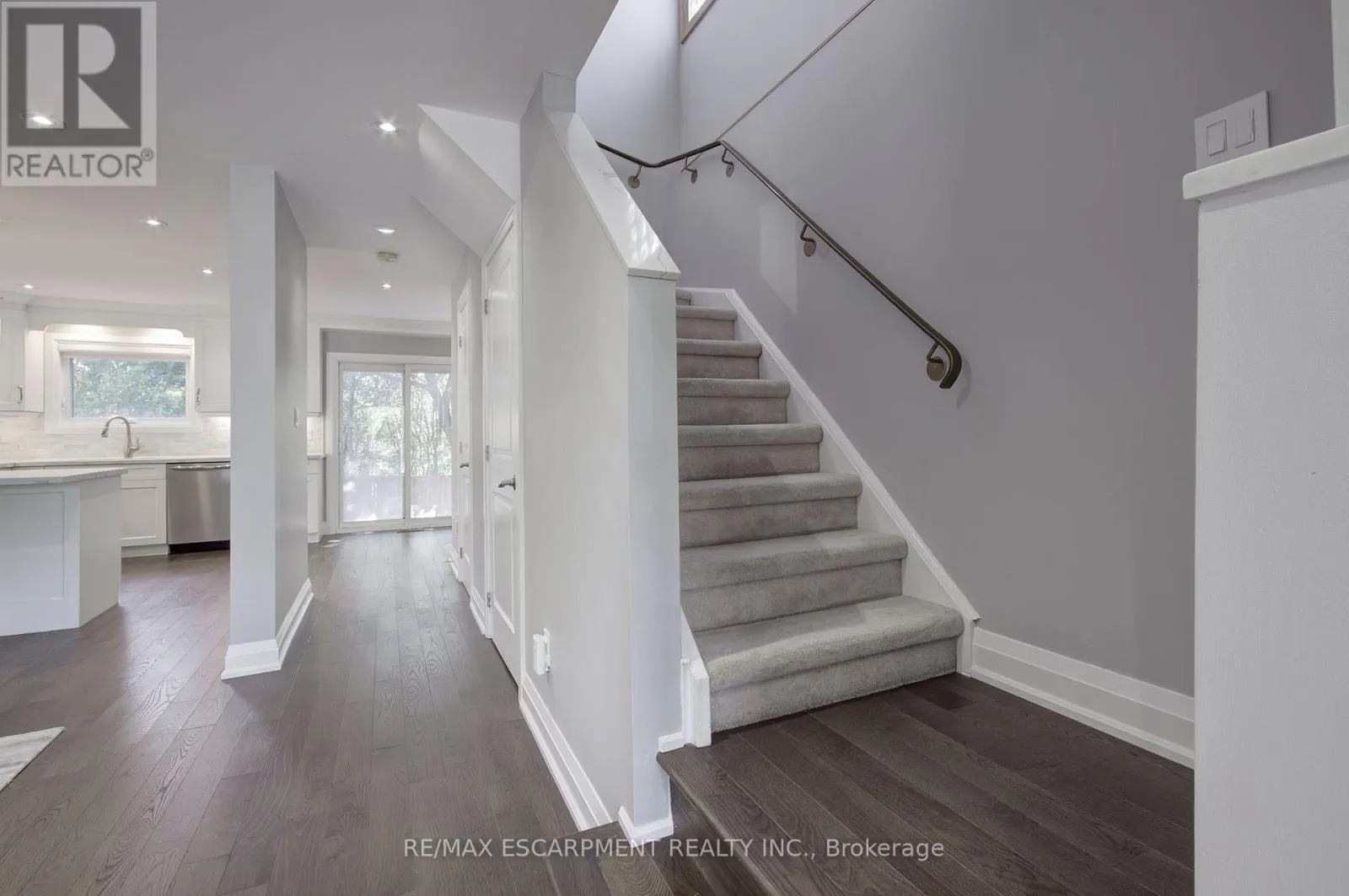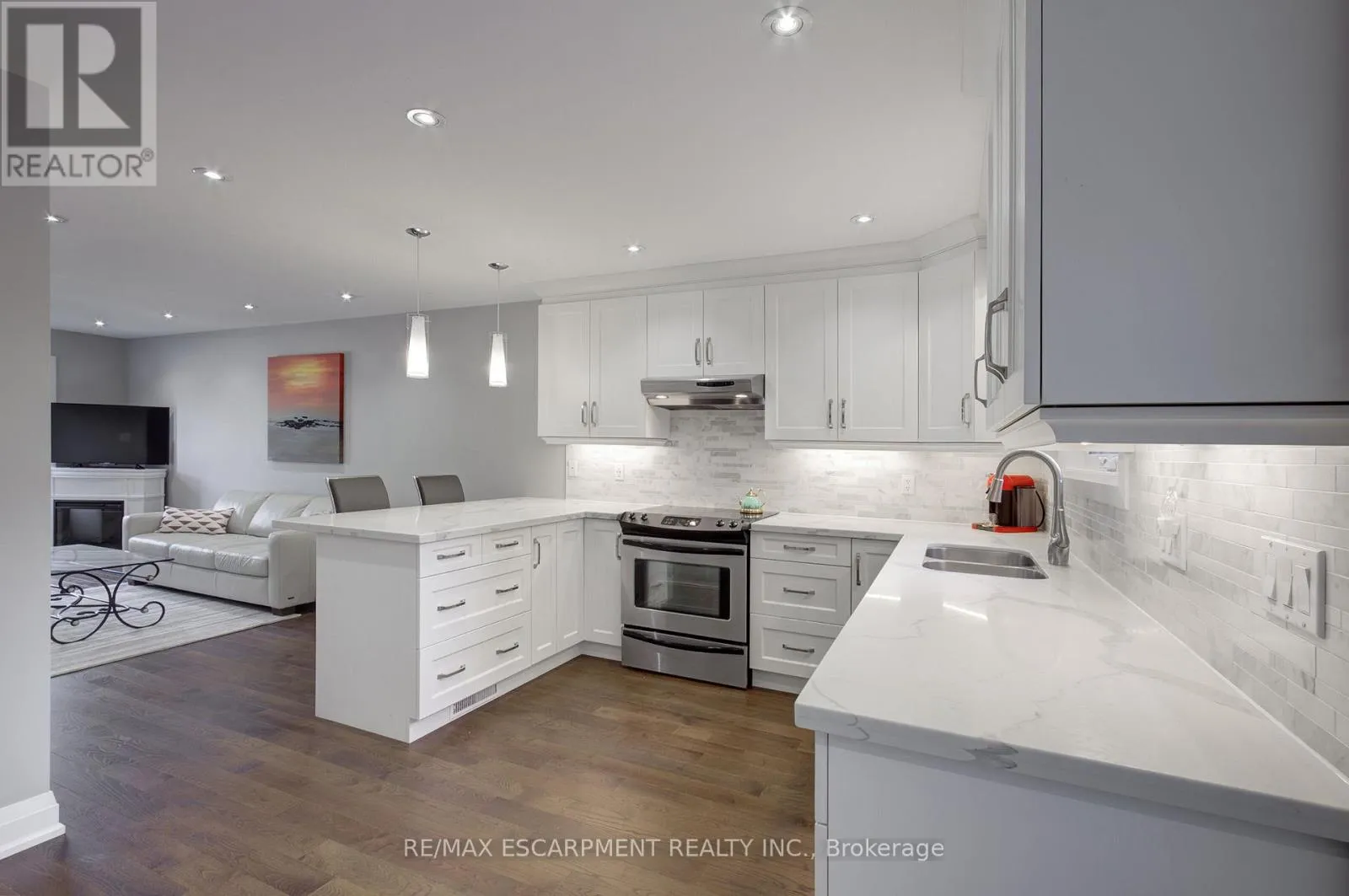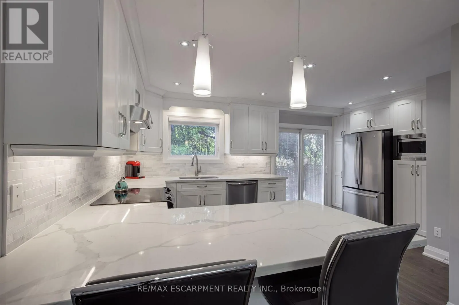 Cross Streets: Dundas/Towne. ** Directions: Towne/McDowell/Ross. Private Pie Shaped Lot on a Quiet Cul-de-Sac in Sought after River Oaks- This Open Concept Semi Detached Home backs onto Crosstown Trail just steps to Munns Creek- Thoughtfully Updated Main Level features rich Oak Floors, pot lights, Neutral Designer Paint Colours, Upgraded European White Kitchen with Quartz Counters, Breakfast Bar, Pendant & Undermount Lighting, Stainless Steel Appliances, Backsplash & Sliders to the Fenced, Mature Backyard- Custom Patio, Stone Water Feature and gate to the Nature Trail- Convenient 2 Piece Powder Room- Spacious Bedrooms, Updated 4 piece Bathroom- Finished Rec Room, Workshop with window & Potential to be a 4th Bedroom plus Coldroom/ Storage Area all complete the Lower Level- Oversized Driveway for 4 Cars- This in -demand North Oakville community features Top Rated Schools, the River Oaks Community Centre, Sixteen Mile Sports Complex, Nature Trails, shopping, restaurants, transit, plus easy access to all major highways (id:27476)