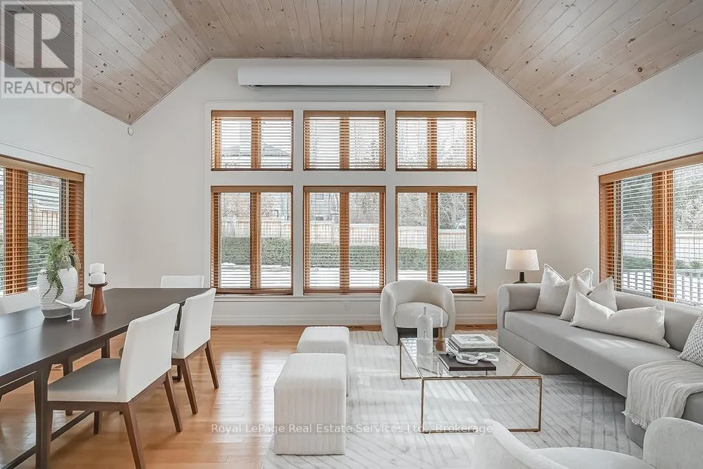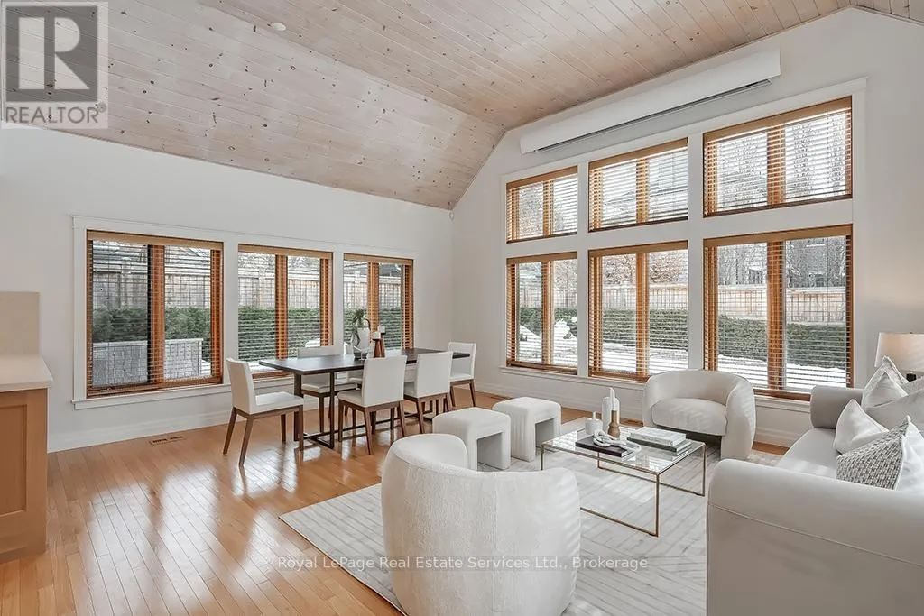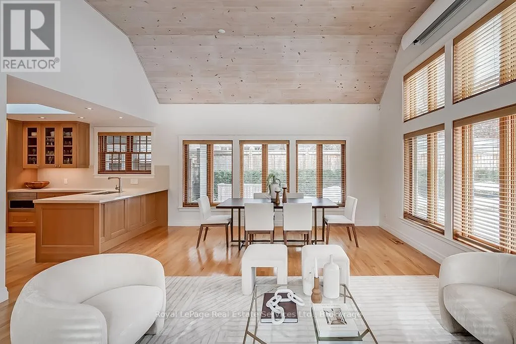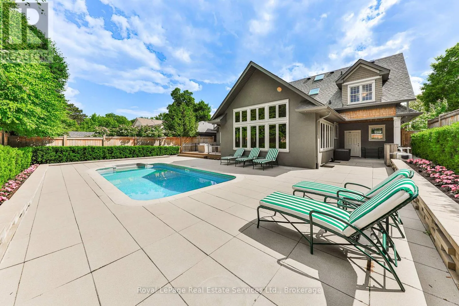 Allan St/Lakeshore Rd This beautiful turn-key residence offers the rare combination of contemporary finishes and conveniences all within steps of the Waterfront trail and Downtown Oakville. This beautifully maintained bungaloft-style residence with nearly 3000SF above-grade living space features a main floor Primary suite & main floor Laundry with the bonus of 2 additional bedrooms and bathrooms on the second floor. Gracious front entry hall with hardwood floors leads through to the Great Room and Kitchen. The top-of-the-line Downsview kitchen with quartz counters and slab backsplash,48" Wolf range, full height SubZero Fridge & separate set of Freezer Drawers, Miele Dishwasher. Breakfast bar overlooks the Great Room with massive vaulted ceiling encompassing an informal Family Room & Dining Area. The top-of-the-line windows and doors features electronic remote Hunter Douglas louvered blinds. This room can be transformed at night into at state-of-the-art movie room with retractable projection screen. Main floor Den/Office. Primary suite with walk-in closet and renovated ensuite Bathroom, dual sinks and large glass shower. Upstairs find a bright open concept reading nook, two large bedrooms and an additional 1 1/2 Bathrooms, offering excellent space for family and guests. The lower level is finished and is ideally suited for storage, recreation and/or hobby space. Attached garage with epoxy flooring and inside entry. Family Room walk-out to new composite deck overlooking the private, fully landscaped garden with in-ground pool. This impeccably designed and easy to maintain property is sure to impress. Don't Miss (id:27476)