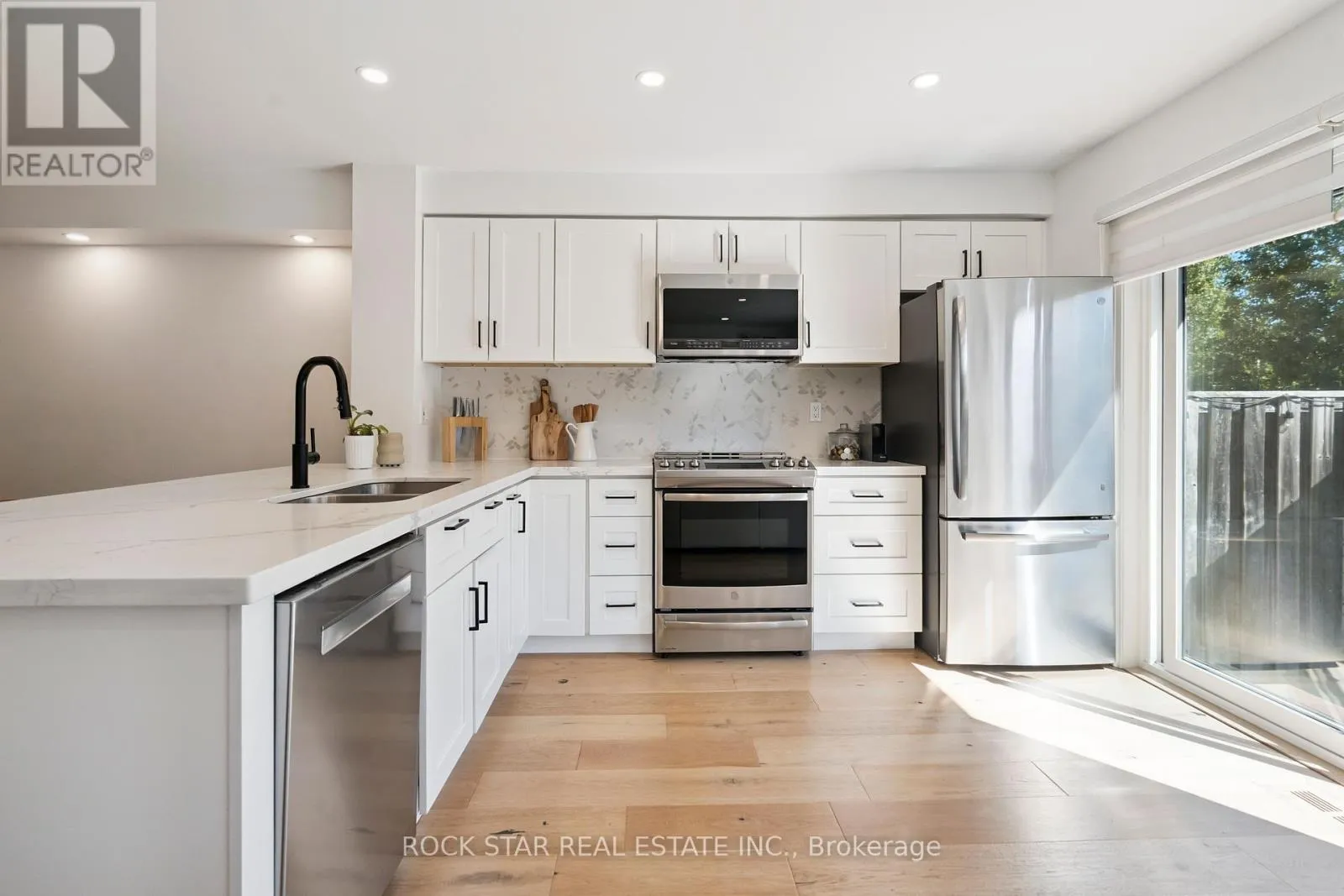 Cross Streets: Baronwood Drive. ** Directions: Bronte Rd/West Oak Tr. Over $200,000 in upgrades have transformed this stunning freehold townhome on a quiet crescent in Oakvilles prestigious Westmount neighbourhood. Impeccably maintained and move-in ready, this bright and spacious 3-bedroom, 3-bathroom executive home combines modern elegance with everyday comfort. Wide white oak hardwood flooring carries throughout, leading to a sun-filled open concept main floor with a cozy electric fireplace, formal dining area, and a beautifully renovated eat-in kitchen featuring crisp cabinetry, newer stainless steel appliances, and a walkout to a private fully fenced backyard. Upstairs youll find three generous bedrooms, including a primary suite with a walk-in closet and a newly updated 4-piece bath. The fully finished lower level offers a stylish recreation room, a brand new 3-piece bathroom, laundry, and plenty of storage. Every major update has been taken care of: owned hot water tank (2017), furnace (2018), exterior with new insulation, siding, soffit, fascia, and gutters (2018), windows (2020), interior updates (2020), AC (2021), interlocking (2021), and a fully custom-built basement (2023). With its flawless finishes, timeless upgrades, and unbeatable location near shopping, Starbucks, parks, trails, Oakville Hospital, Bronte GO, major highways, and within walking distance to top-ranked schools, this home truly checks every box. (id:27476)