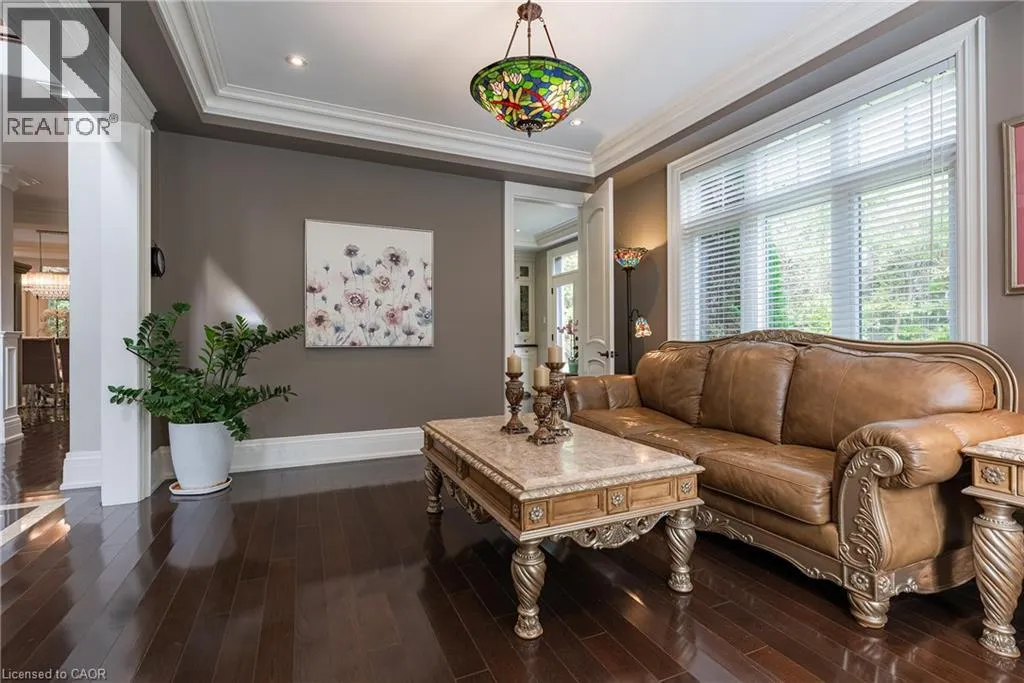 Lakeshore Road W & Third Line This distinguished custom-built two-storey residence offers over 5,600 square feet of refined living space, including approximately 3,700 square feet above grade and nearly 2,000 square feet in a luxuriously finished lower level nestled within a prestigious Bronte East enclave. Step through the double entry doors into an impressive two-storey foyer crowned by soaring 20-foot ceilings and an open gallery overlook. Expansive transom windows bathe the space in natural light, highlighting the floating hardwood staircase with wrought-iron railings. The main level unfolds with an open-concept layout featuring hardwood floors, vaulted and recessed ceilings, French doors, custom millwork, and oversized picture windows that fill each room with light. The family room serves as a true architectural centerpiece with its 14-foot vaulted ceiling and floor-to-ceiling fireplace, while six additional rooms offer the flexibility to tailor each space to your lifestyle. The Chefâs kitchen blends form and function with custom cabinetry, premium built-in appliances, and an expansive centre island ideal for both cooking and entertaining. The upper level hosts four spacious bedrooms, including a primary suite overlooking the rear and side gardens. This retreat features a spa-inspired five-piece ensuite complete with a floor-to-ceiling glass shower and whirlpool-style jetted tub. Two of the secondary bedrooms boast graceful, vaulted ceilings, adding a sense of airiness and architectural character. Mature trees and lush greenery envelop the property, creating serene views from every window. The professionally finished lower level extends the homeâs luxurious living space, offering a recreation room, theatre room or fifth bedroom, home office, above-grade windows, and a three-piece bath. Outside, the manicured backyard oasis features a gazebo and flower garden, providing a tranquil setting for relaxation or entertaining. A true beauty that you can not miss. (id:27476)