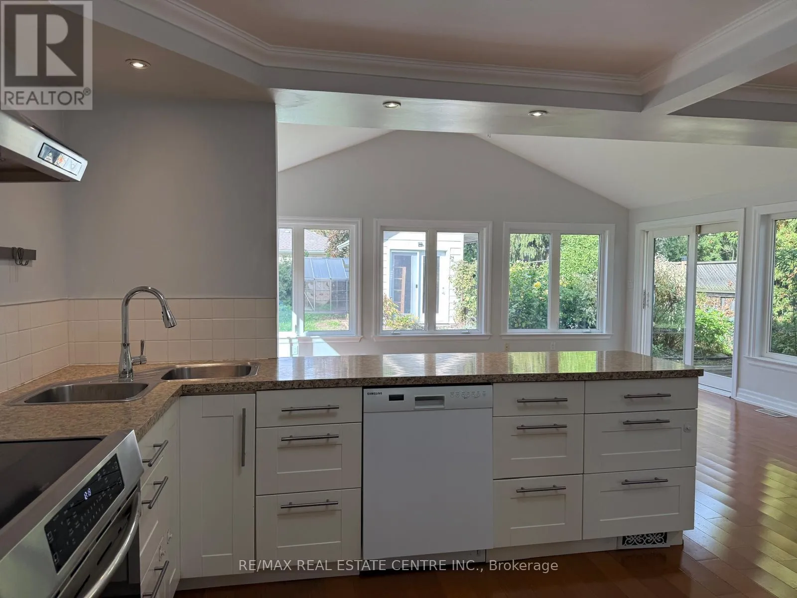 Bridge/Sherin Spacious and beautifully maintained 3-bedroom detached home on a quiet, mature street in desirable South Oakville, available to lease for one year only. This charming home features an open-concept modern kitchen with granite counters, ample cabinetry, and stainless steel appliances, overlooking a bright and expansive family room extension with vaulted ceilings, abundant windows, and double walk-outs to a large private yard. The inviting main level offers a lovely living and dining area enhanced with crown moulding and large windows, while the upper level includes three comfortable bedrooms and a stylishly updated 4-piece bath with double vanity and glass shower . Enjoy the warmth of Brazilian cherry hardwood floors throughout the main and upper levels. The finished lower level includes a bright rec room/office space with pot lights, a 3-piece bath, laundry, and a massive crawl space for storage. Outside, relax in the private backyard with decks, mature trees, and gardens. Ideally located in sought-after Bronte East, just minutes to top-rated schools, parks, recreation centre, pool, arena, library, shopping, Coronation Park, and the lake. (id:27476)