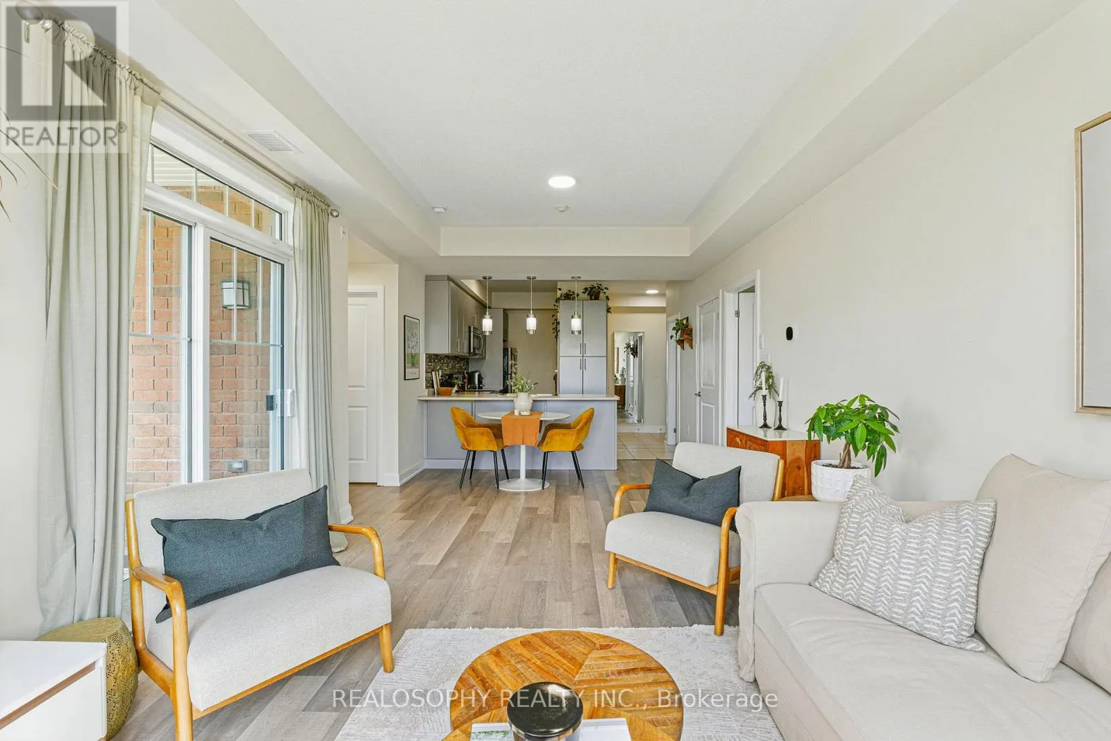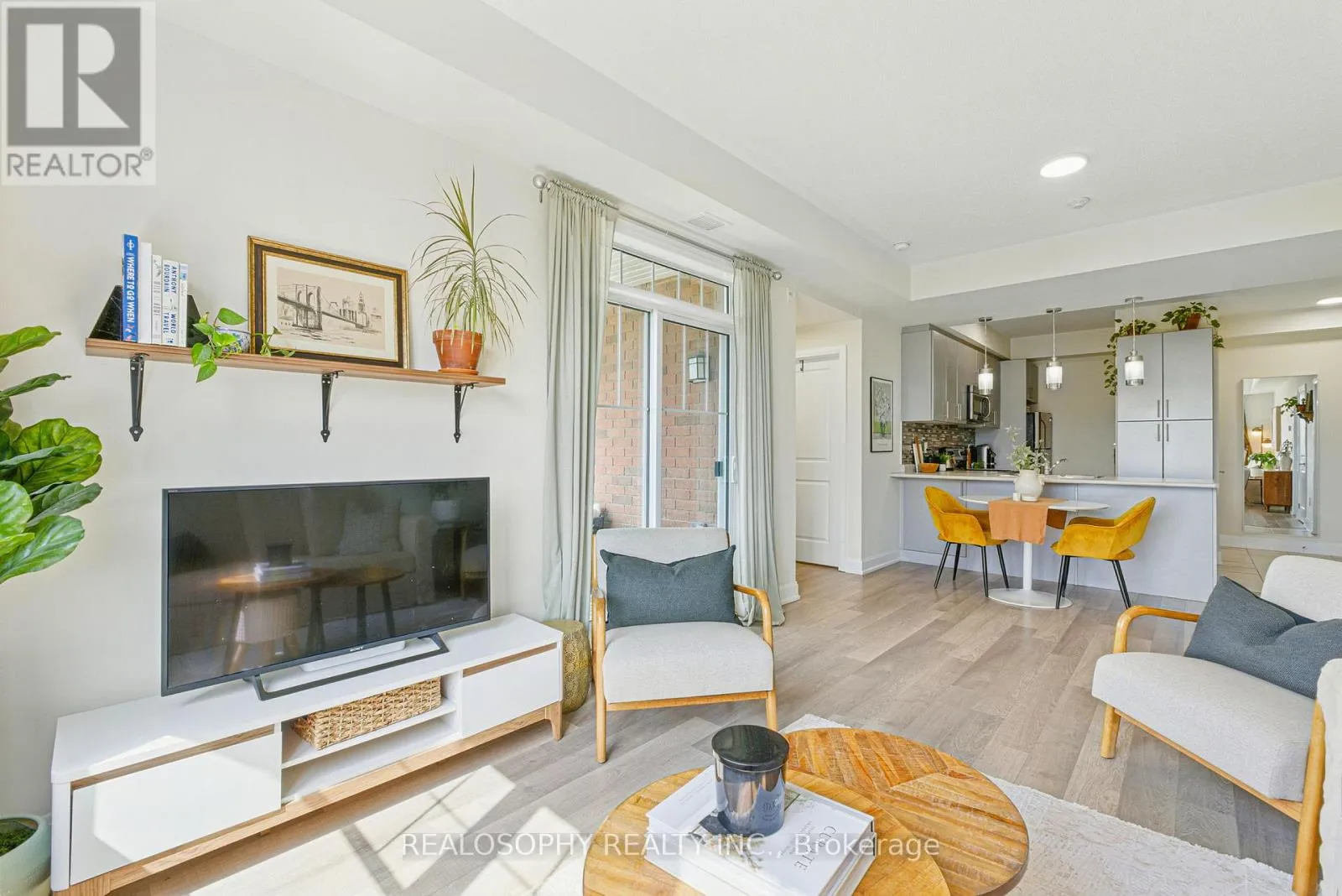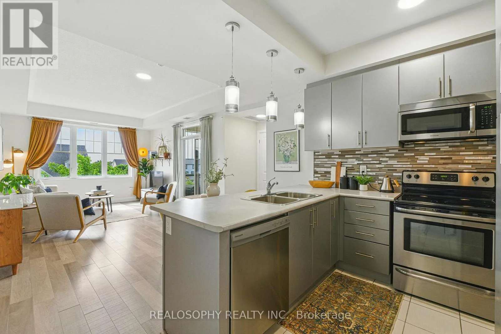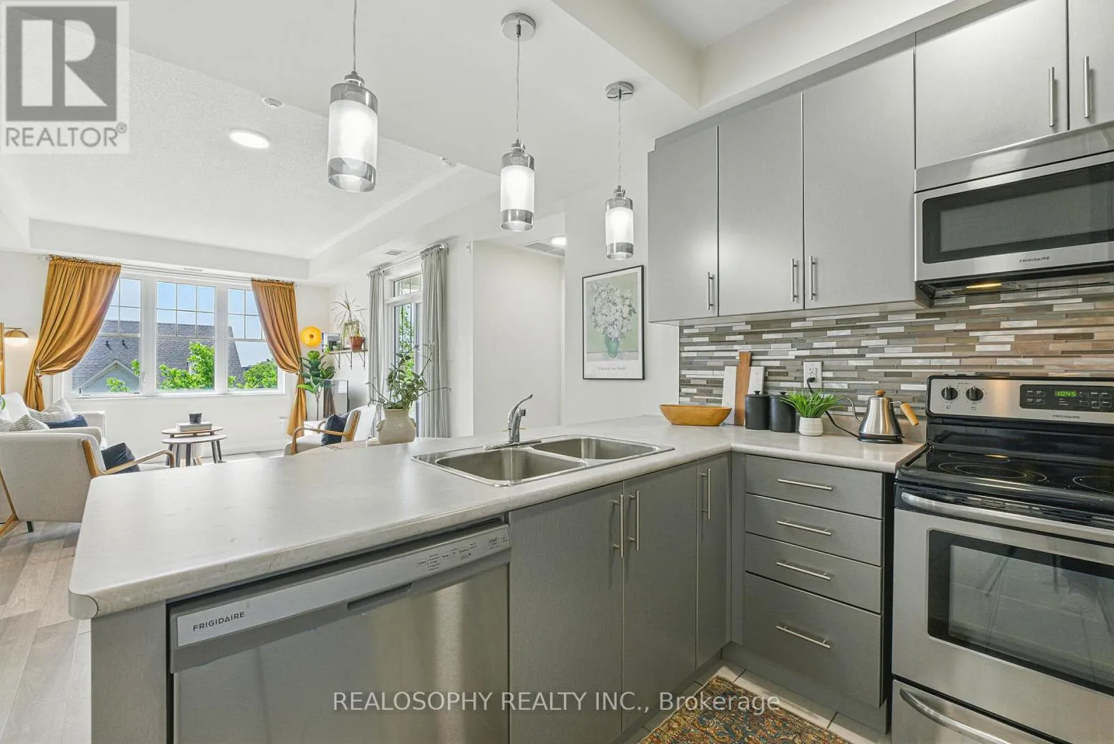Cross Streets: Trafalgar // Dundas. ** Directions: Trafalgar, W on Oak Park, S on Sawgrass. Introducing a beautiful and bright, well-laid and comfortable two bed + two bath + two parking, corner unit in the very walkable neighbourhood of Oakville's Uptown Core. In the southwest building of the Oak Park Towns, this light-filled suite not only lives large on the interior at nearly 1100 sq ft, but also offers wonderful panoramic views from a lovely covered terrace. Entering into a tucked-away foyer, the condo suddenly gives way to an open concept kitchen + living space that benefits from unabated, sunny, south exposure with space to gather or the room to unwind. For the home cook, a built-in pantry elevates kitchen storage without making a sacrifice of space and sports stainless steel, full-size appliances. The combined living + dining area walks out to the outdoor entertain and relax space, benefiting from sight-lines overlooking a quiet Oakville neighbourhood. This view is one that will last. A split bedroom layout offers quiet and privacy for each room. The primary bedroom is king-sized with an ensuite bath and well outfitted walk-in closet. An XL second bedroom has a deep closet, more sunny south exposure, and no longer does one worry about a guestroom OR an office - you can simply do both. Included is a full garage with attached storage room, and an additional parking space on a private drive. All your daily conveniences are a short walk away and connectivity is paramount with quick trips to the QEW, 403, 407, Oakville Place, and GO Train station. Oakville Transit at the door. With 9-foot ceilings, incredible value for size, covered parking for two, sunny exposure, plus a legacy view, this one checks the boxes. (id:27476)