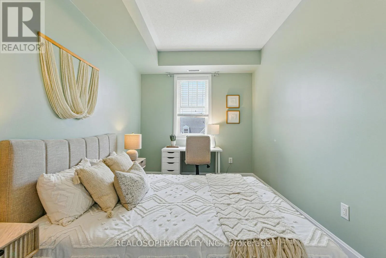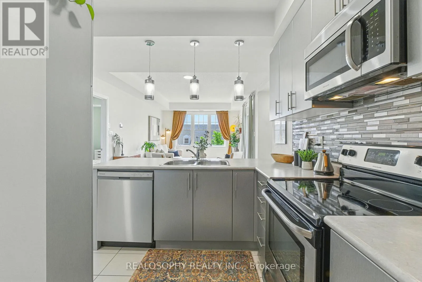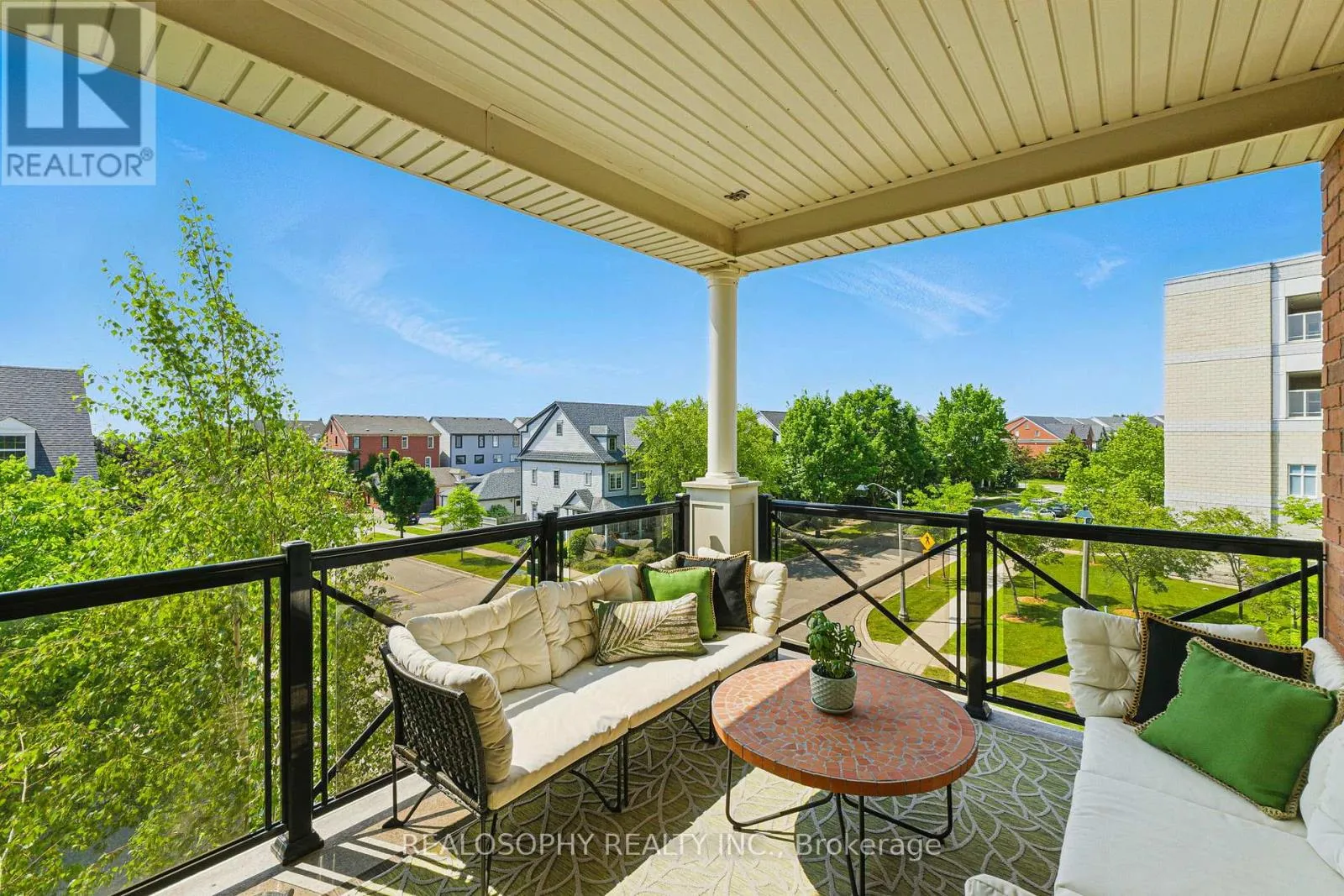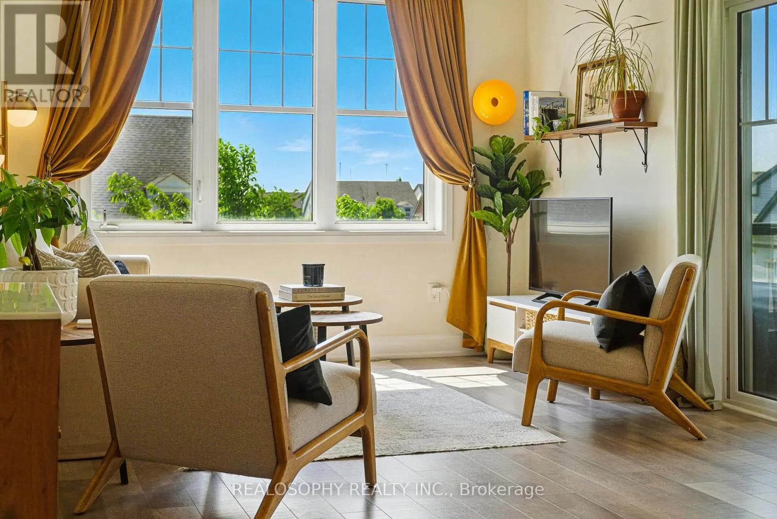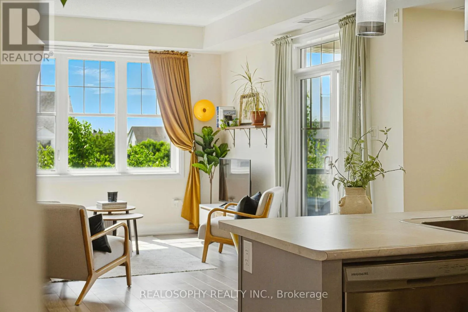 Cross Streets: Trafalgar // Dundas. ** Directions: Trafalgar, W on Oak Park, S on Sawgrass. Introducing a beautiful and bright, well-laid and comfortable two bed + two bath + two parking, corner unit in the very walkable neighbourhood of Oakville's Uptown Core. In the southwest building of the Oak Park Towns, this light-filled suite not only lives large on the interior at nearly 1100 sq ft, but also offers wonderful panoramic views from a lovely covered terrace. Entering into a tucked-away foyer, the condo suddenly gives way to an open concept kitchen + living space that benefits from unabated, sunny, south exposure with space to gather or the room to unwind. For the home cook, a built-in pantry elevates kitchen storage without making a sacrifice of space and sports stainless steel, full-size appliances. The combined living + dining area walks out to the outdoor entertain and relax space, benefiting from sight-lines overlooking a quiet Oakville neighbourhood. This view is one that will last. A split bedroom layout offers quiet and privacy for each room. The primary bedroom is king-sized with an ensuite bath and well outfitted walk-in closet. An XL second bedroom has a deep closet, more sunny south exposure, and no longer does one worry about a guestroom OR an office - you can simply do both. Included is a full garage with attached storage room, and an additional parking space on a private drive. All your daily conveniences are a short walk away and connectivity is paramount with quick trips to the QEW, 403, 407, Oakville Place, and GO Train station. Oakville Transit at the door. With 9-foot ceilings, incredible value for size, covered parking for two, sunny exposure, plus a legacy view, this one checks the boxes. (id:27476)
