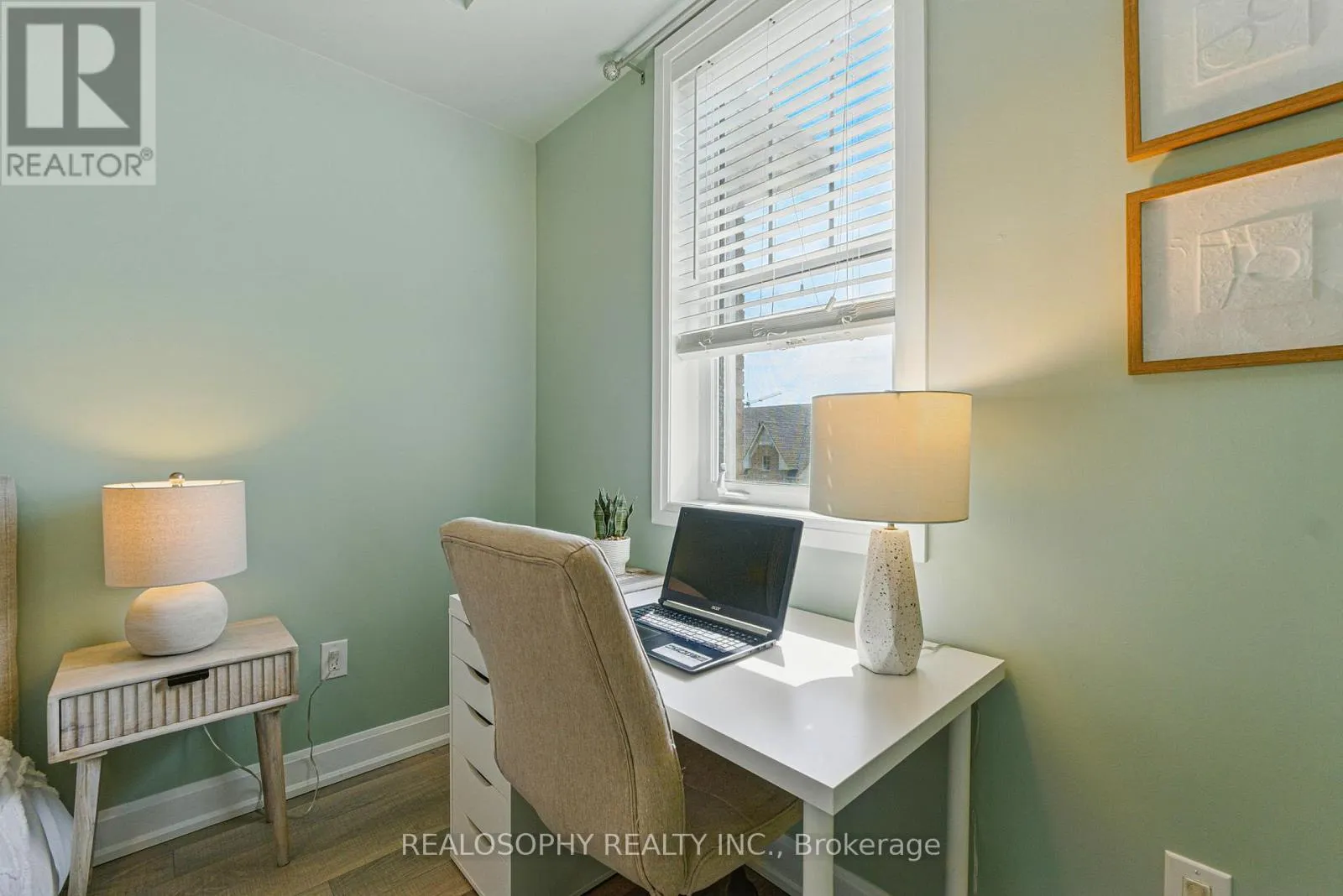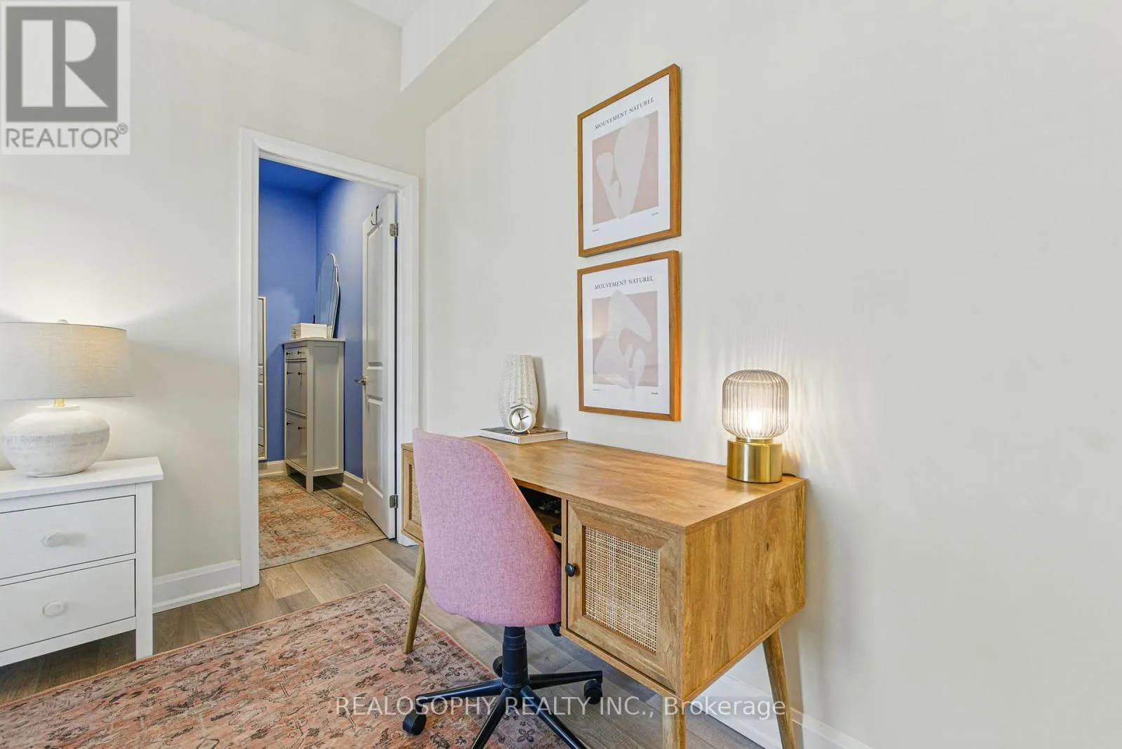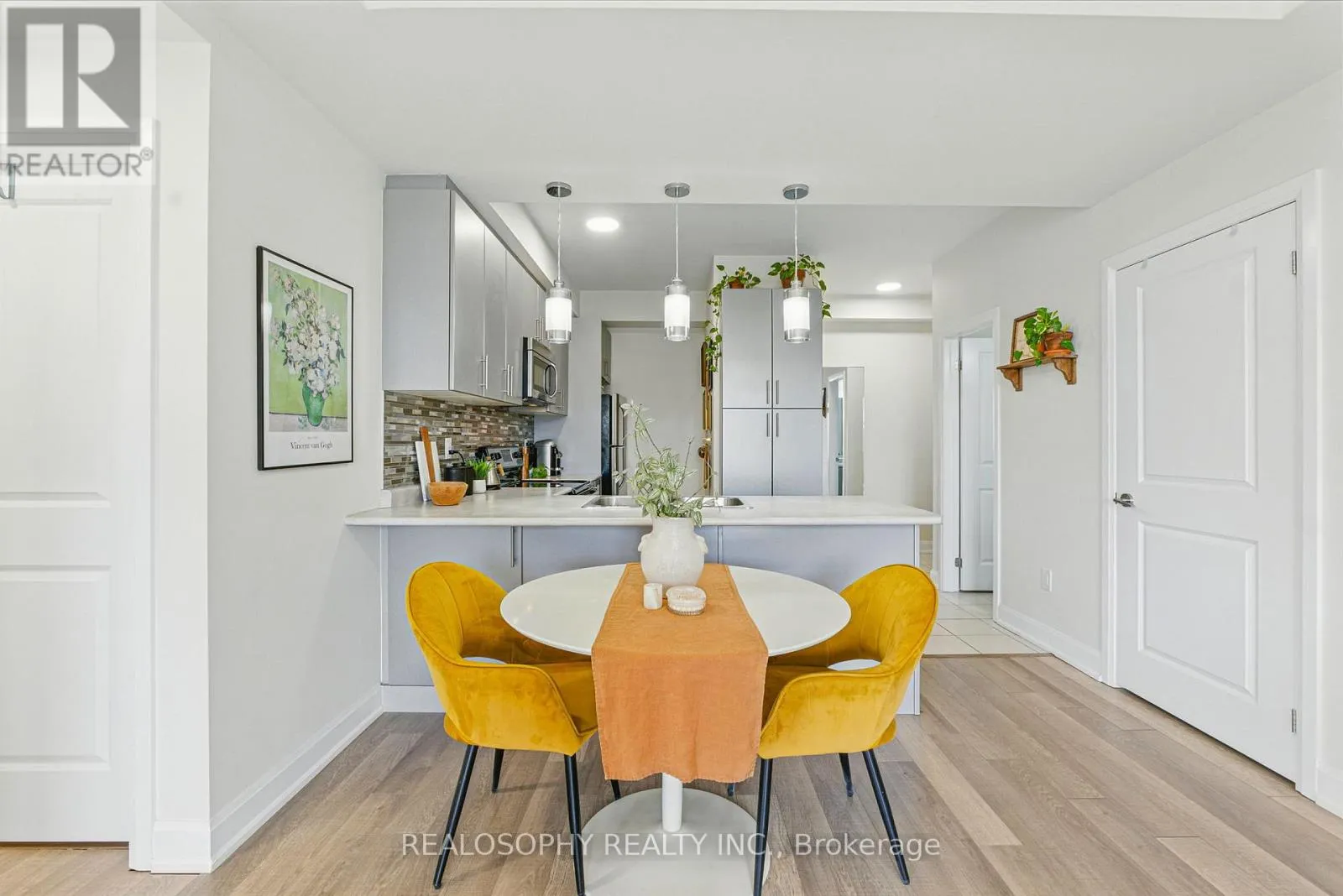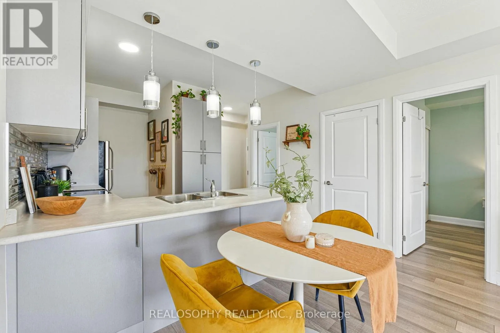 Cross Streets: Trafalgar // Dundas. ** Directions: Trafalgar, W on Oak Park, S on Sawgrass. Introducing a beautiful and bright, well-laid and comfortable two bed + two bath + two parking, corner unit in the very walkable neighbourhood of Oakville's Uptown Core. In the southwest building of the Oak Park Towns, this light-filled suite not only lives large on the interior at nearly 1100 sq ft, but also offers wonderful panoramic views from a lovely covered terrace. Entering into a tucked-away foyer, the condo suddenly gives way to an open concept kitchen + living space that benefits from unabated, sunny, south exposure with space to gather or the room to unwind. For the home cook, a built-in pantry elevates kitchen storage without making a sacrifice of space and sports stainless steel, full-size appliances. The combined living + dining area walks out to the outdoor entertain and relax space, benefiting from sight-lines overlooking a quiet Oakville neighbourhood. This view is one that will last. A split bedroom layout offers quiet and privacy for each room. The primary bedroom is king-sized with an ensuite bath and well outfitted walk-in closet. An XL second bedroom has a deep closet, more sunny south exposure, and no longer does one worry about a guestroom OR an office - you can simply do both. Included is a full garage with attached storage room, and an additional parking space on a private drive. All your daily conveniences are a short walk away and connectivity is paramount with quick trips to the QEW, 403, 407, Oakville Place, and GO Train station. Oakville Transit at the door. With 9-foot ceilings, incredible value for size, covered parking for two, sunny exposure, plus a legacy view, this one checks the boxes. (id:27476)