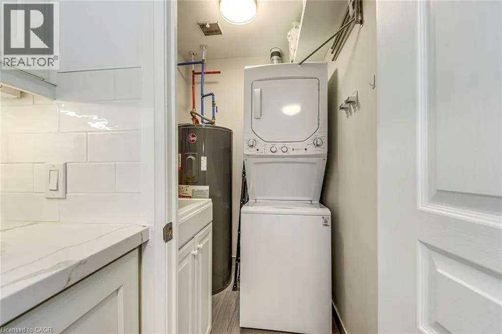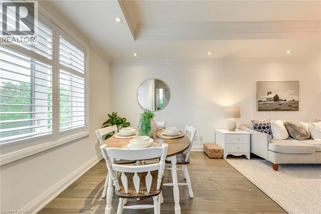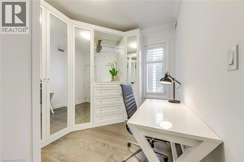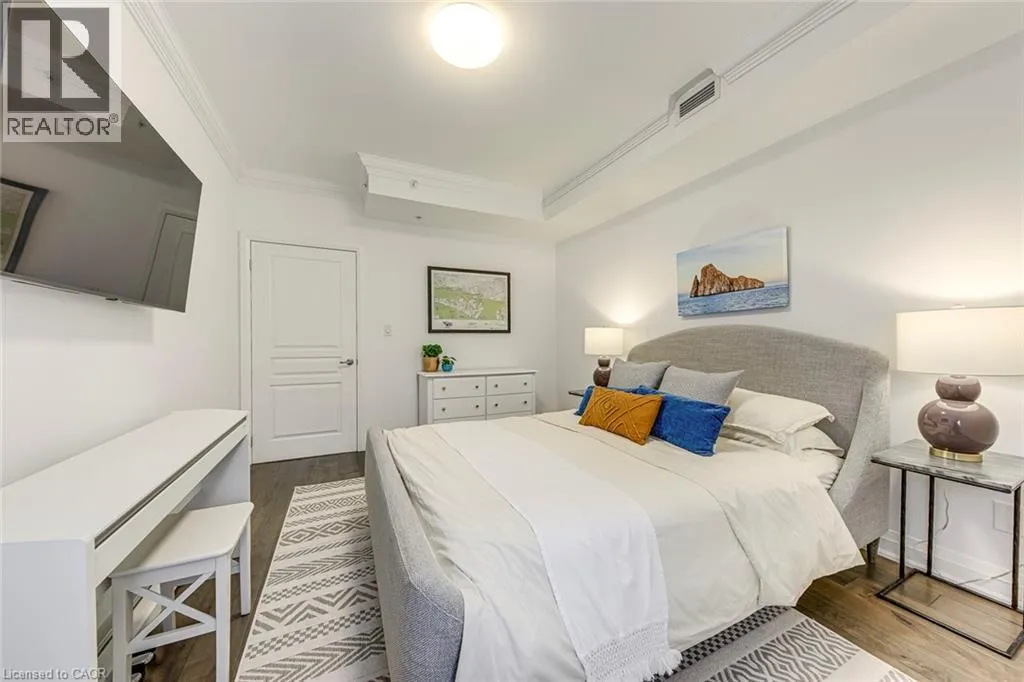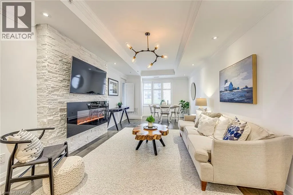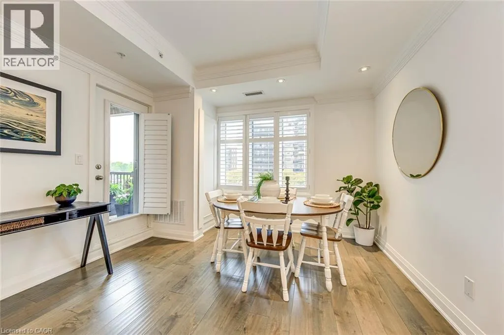 KERR ST TO STEWART ST Stunning 2 bed, 2 bath suite in the heart of Kerr Village. With over 900 square feet of thoughtfully designed living space, this top-floor unit in an exclusive 4-storey low-rise building is a rare find. The open-concept living space features 9-foot ceilings, wide-plank hardwood floors, and crown molding throughout, creating a bright and sophisticated atmosphere. The gourmet kitchen boasts premium white cabinetry, quartz countertops with waterfall edges, hidden pantry a full suite of stainless steel appliances, and elegant pendant lighting over a spacious breakfast bar. The adjacent living and dining area is both stylish and functional, with large windows that fill the space with natural light and provide a seamless flow out to the private balcony. Enjoy morning coffee or unwind in the evening surrounded by lush greenery and serene views.The primary bedroom offers a tranquil retreat with custom built-in wardrobes, ample closet space, and a calming neutral palette. A versatile second bedroom can serve as a guest room or home office, complete with mirrored storage and a built-in workspace. The bathrooms feature refined finishes including marble-look tile, modern vanities, gold hardware, and designer lighting.Additional highlights include in-suite laundry, upgraded lighting fixtures, and thoughtful storage solutions throughout. The furnace has been recently serviced and is in good working order, adding peace of mind. The suite includes in-unit laundry, a tandem two parking spot on P1 for two cars, and a private storage locker. Step outside and you're moments from multi-million dollar homes, the tranquil shores of Lake Ontario, vibrant Kerr Street, and downtown Oakville. Enjoy the serenity of nearby green spaces like Tannery Park and 16 Mile Creek, while staying connected with quick access to Oakville GO Station and major highways. You will love calling this home. (id:27476)