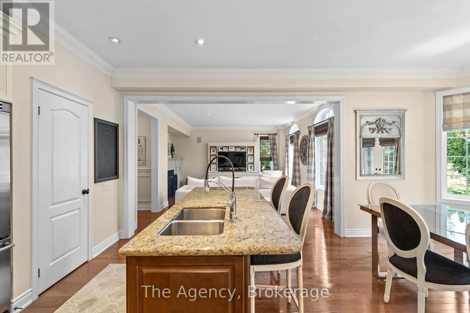 Lakeshore Rd & Great Lakes Introducing the Rosehaven Cantley model, an exceptional four-bedroom, three-bathroom residence that exemplifies luxurious living, set on a premium corner lot in the prestigious Lakeshore Woods community of southwest Oakville. With an elegant stone and brick exterior, enhanced by additional side windows that flood the interior with natural light, this home offers unmatched curb appeal and sophistication. Nestled in one of Oakville's most coveted lakeside neighborhoods, this family-friendly enclave is just steps from the lake, scenic parks, wooded trails, a dog park, tennis and pickleball courts, splash pads, and sports fields. Enjoy endless outdoor adventures, with miles of walking and biking trails connecting to Nautical and Shell Parks, local beaches, and the vibrant waterfront charm of Bronte Village, with its yacht club, boutique shops, cafes, and fine dining. Inside, this meticulously designed home blends elegance and comfort. The chef's kitchen is a true centerpiece, featuring premium commercial-grade appliances, an oversized center island, crown molding, pot lights, and rich hardwood flooring. The adjoining family room and kitchen offer views of the professionally landscaped backyard complete with custom iron gates, clay street pavers, an in-ground sprinkler system, and integrated outdoor speakers perfect for entertaining or relaxing in your private oasis. Thoughtful upgrades are found throughout, including crown molding, custom wainscoting, a fully integrated security system with cameras, and custom California Closets built-ins. Designer window coverings from Hunter Douglas and Housewarmings add refined style and functionality. The main floor mudroom is both practical and elegant, with custom cabinetry, drying racks, and convenient garage access. A rare opportunity to own an exquisite home that seamlessly blends luxury, lifestyle, and location in one of Oakville's most desirable communities. (id:27476)