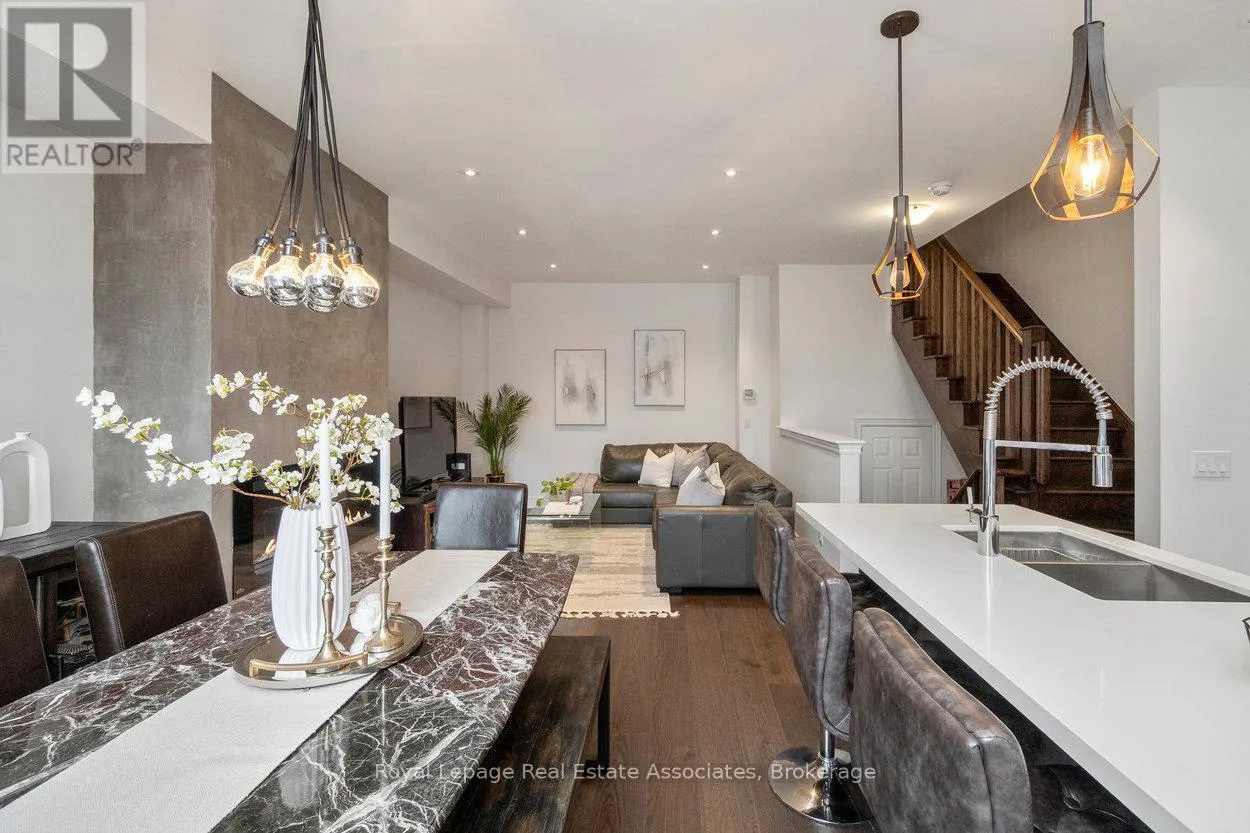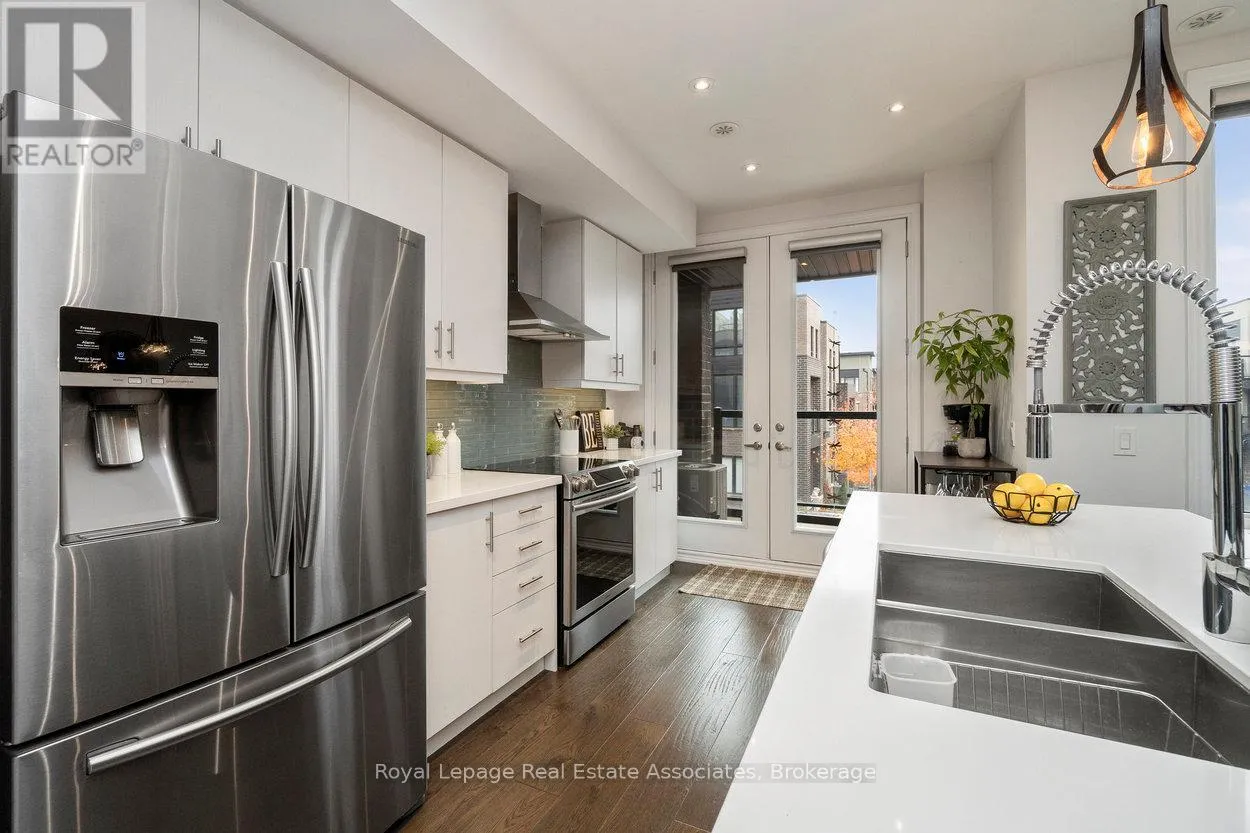 Cross Streets: Trafalgar Rd / Dundas St E. ** Directions: Dundas St E / Postridge Dr / Cascade Cmn. Welcome to 3076 Cascade Common, a beautifully upgraded 2-bedroom, 3-storey townhome located in Oakville's desirable Joshua Meadows community. Offering approximately 1,310 sq ft of living space plus an estimated 412 sq ft private rooftop terrace, this home is perfect for entertaining or relaxing with prime south and west-facing views. The main level features 9 ft ceilings with pot lights on dimmers and a seamless flow from the modern kitchen to the dining and living areas. The kitchen boasts stainless steel appliances, a large island with built-in sink and seating, quartz countertops, under-cabinet lighting, and a glass tile backsplash, and offers a walkout to a private balcony - ideal for morning coffee or evening unwinding. The living area is complete with an electric fireplace finished in modern concrete. Additional highlights include $47,000 in builder upgrades upon construction (2017), such as premium hand-scraped solid white oak hardwood floors with an elegant cashmere finish throughout, upgraded stairway spindles, and thoughtful design touches that elevate the home's style and comfort. The private rooftop terrace is a true retreat, featuring gas and water hookups for BBQs, outdoor dining, and gardening. Enjoy the quiet setting within walking distance to parks, shops, and local amenities. William Rose Park is just steps away, offering tennis, pickleball, baseball, splash pad, and more. Conveniently close to trails, restaurants, GO Transit, and Oakville Trafalgar Memorial Hospital. Monthly POTL fees of $64.67 cover road maintenance and garbage removal. Don't miss this opportunity to own a stylish, well-maintained home in one of Oakville's most sought-after neighbourhoods - Joshua Meadows! (id:27476)