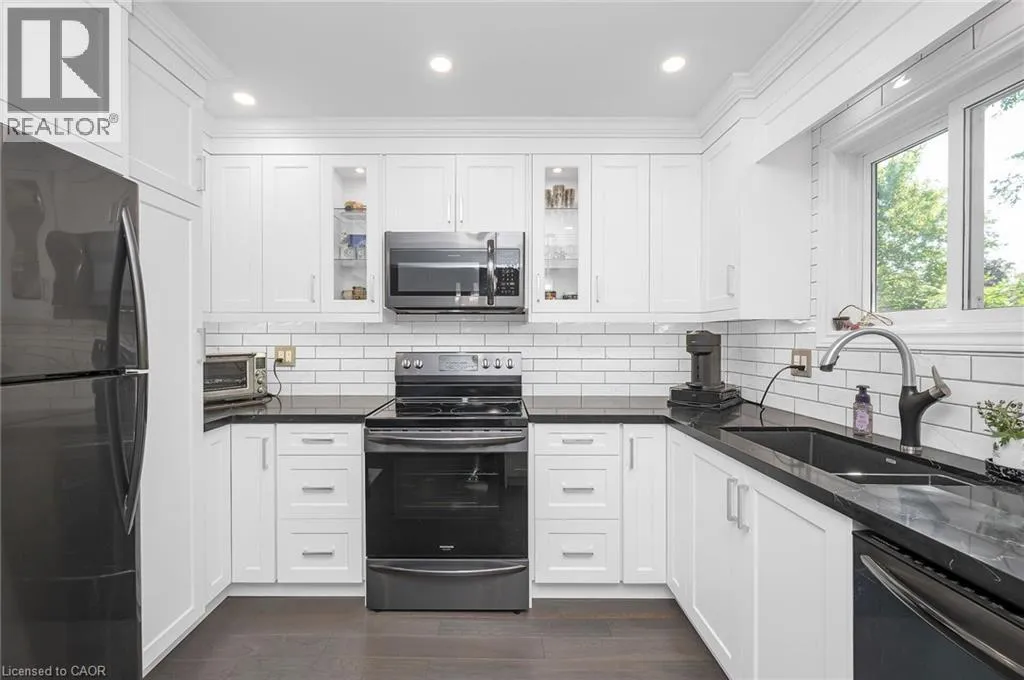 Towne Blvd / Ross lane Welcome to this charming 3-bedroom semi-detached home on a quiet, family-friendly street in sought-after River Oaks. Set on a rare 53 x 198 ft private lot. The main floor features a bright living and dining area with hardwood floors, and a renovated kitchen with granite countertops, a stylish backsplash, plenty of cabinetry, and a handy pull-out pantry. Beautiful patio doors lead to the expansive backyardâa true retreat with a gorgeous gazebo with waterproof curtains, and mature trees. Upstairs, youâll find 3 well-sized bedrooms and an updated 4-piece bathroom. The partially finished basement includes an updated powder room, laundry area, and lots of storage. Recent updates include new carpet (2025) on the stairs and upper level, plus a new front door (2025). The garage provides inside entry and a rear door with direct access to the backyard. Parking for up to 5 cars! Driveway made of aggregate concrete. This home is close to top-rated schools including River Oaks Public, White Oaks Secondary, Rotherglen, and several more, as well as parks, trails, and recreation centers. A perfect blend of convenience and community in a mature neighbourhoodâdonât miss this exceptional River Oaks gem! (id:27476)